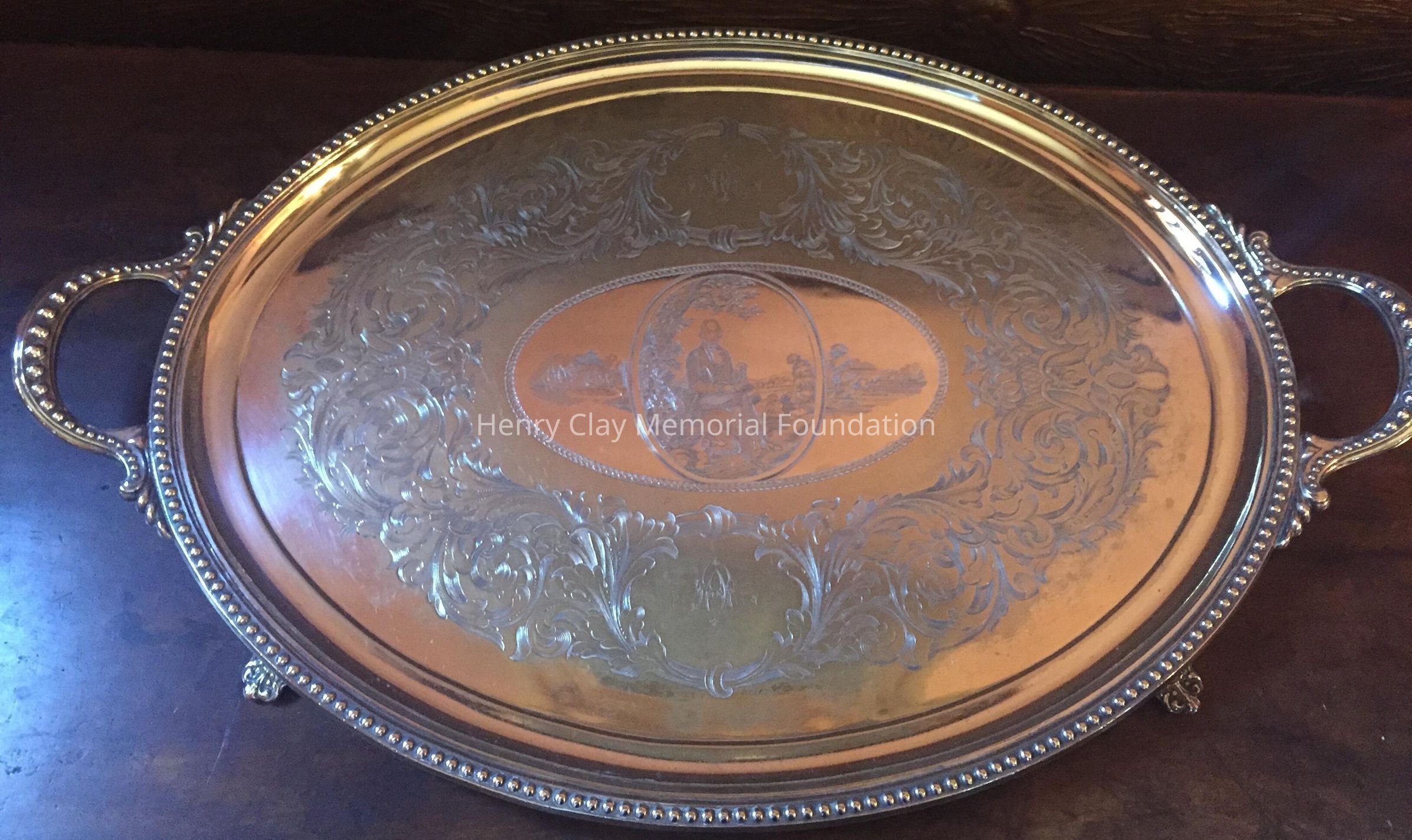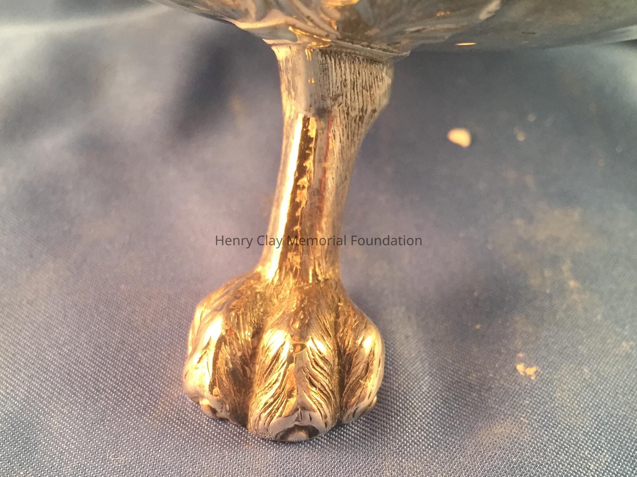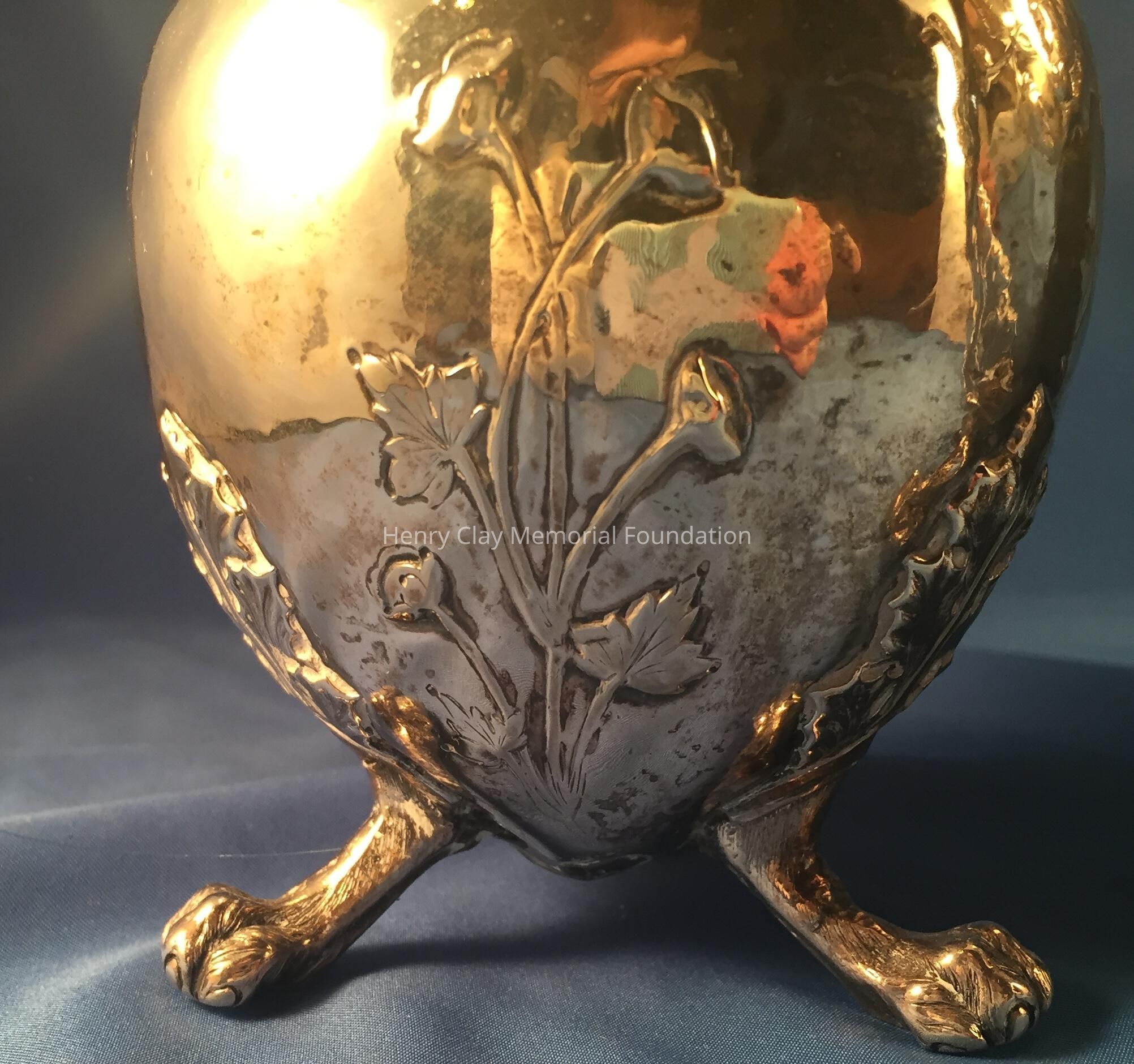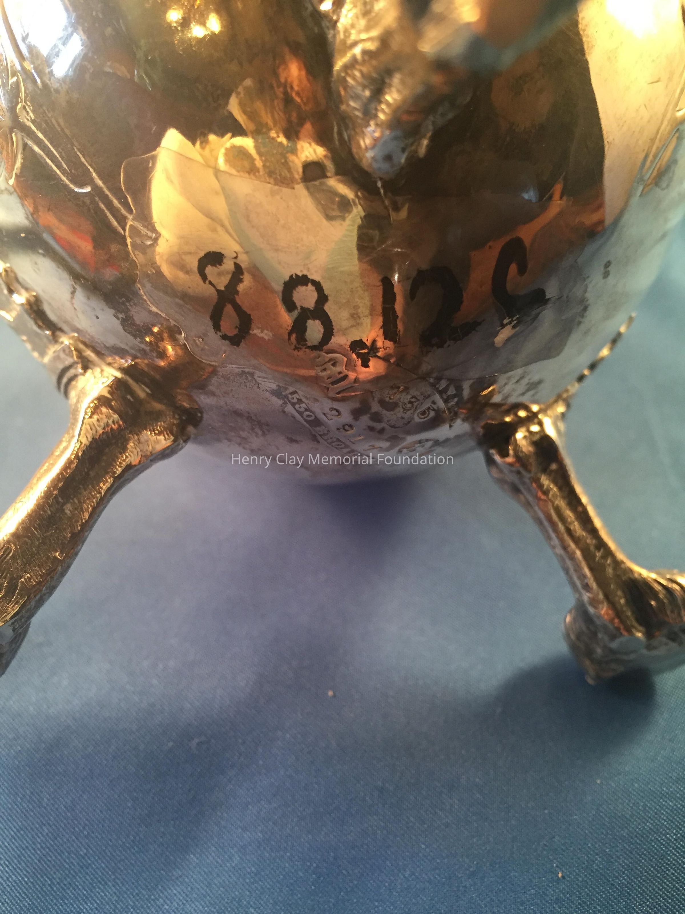 Silver tea service consists of a tray with an engraving of Henry Clay after Dodge's portrait and six matched pieces with applied decoration depicting sugar cane, coffee beans, and tea leaves. Includes a tray, teapot, hot water pot, coffee pot, sugar with lid, creamer, and a waste bowl.
