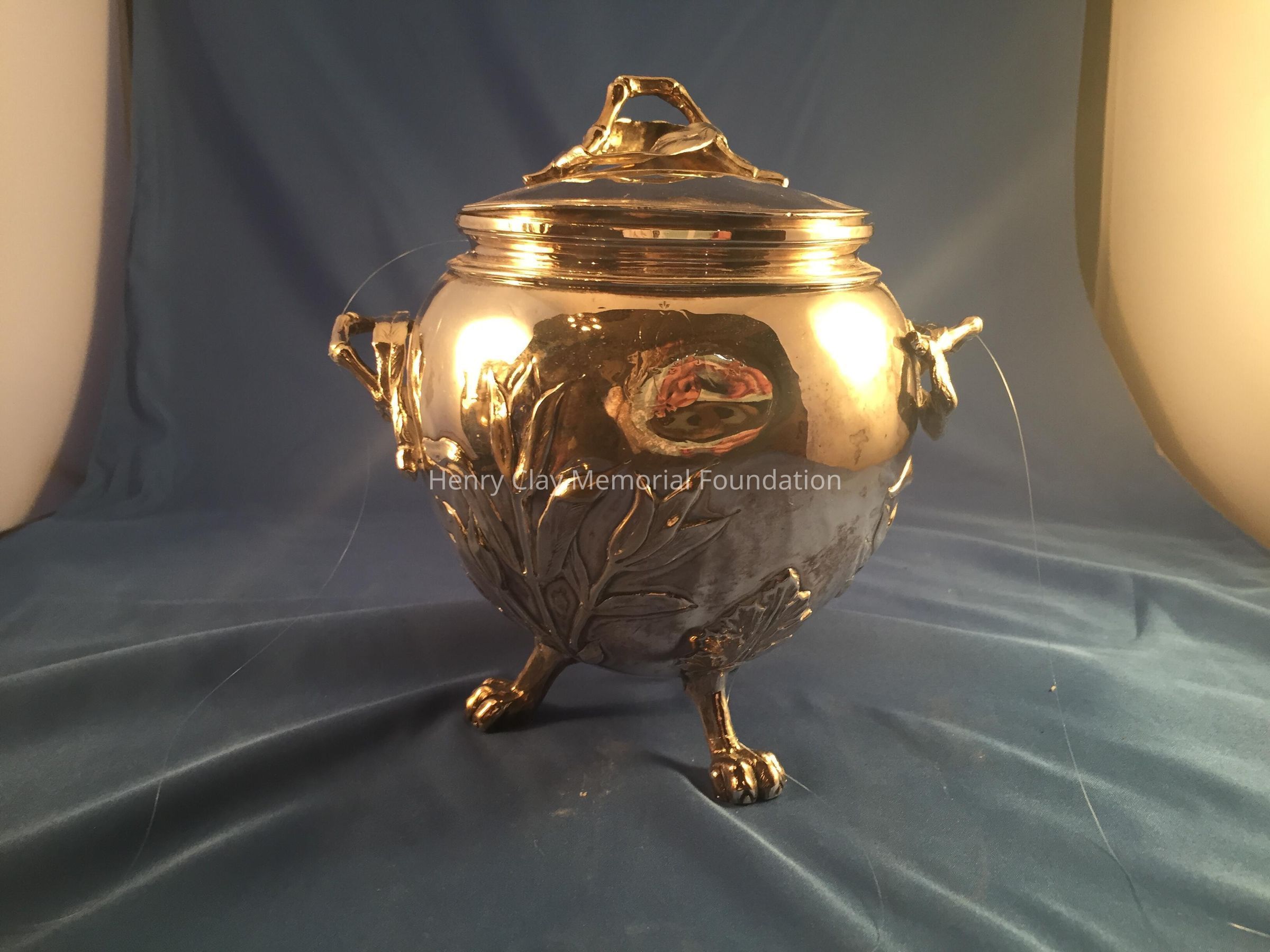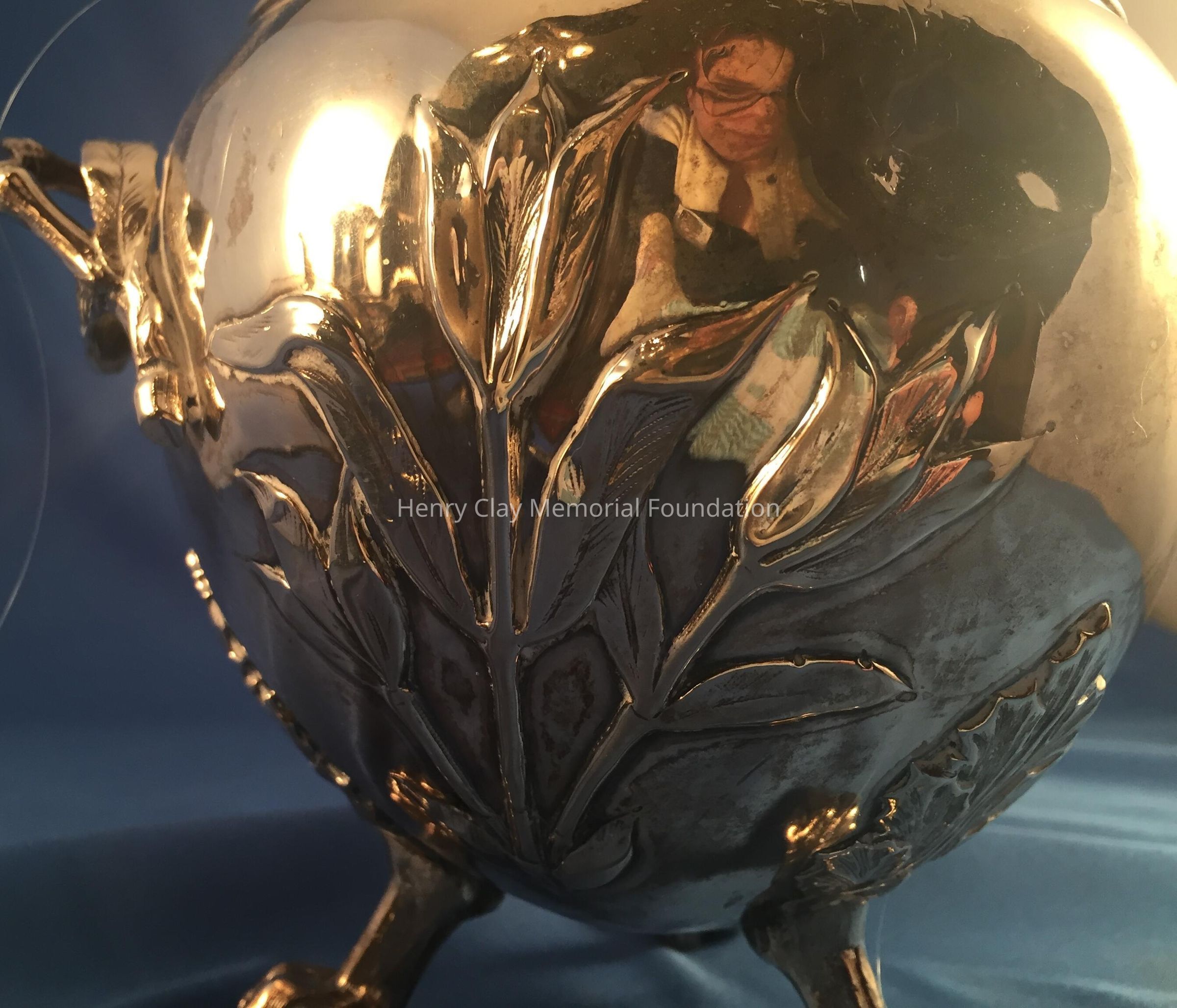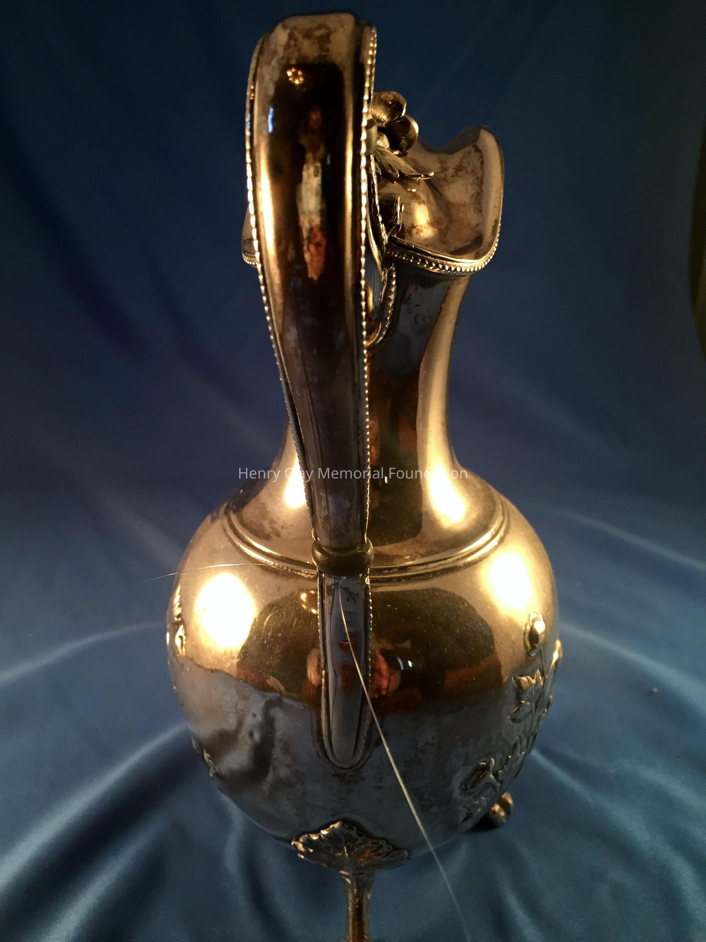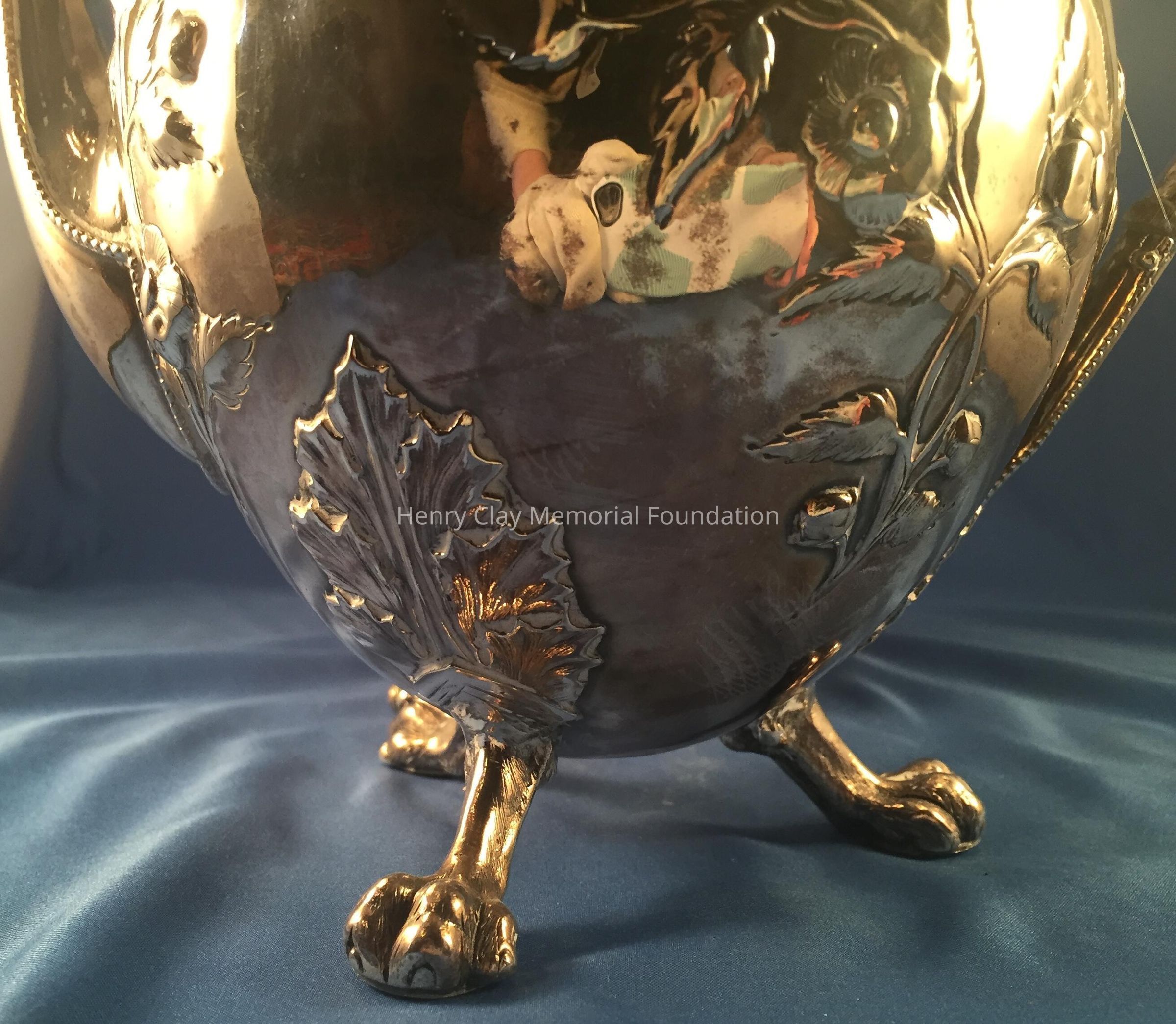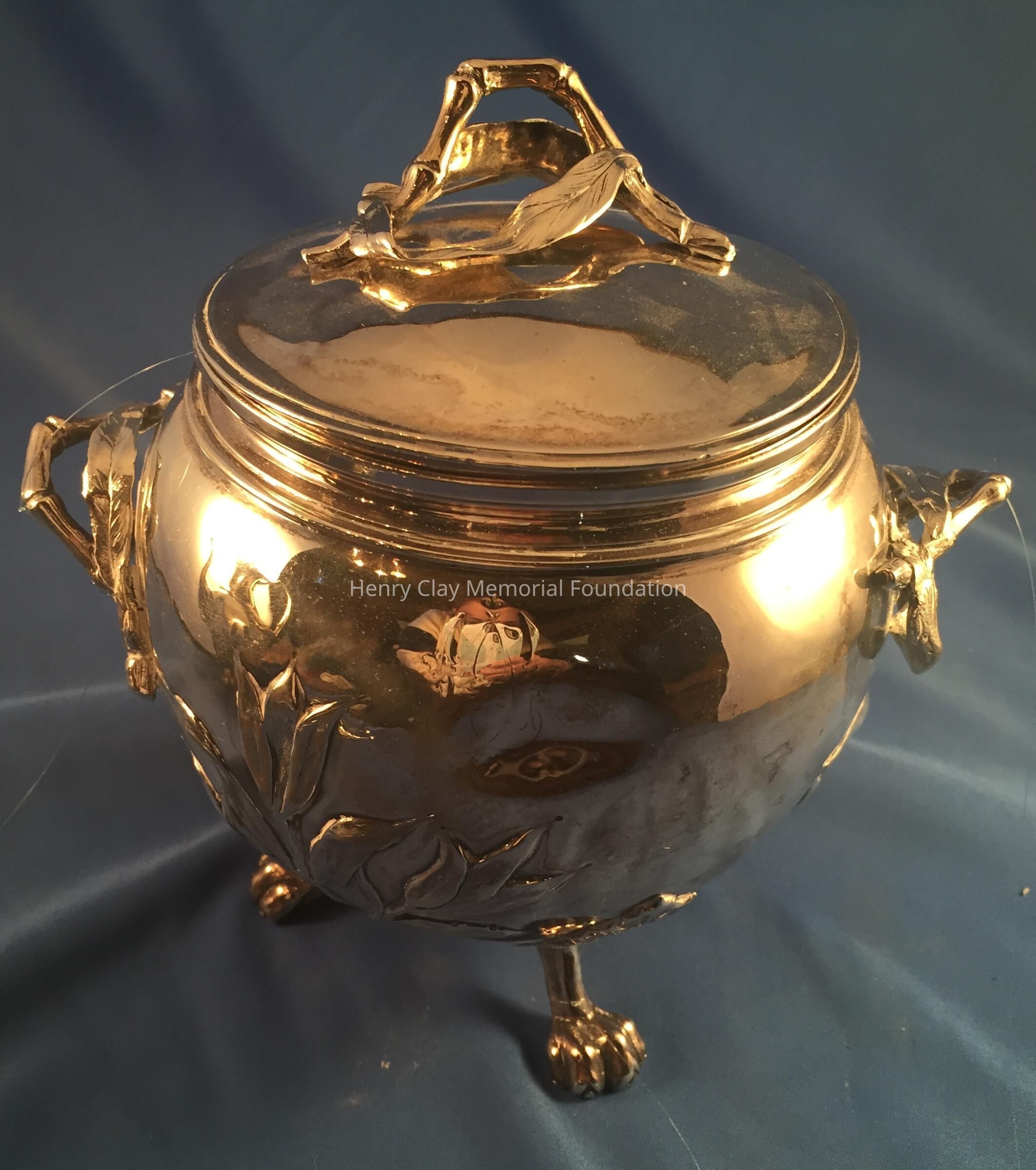 Silver tea service consists of a tray with an engraving of Henry Clay after Dodge's portrait and six matched pieces with applied decoration depicting sugar cane, coffee beans, and tea leaves. Includes a tray, teapot, hot water pot, coffee pot, sugar with lid, creamer, and a waste bowl.