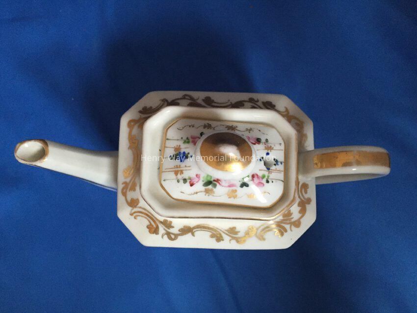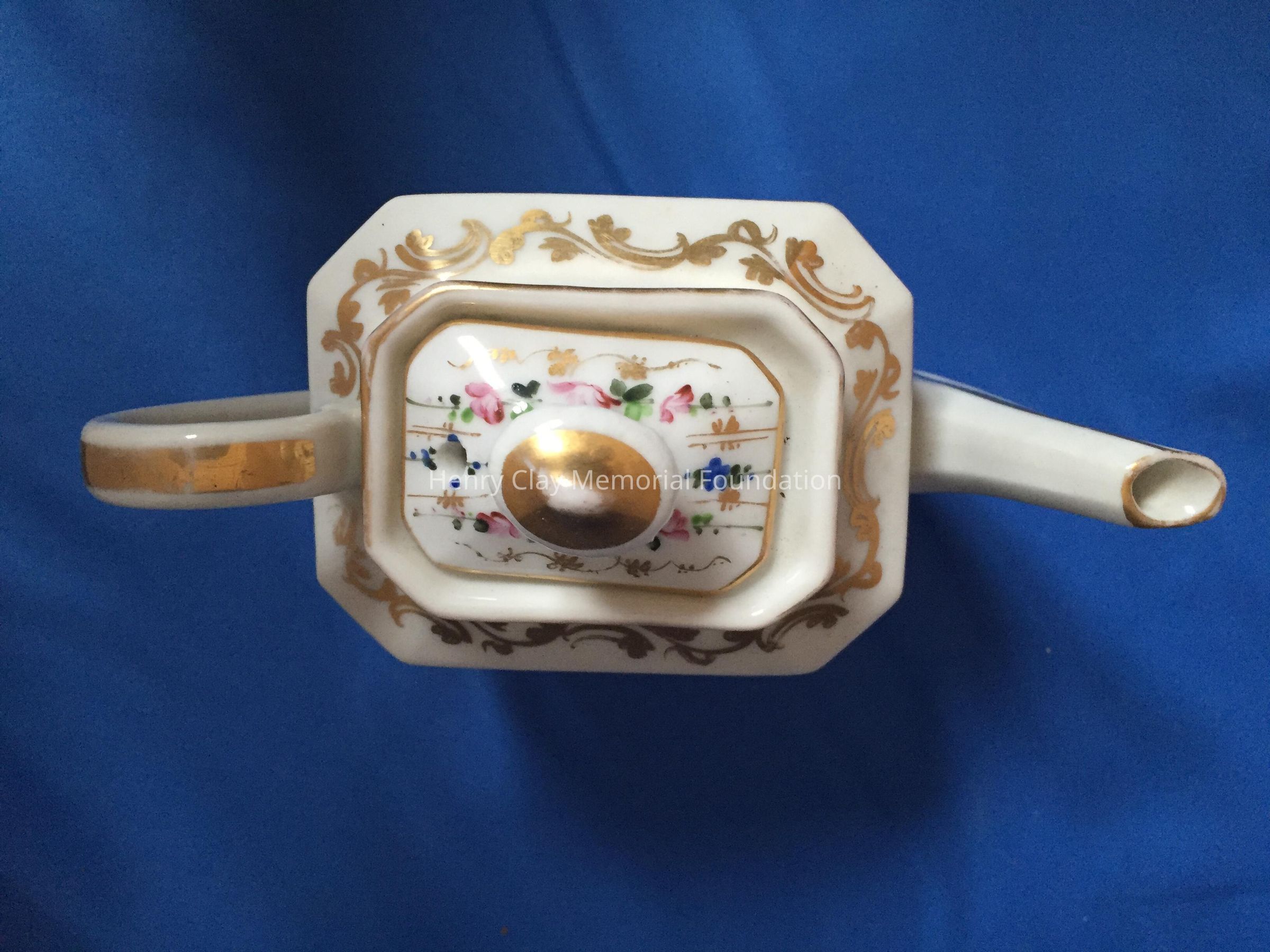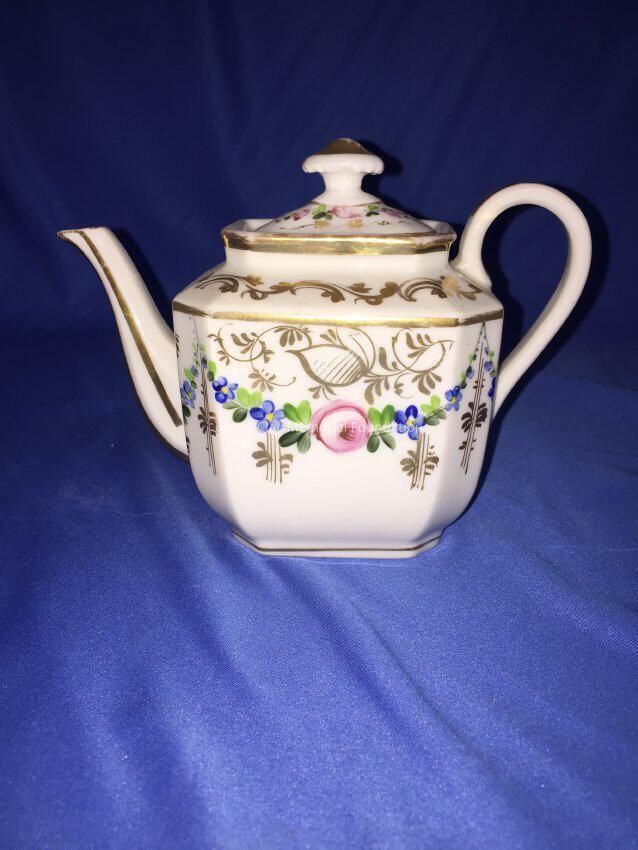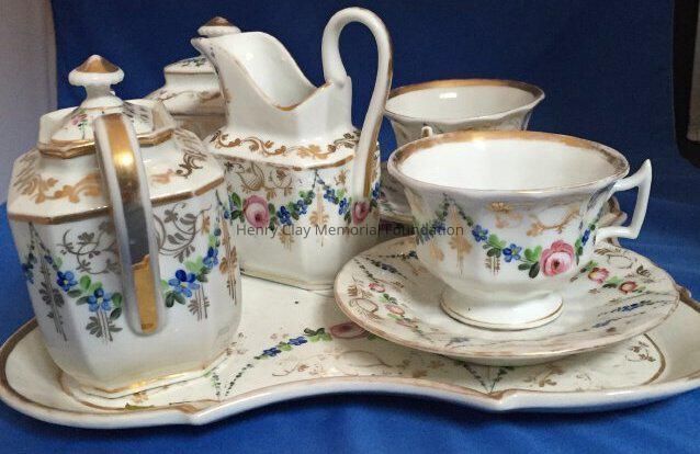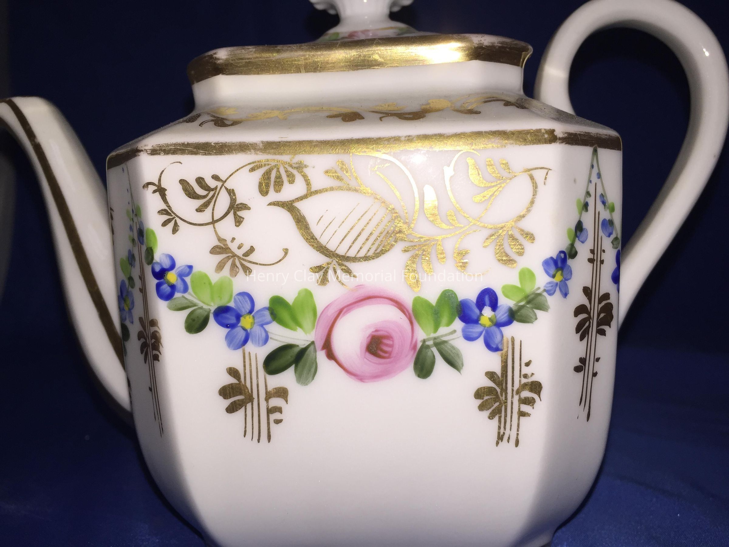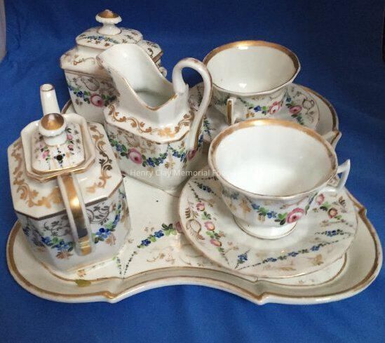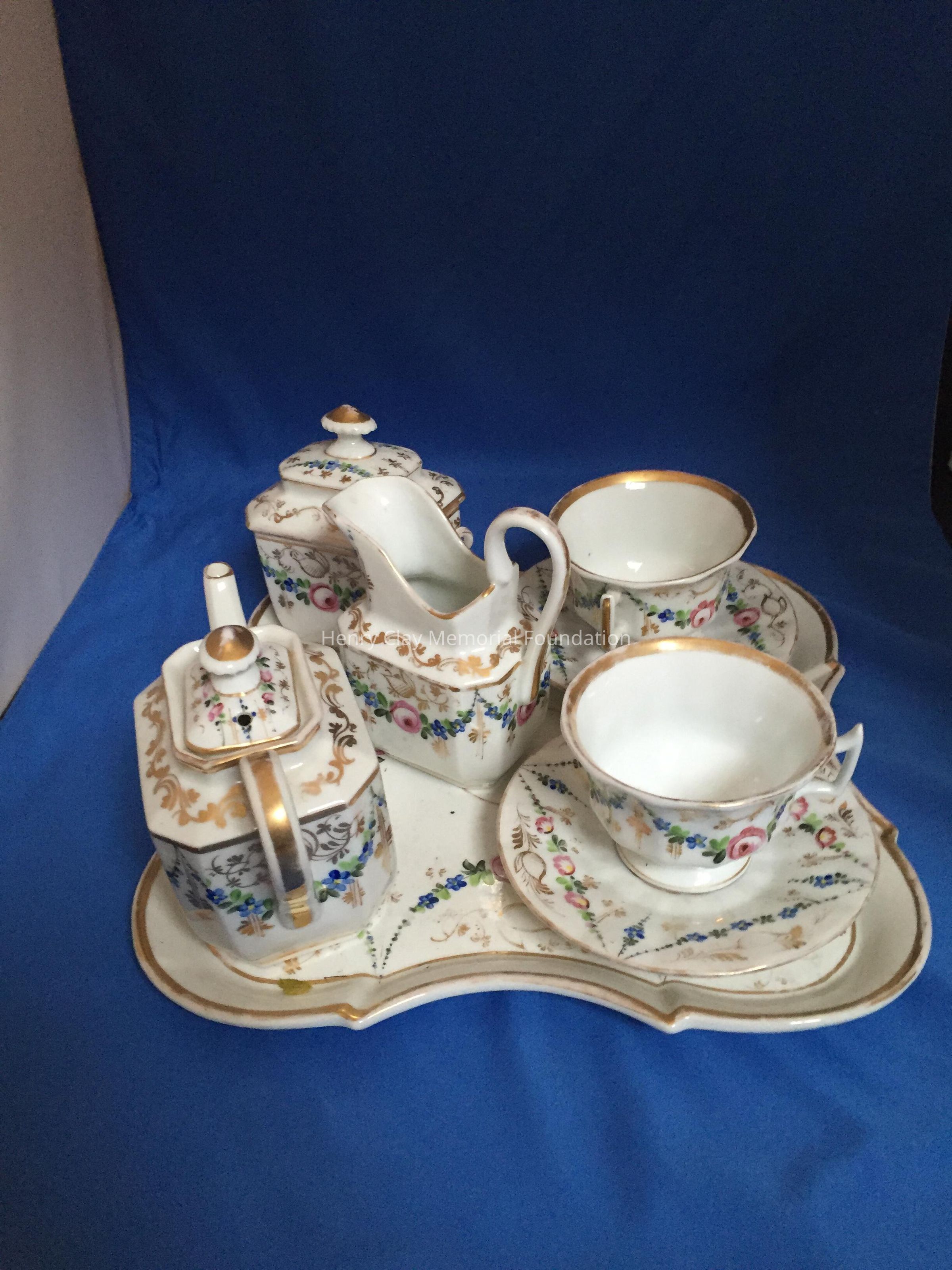 Bone china, handpainted, English (tray, teapot, creamer, sugar, 2 cups, 2 saucers) multi-colored with gold leaf. See back of catalog sheet for various china marks.