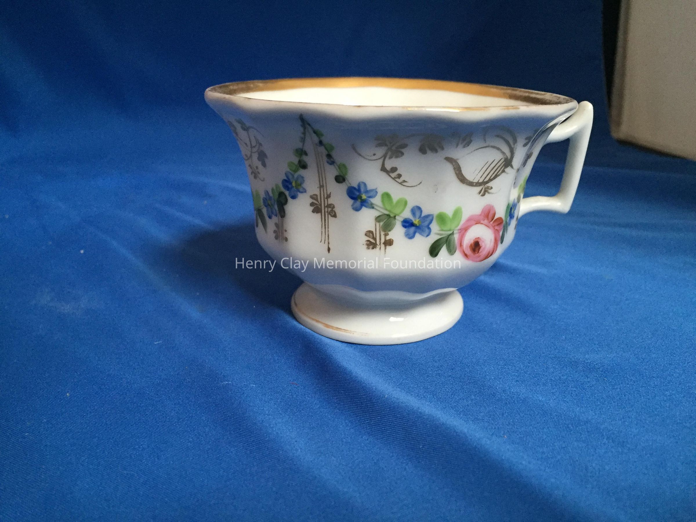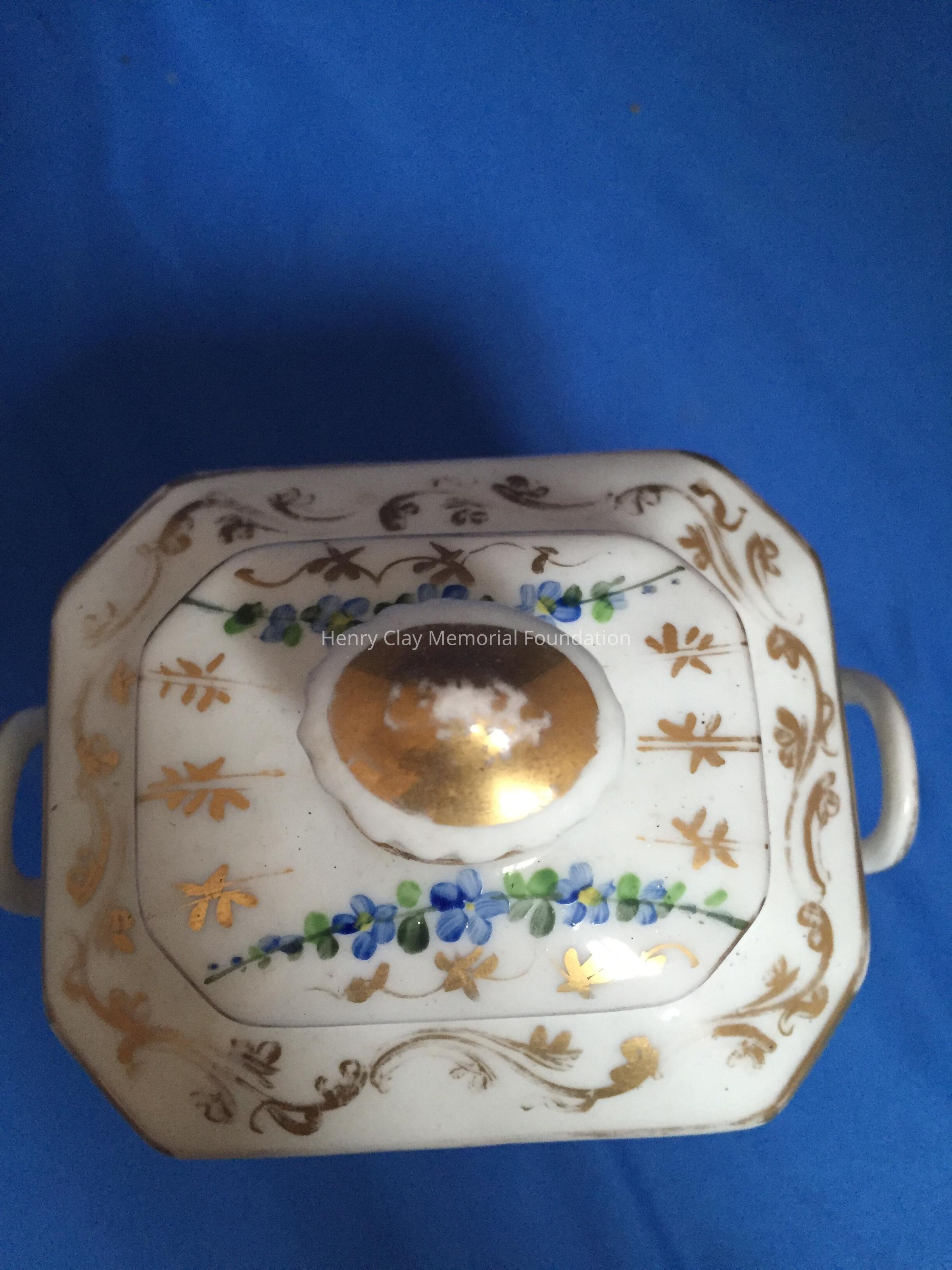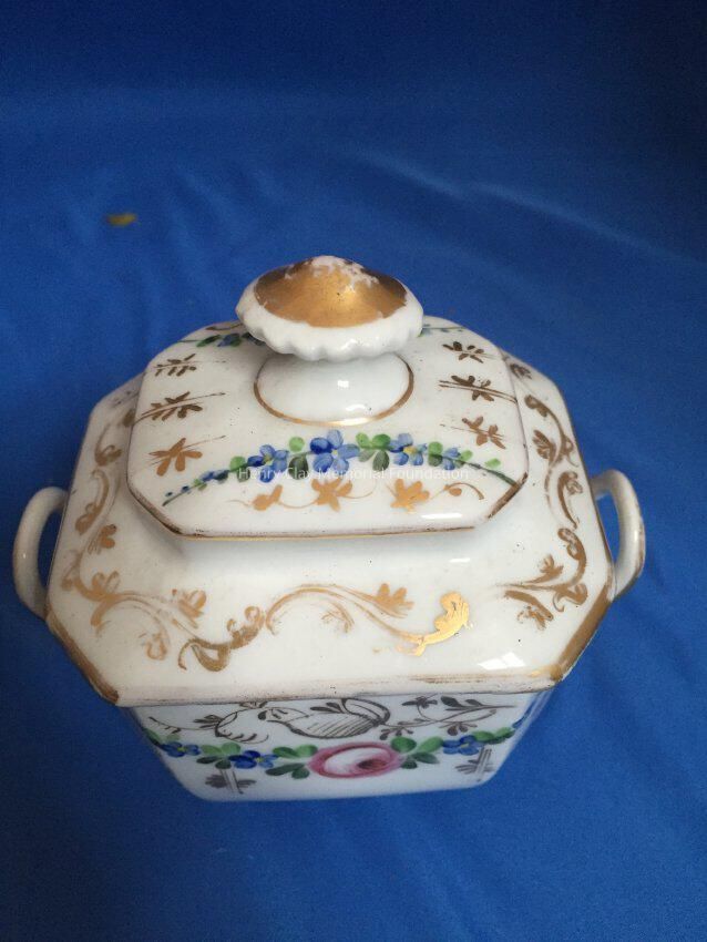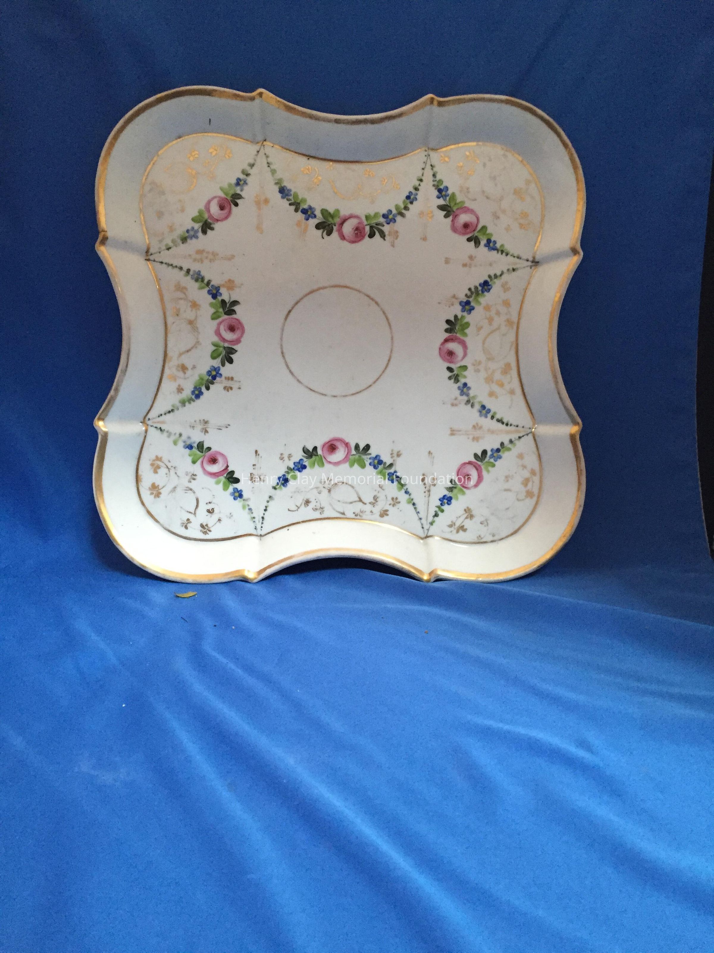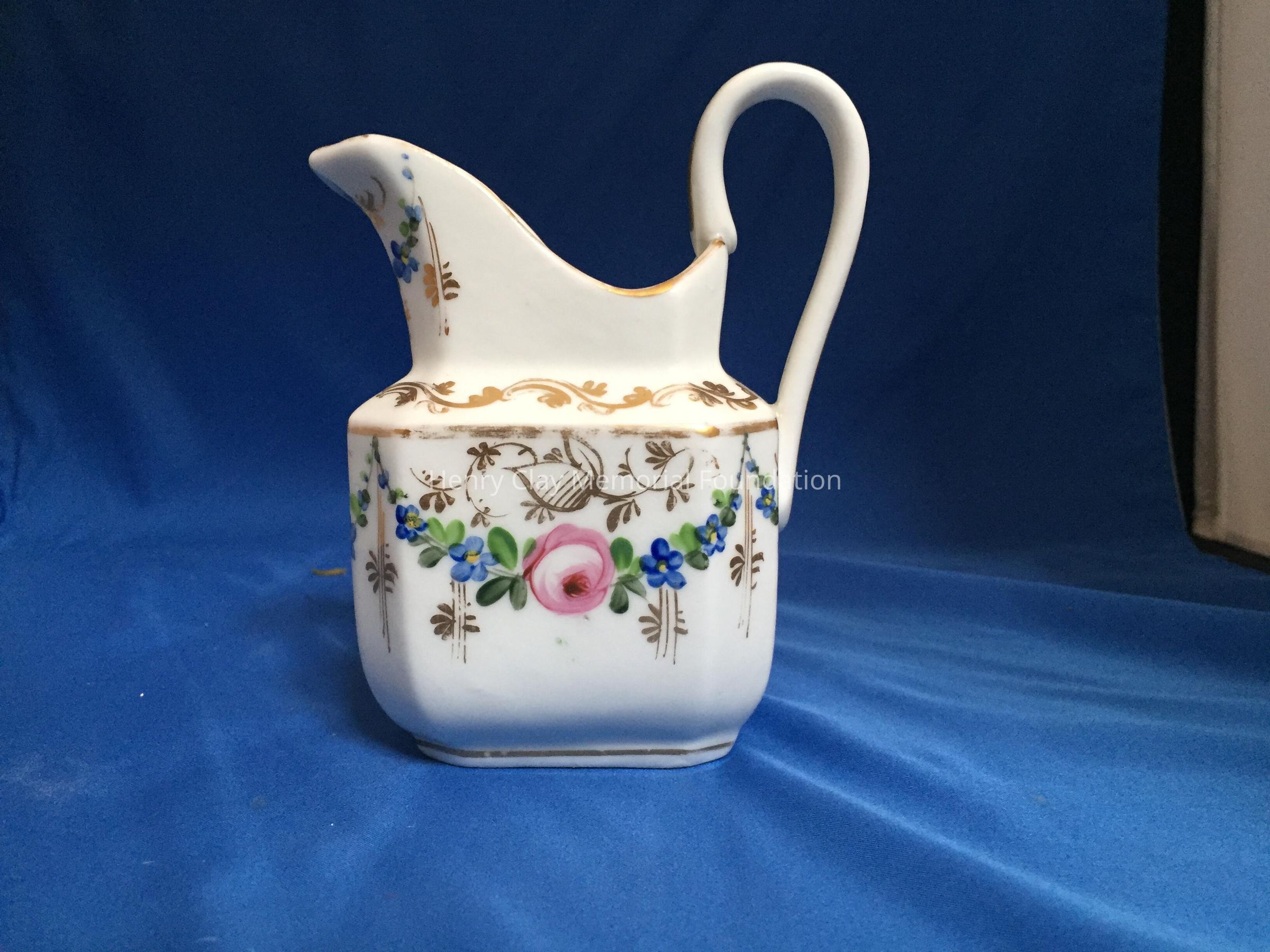 Bone china, handpainted, English (tray, teapot, creamer, sugar, 2 cups, 2 saucers) multi-colored with gold leaf. See back of catalog sheet for various china marks.