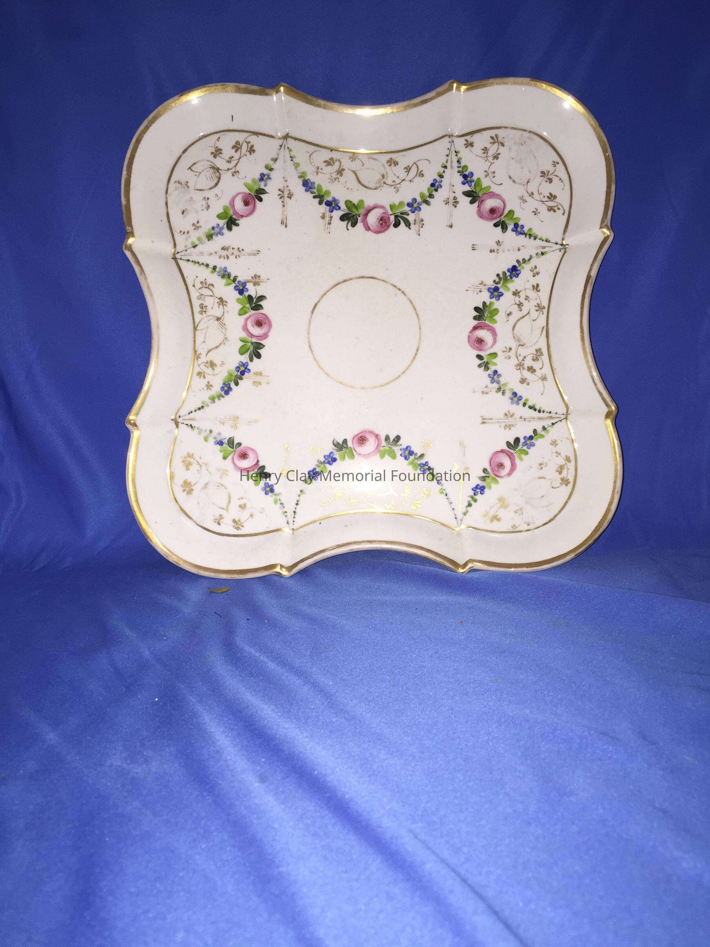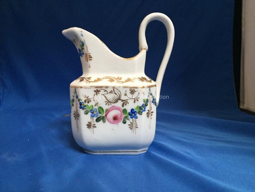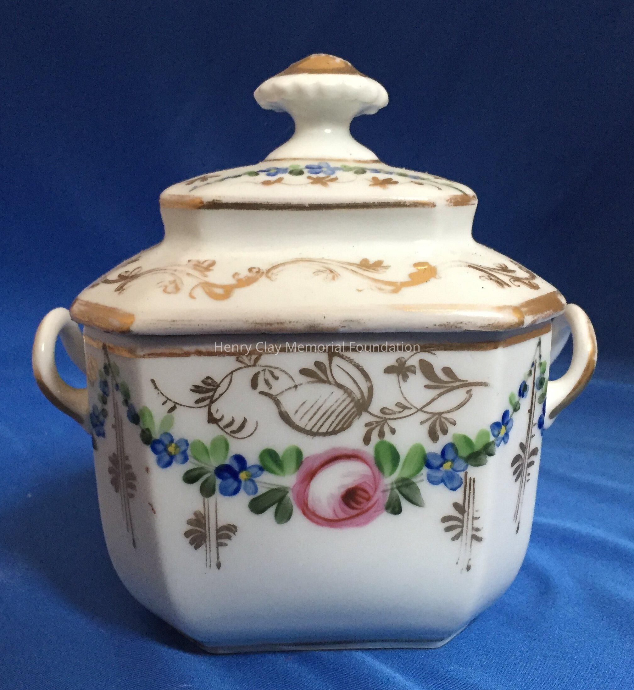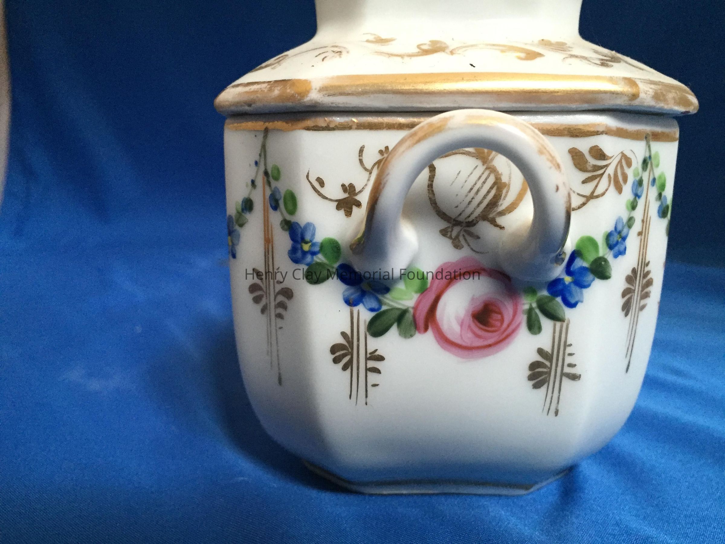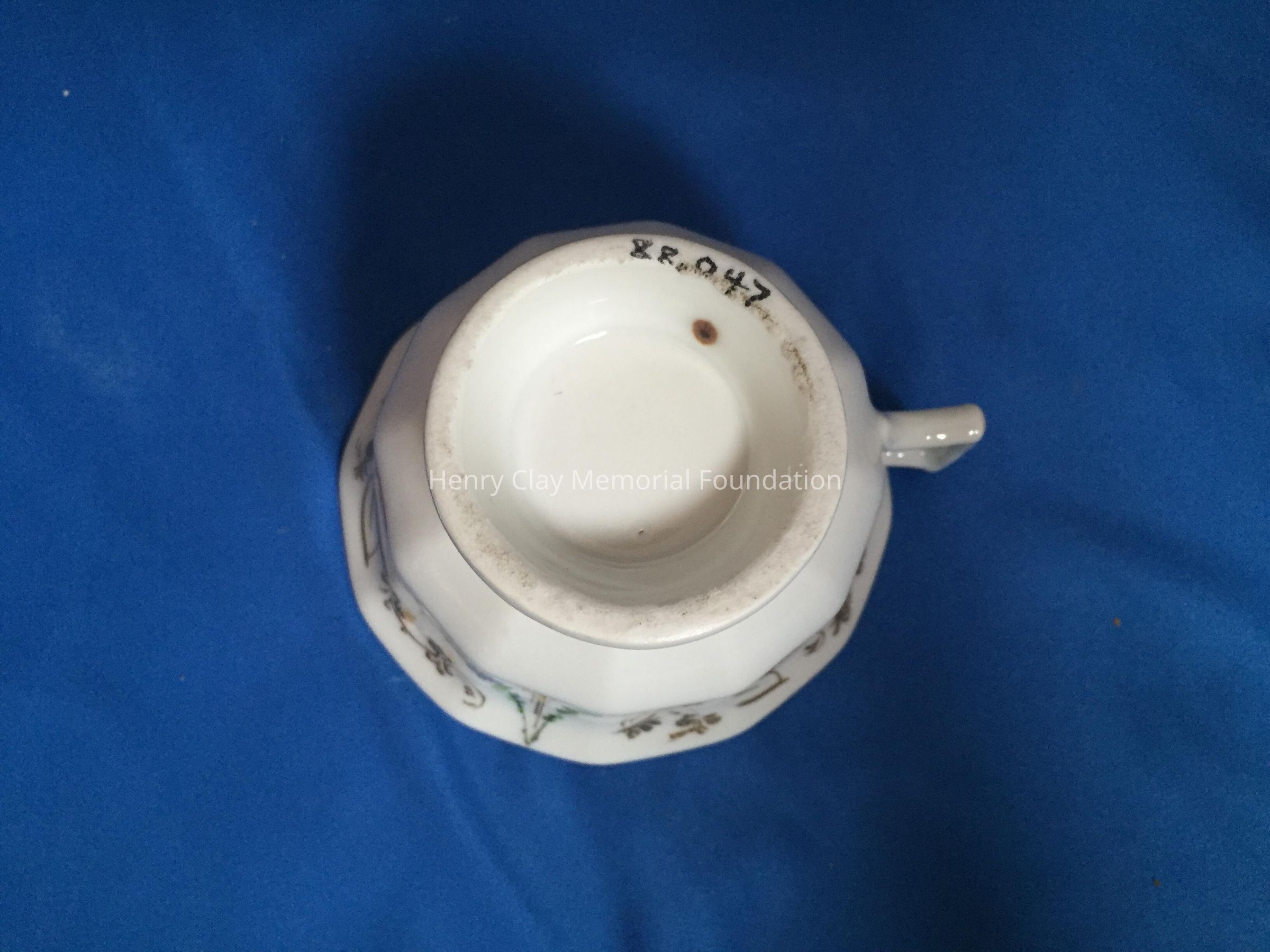 Bone china, handpainted, English (tray, teapot, creamer, sugar, 2 cups, 2 saucers) multi-colored with gold leaf. See back of catalog sheet for various china marks.