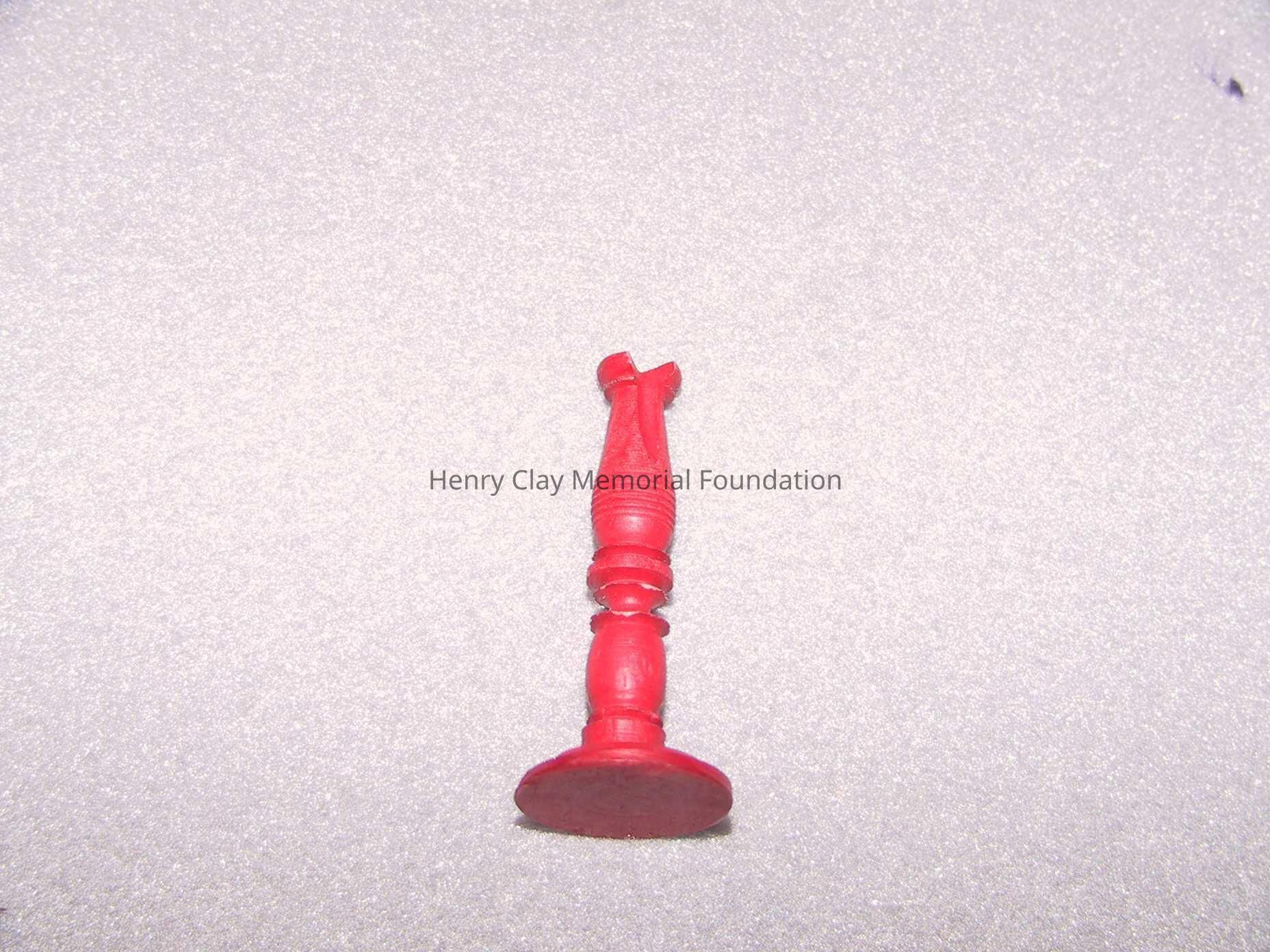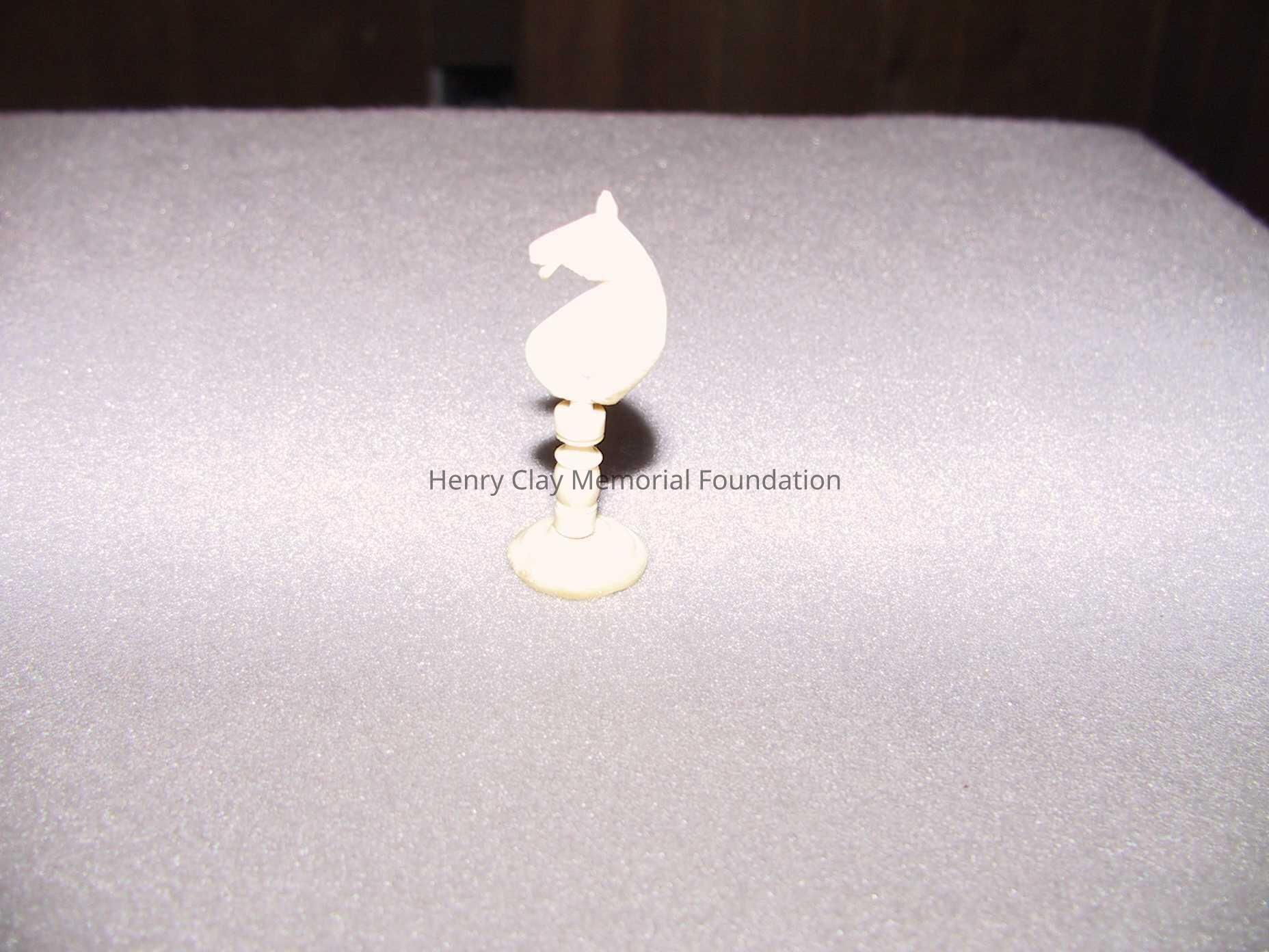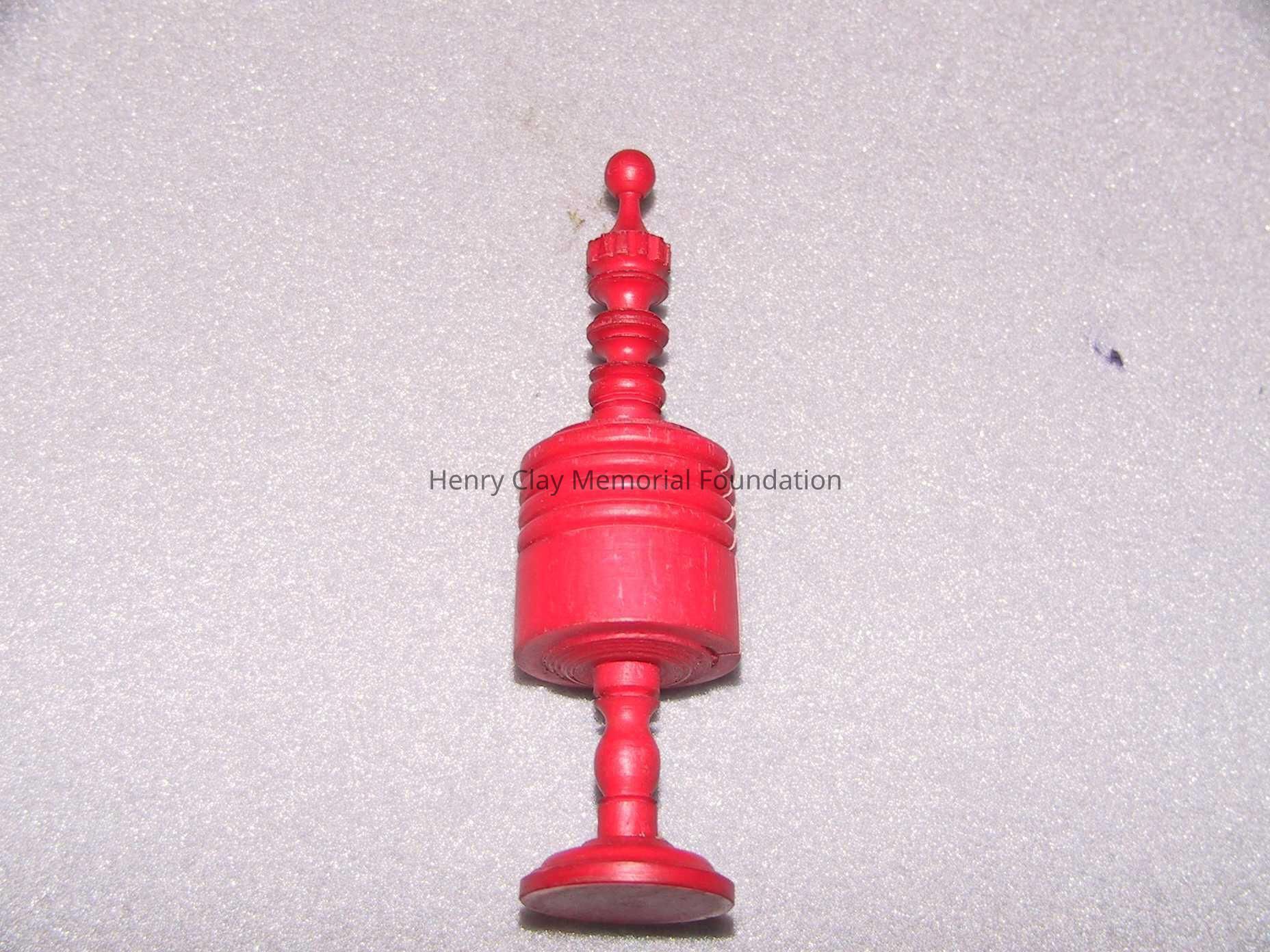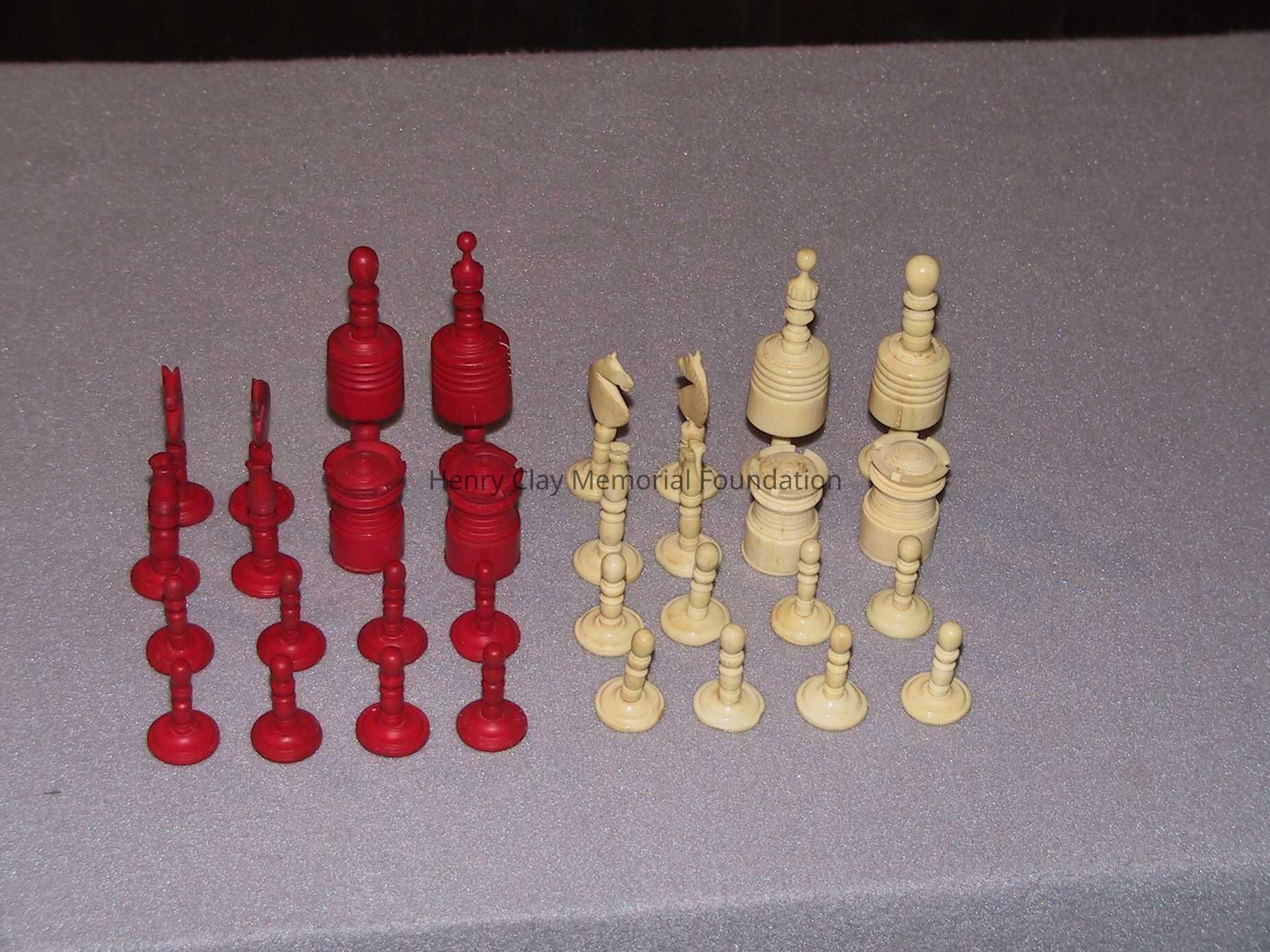 Set of 32 ivory chess men and one wooden storage box. There are 16 red and 16 white men. There are 8 pawns, 2 rooks, 2 knights, 2 bishops, a queen, and a king in each color. The pieces are hand carved and very ornate. The box is a dark reddish wood and appears to have been made to hold the pieces. It is handmade and has a sliding lid with a thumb notch for opening. Each of the pieces is threaded and screws together. Some have more than two parts (base and body).Dimensions