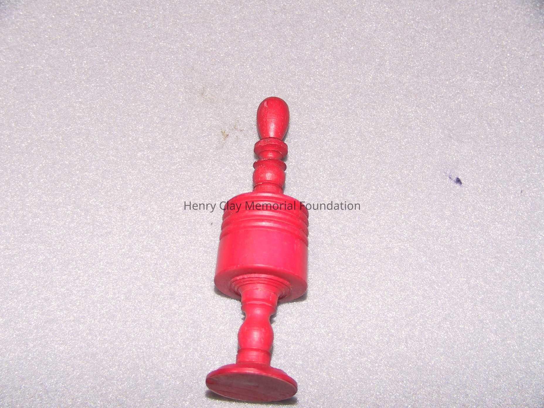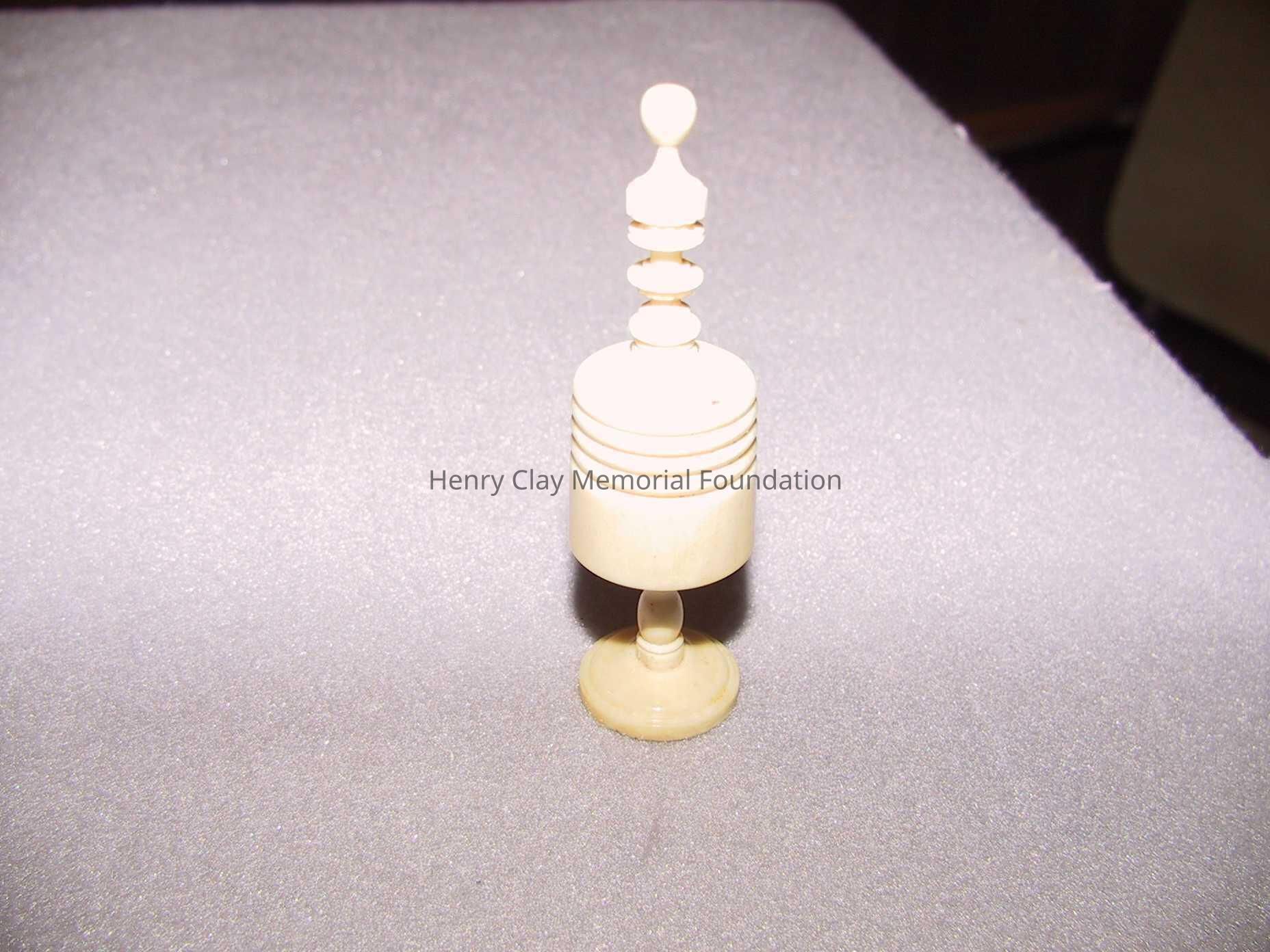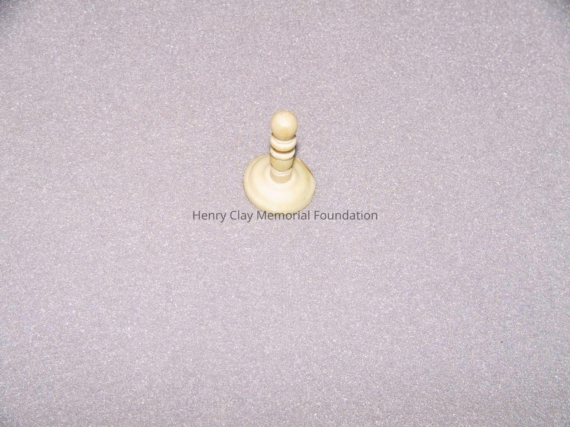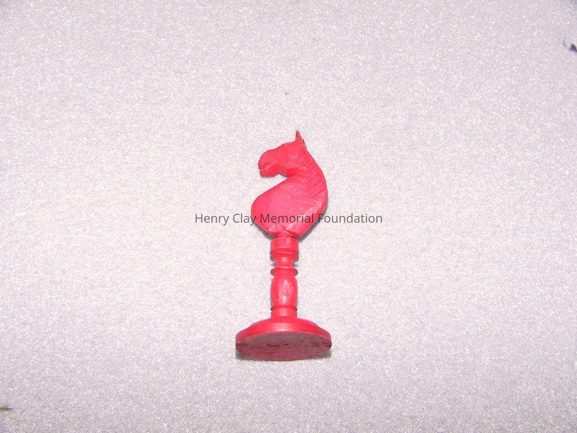 Set of 32 ivory chess men and one wooden storage box. There are 16 red and 16 white men. There are 8 pawns, 2 rooks, 2 knights, 2 bishops, a queen, and a king in each color. The pieces are hand carved and very ornate. The box is a dark reddish wood and appears to have been made to hold the pieces. It is handmade and has a sliding lid with a thumb notch for opening. Each of the pieces is threaded and screws together. Some have more than two parts (base and body).Dimensions