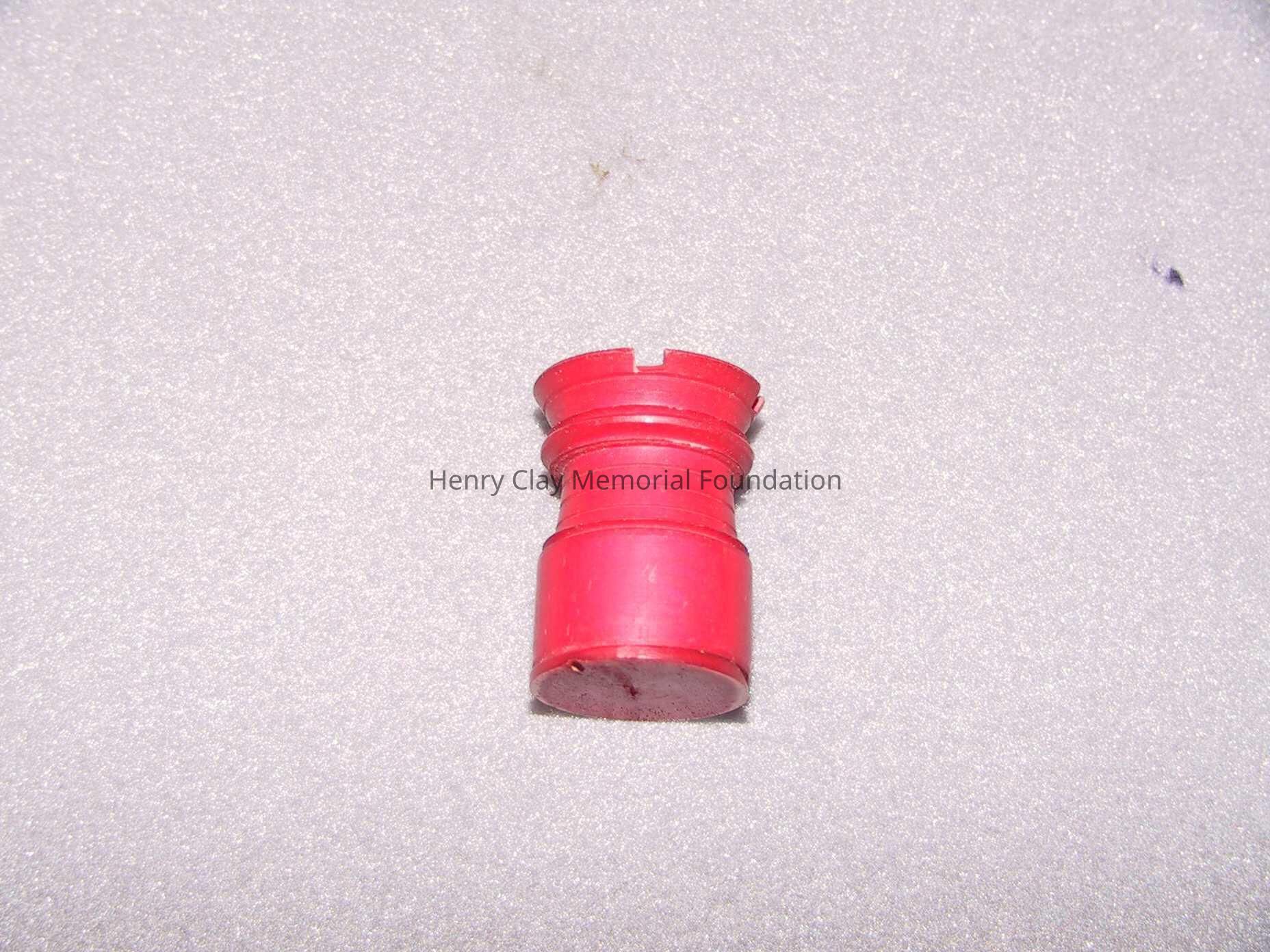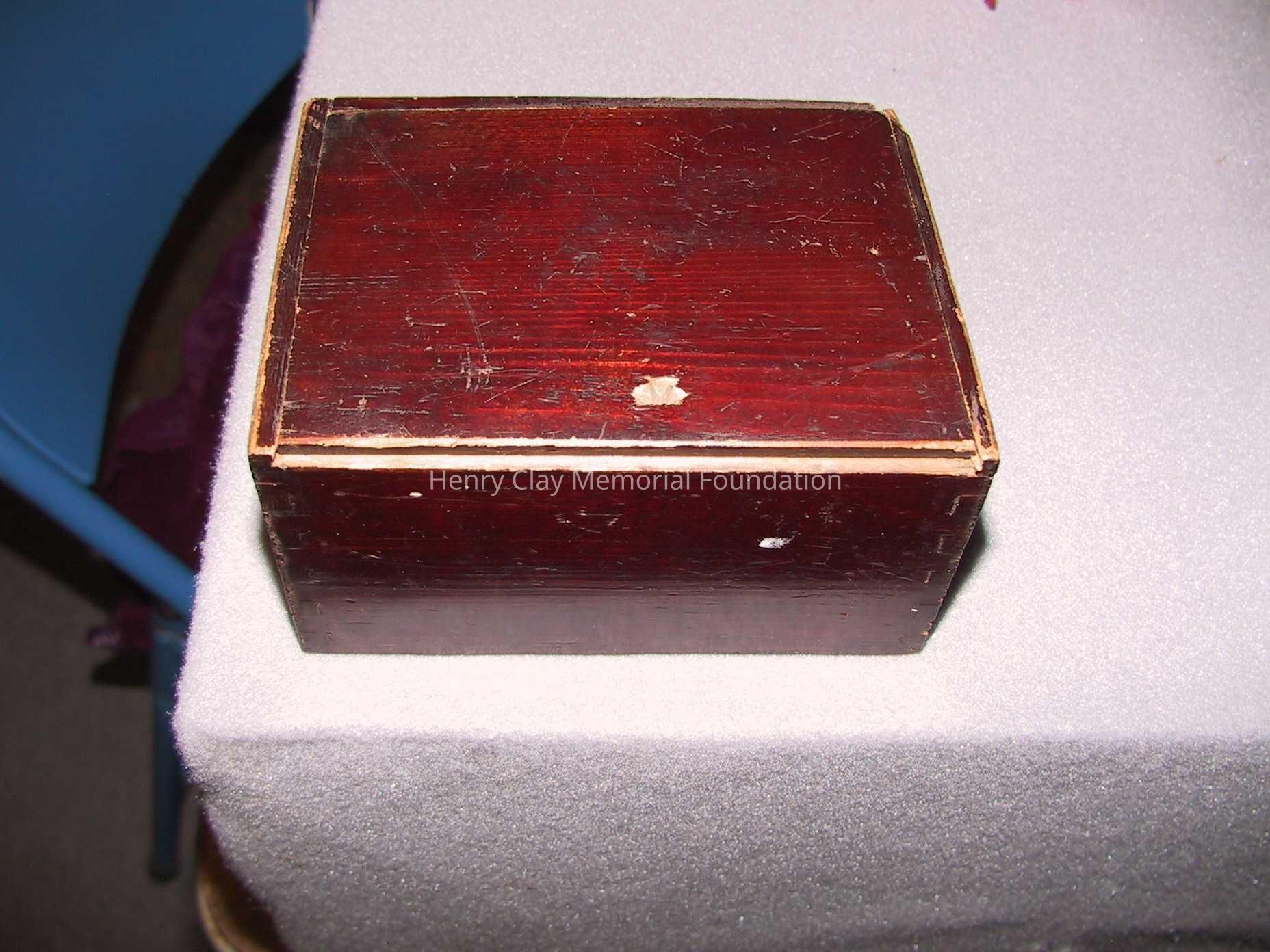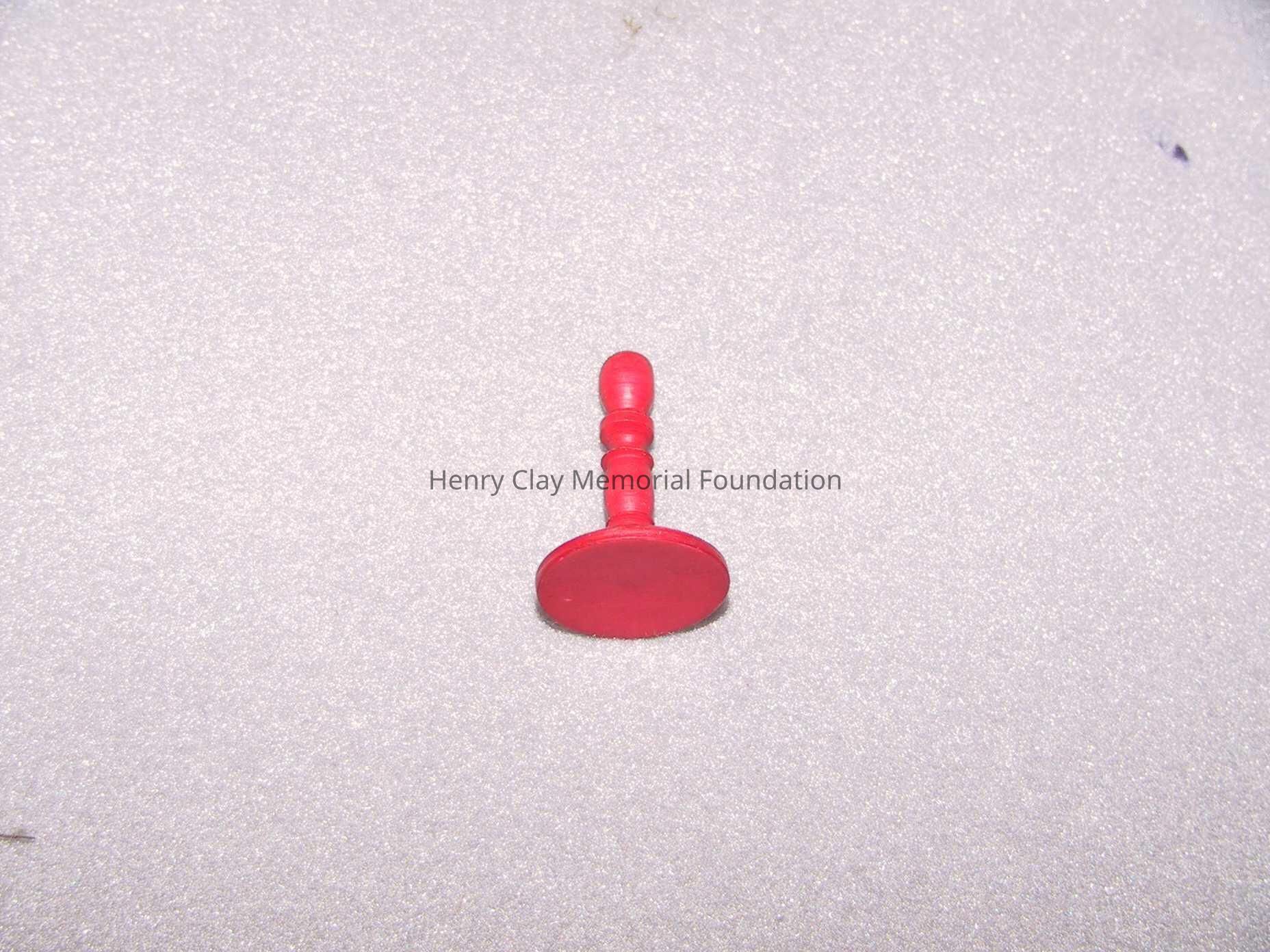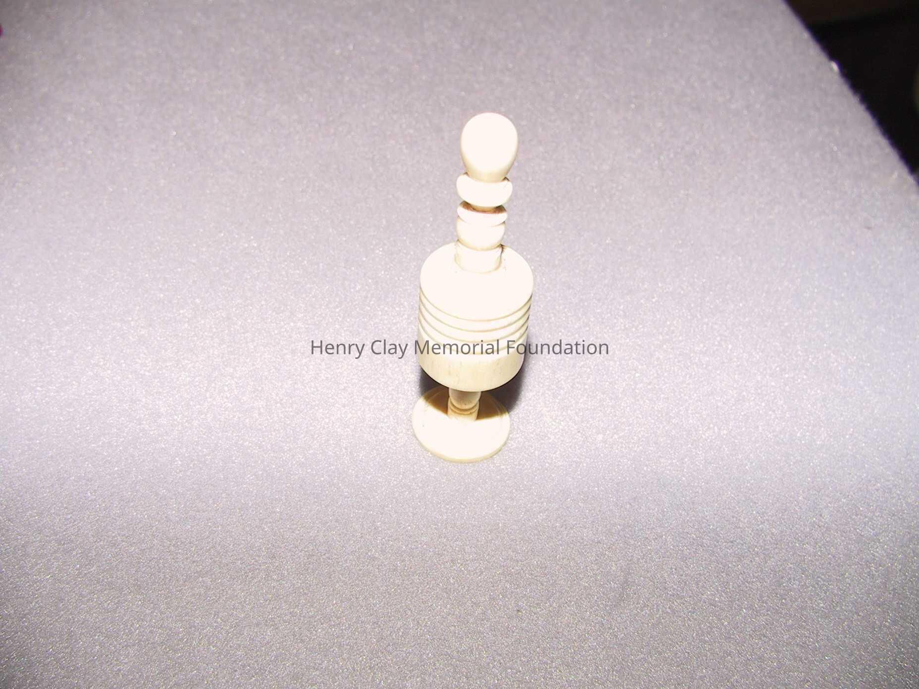 Set of 32 ivory chess men and one wooden storage box. There are 16 red and 16 white men. There are 8 pawns, 2 rooks, 2 knights, 2 bishops, a queen, and a king in each color. The pieces are hand carved and very ornate. The box is a dark reddish wood and appears to have been made to hold the pieces. It is handmade and has a sliding lid with a thumb notch for opening. Each of the pieces is threaded and screws together. Some have more than two parts (base and body).Dimensions