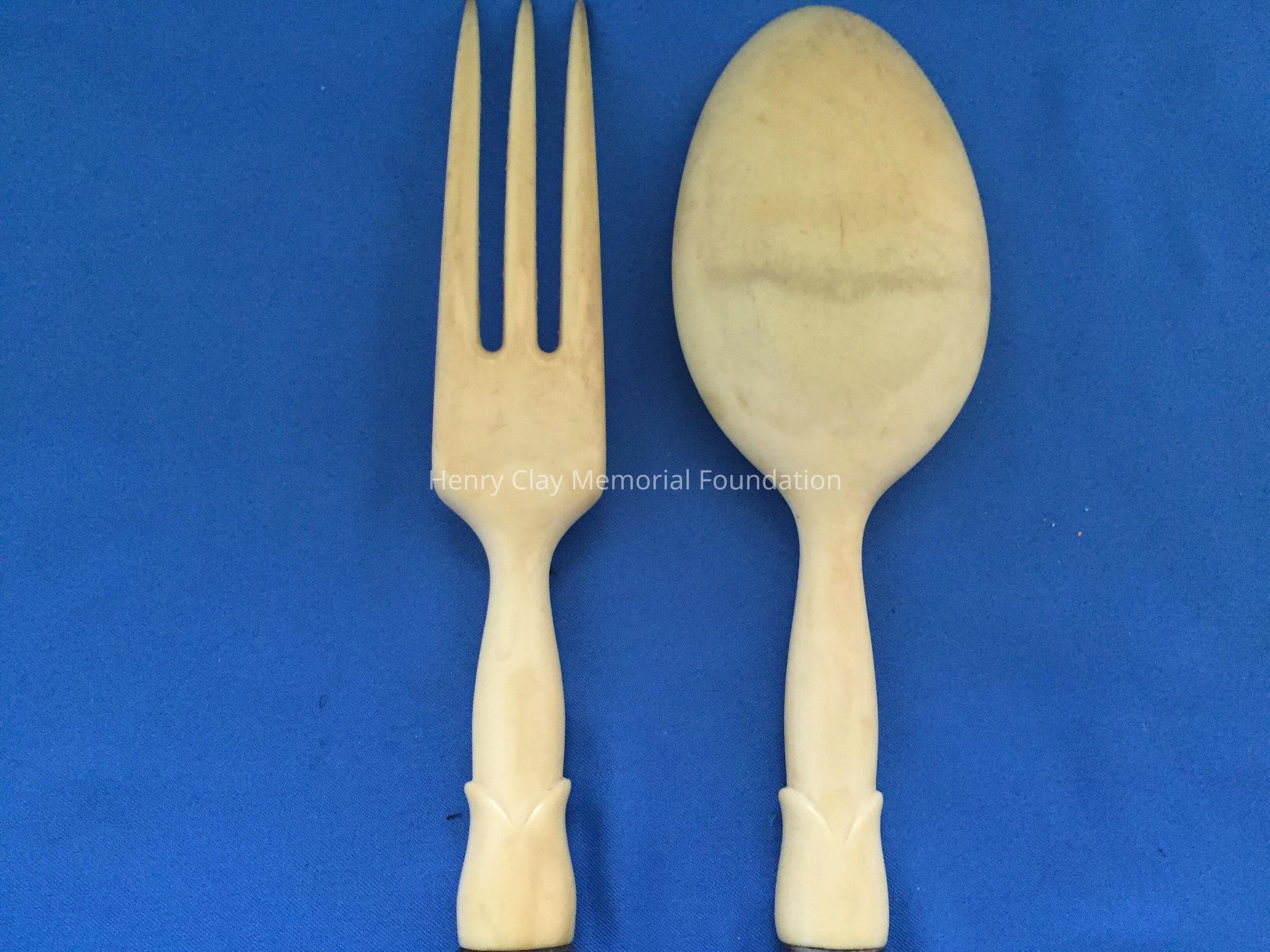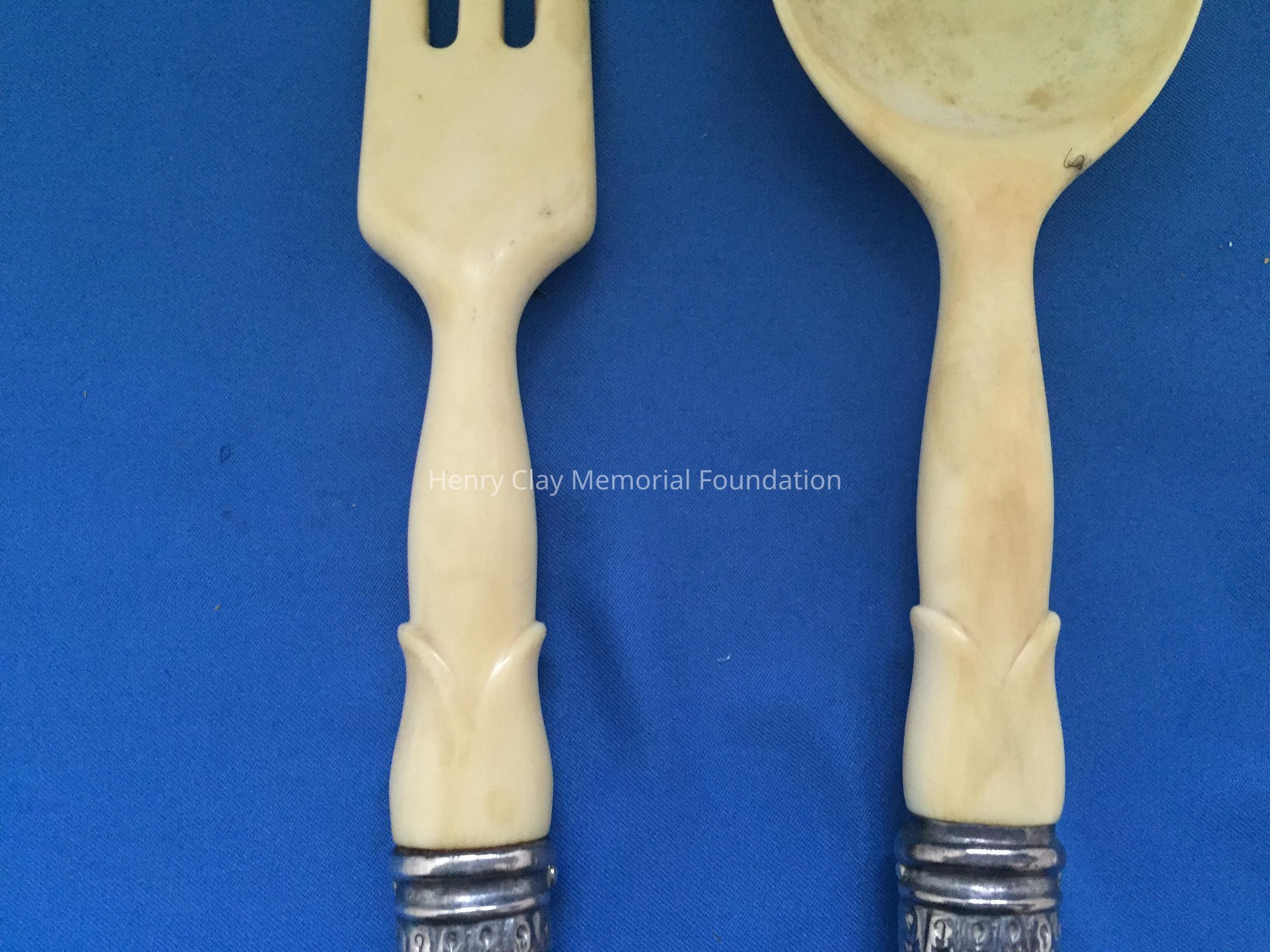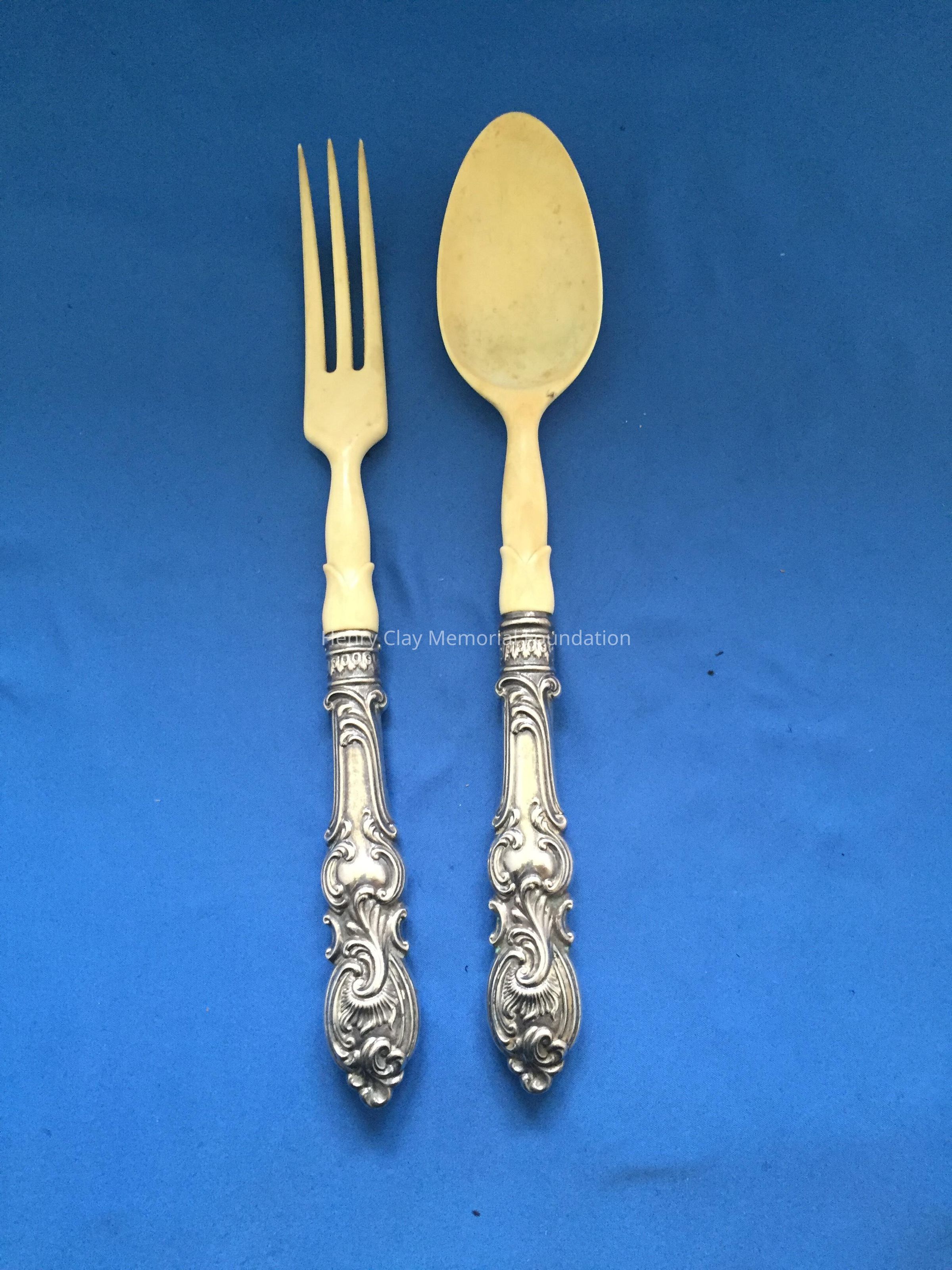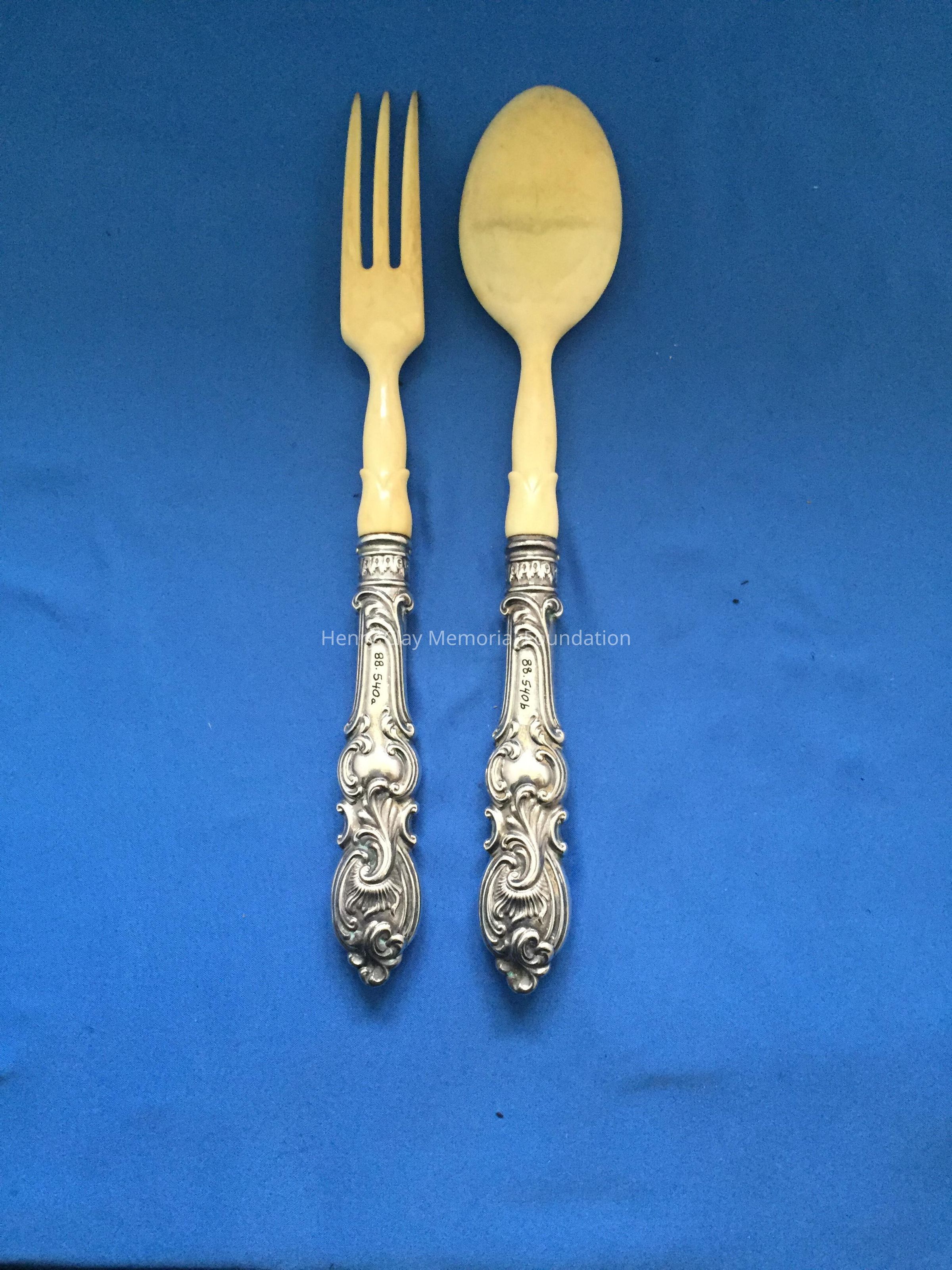 Spoon and fork. Hollow, sterling silver handle, stamped "Sterling 560", with other hallmarks. Fork and Spoon are made of ivory.Dimensions