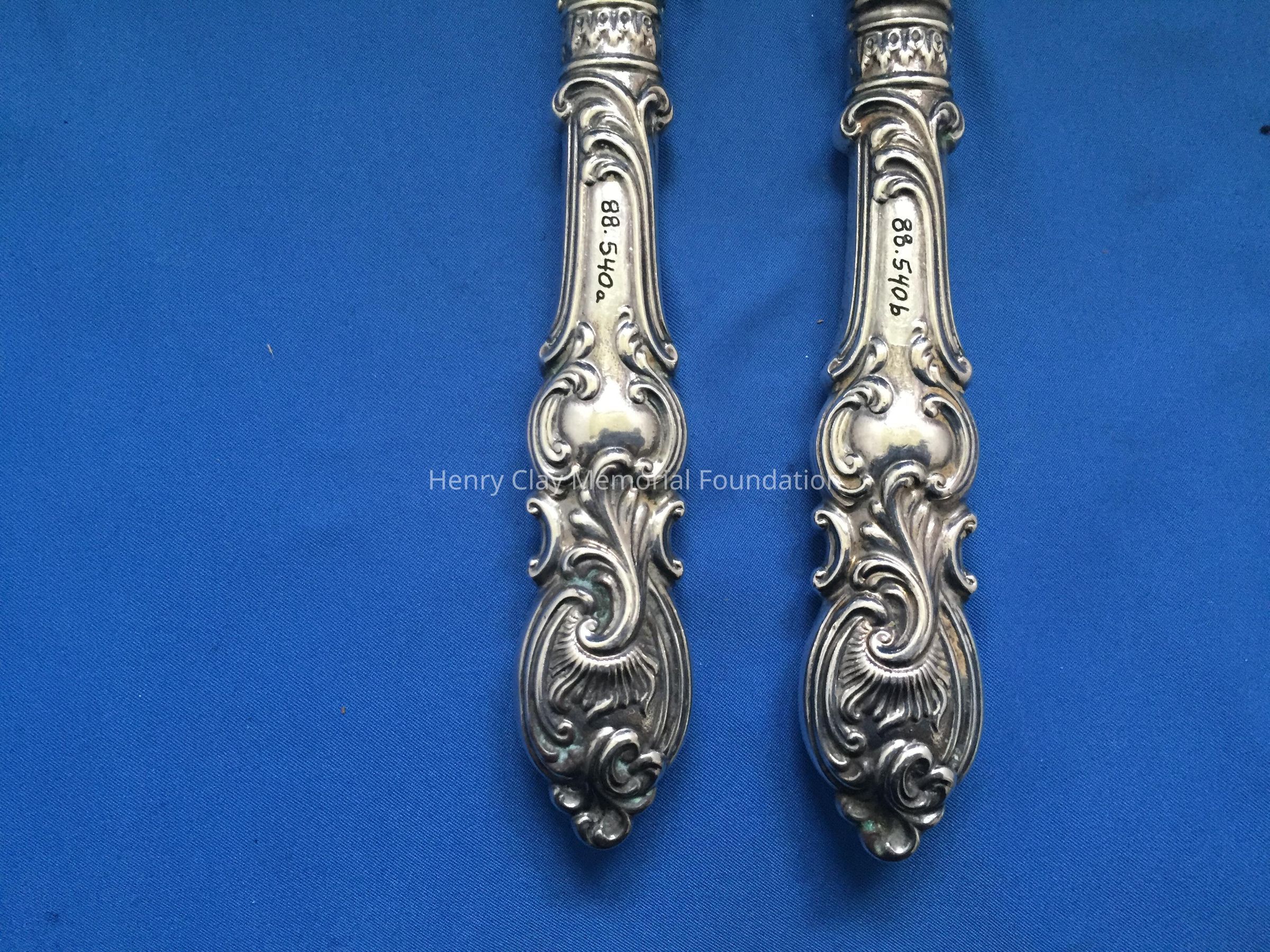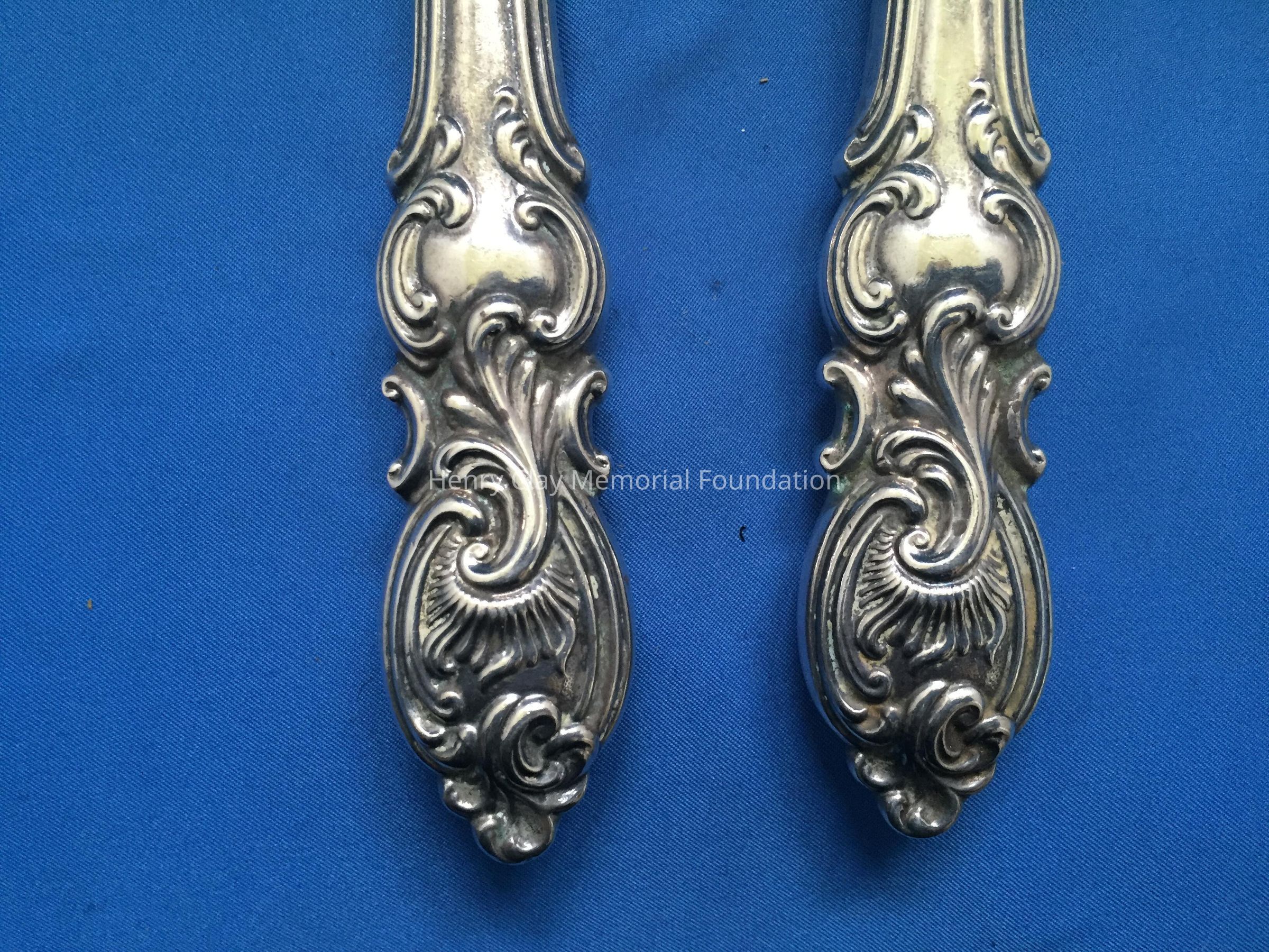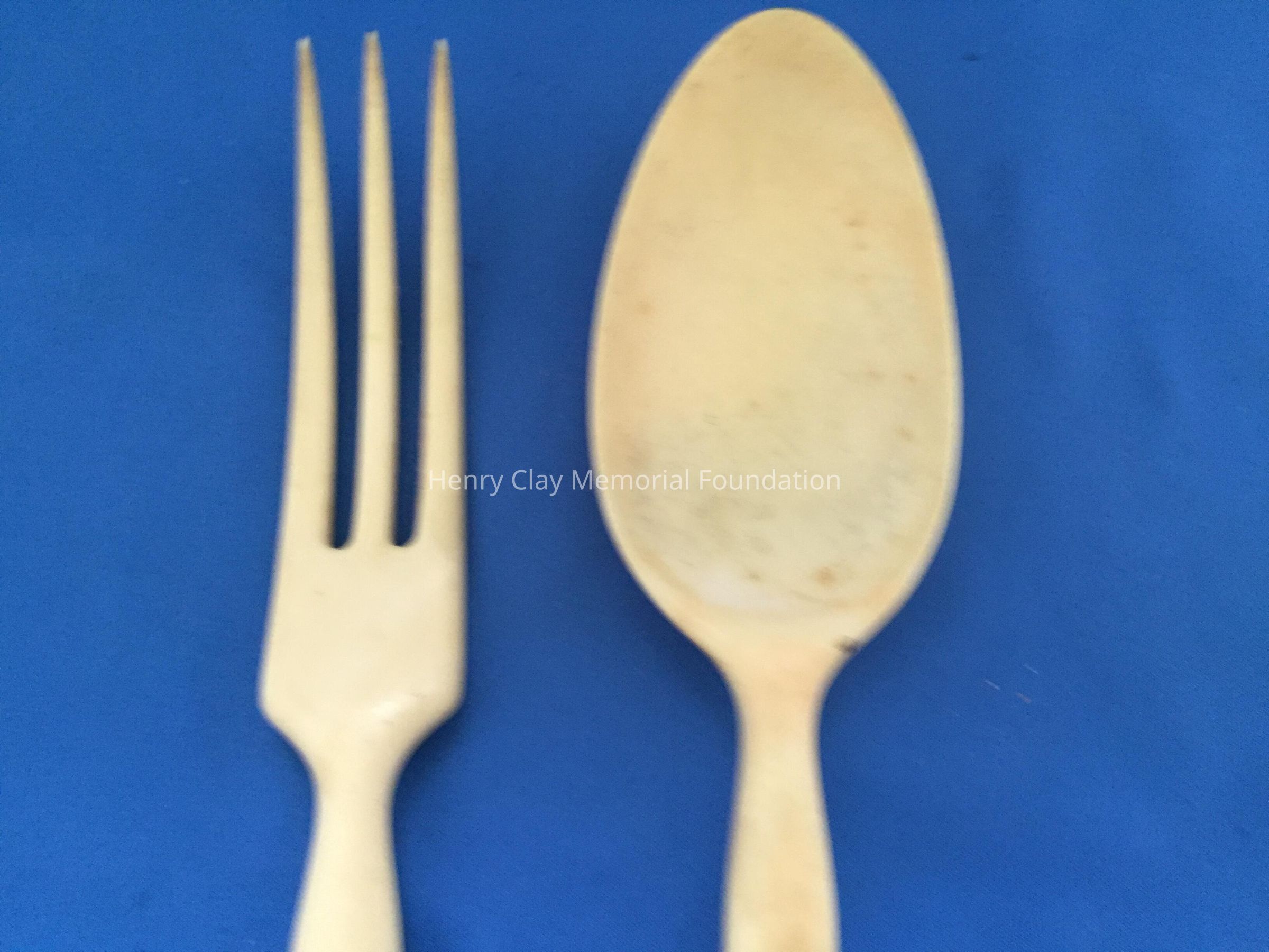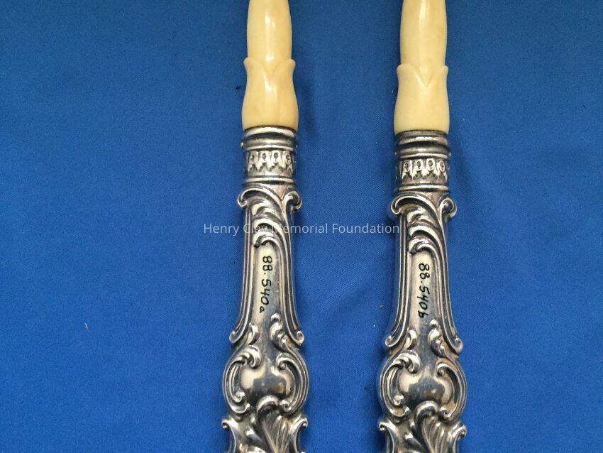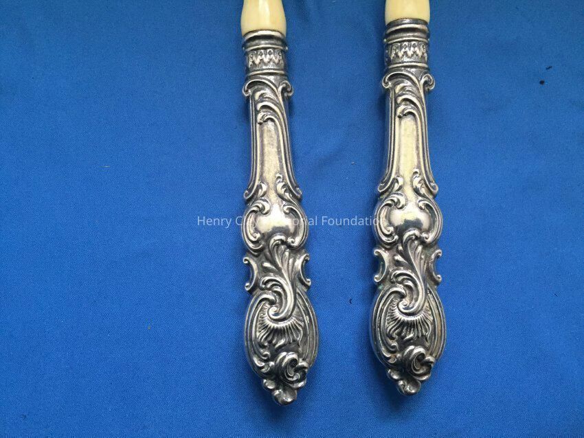 Spoon and fork. Hollow, sterling silver handle, stamped "Sterling 560", with other hallmarks. Fork and Spoon are made of ivory.Dimensions