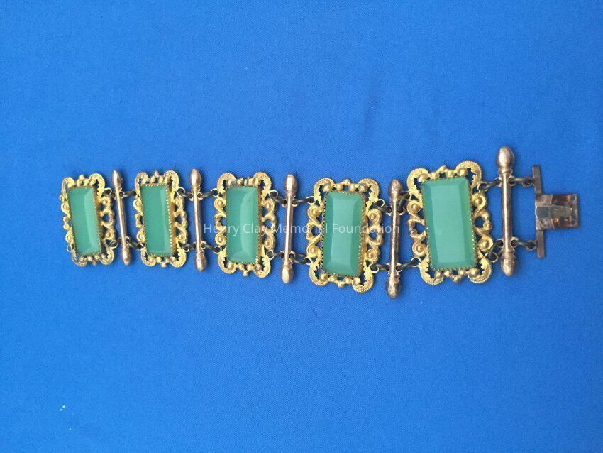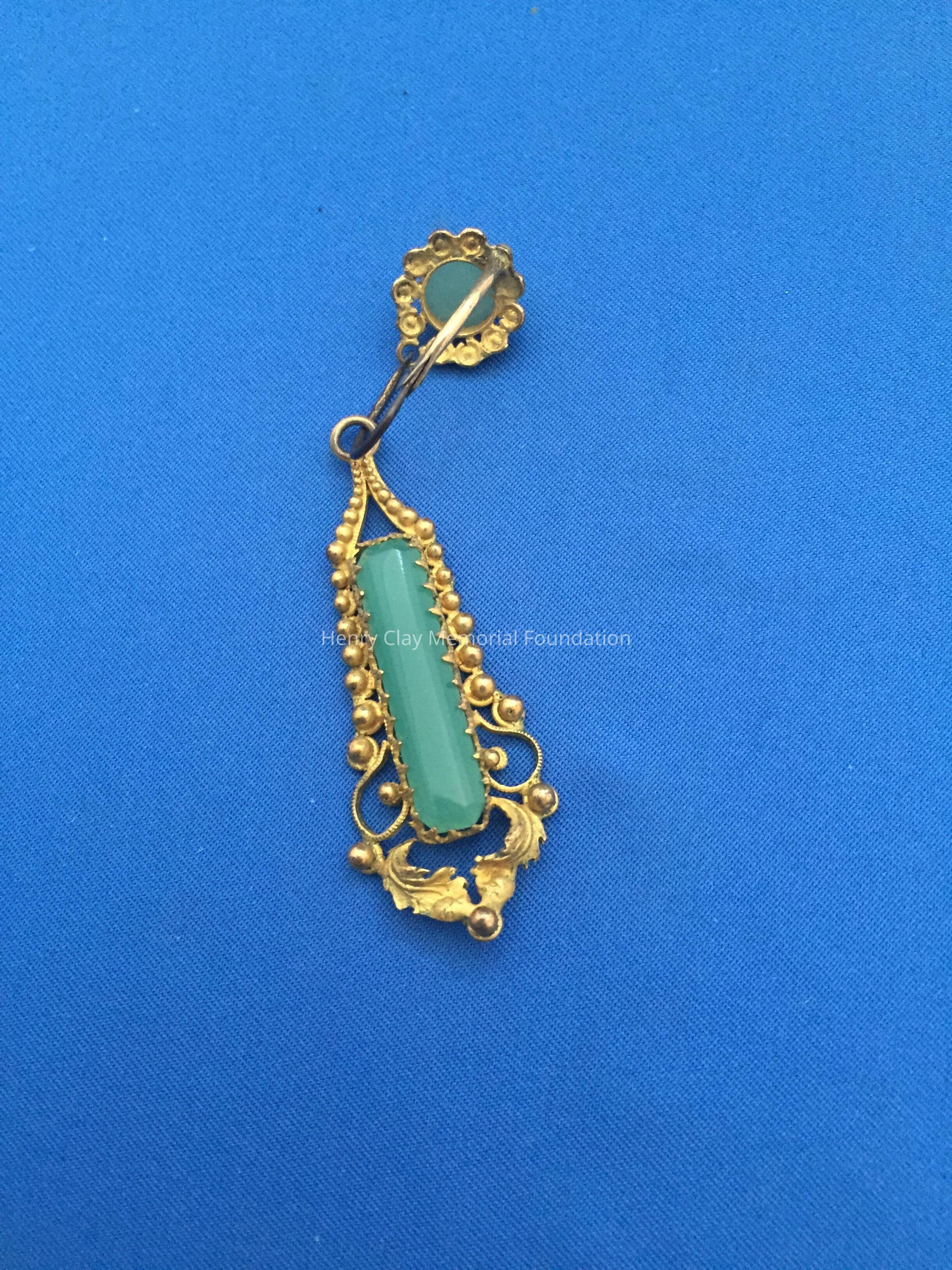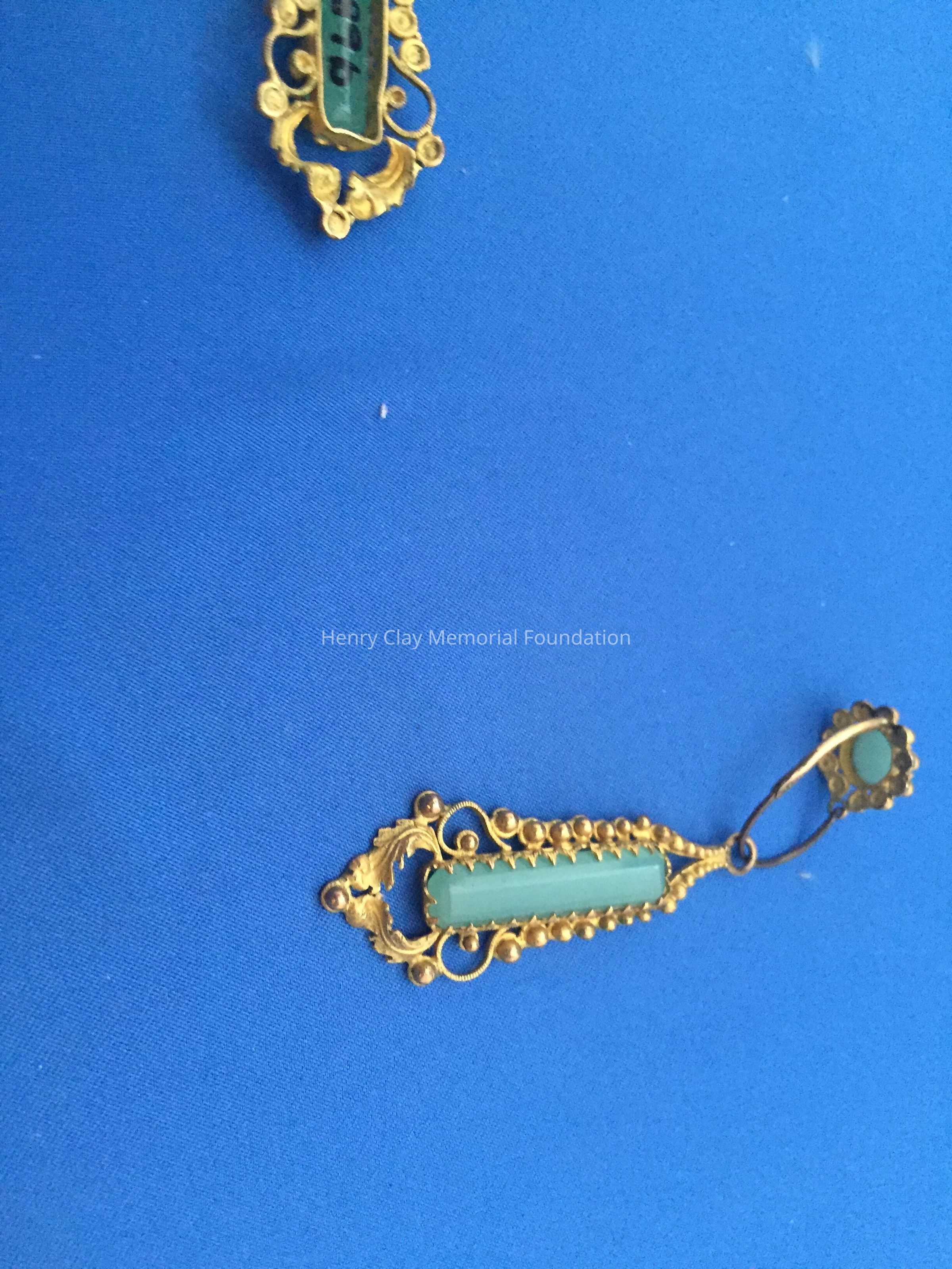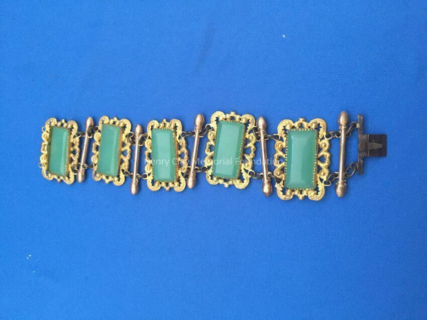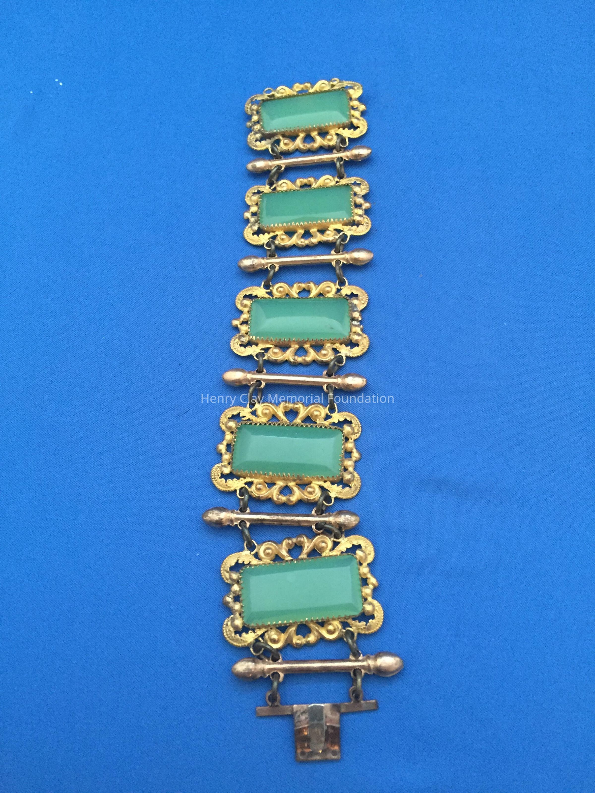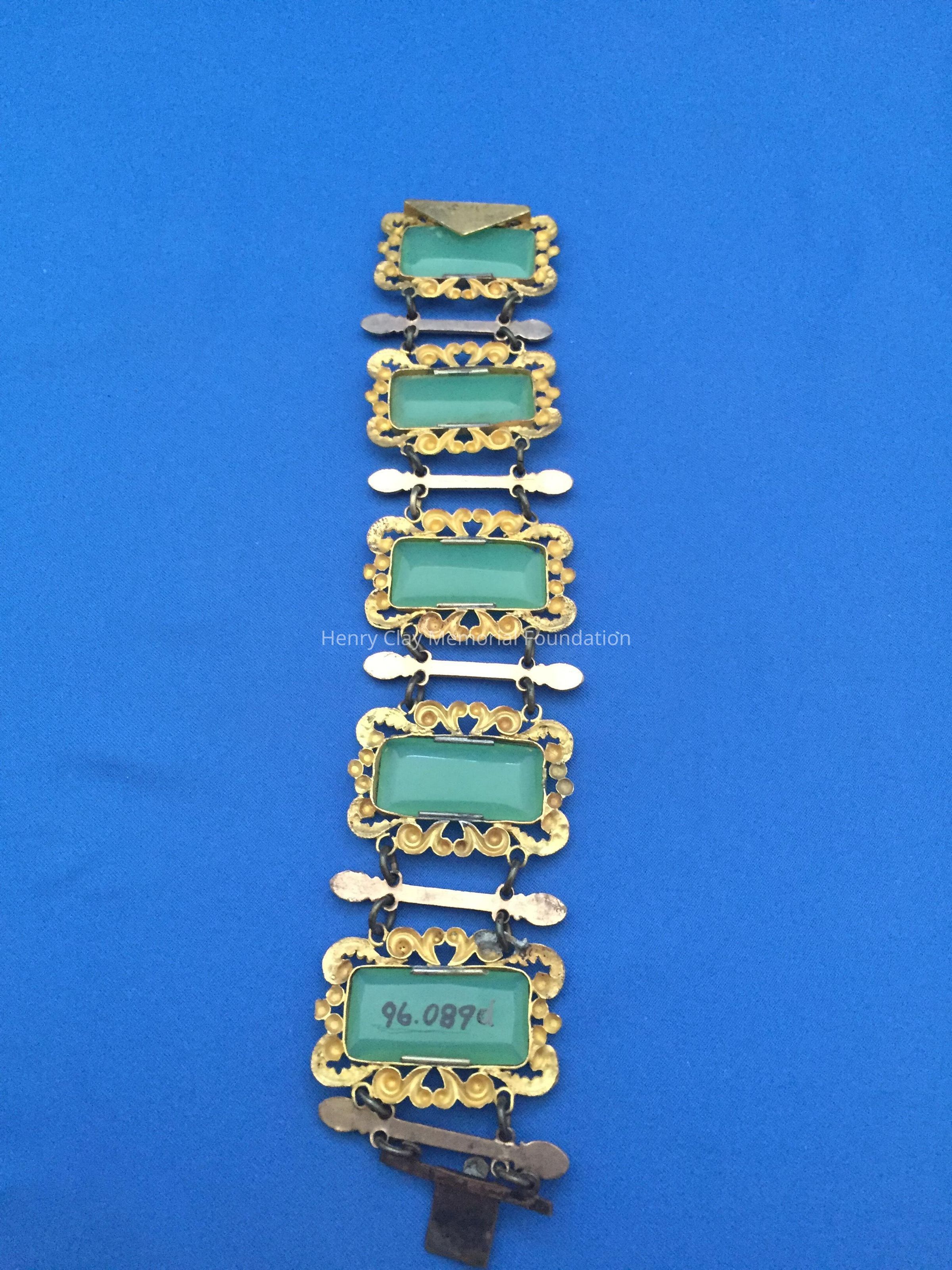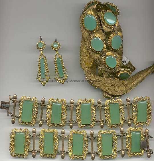 Set includes five pieces: A & B) Pair of earrings; C & D) Two matching bracelets; E) Choker[?]. All jewelry is a light, mint green stone set in a gold metal. Earring consists of two pieces--a long decorative, rectangular piece hanging from a matching round piece. The bracelets are wide, rectangular gold and mint green stone segments linked together. The choker [?] is a long strand of heavy gold material with gold and stone pieces sewn onto it.Dimensions