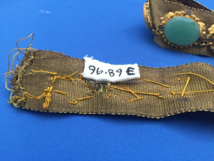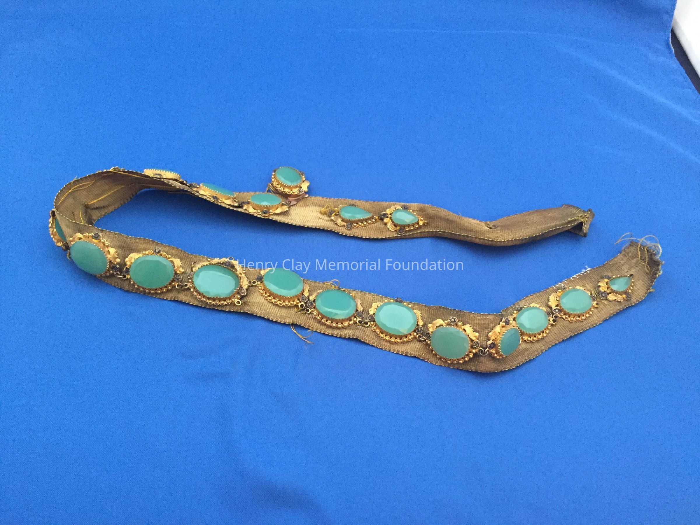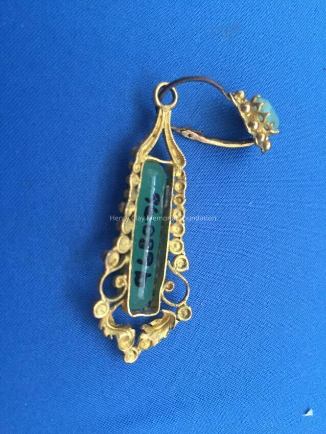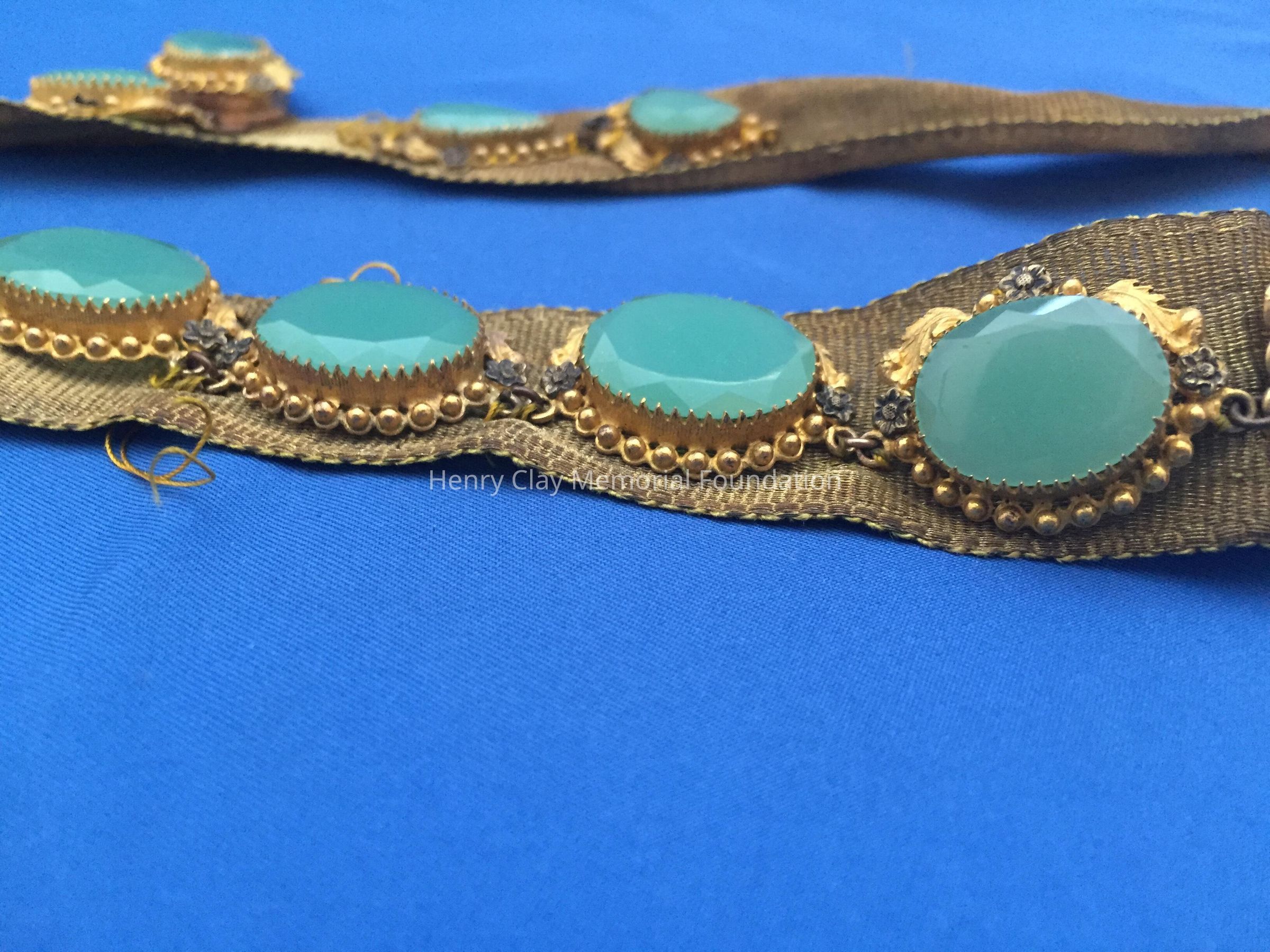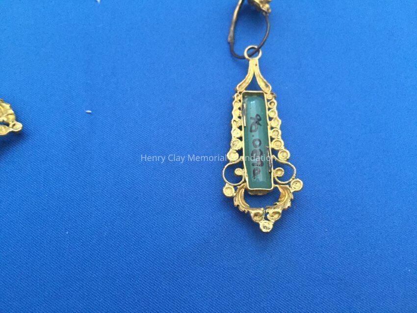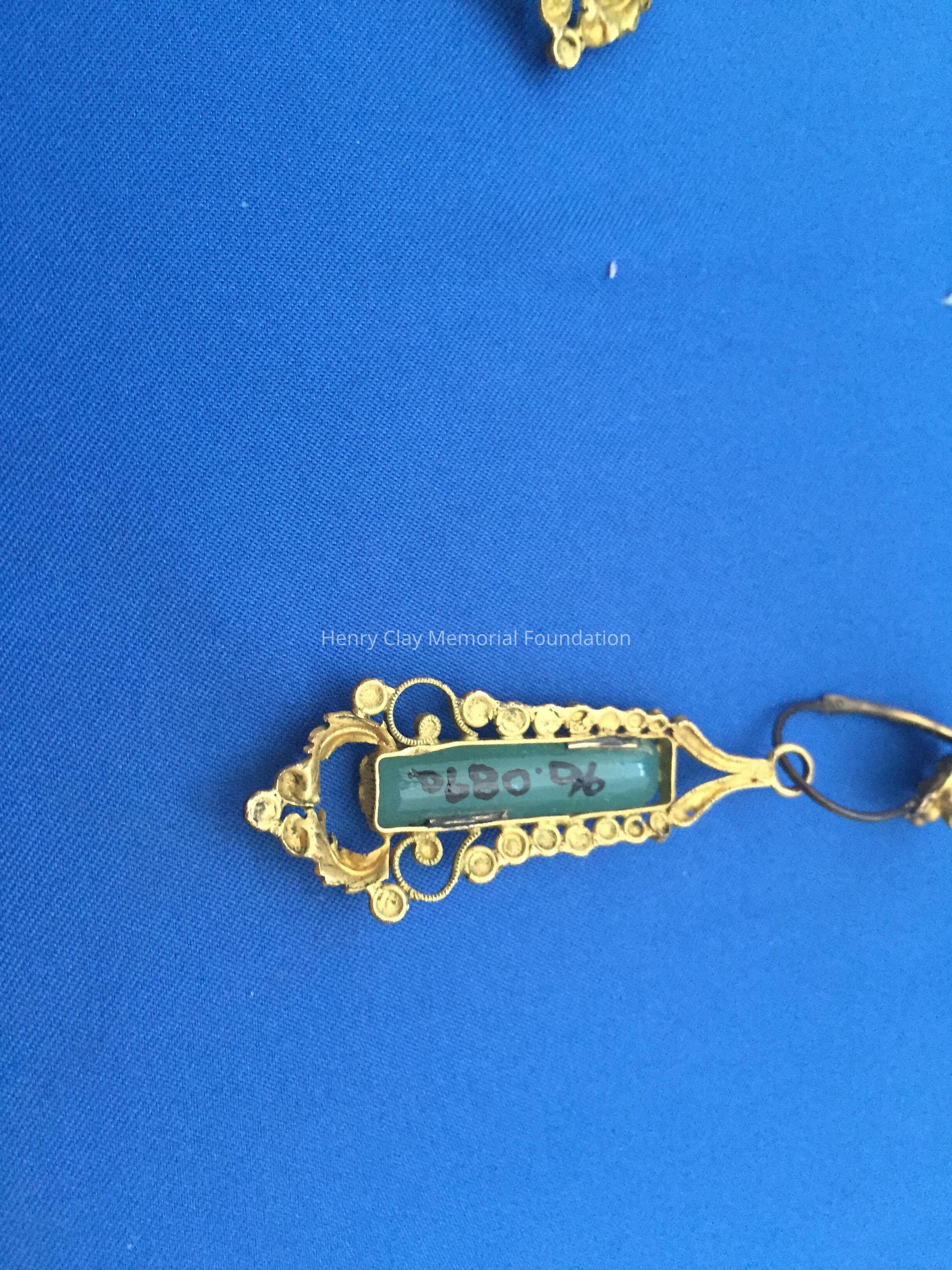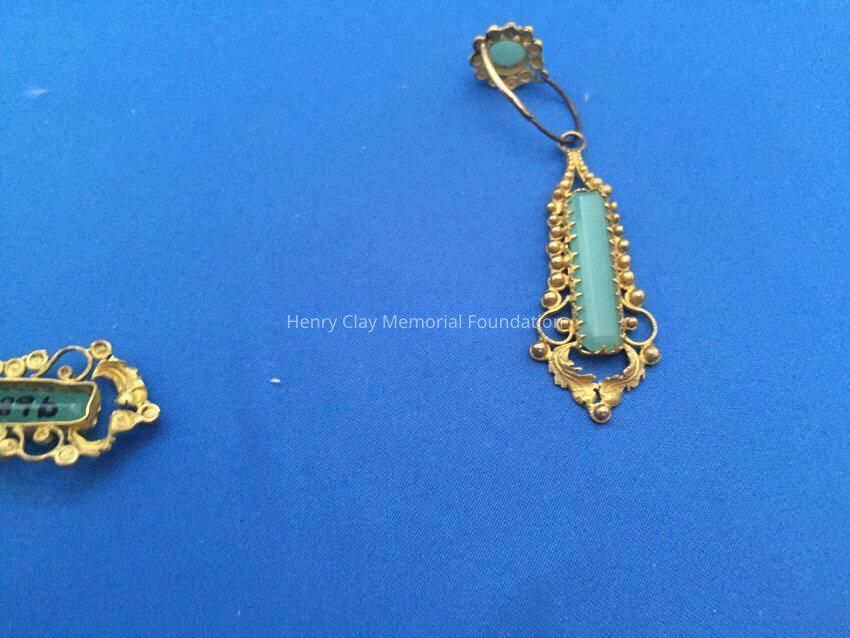 Set includes five pieces: A & B) Pair of earrings; C & D) Two matching bracelets; E) Choker[?]. All jewelry is a light, mint green stone set in a gold metal. Earring consists of two pieces--a long decorative, rectangular piece hanging from a matching round piece. The bracelets are wide, rectangular gold and mint green stone segments linked together. The choker [?] is a long strand of heavy gold material with gold and stone pieces sewn onto it.Dimensions
