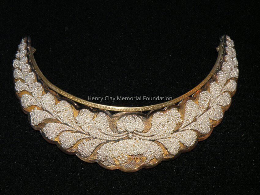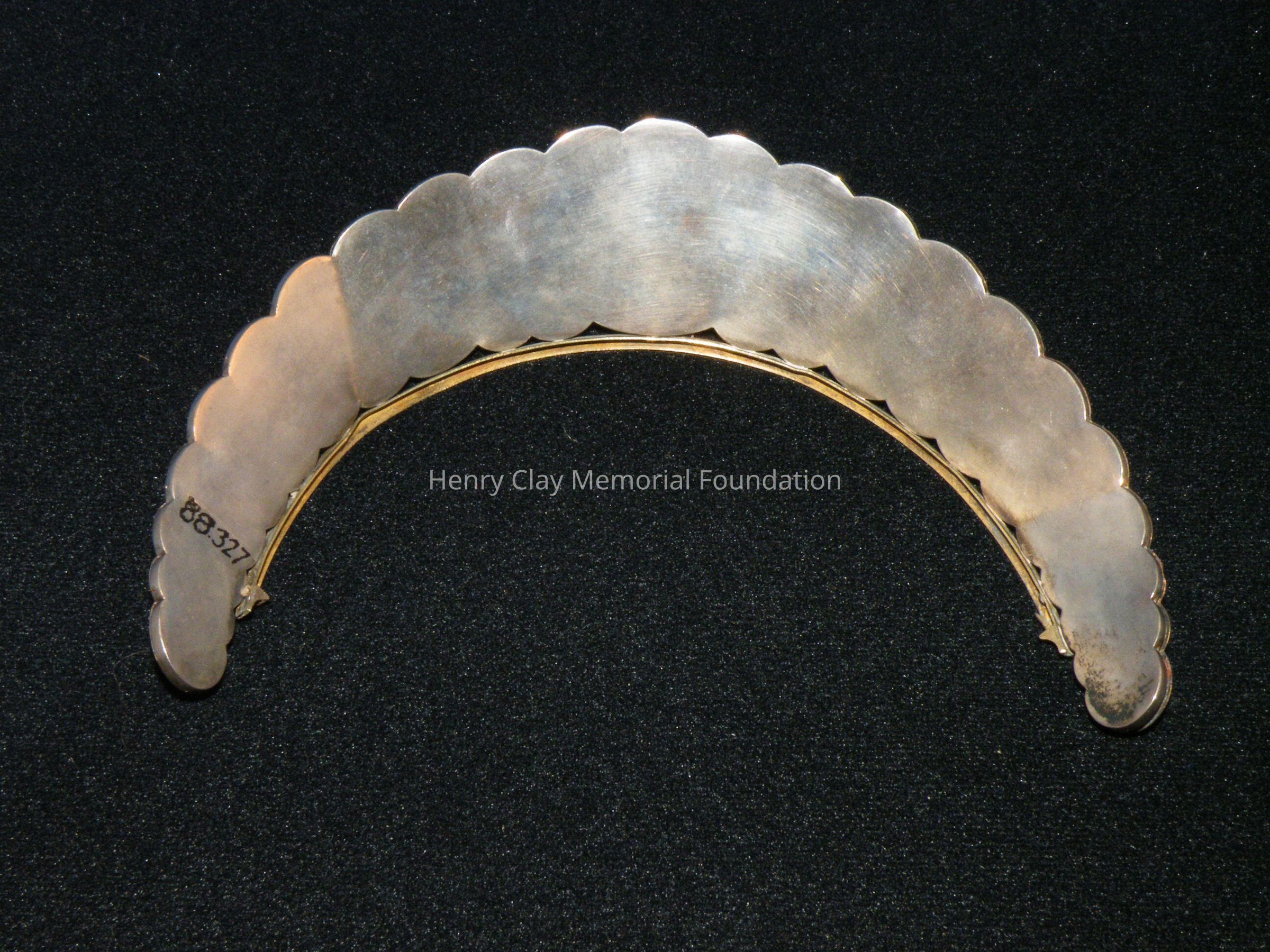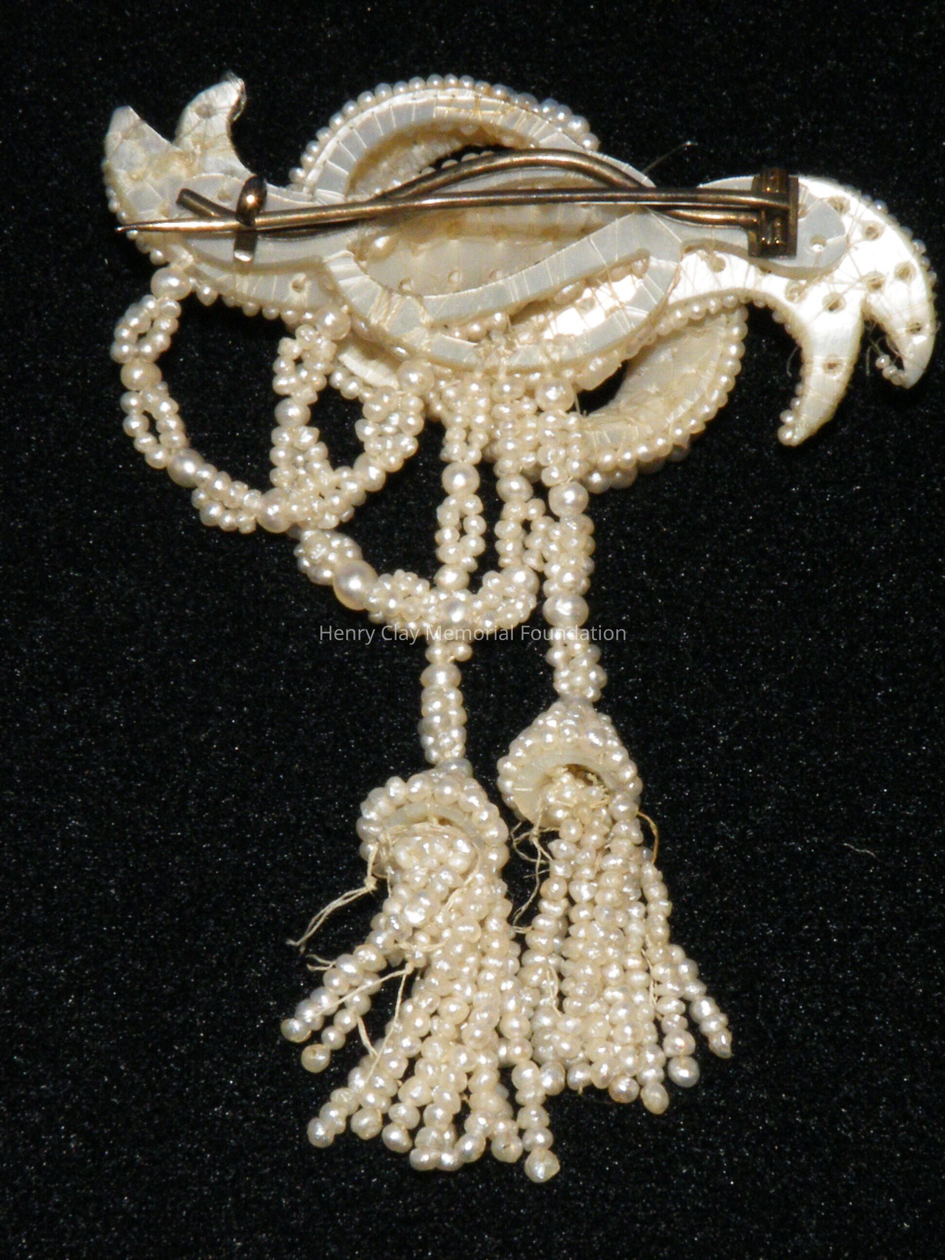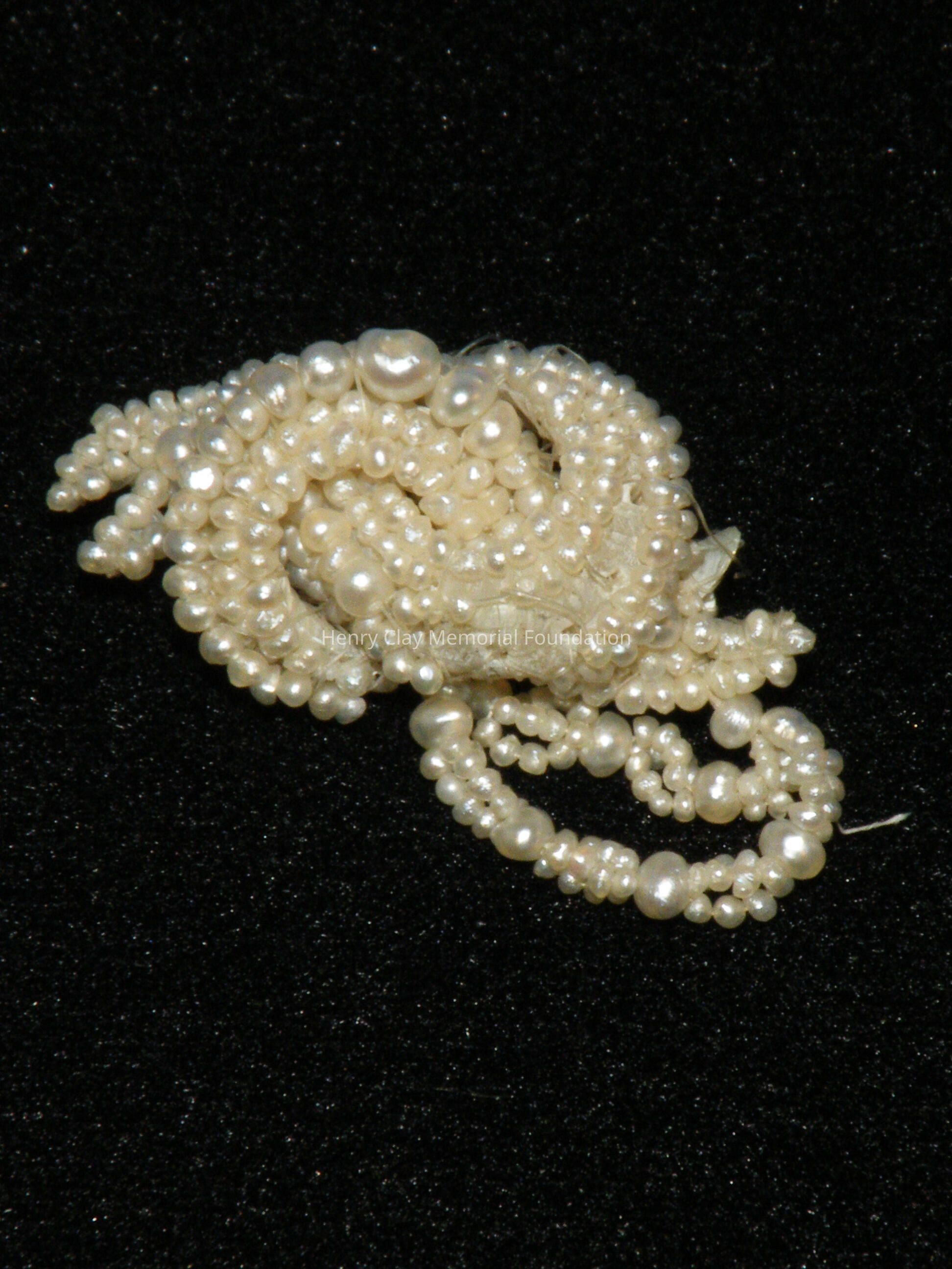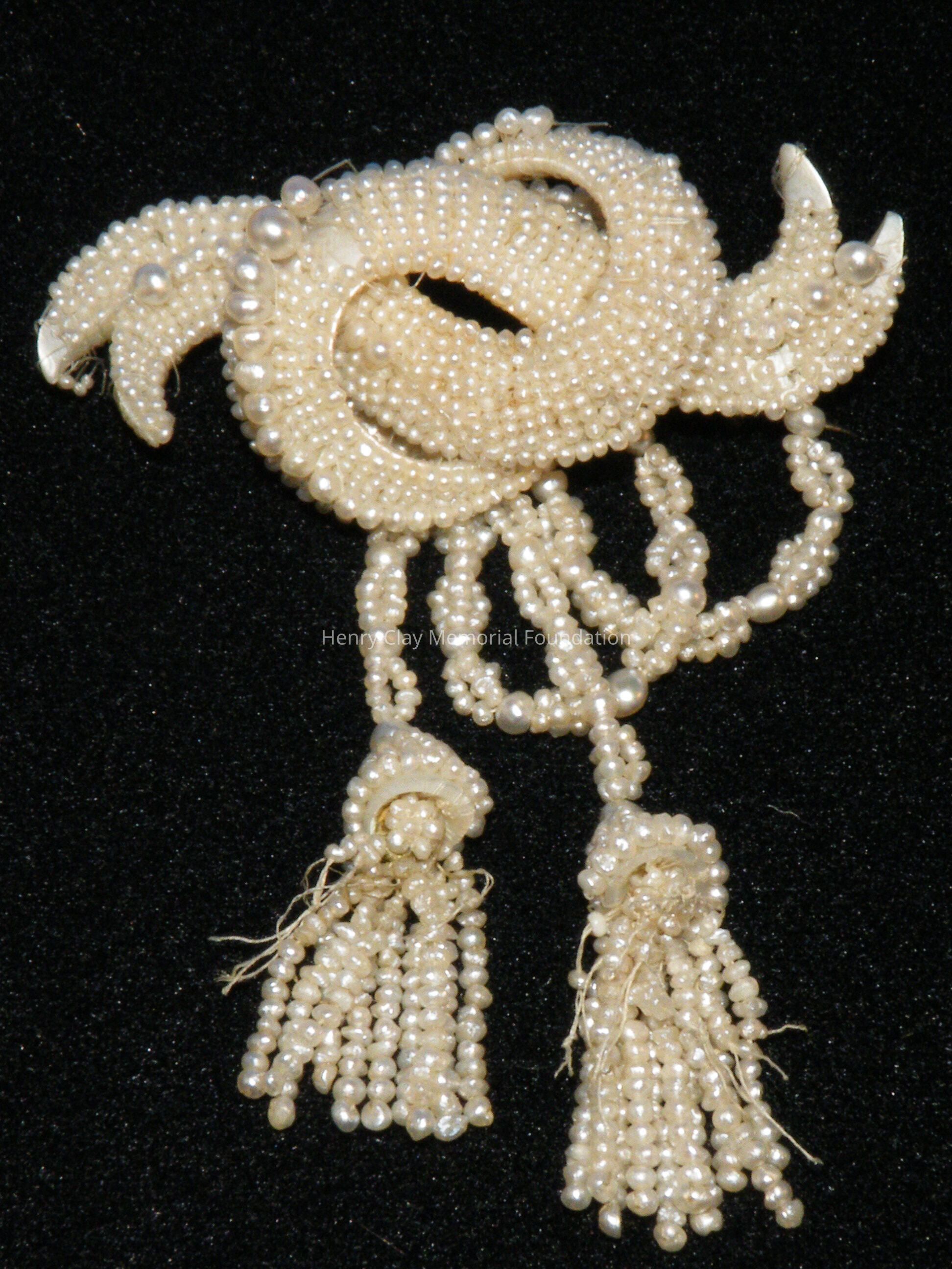 Persian seed pearl jewelry set including a large brooch, small pendant, 2 earrings (one clasp missing), a necklace, and a tiara. The tiara is fashioned with a 14k gold border on an 18k yellow gold background mounted on scalloped-edge sterling silver base. Other pieces are strings of pearls in clusters with tassels of pearls. Contained in Walnut glass case donated by Dr. ScrivnerDimensions