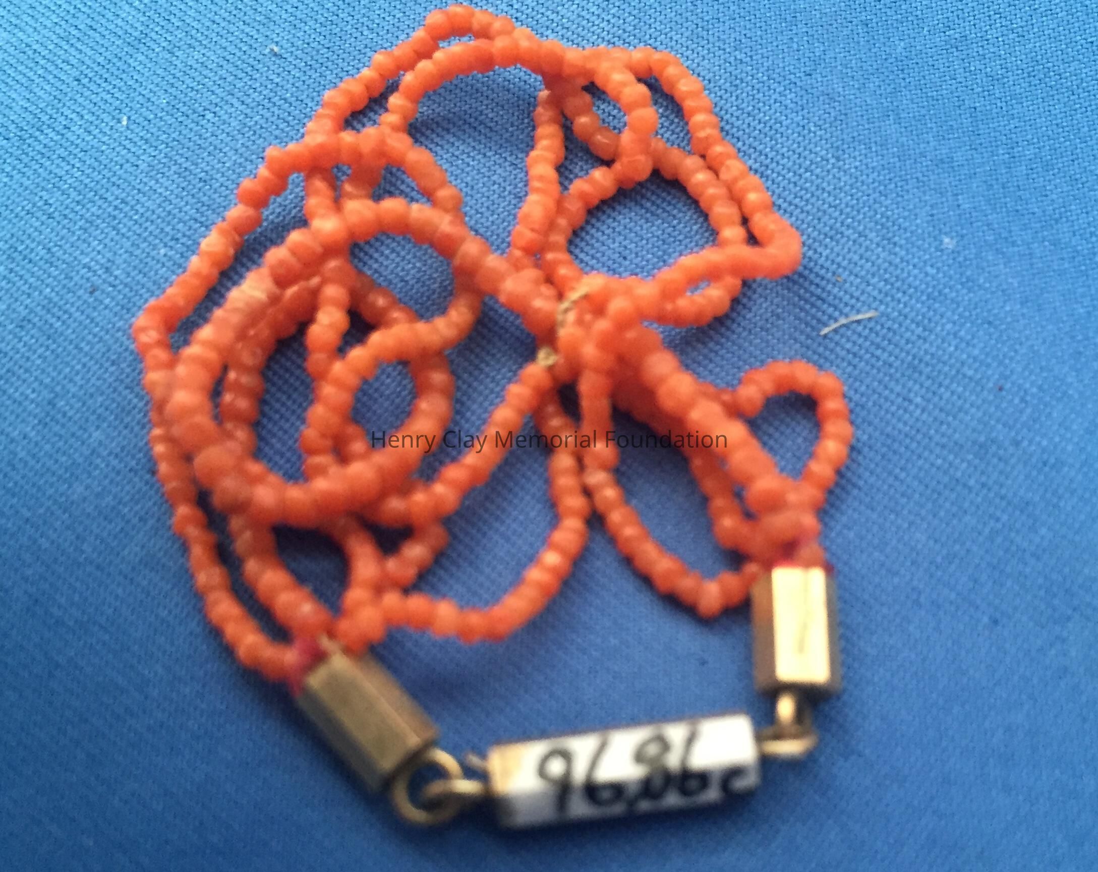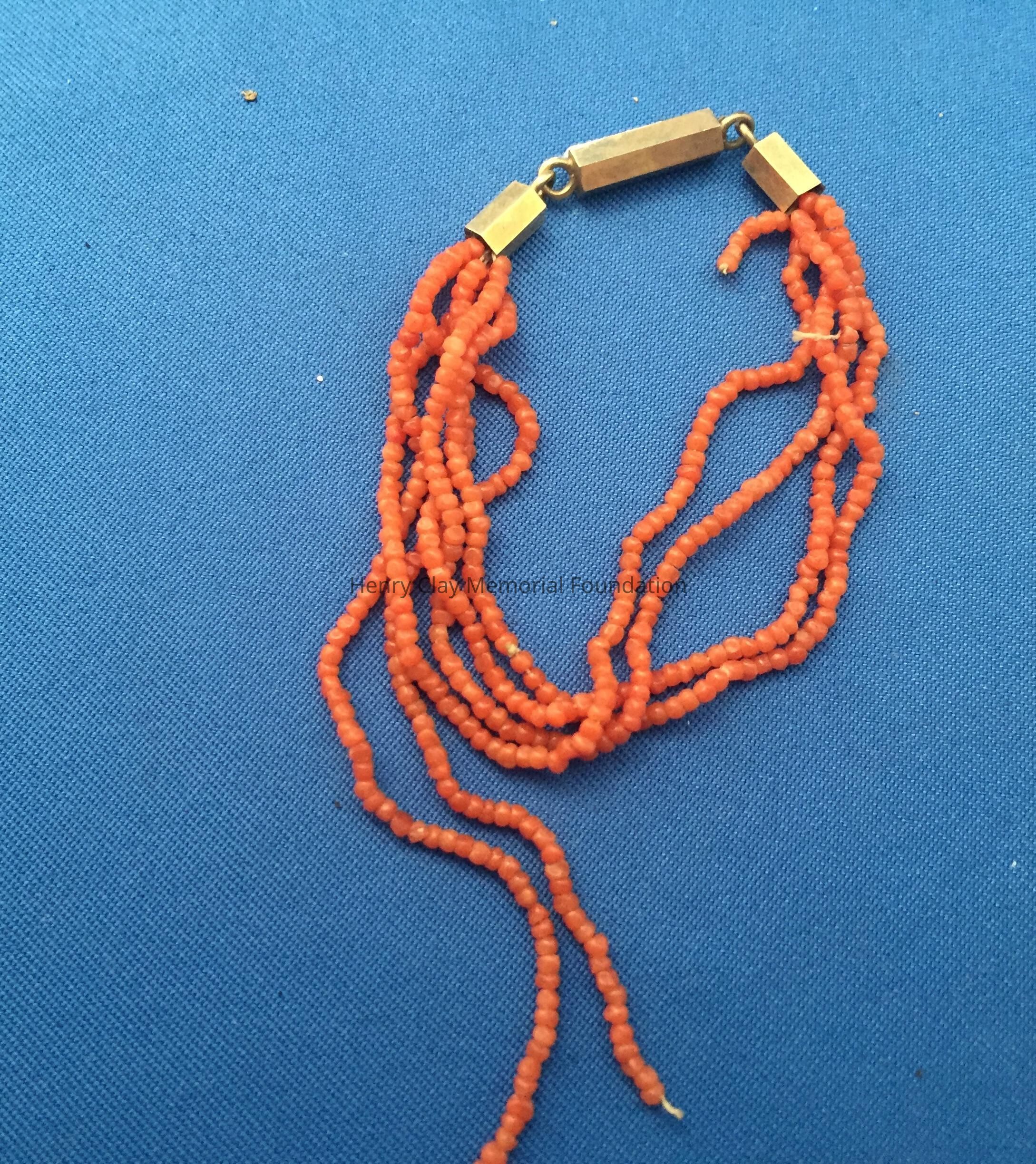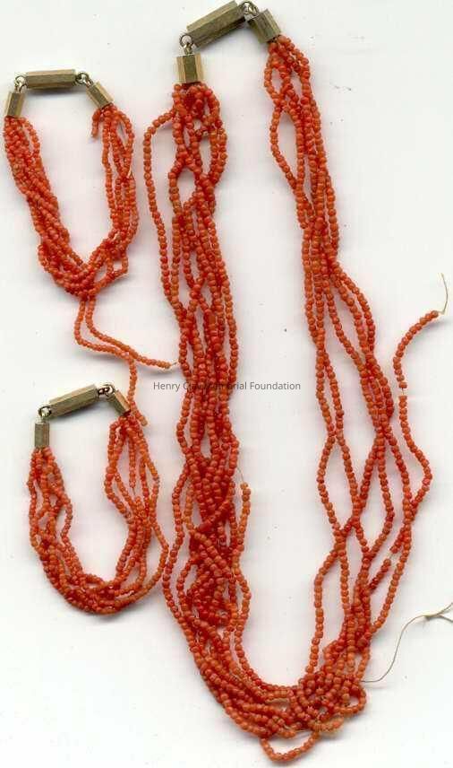 Two multi-strand coral bead bracelets with matching necklace. Each has a brass or gold clasp.