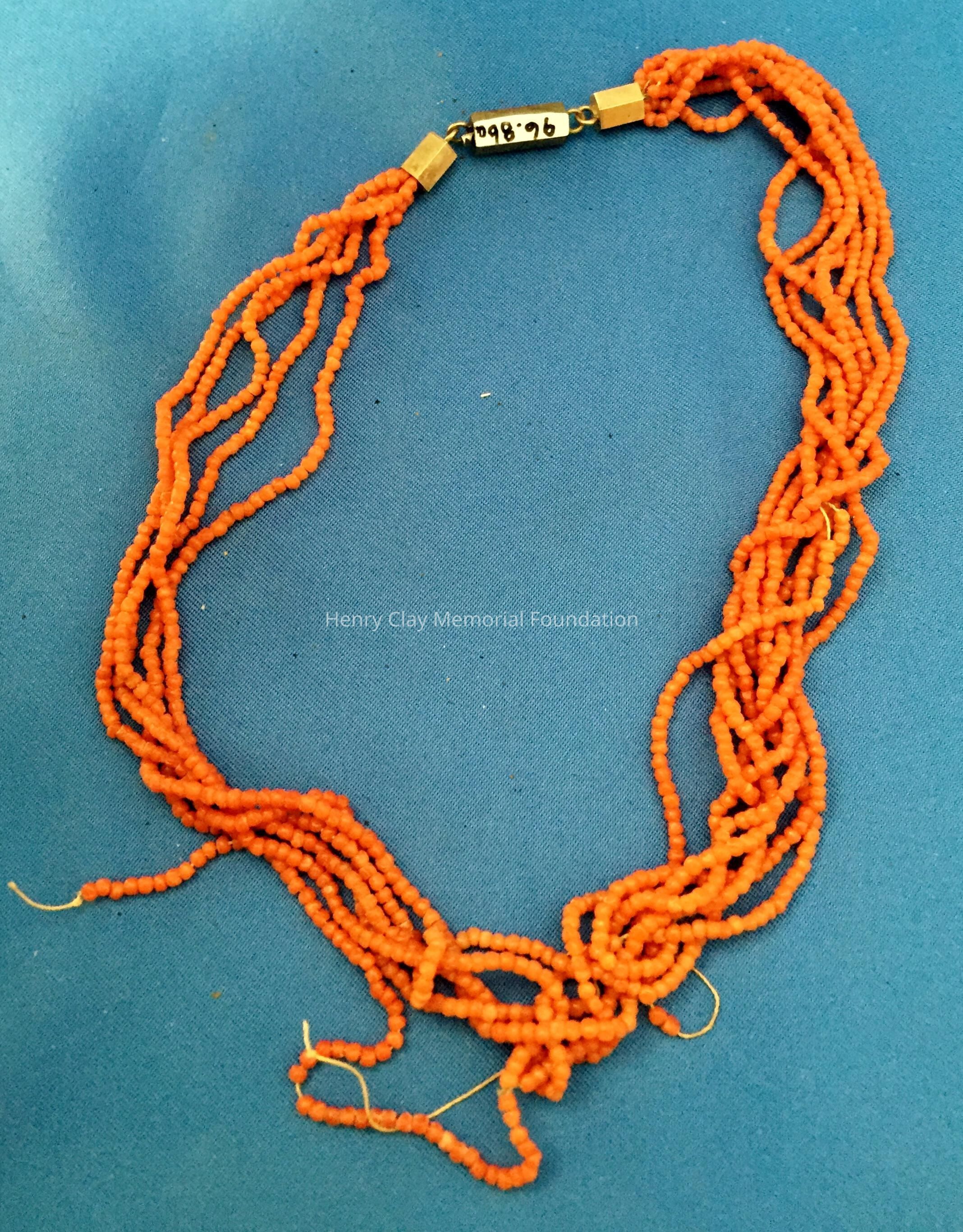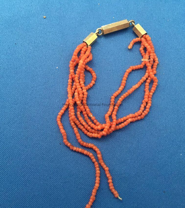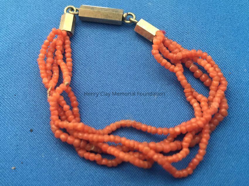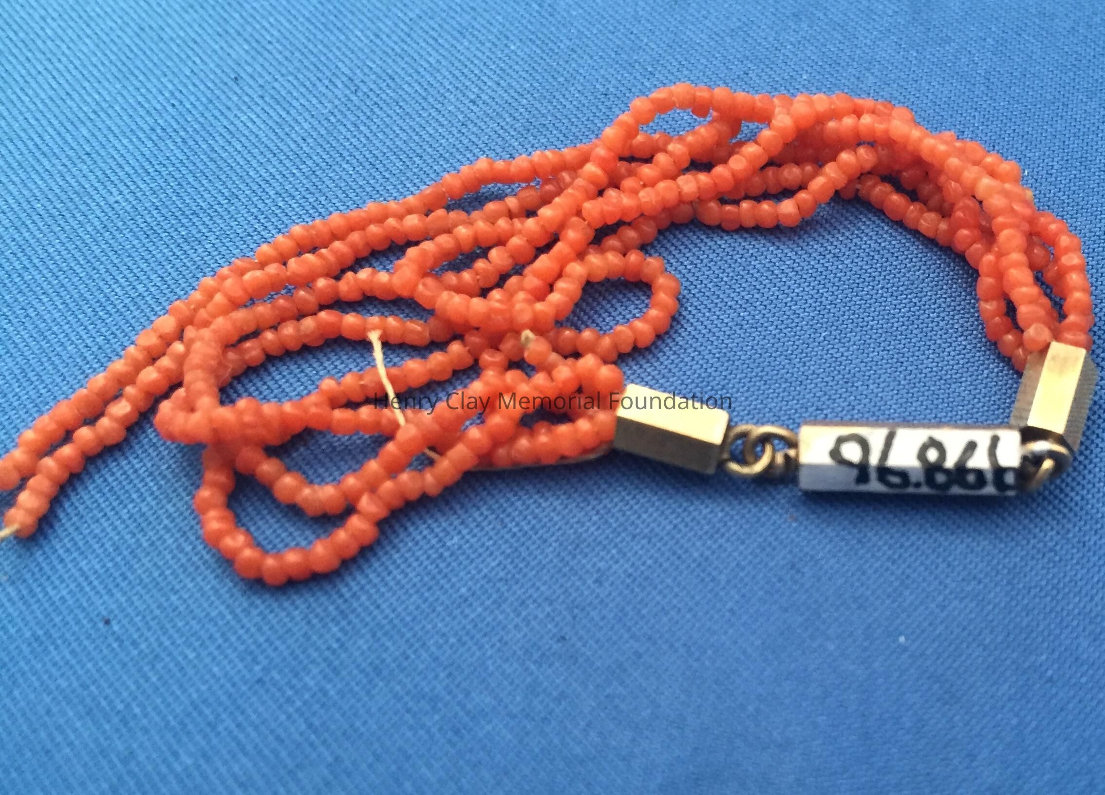 Two multi-strand coral bead bracelets with matching necklace. Each has a brass or gold clasp.