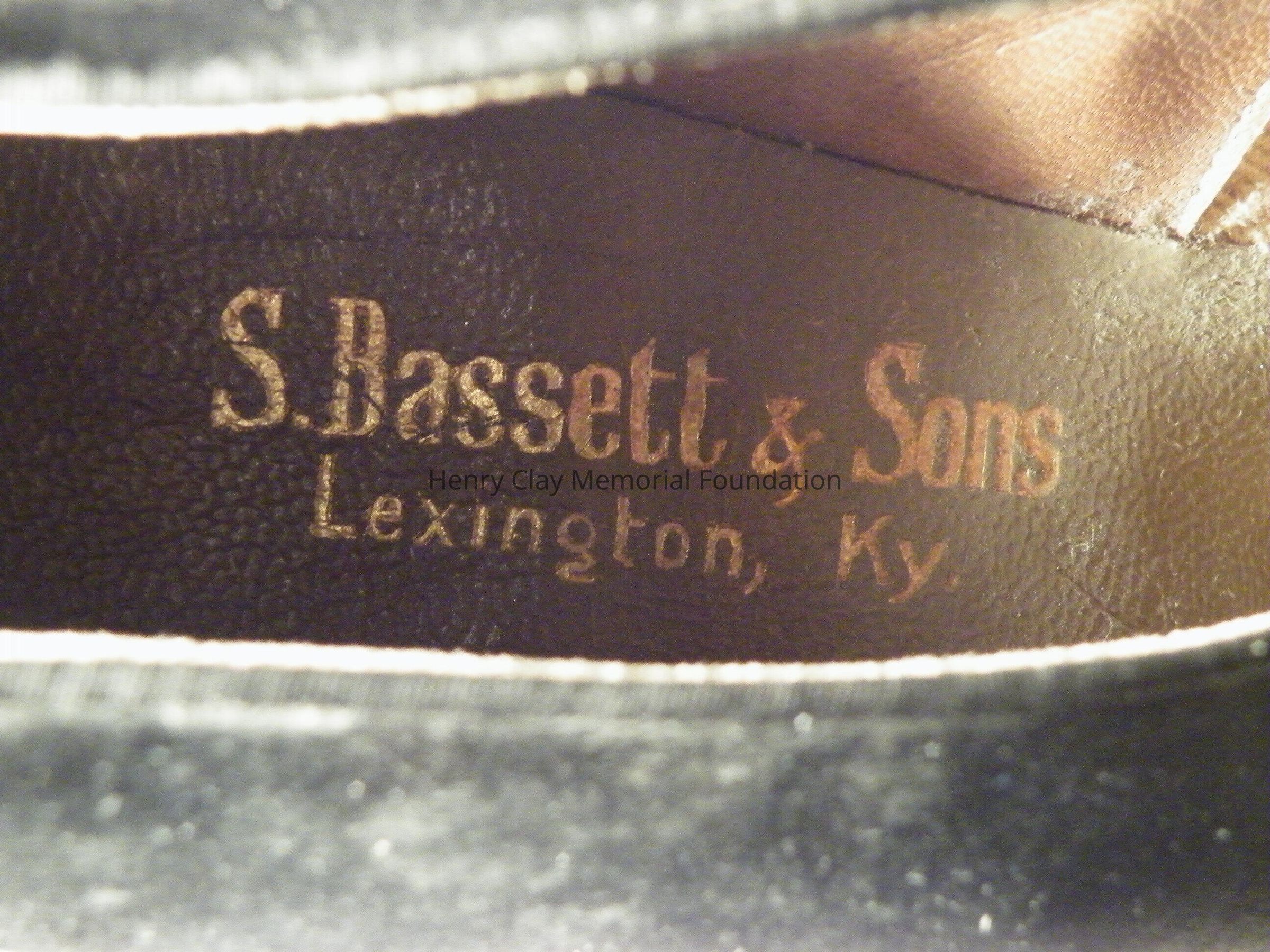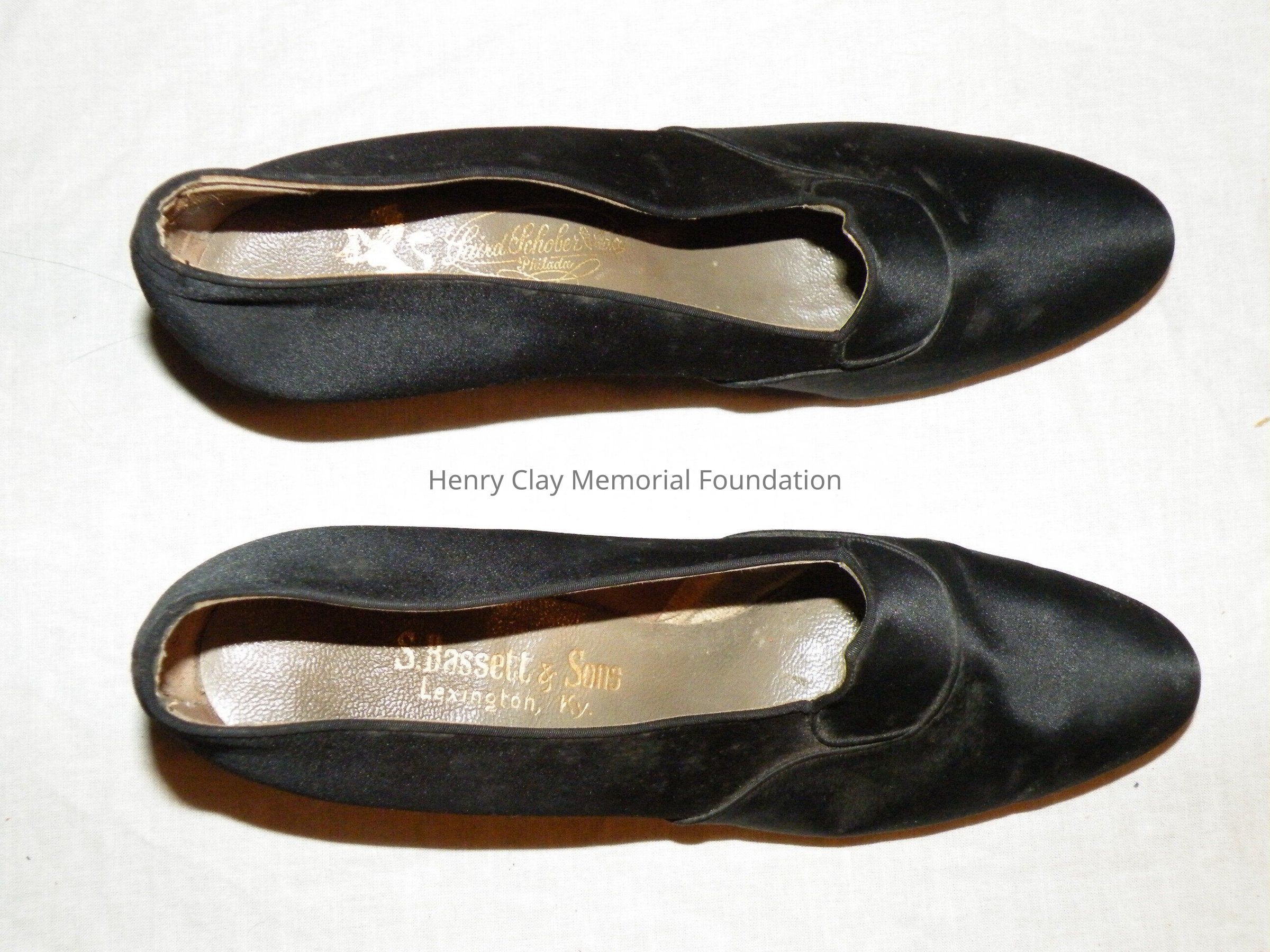 One pair of ladies black satin high heel shoes. Shoes have a rounded toe and tapering block heel. The tongue of the shoes is pointed. Inside of right shoe (A) is printed "S. Bassett and Sons Lexington" and on its sole the numbers B7077 (near the heel) and 35-11 433 (at the toe). At the center is the label "Frank Schobel and Co. Philadelphia." In the left (B) is the makers mark (Frank Schobel and Co.) which also appears on the sole along with several of the numbers found on the right.