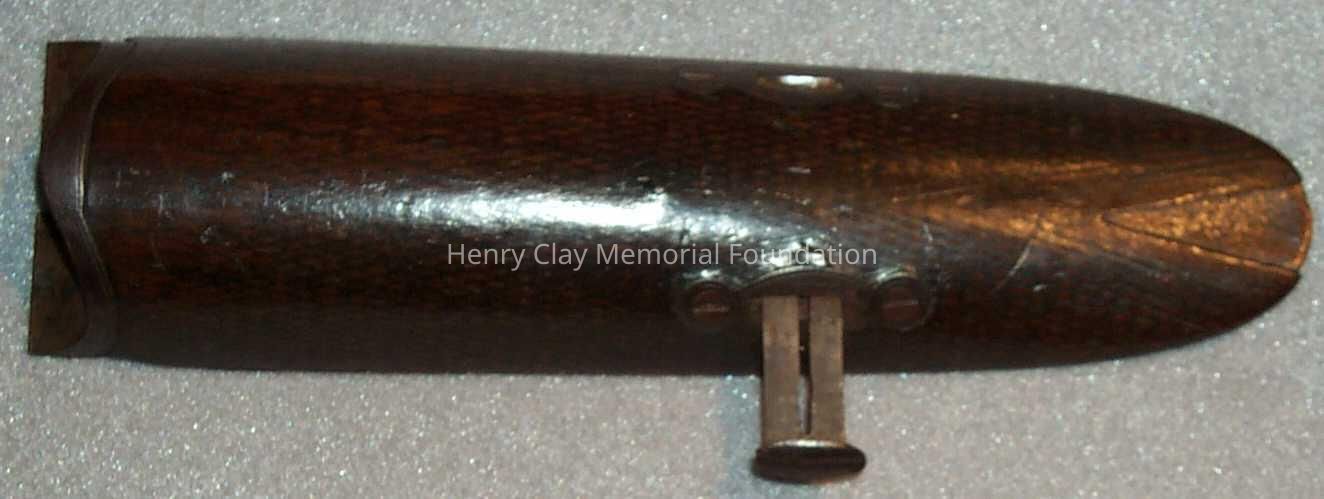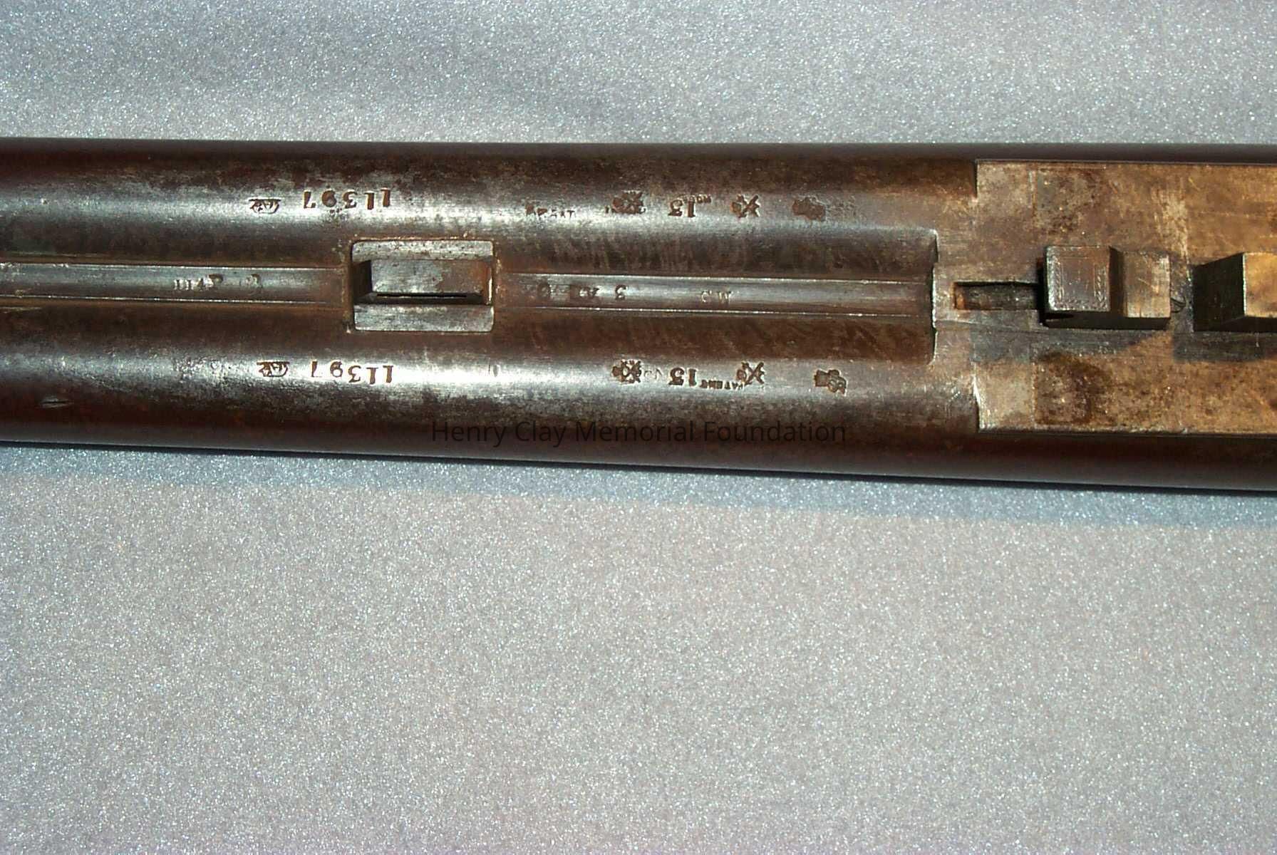 A 12 gauge double barrel pin firing shotgun made by W.W. Greener and Co. of Birmingham England. The gun has a walnut stock and laminated steel barrels. The hammers, triggers, plates, and guards are all steel. The gun has a steel buttplate. The hammers are mounted on steel plates engraved with "W.W. Greener." Beneath right hammer is lever to open chambers for loading and unloading. Gun has steel trigger guard and two triggers. Barrels are laminated steel and are held together with steel rail that is stamped "William Greener Inventor of Laminated Steel." Wooden piece under barrels has brass pin that slides out to release barrels and dismantel gun into three pieces. Barrels underneath removable wooden piece are stamped "patent 13," with serial number, "11397," symbol of two pikes crossed over crown, symbol of elephant, and intials "CW." The plate that connects the barrels to the stock is also stamped with the serial number and crossed pike symbol.