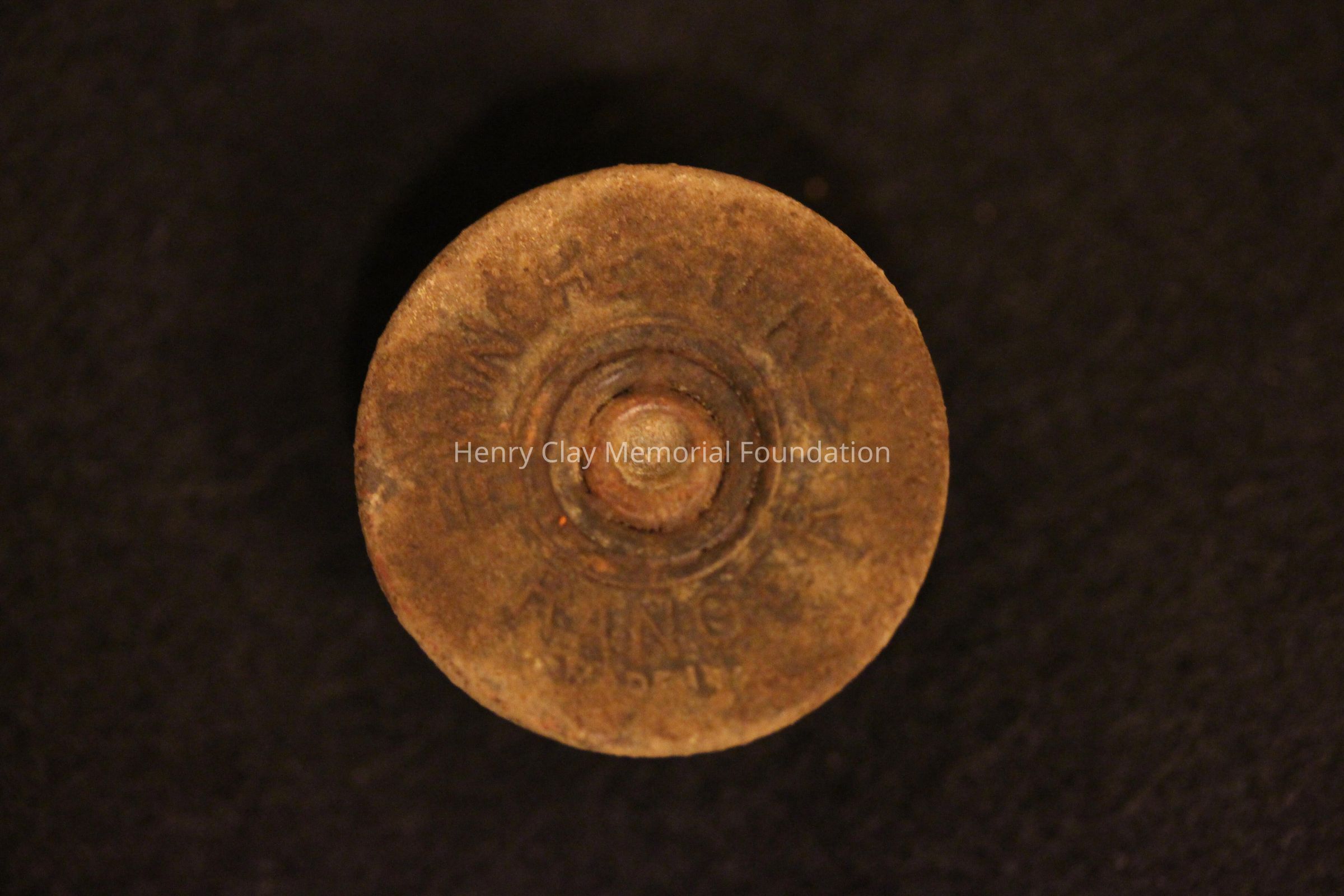 Back end of a Winchester 12 guage shotgun shell currently dated from the 1890's to approx. 1906. Rusted out inside, with imprint on the back of shotgun shell from the company. In good conidition.