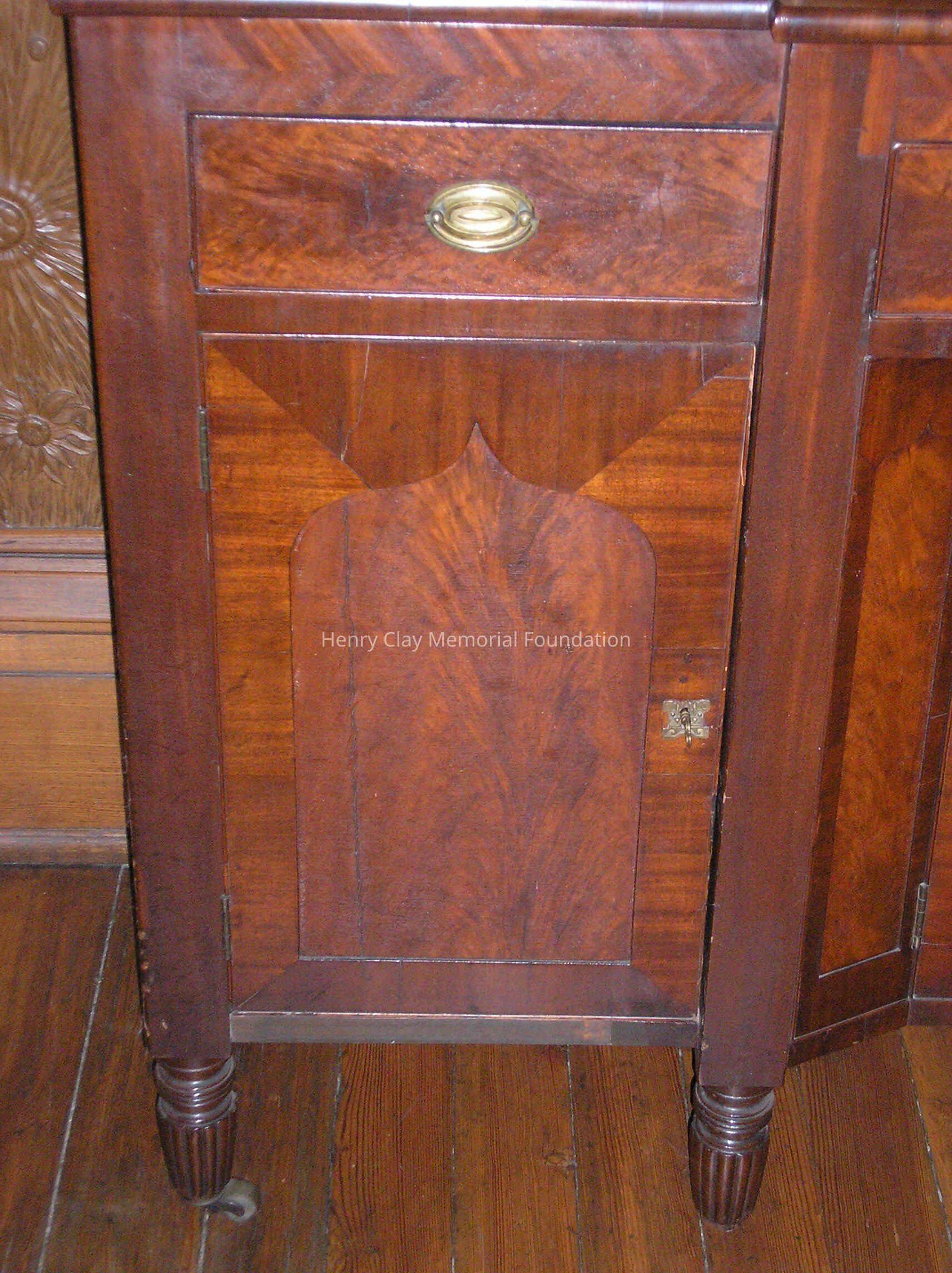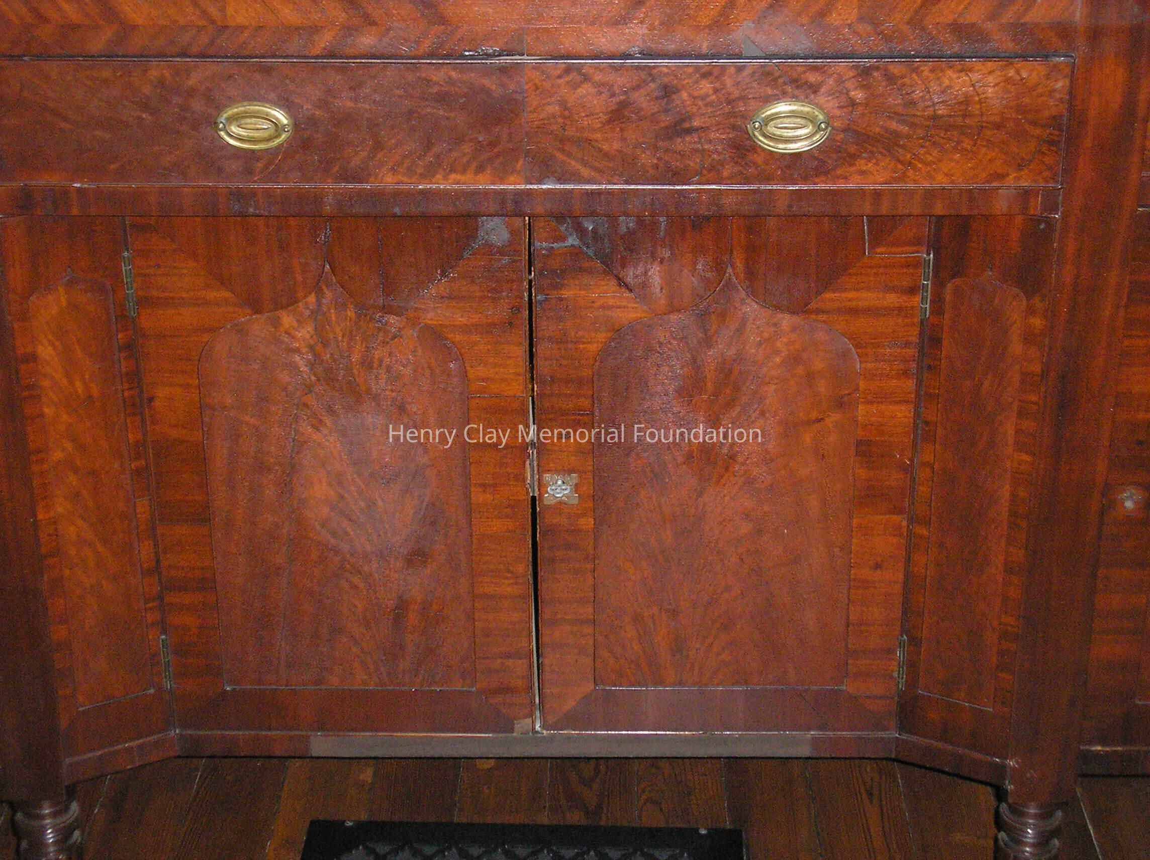 Mahogany; Federal style; three drawers at top (one long center drawer, two side drawers); four doors; stands on six legs.