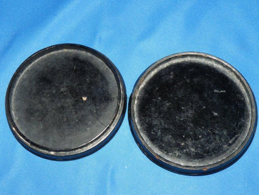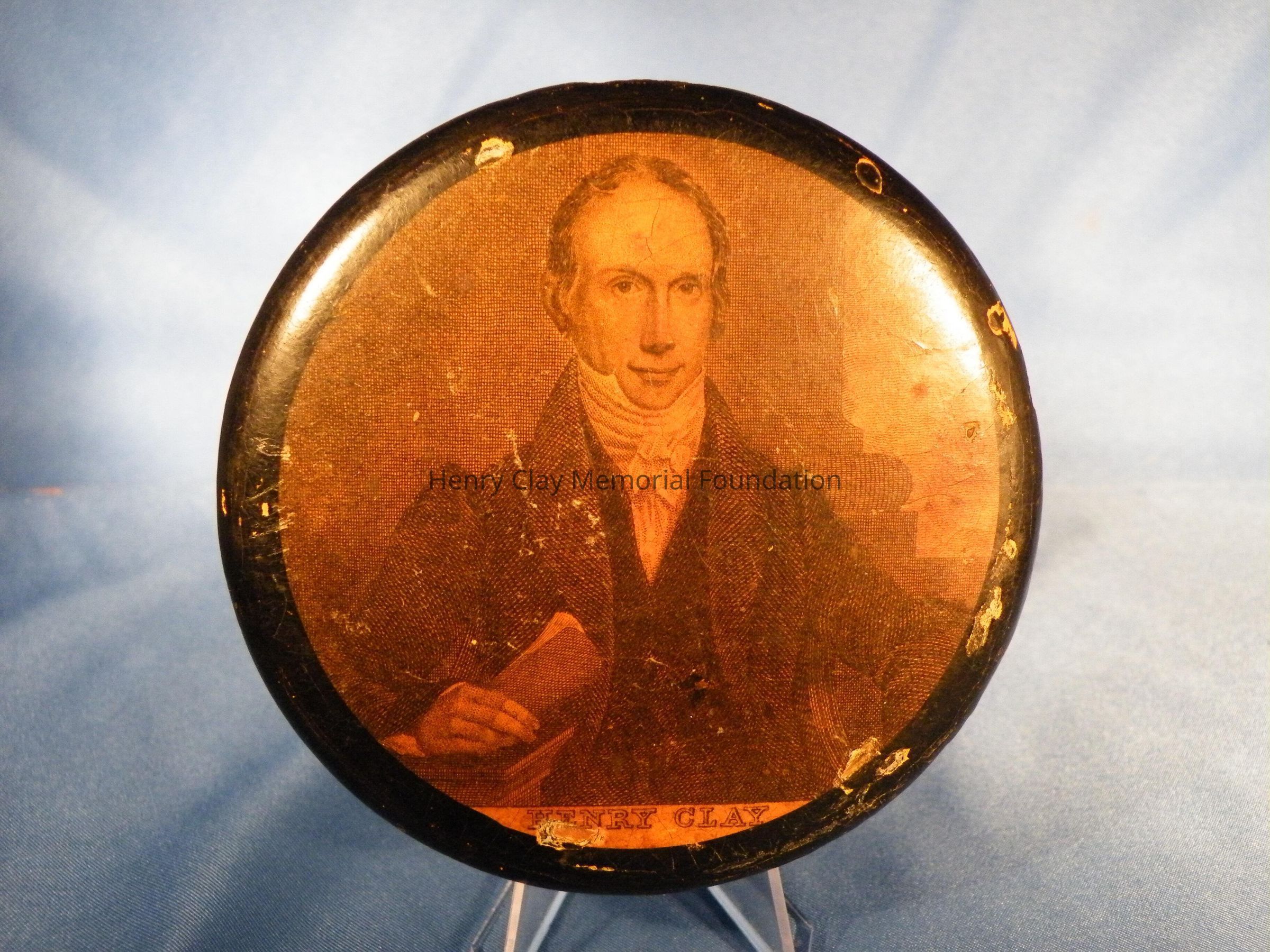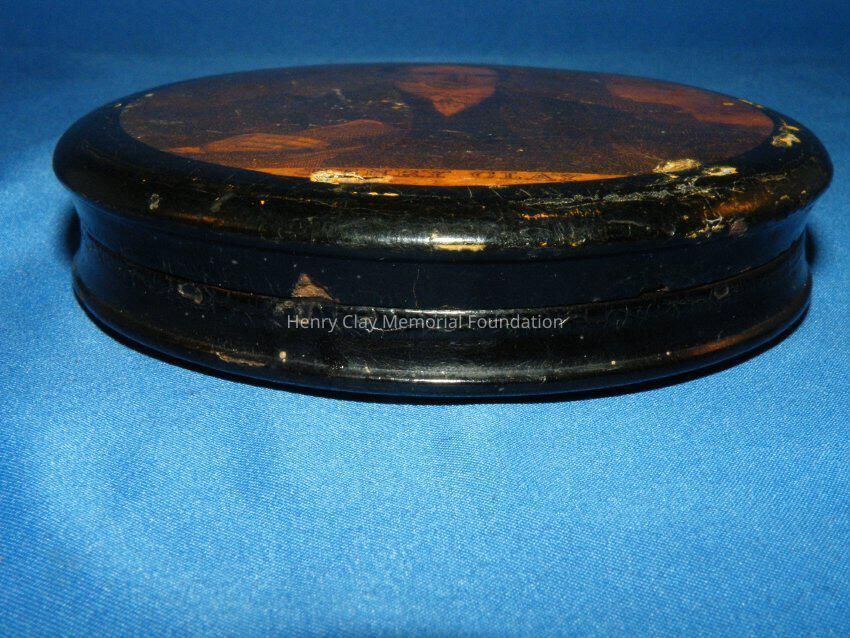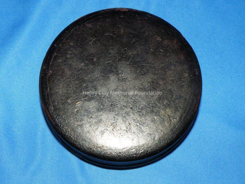 Circular papier mache snuffbox with lift off lid. The lid bears a picture of Henry Clay holding a paper that is engraved. The base has an inset lip over which the lid rests. The box is black and the engraving is a darkened yellow color.