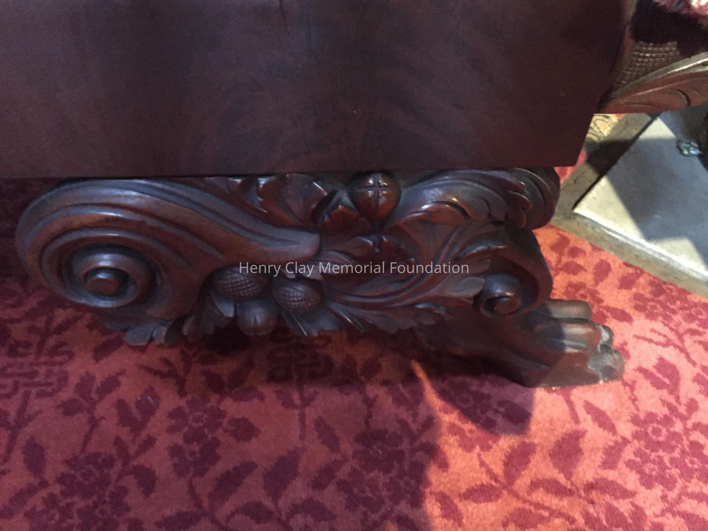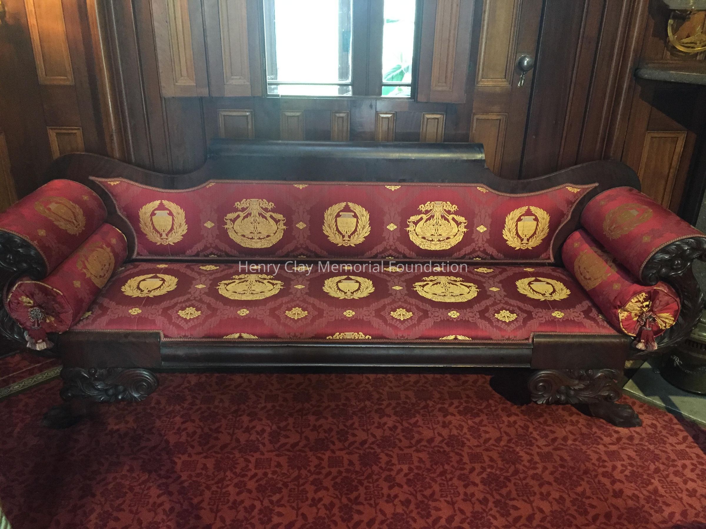 Mahogany Empire style sofa with mahogany veneer. Carved claw feet. Cornucopia.