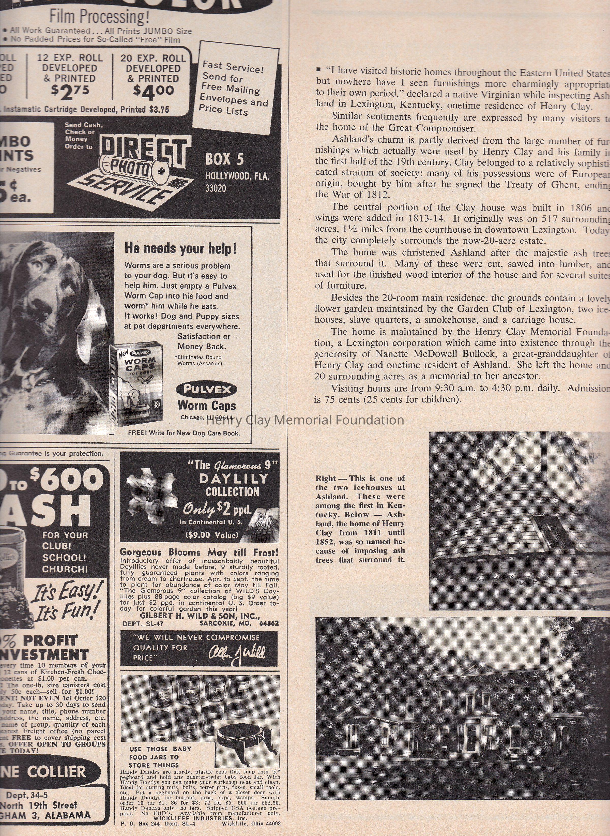 Southern Living Magazine from april 1967 with an article about Ashland at page 18. Is a small article with two black and white photographs. Article also states opening days, and admission price.