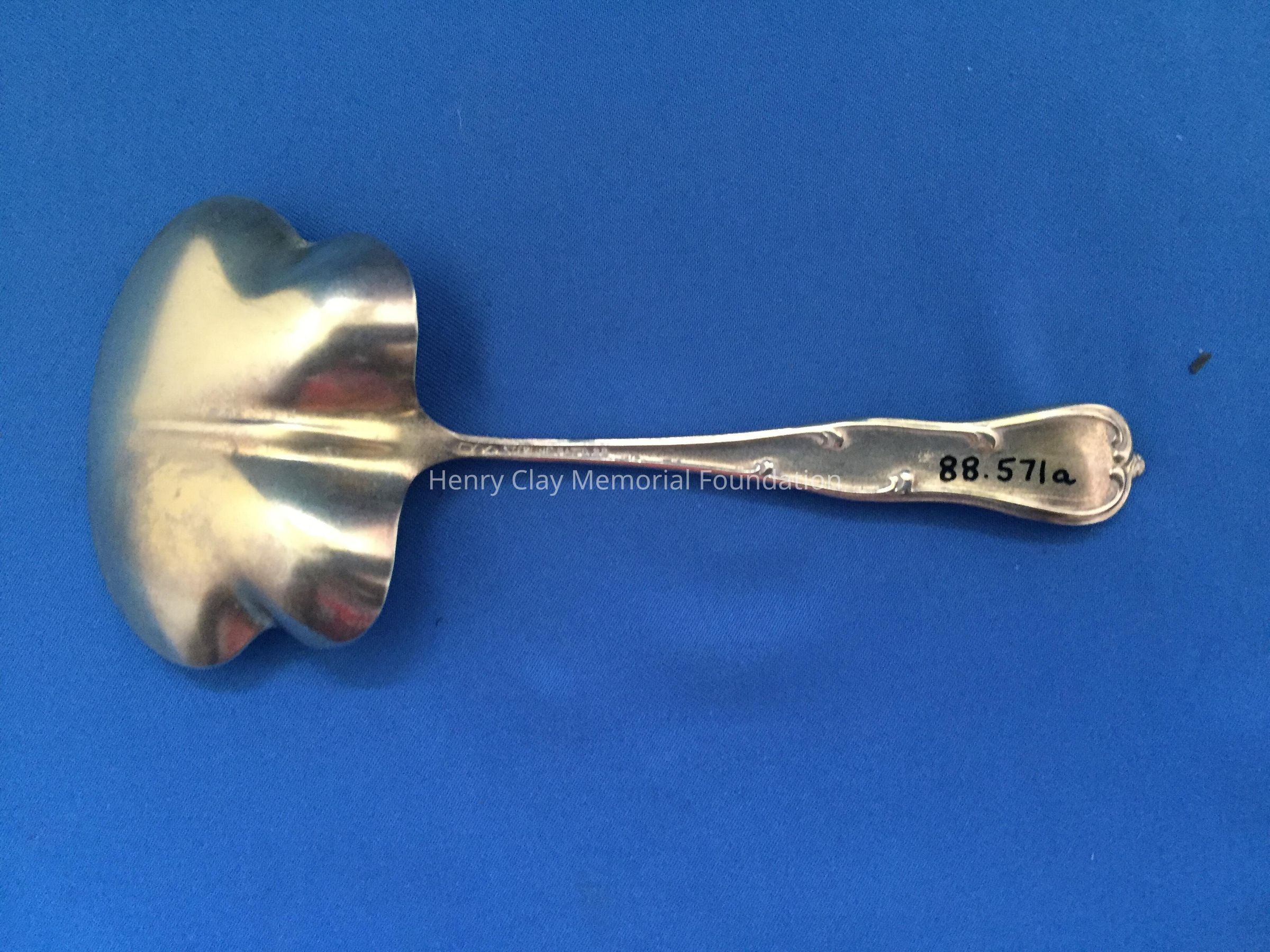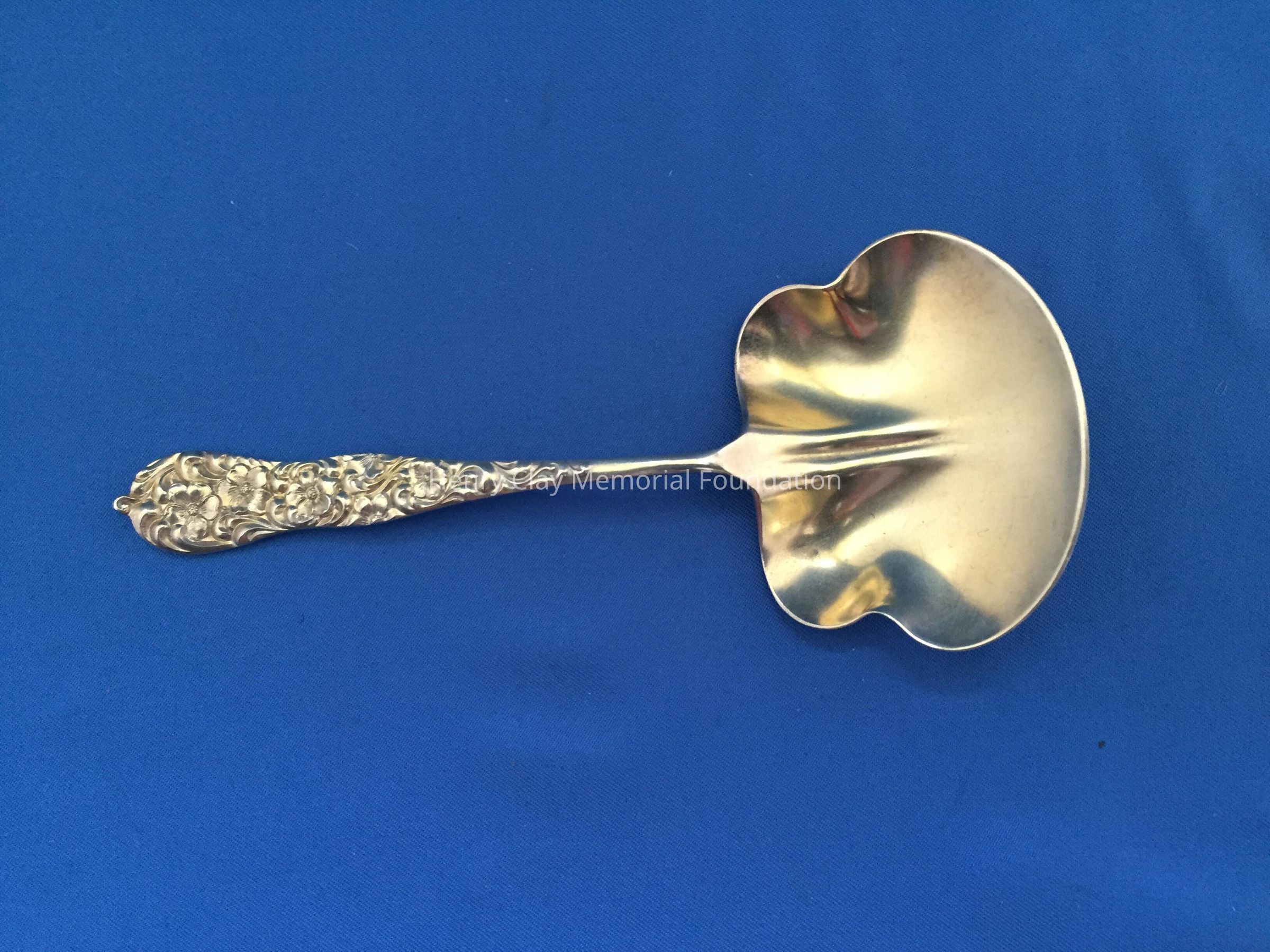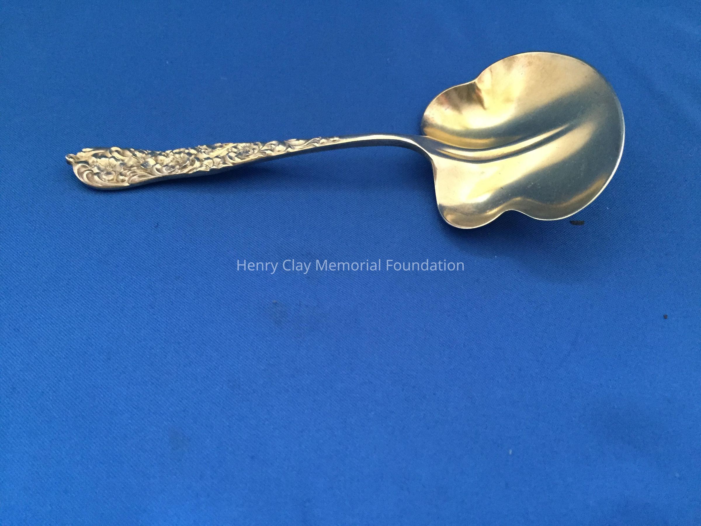 Two gold-washed spoons with butterfly shaped bowls. Decorative handle, repousse. Hallmark on back shows rectangle, circle and diamond linked.