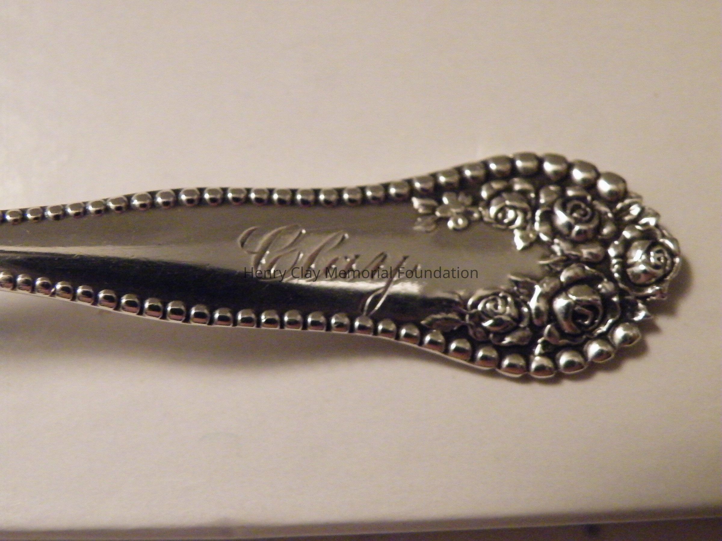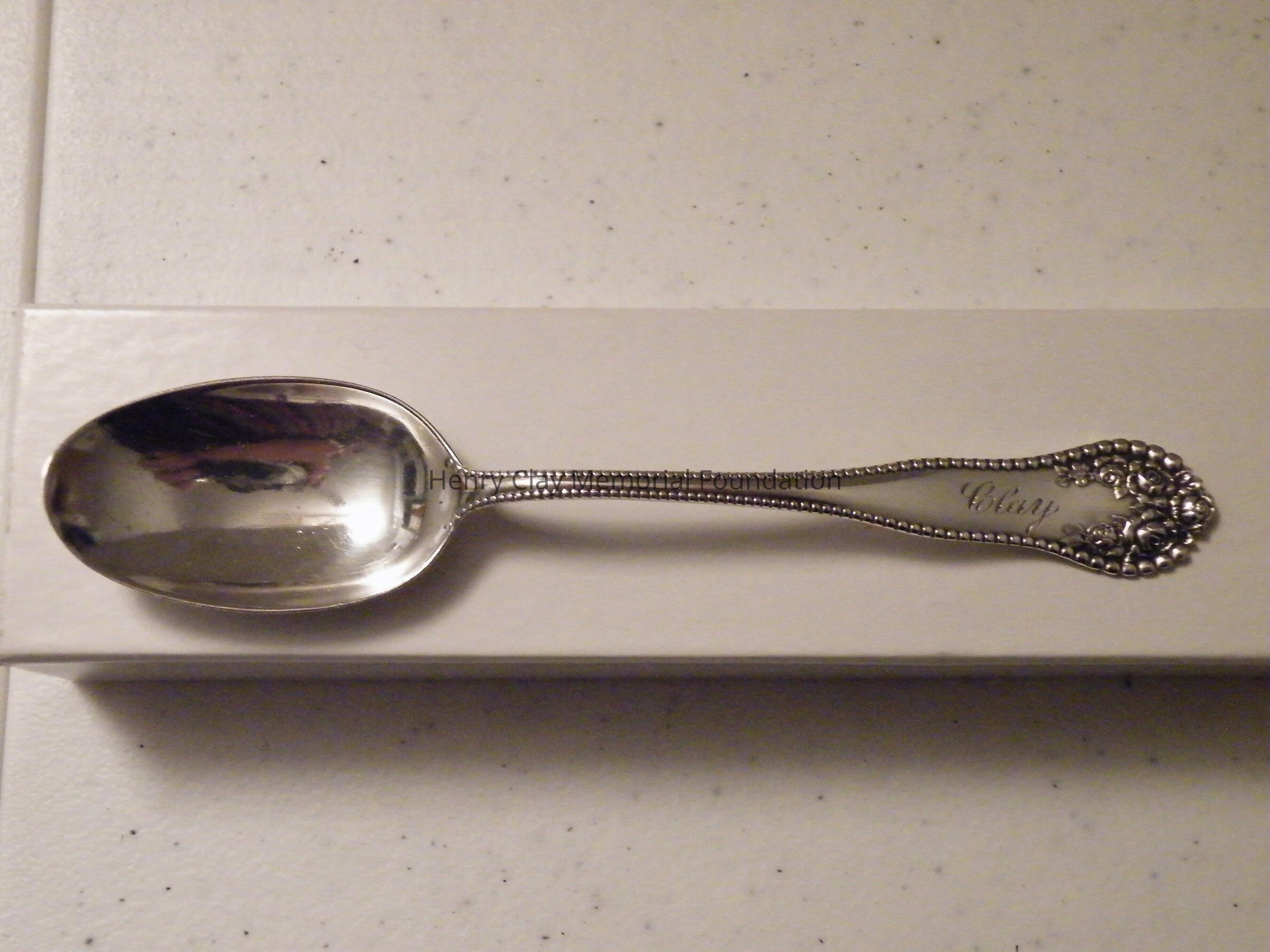 A sterling silver spoon engraved "Clay" on the handle.