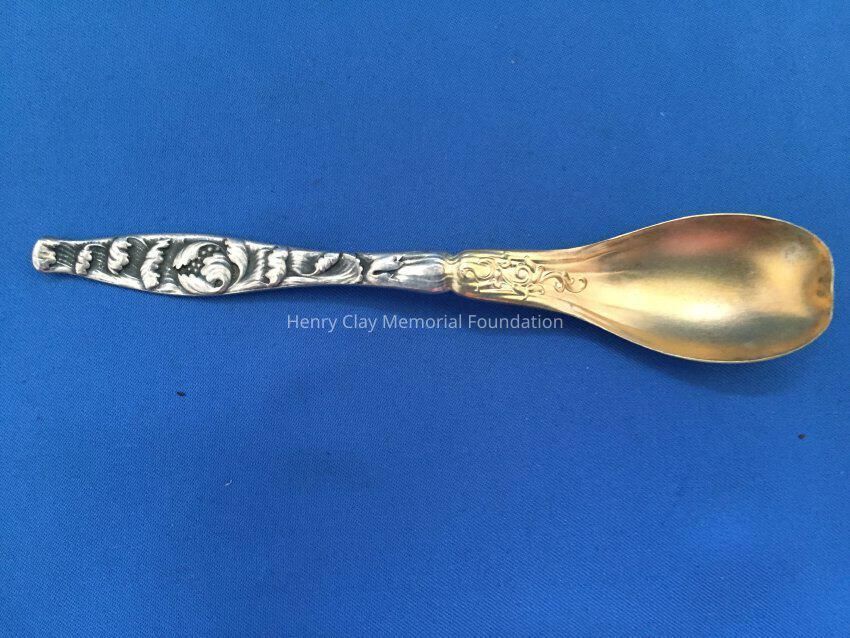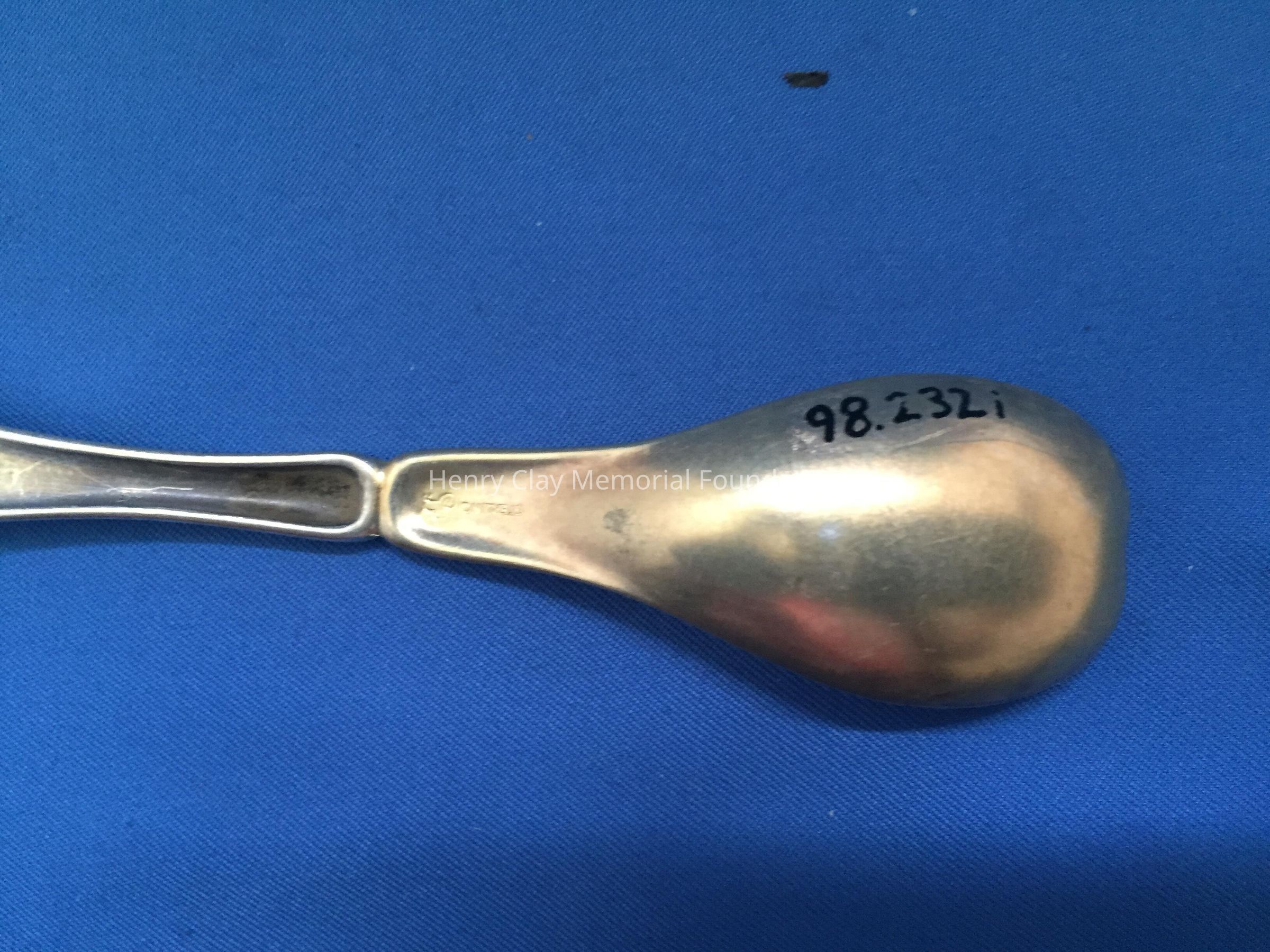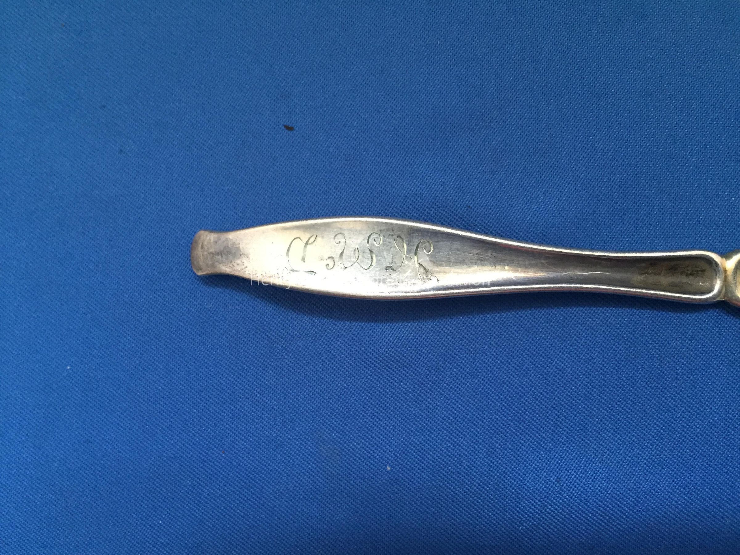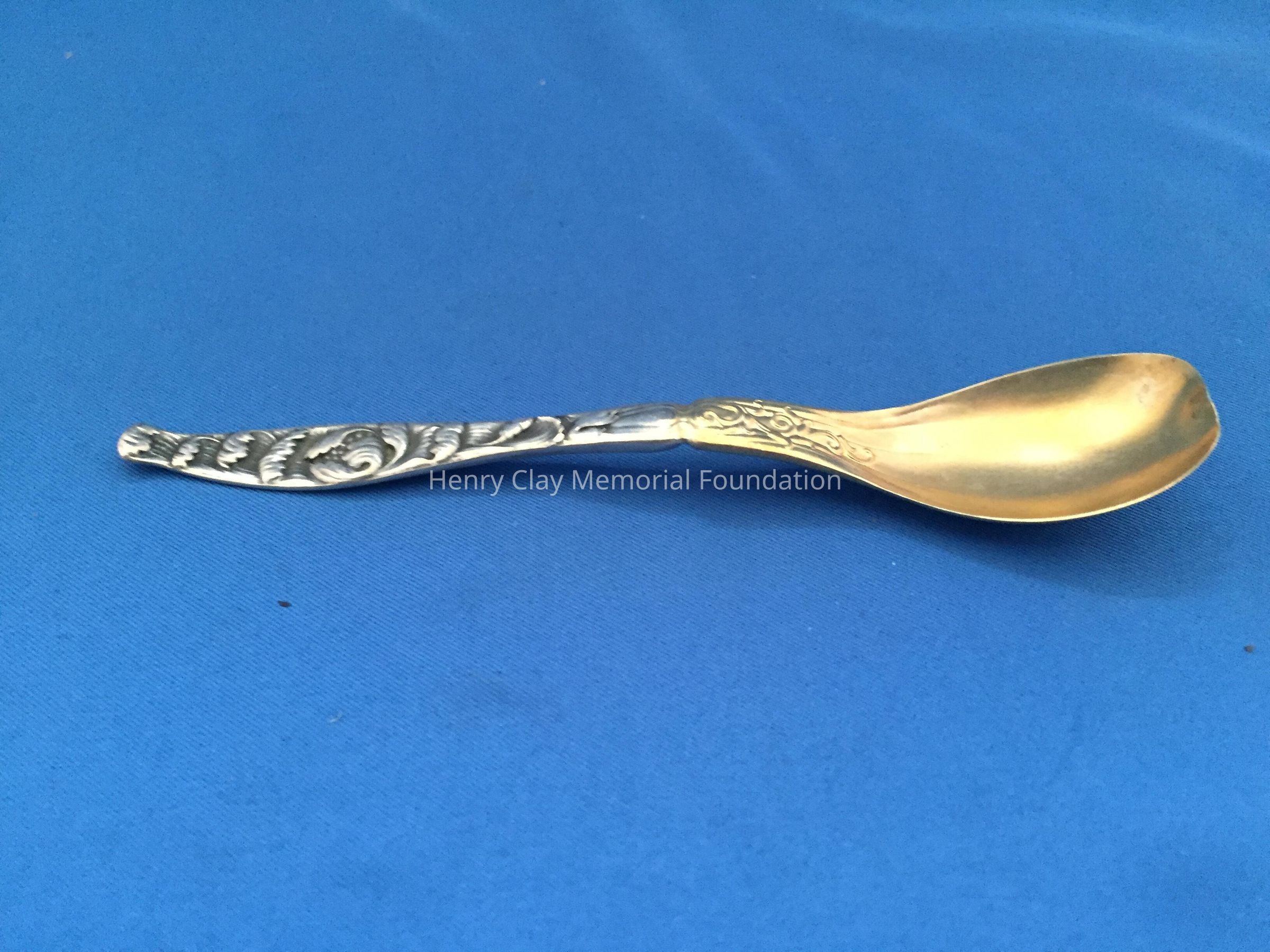 Twelve small spoons with gold-wash bowls. Bowls are tear-drop shape and blunt at round end. Decorative handle with molded flower petals. Engraved "NMcD" on back of handle. Stamped "Sterling" with a maker's mark on back of bowl. Mark is a lion with a circled "W" in front.