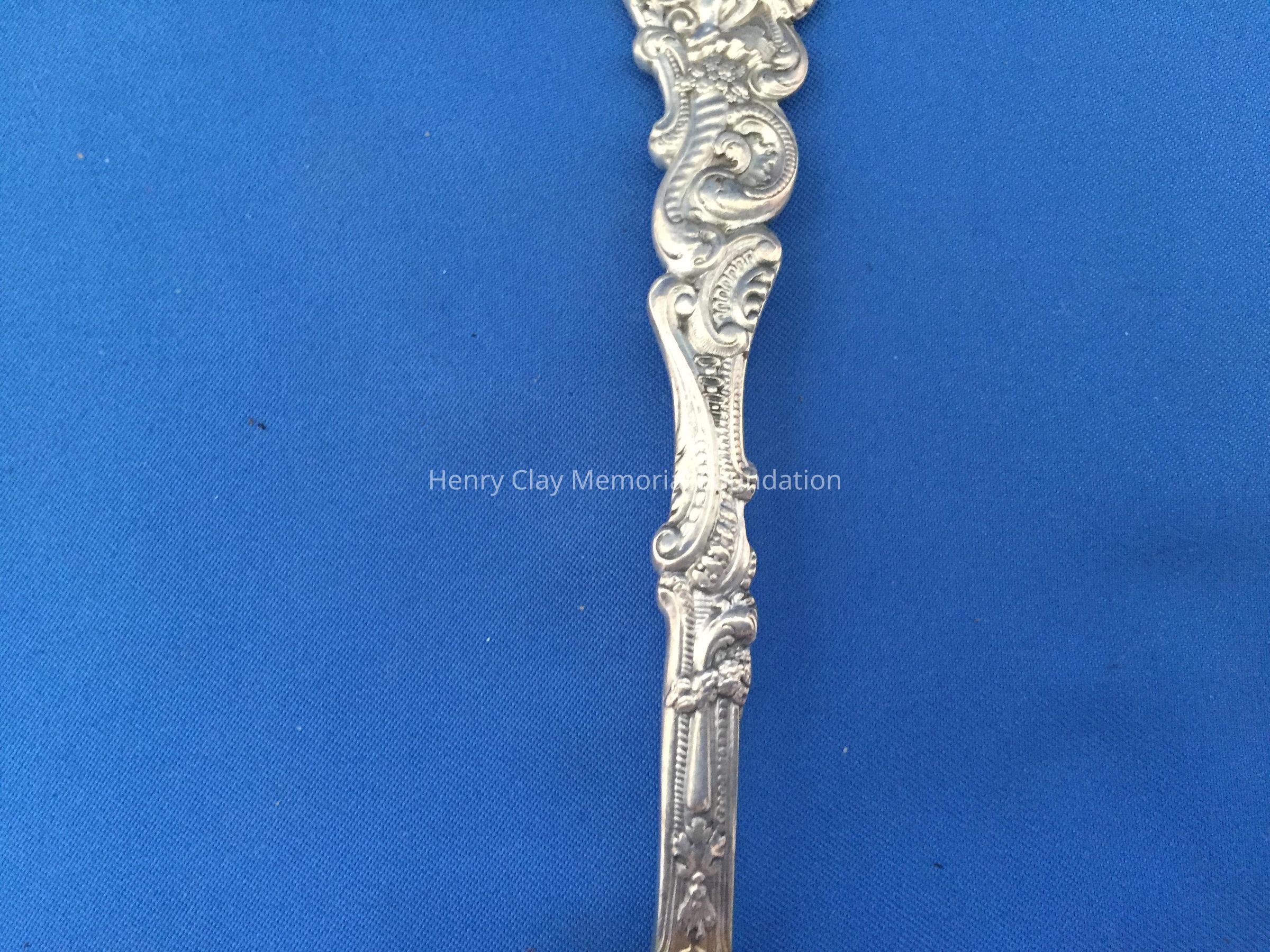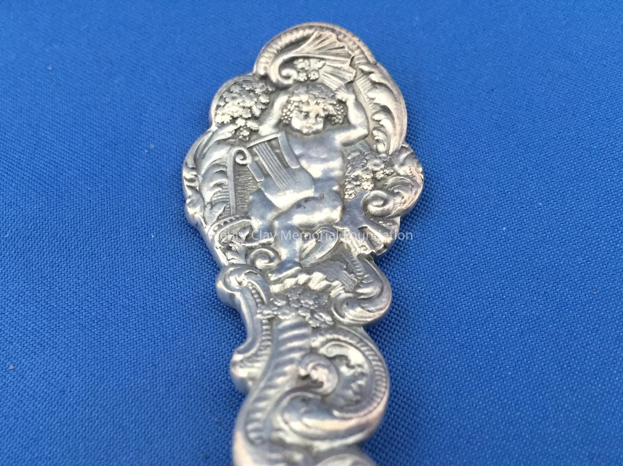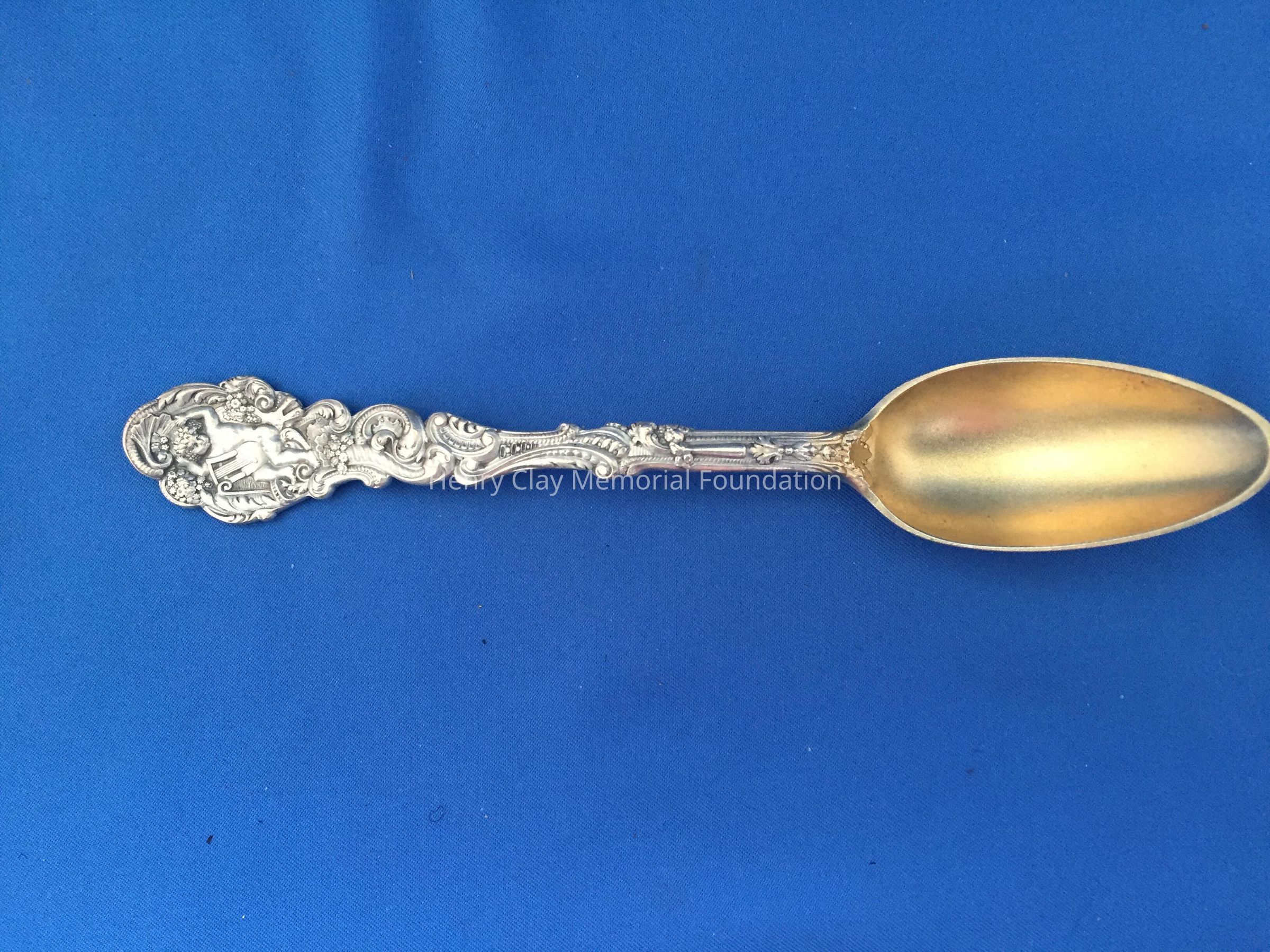 12 sterling with deep, long gold-wash bowls. Decorative handles, wach with an angel playing a lyre at top. Back of bowl has makers mark over "Sterling" over "Copyrighted"