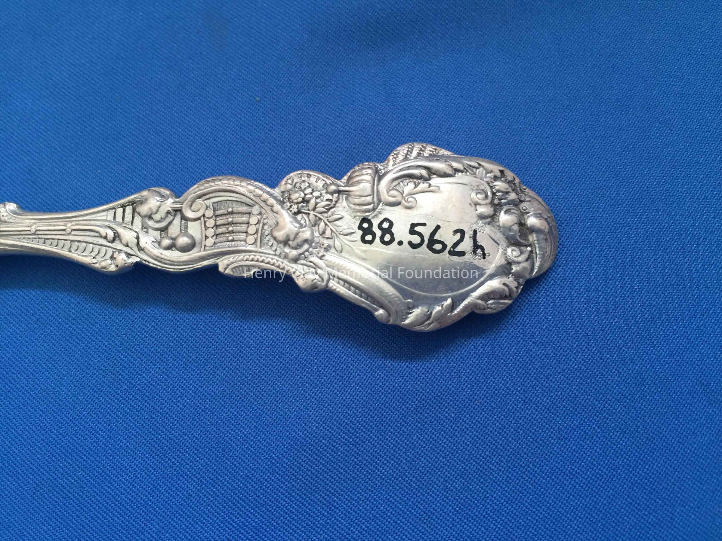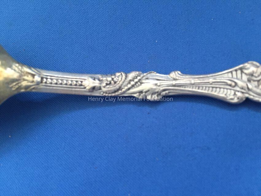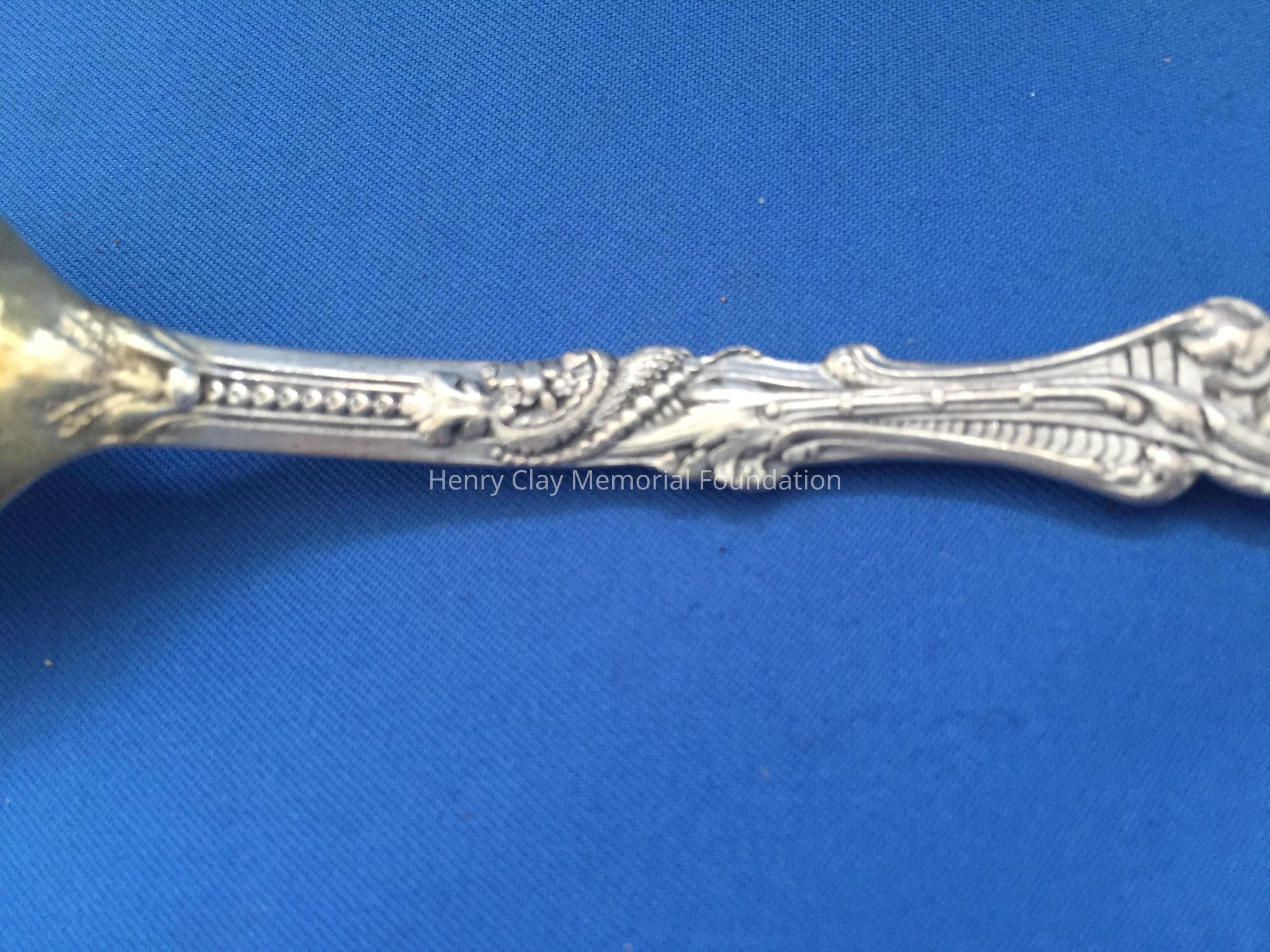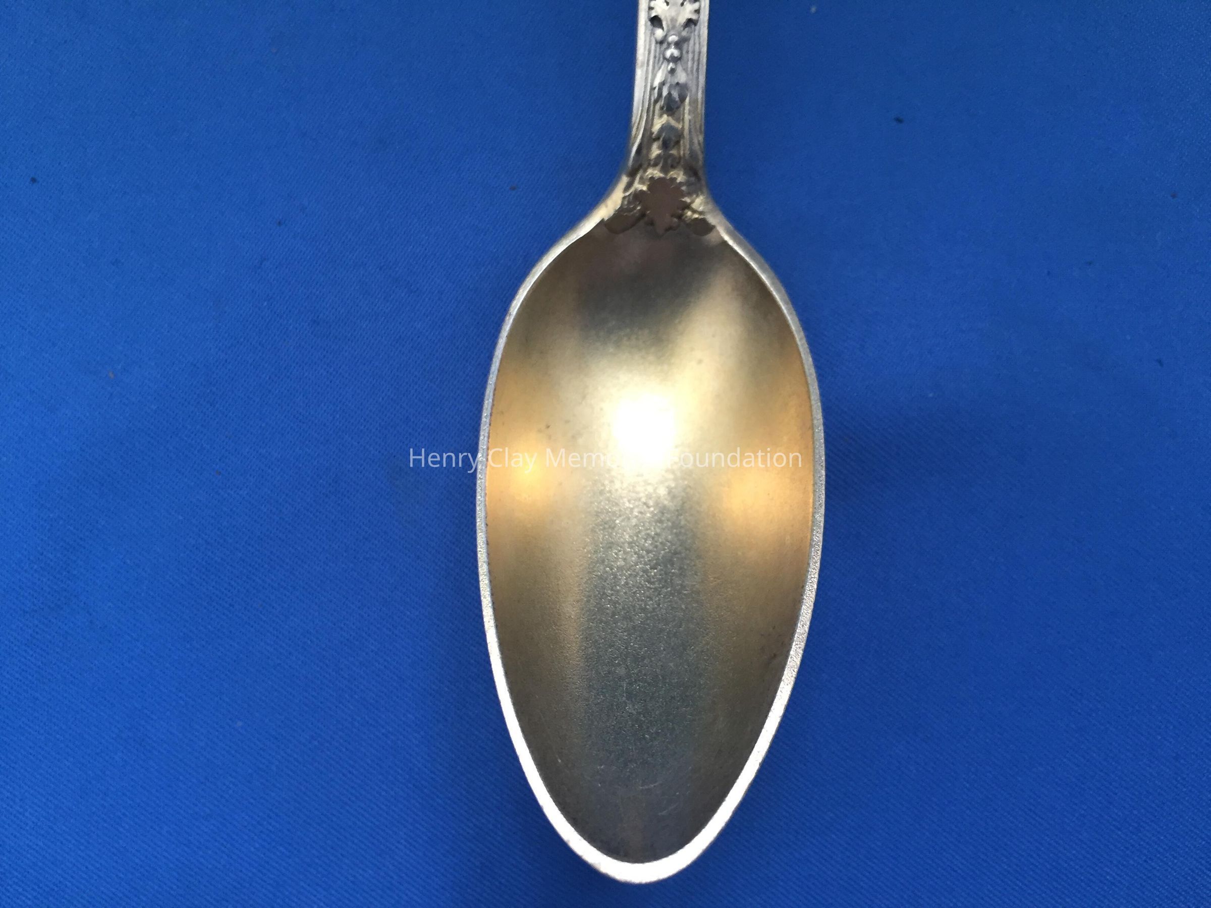 12 sterling with deep, long gold-wash bowls. Decorative handles, wach with an angel playing a lyre at top. Back of bowl has makers mark over "Sterling" over "Copyrighted"