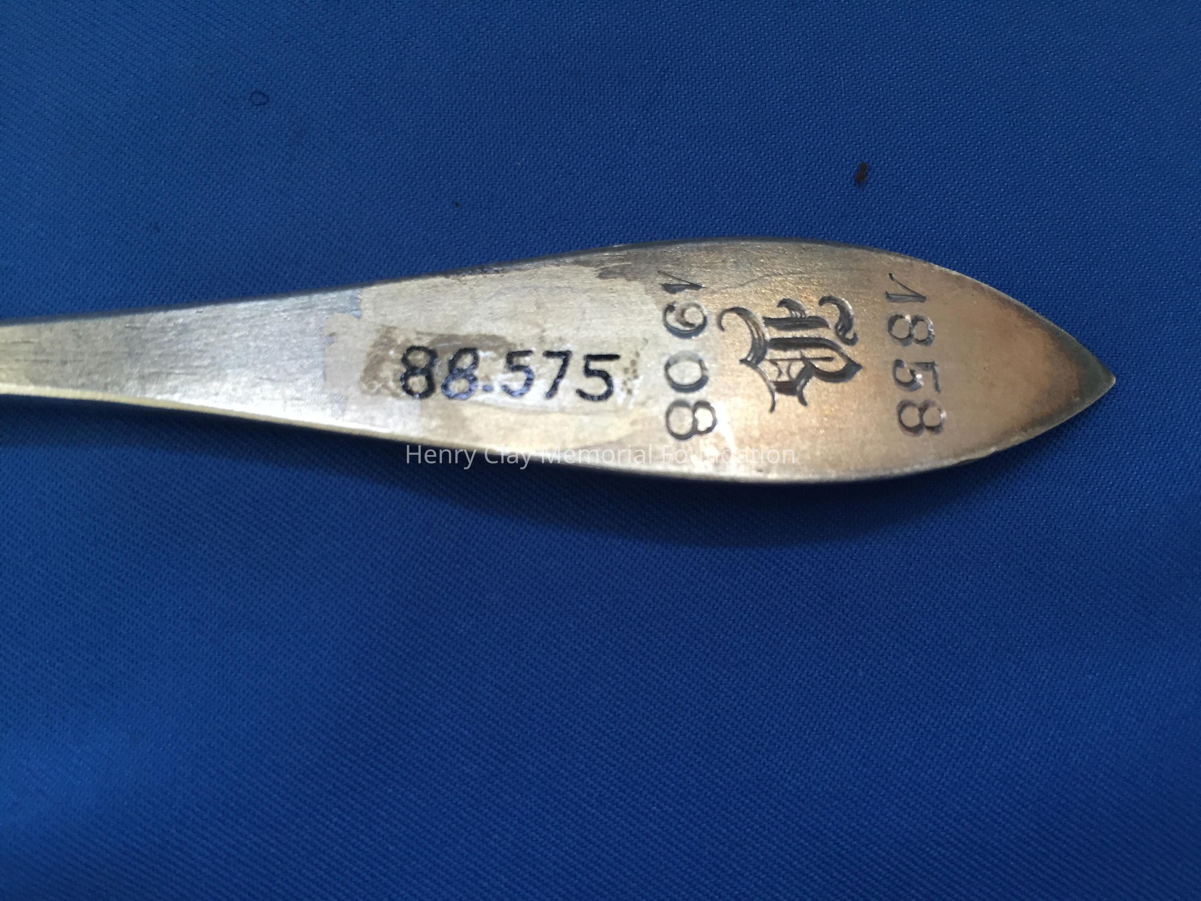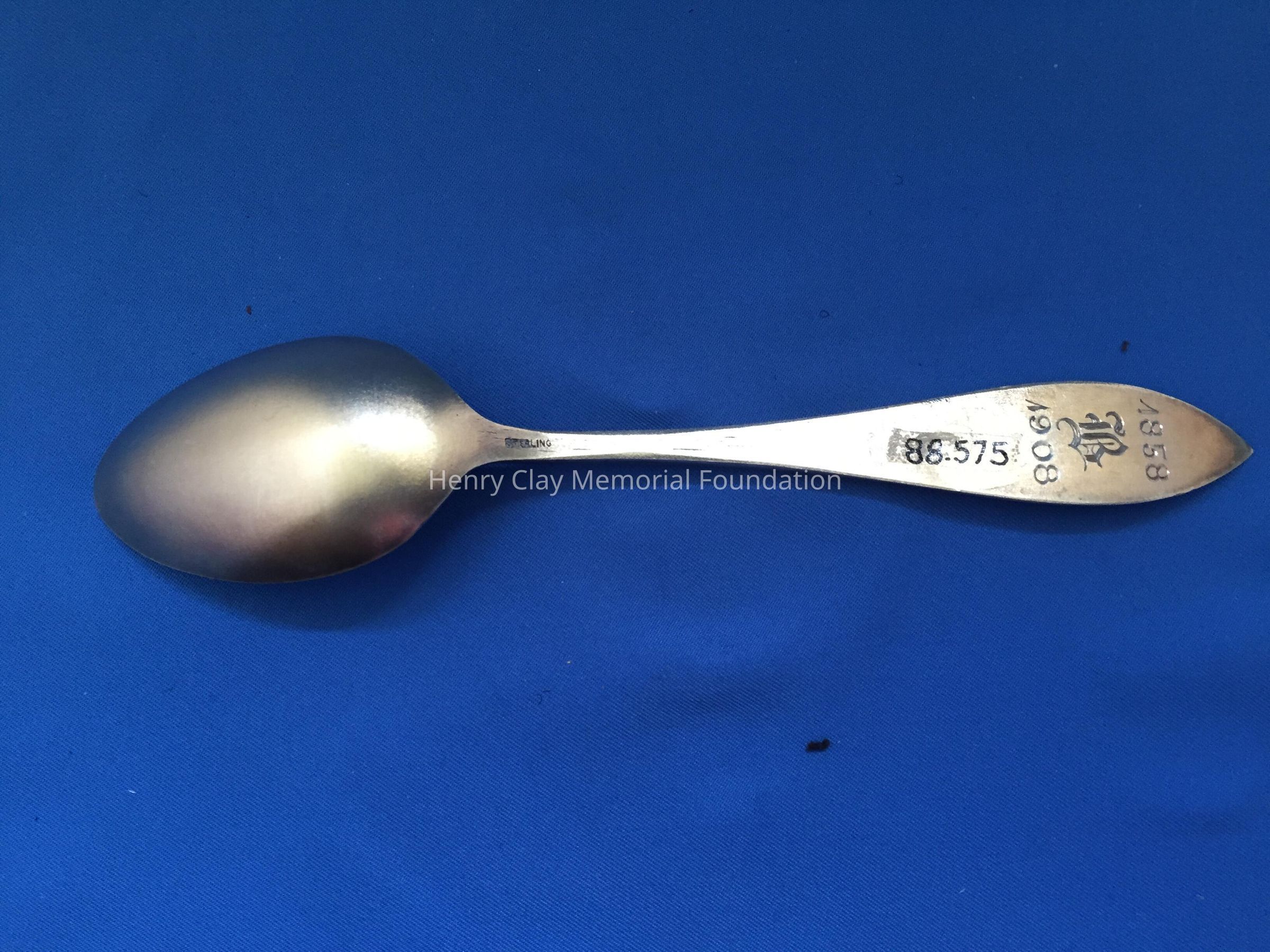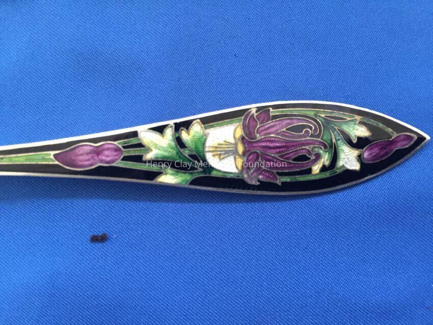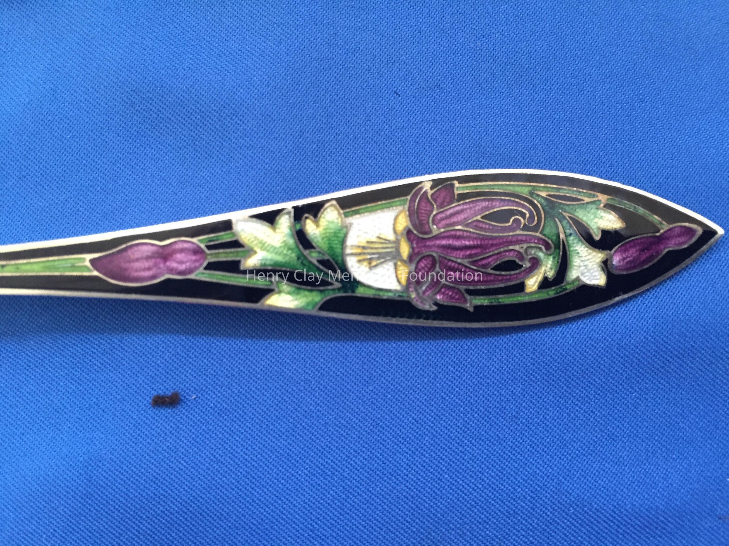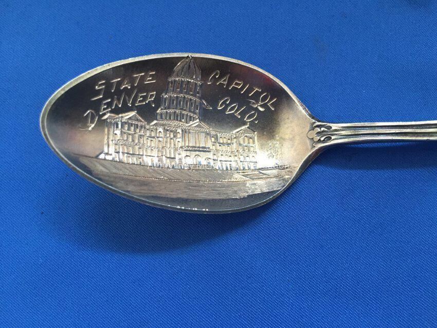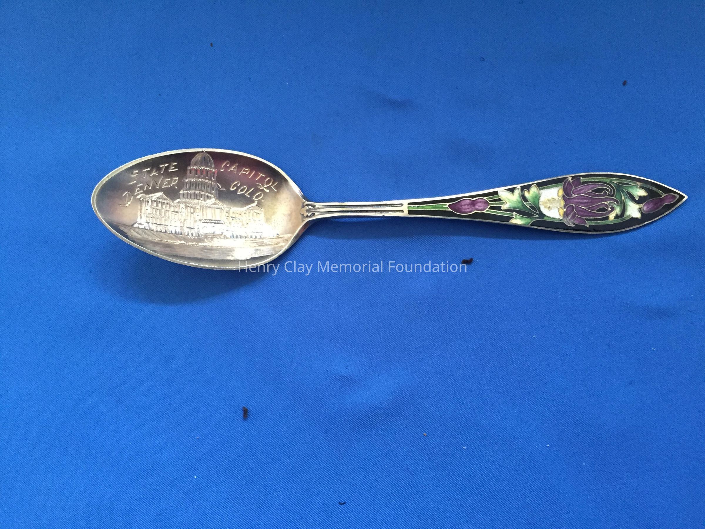 Sterling with gold-wash. "State Capitol Denver Col." and the capital building engraved on bowl. Purple and green flowers on black enamel background on handle. Back of handle is engraved, "1858/B/1908"