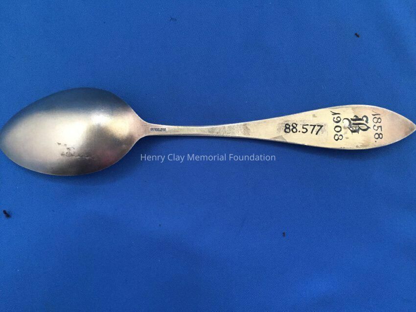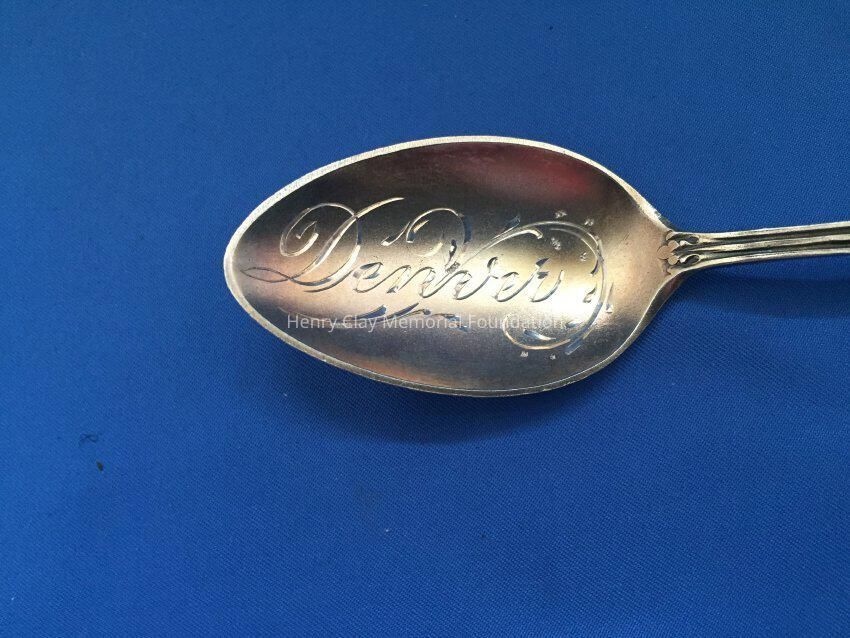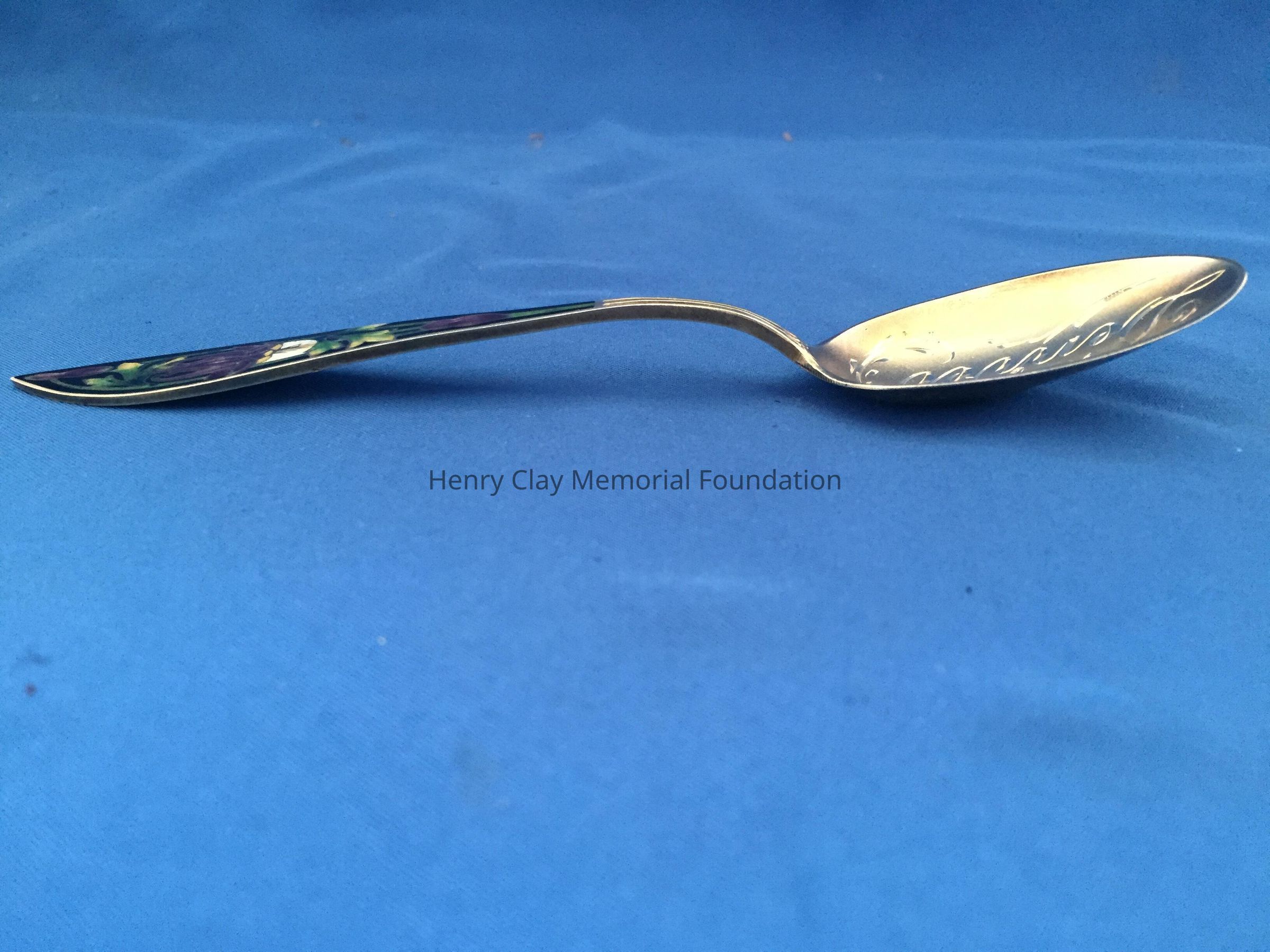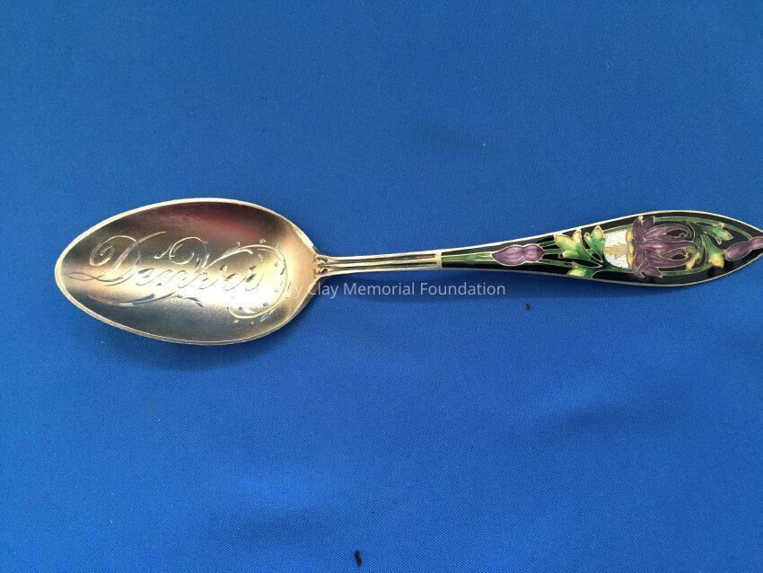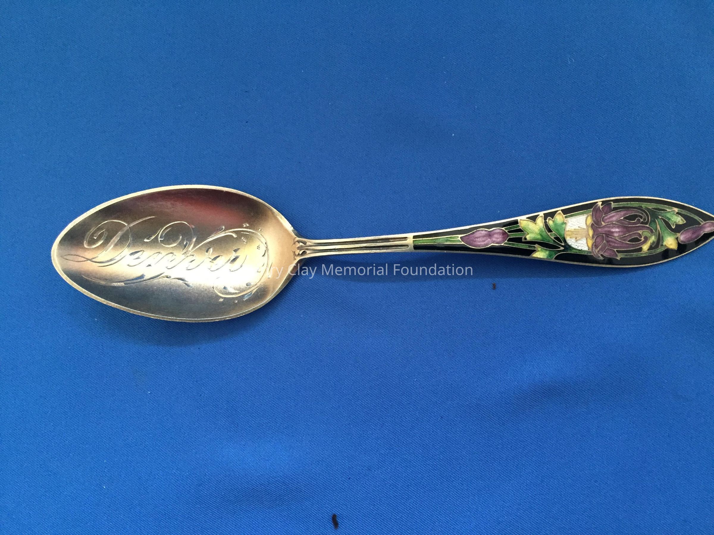 Sterling with gold-wash. "Denver" engraved in bowl. Purple and green flowers on black enamel background on handle. Back of handle engraved with "1858/B/1908".