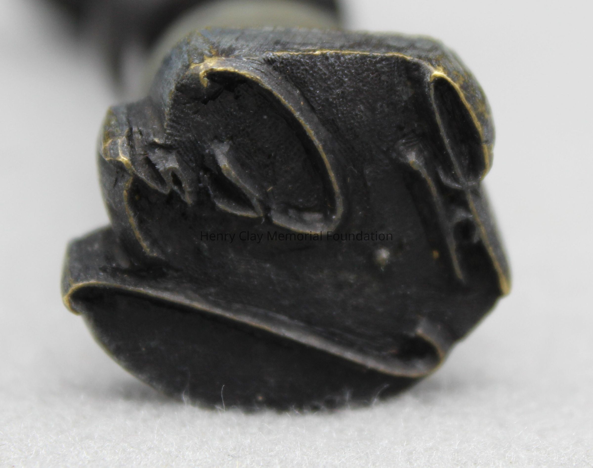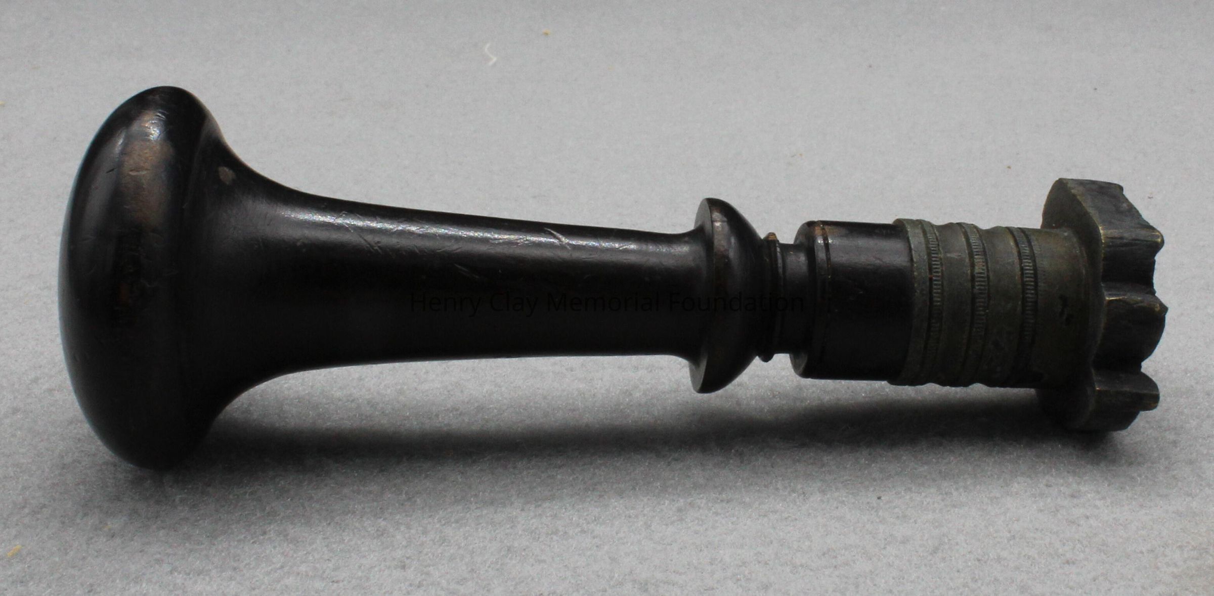 A dark round wooden knob attached to a metal stamp or seal with a facsimile signature, "H. Clay."
