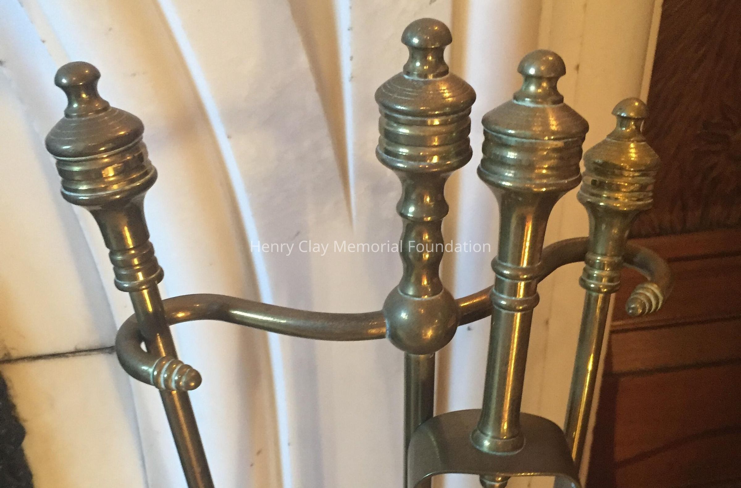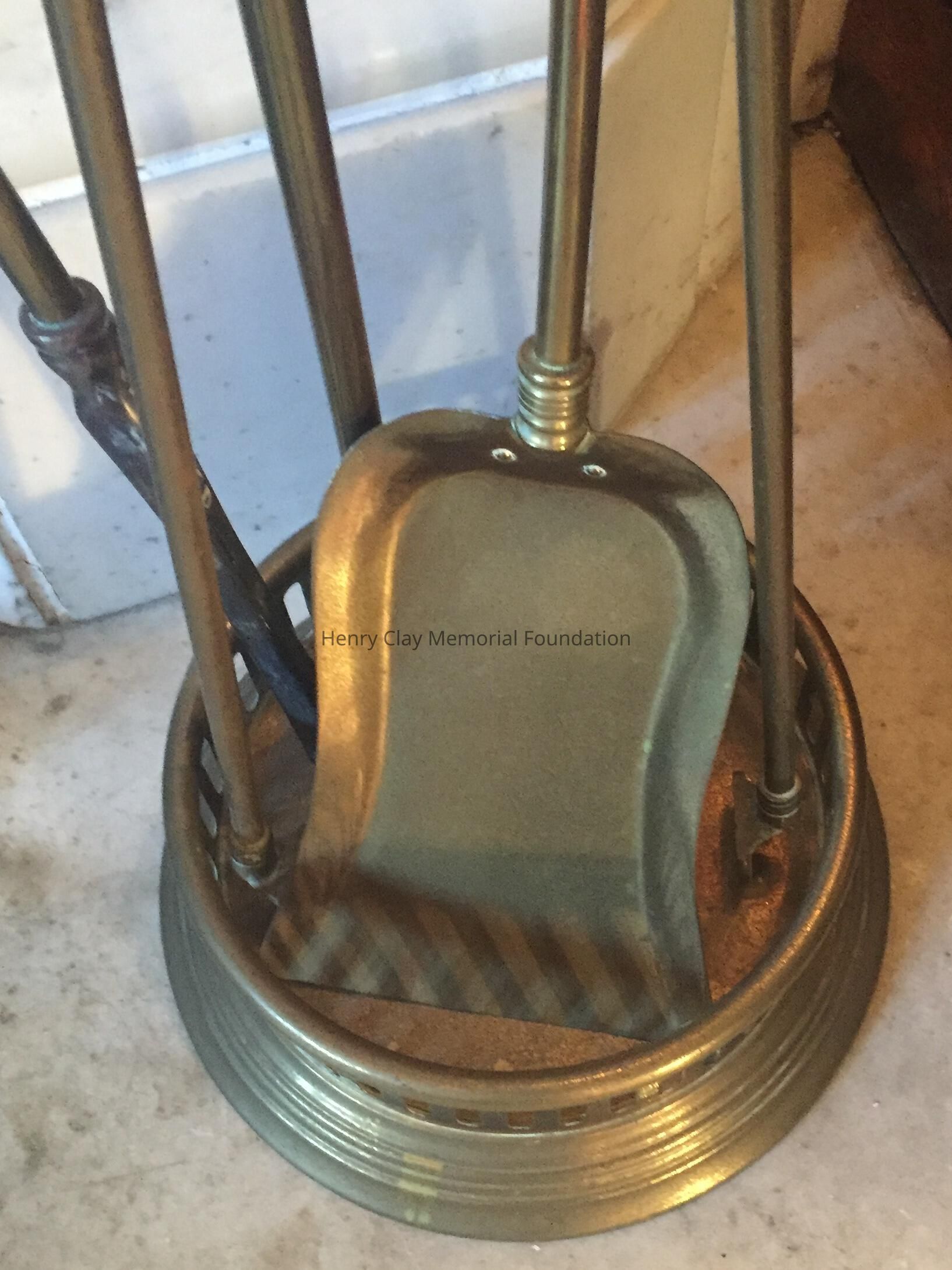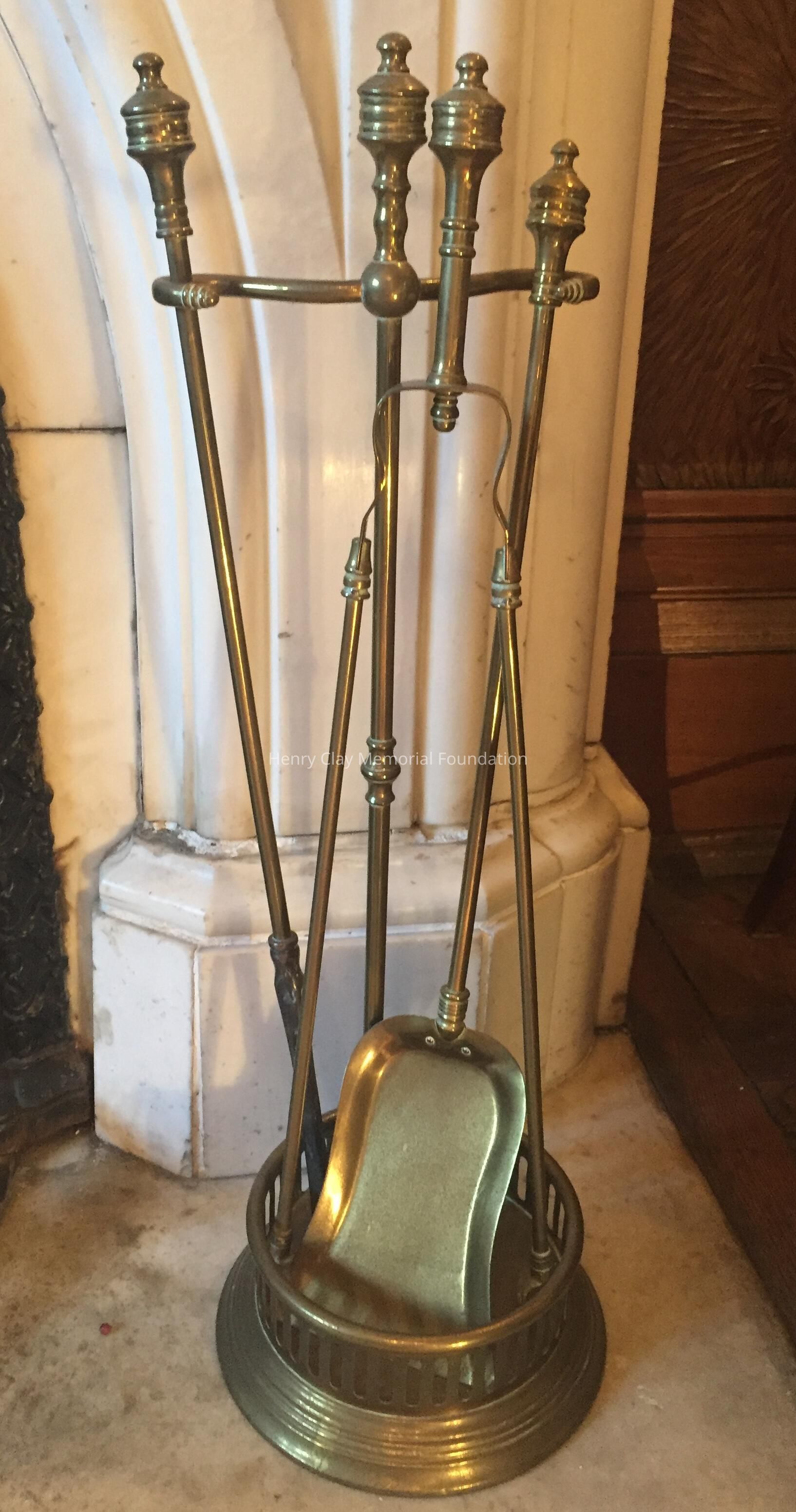 Brass in round stand that consists of stand, shovel, tongs, and poker.