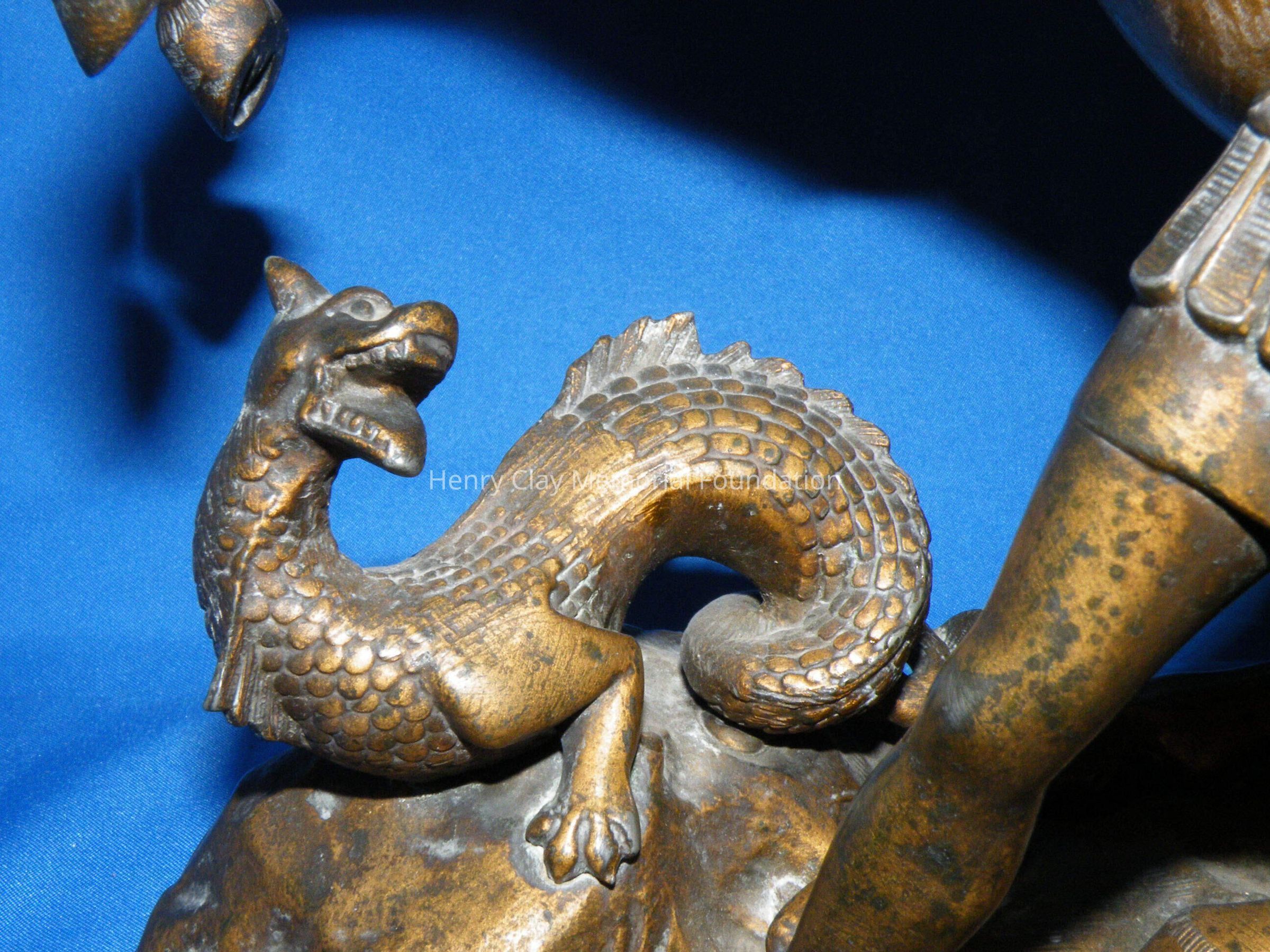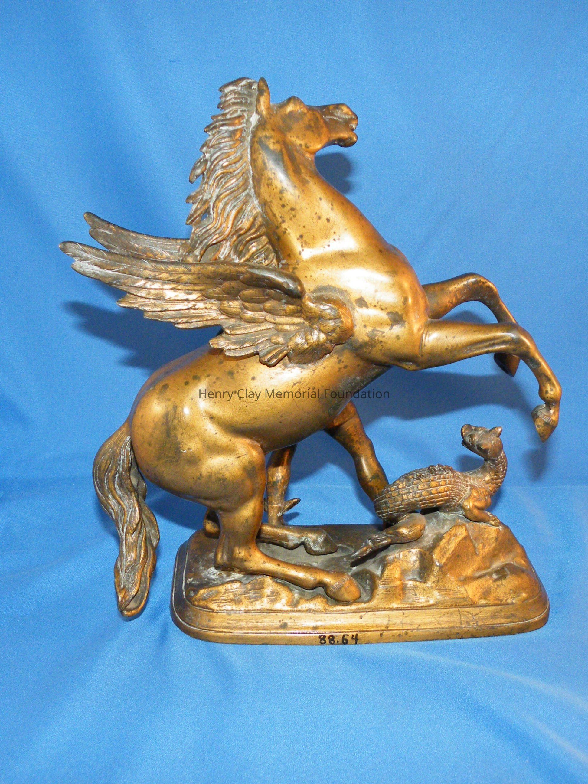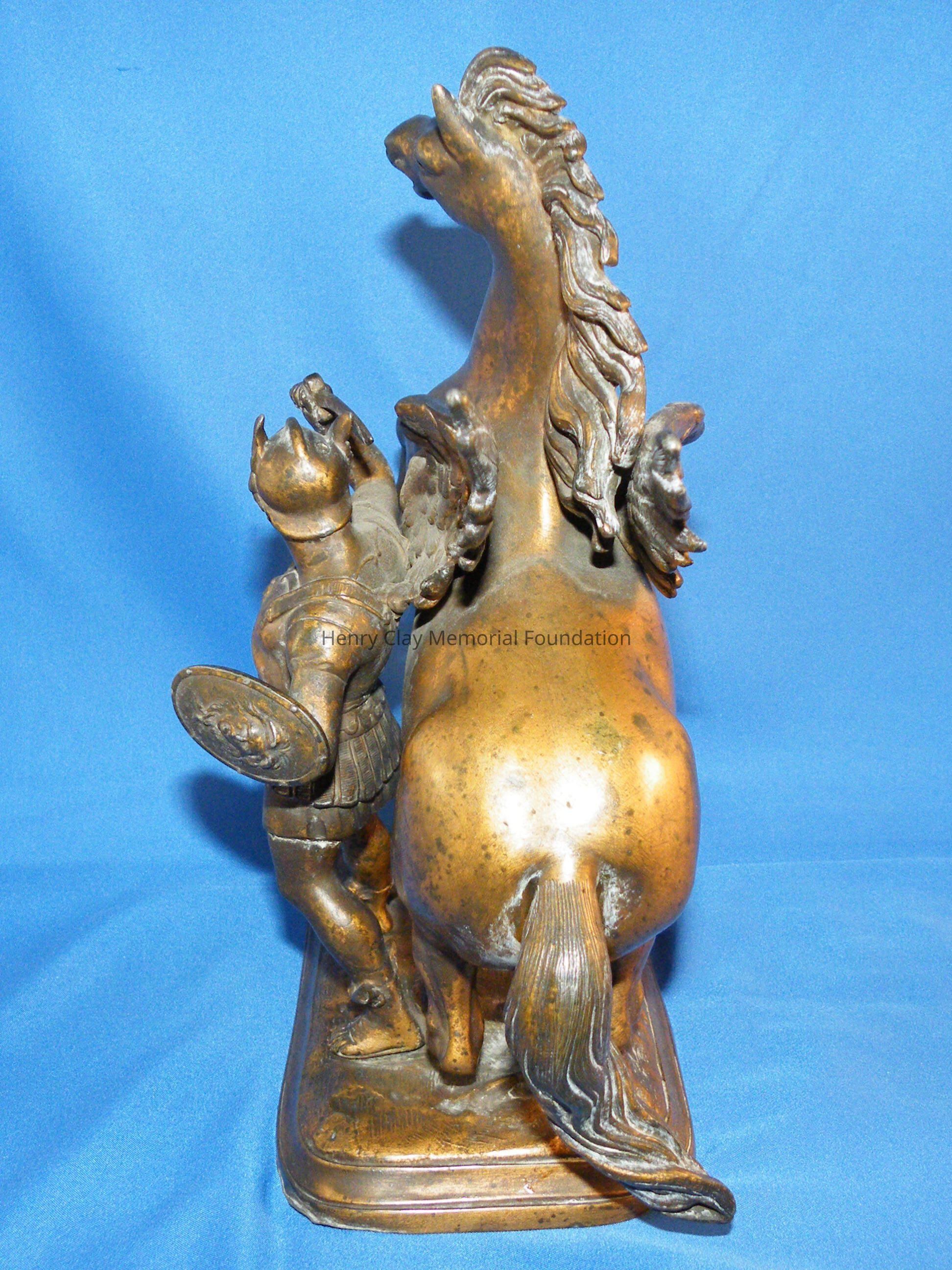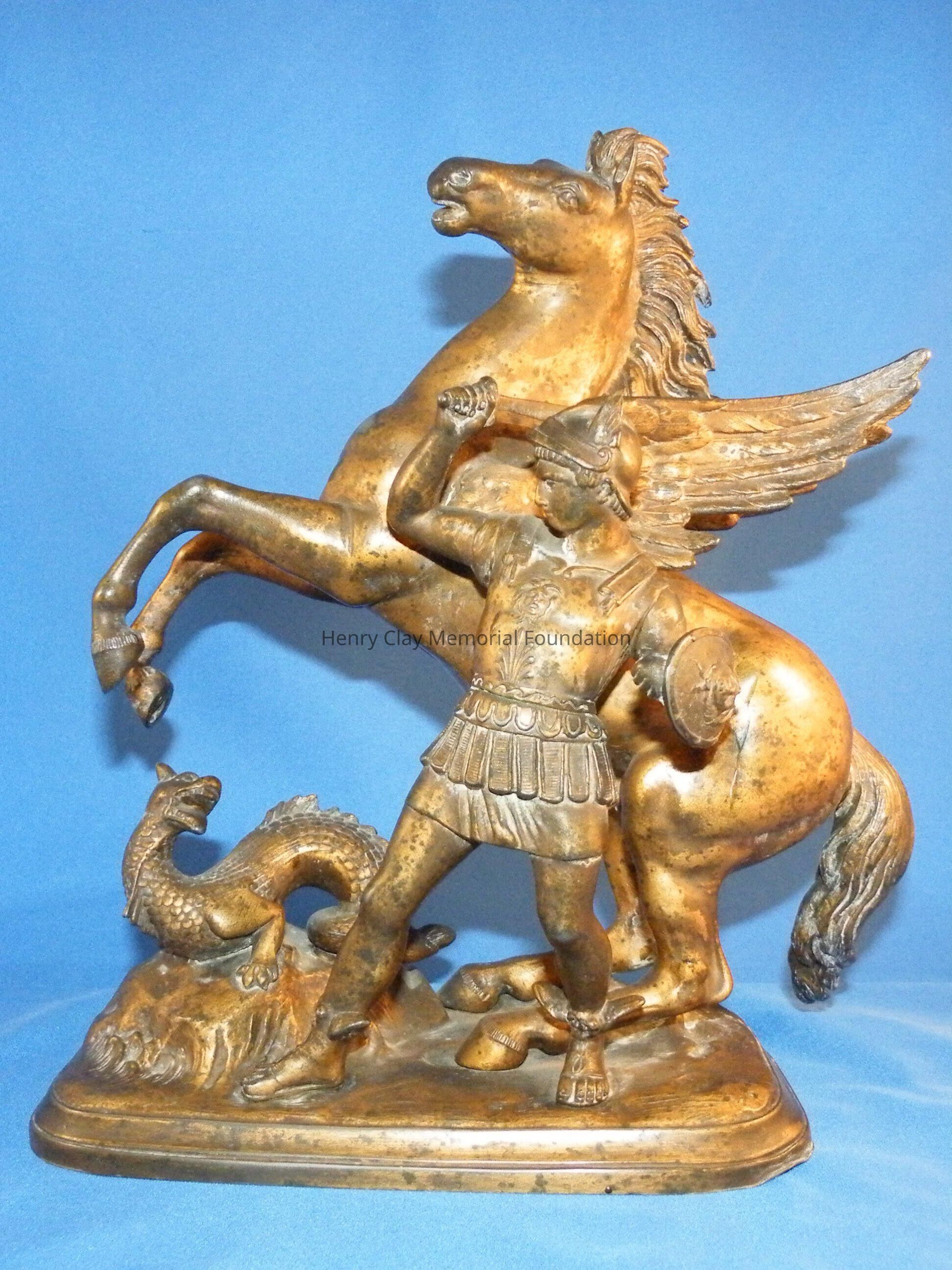 1 statue depicting a man with a sword and shield in Greek armor next to a winged horse. At their feet is a tiny dragon.