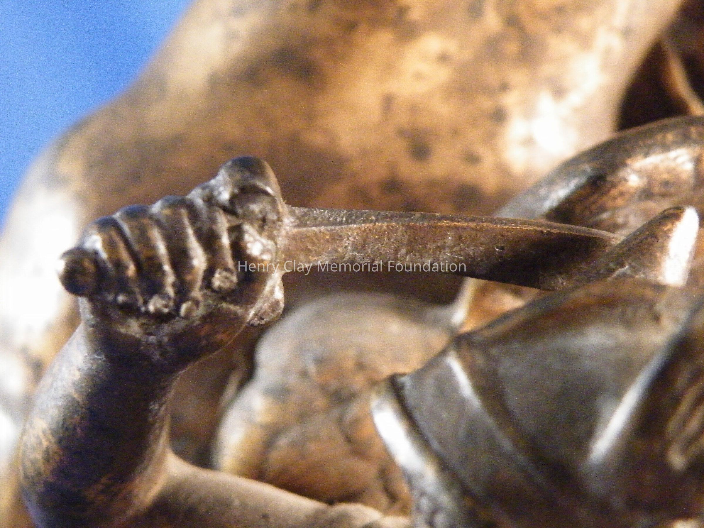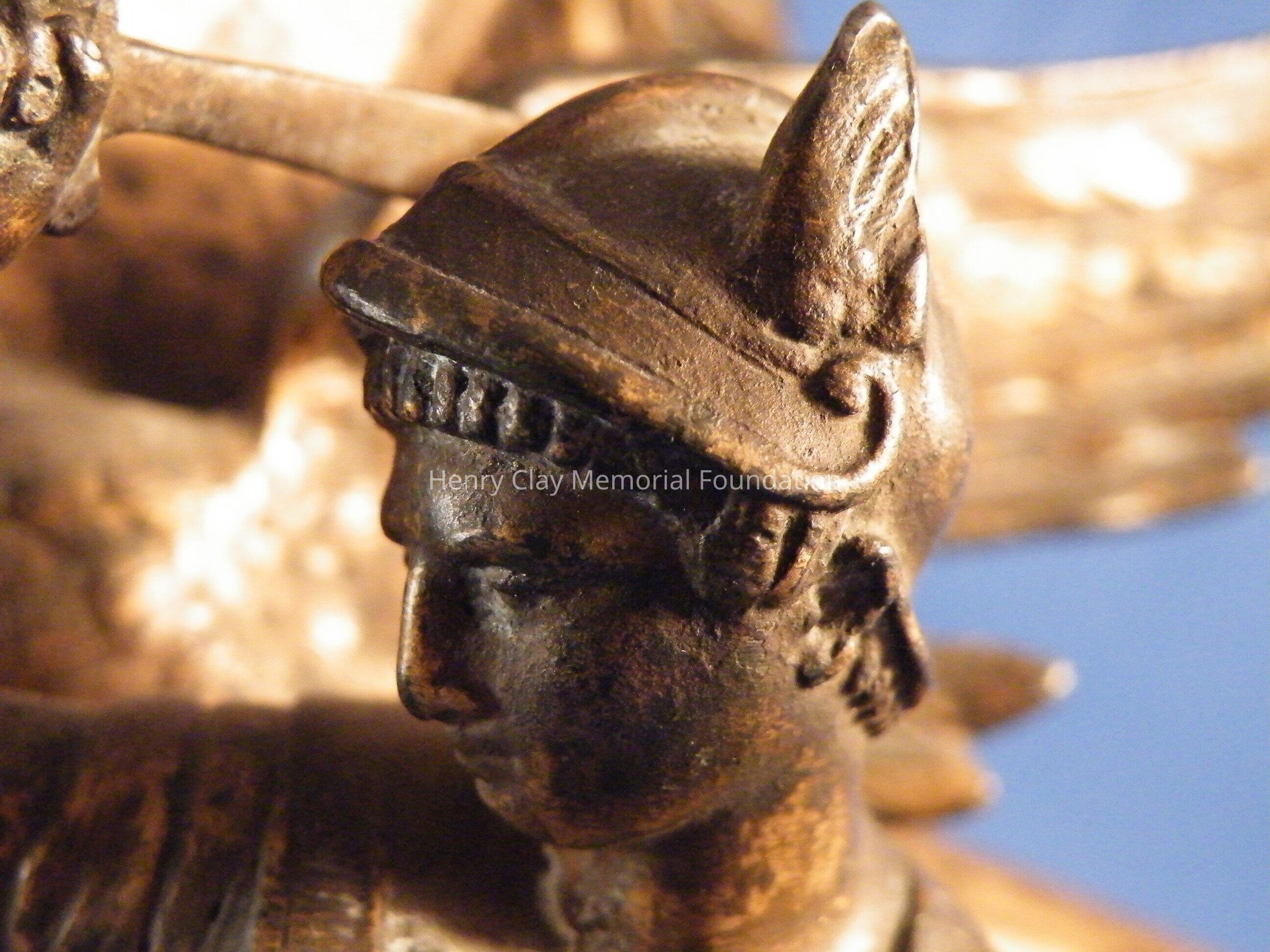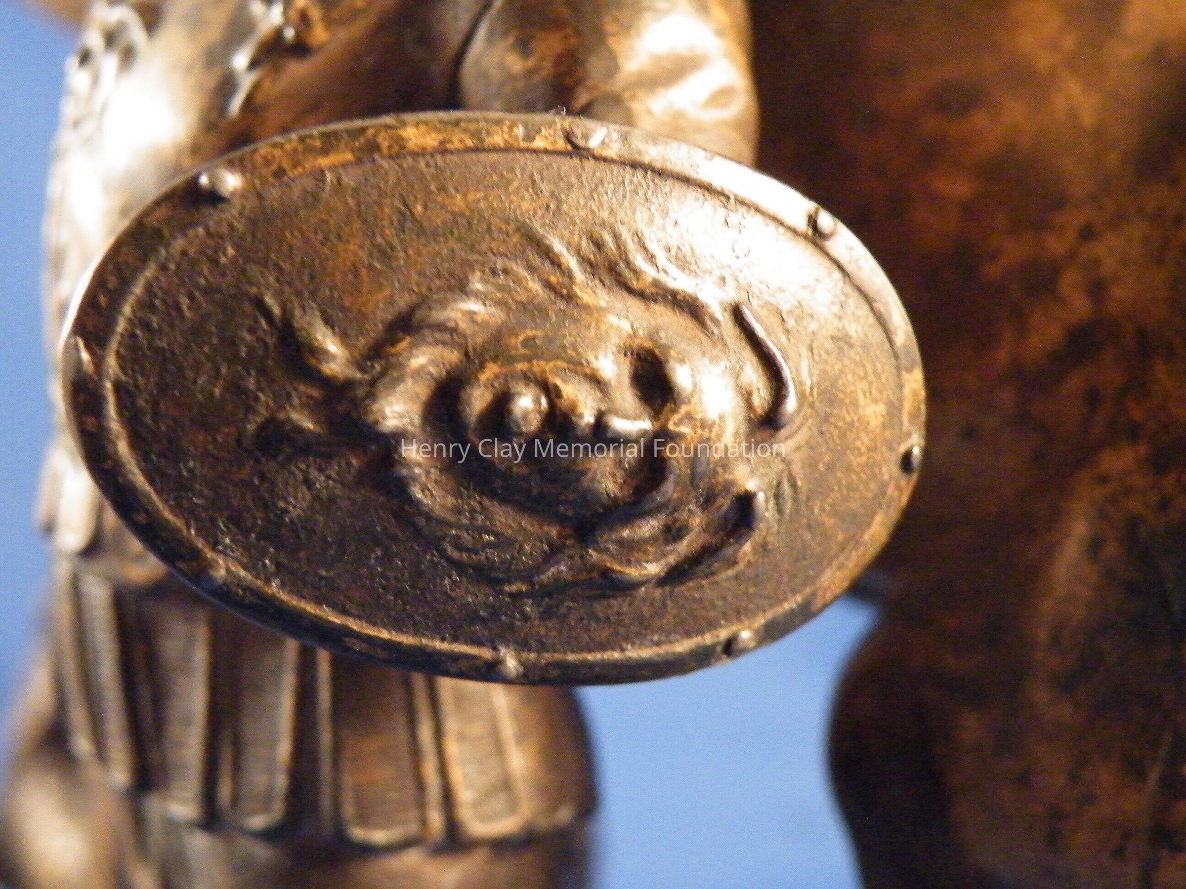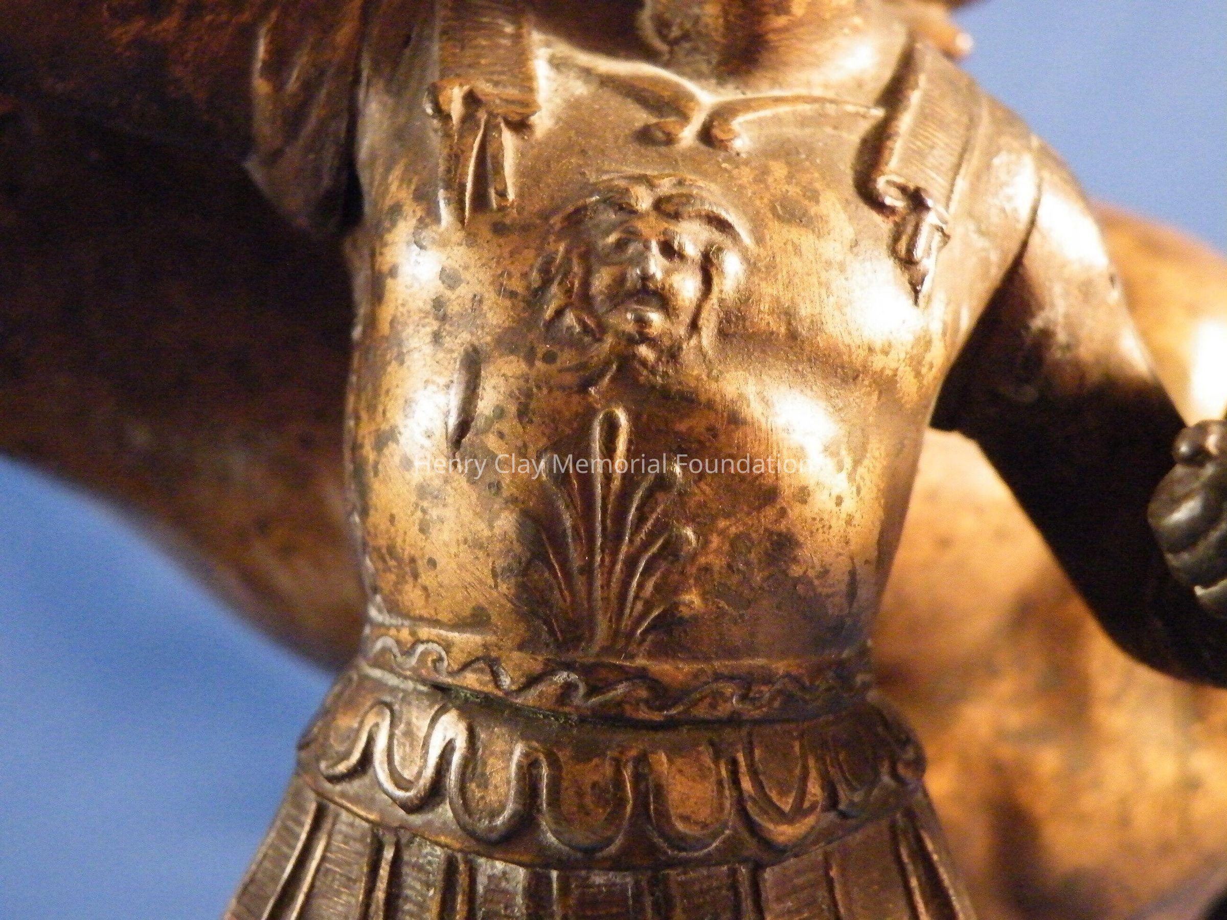 1 statue depicting a man with a sword and shield in Greek armor next to a winged horse. At their feet is a tiny dragon.