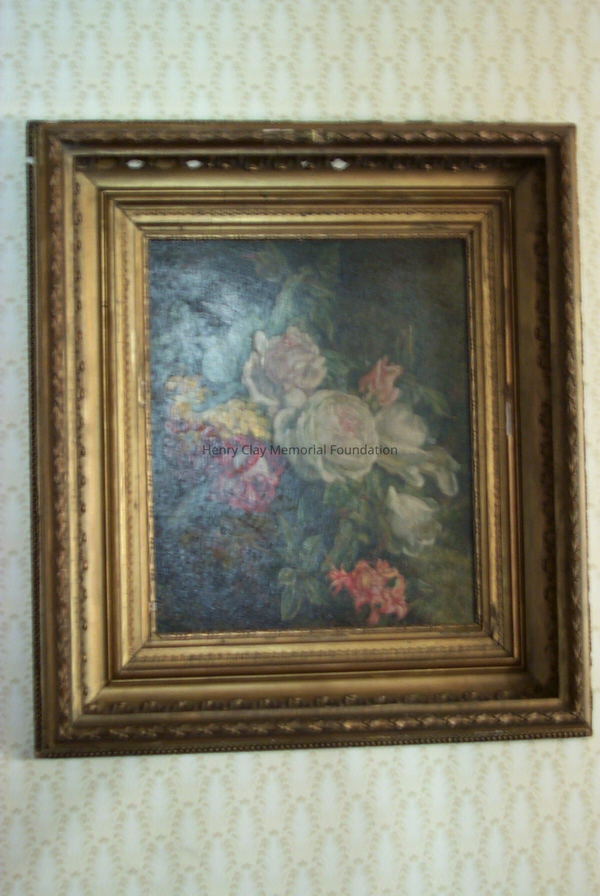 Painting of roses on board. On the back of the board is an oval stencil in red with illegible lettering across inside top, but "Muller / Paris" beneath. Framed in a deep, gilded frame, possibly original to painting.Dimensions