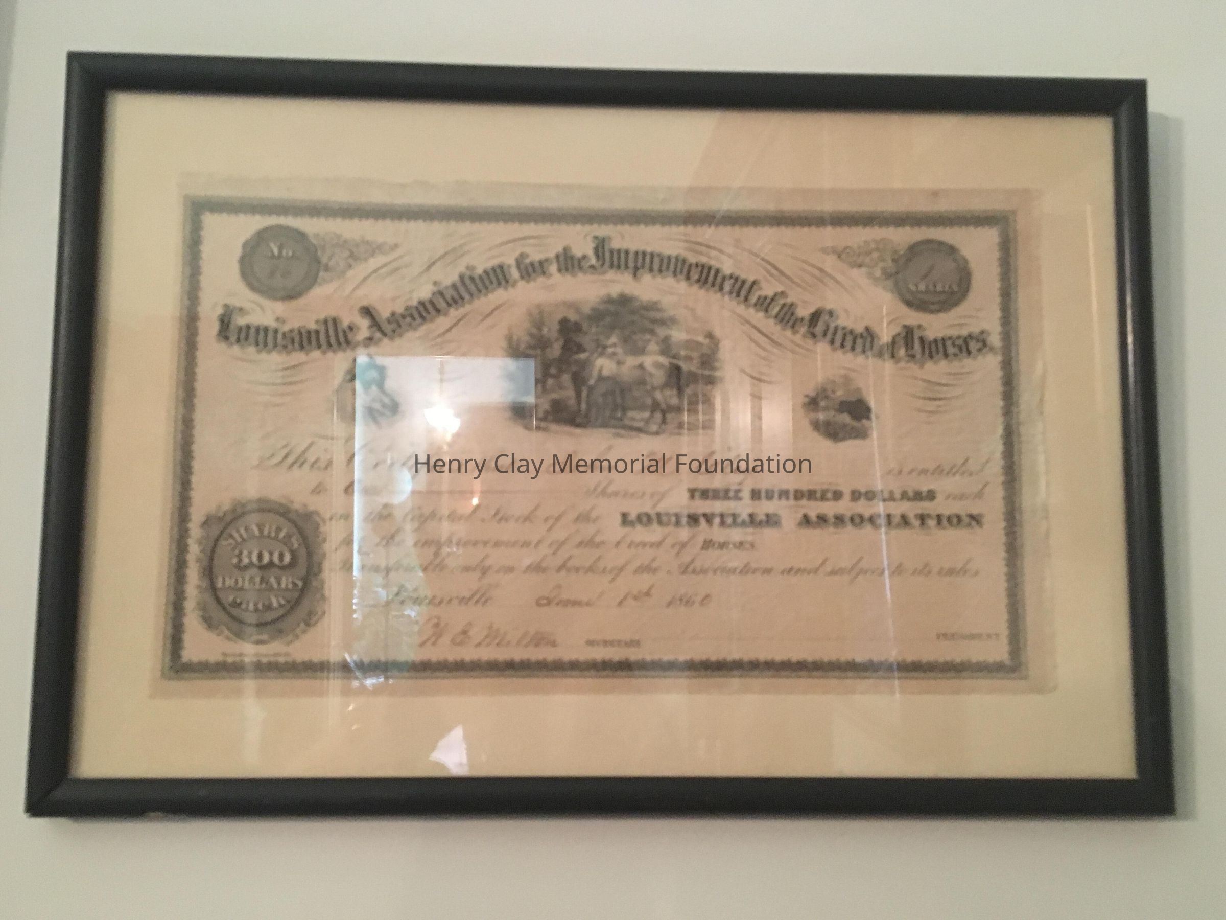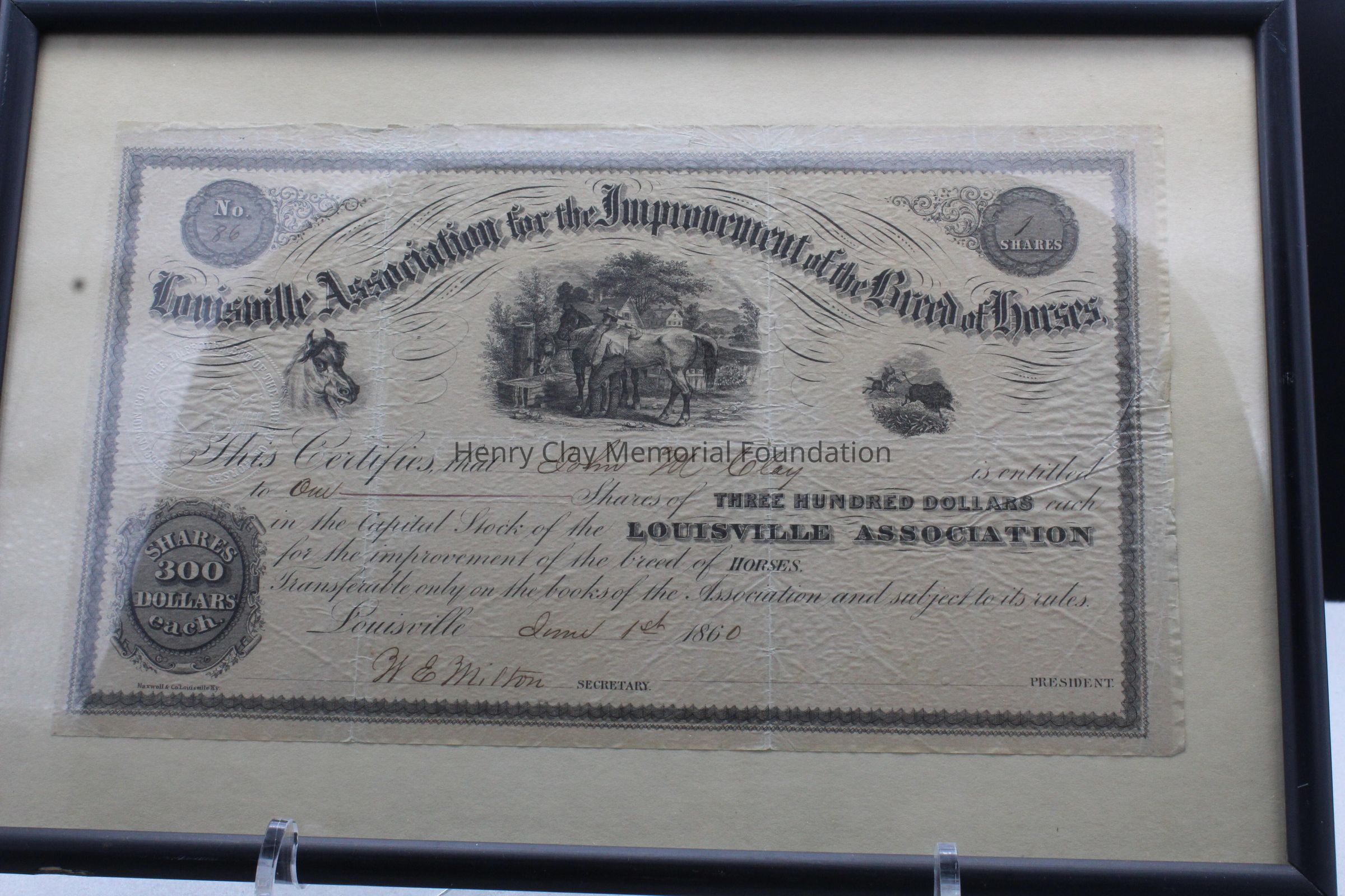 Framed stock certificate for one share of stock in the Louisville Association for the Improvement of the Breed of Horses issued toi John M. Clay June 1, 1860.Material