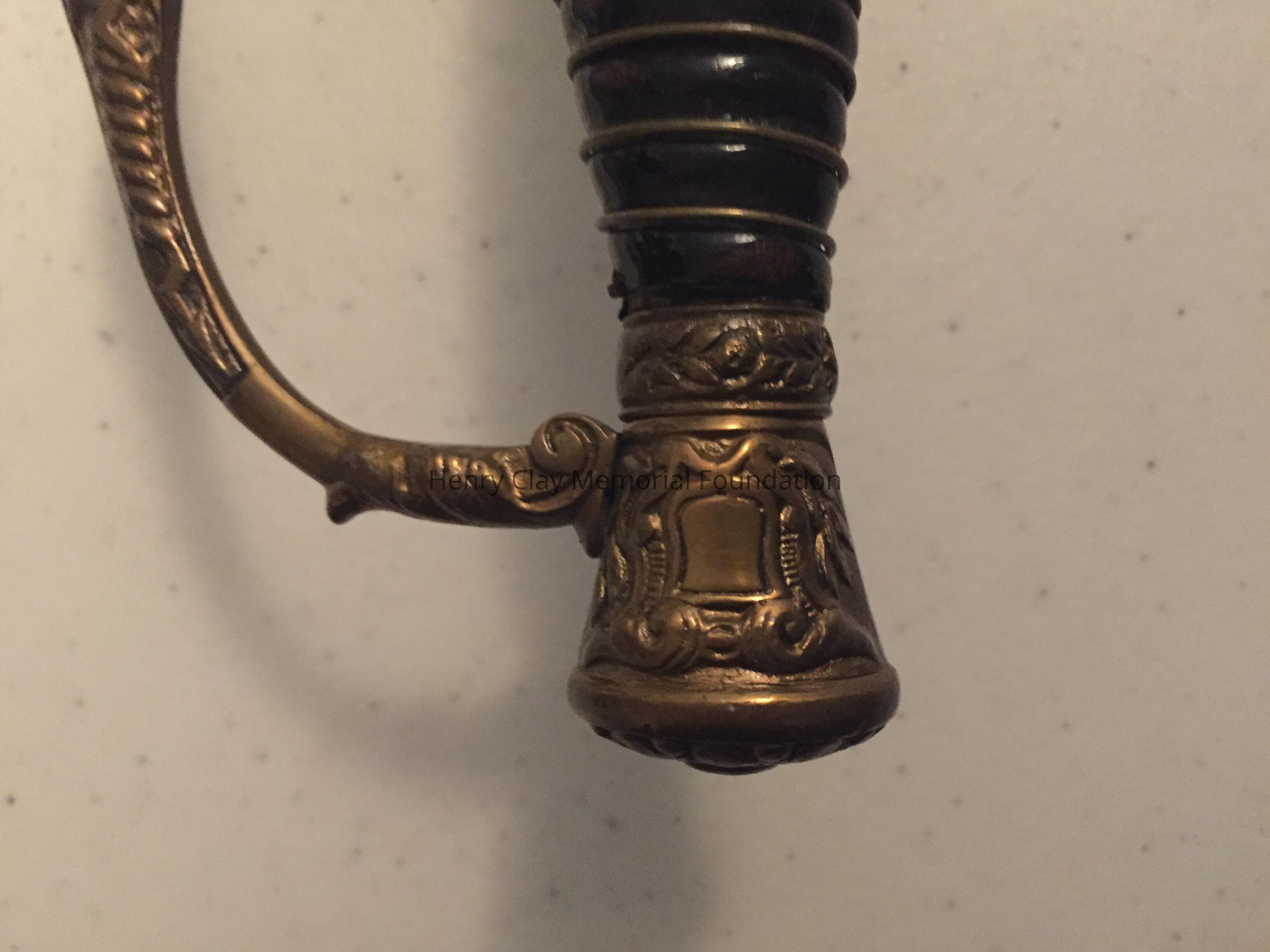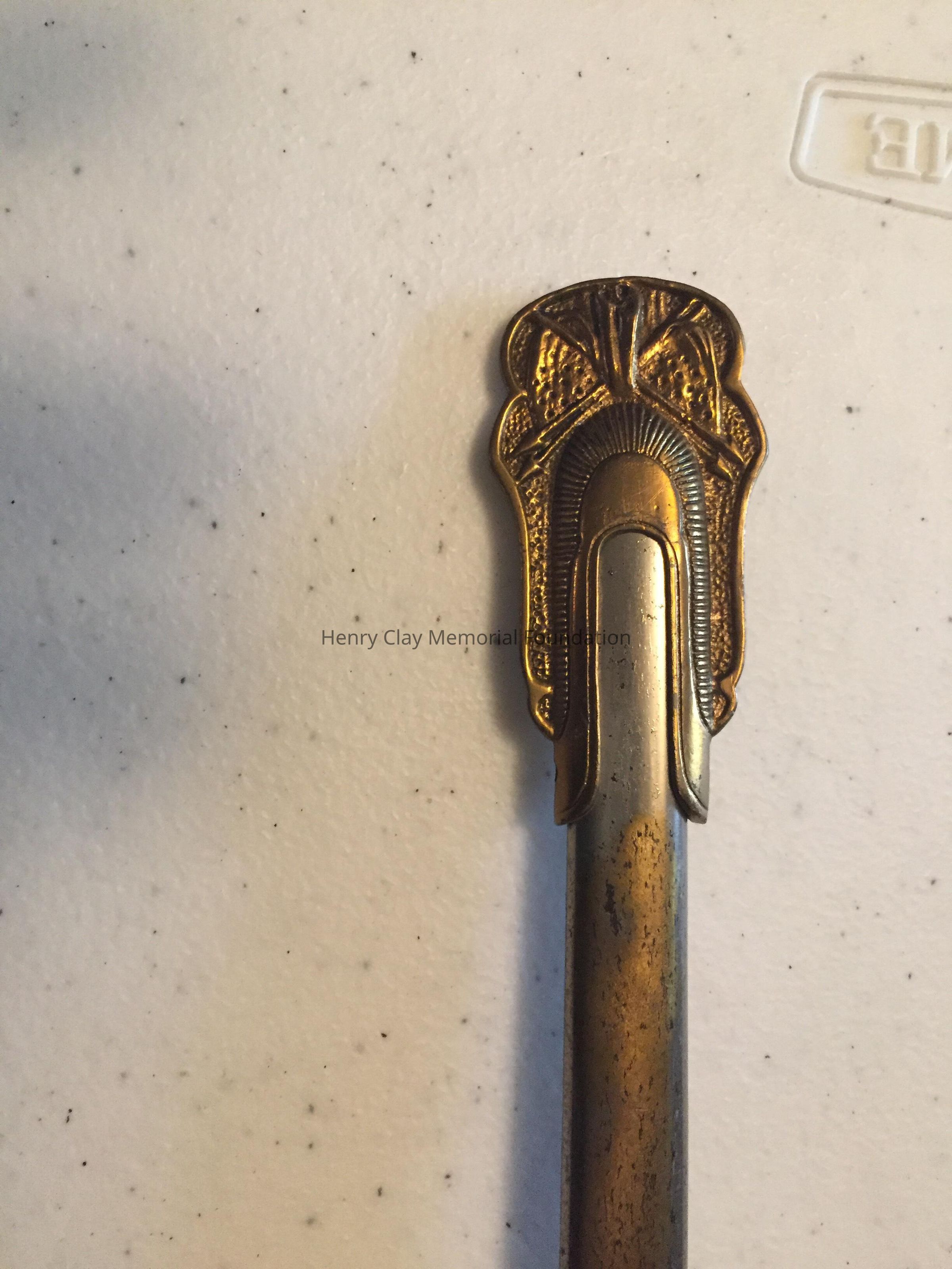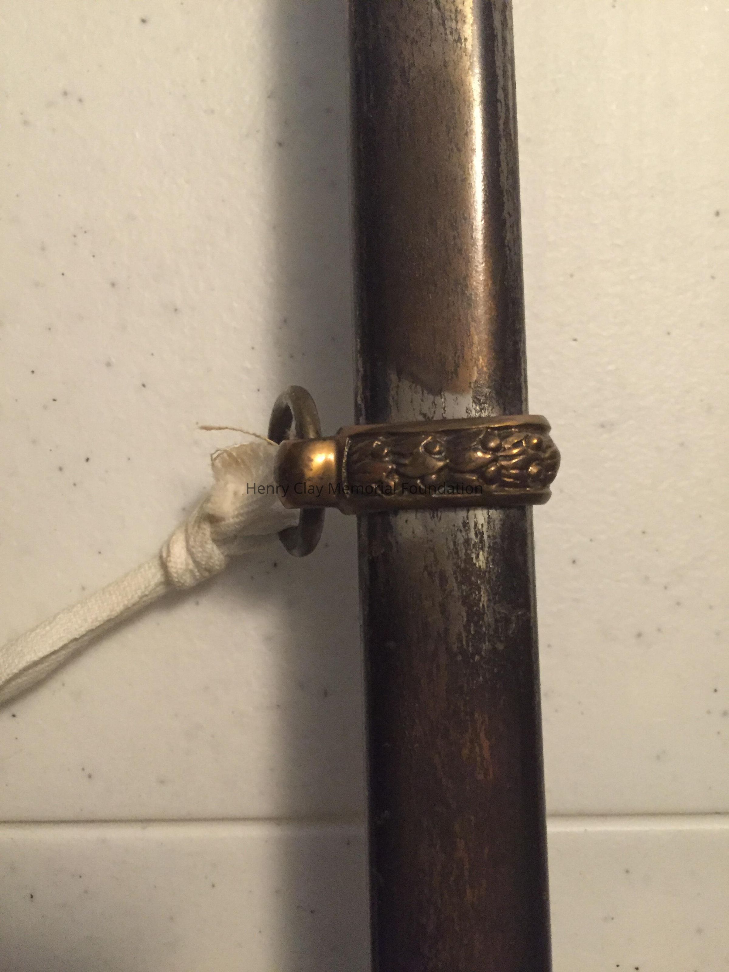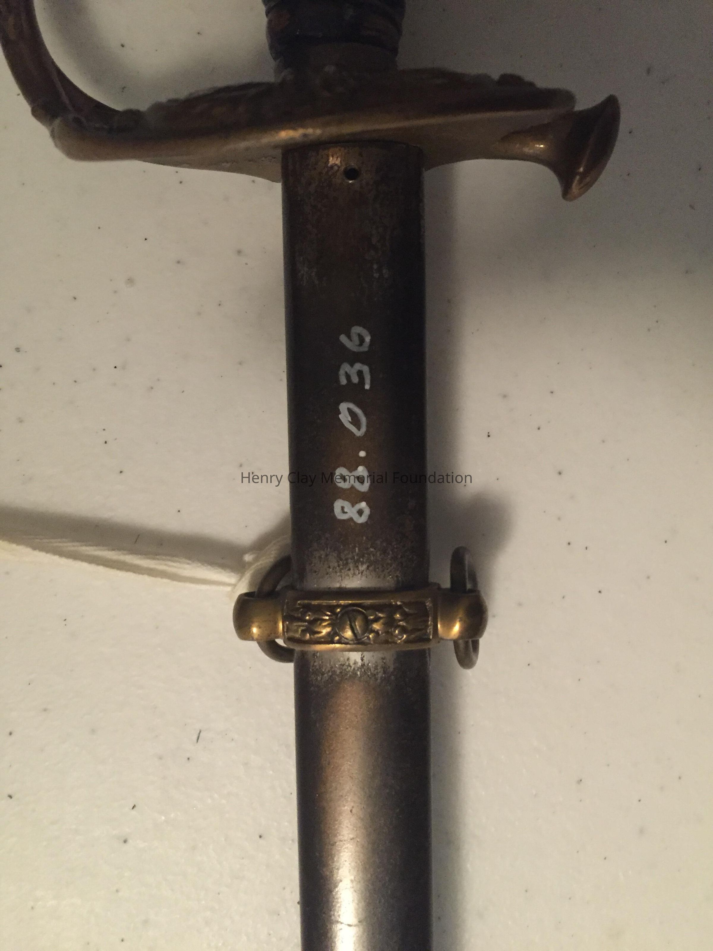 Thin straight blade etched with designs. Bronze hilt has eagle on the guard. Leather handle wrapped with wire. Nickel-plated scabbard has bronze bands with loops, a bronze tip and is inscribed on one side, "R.D. Williams / Adjutant 2nd Reg." Plate on scabbard is badly worn to reveal base metal beneath.Dimensions