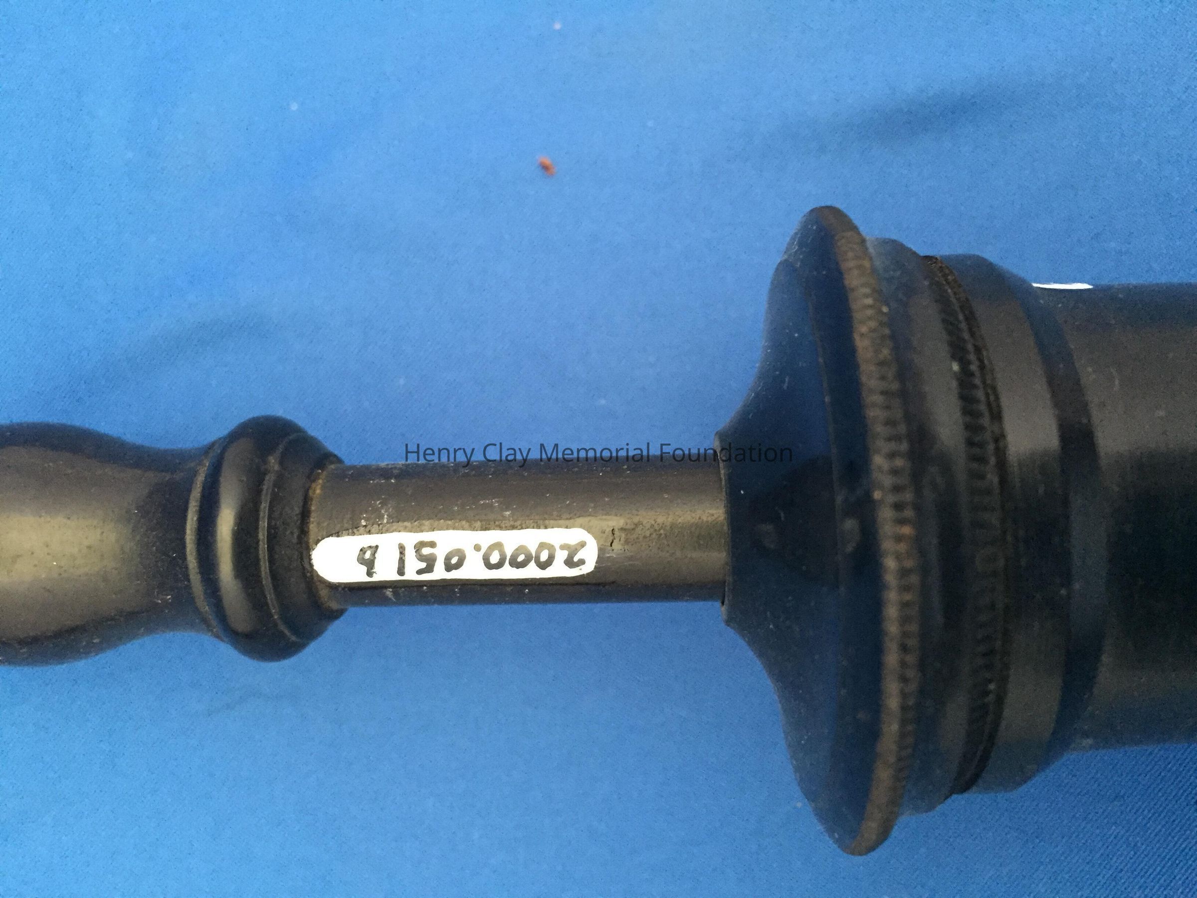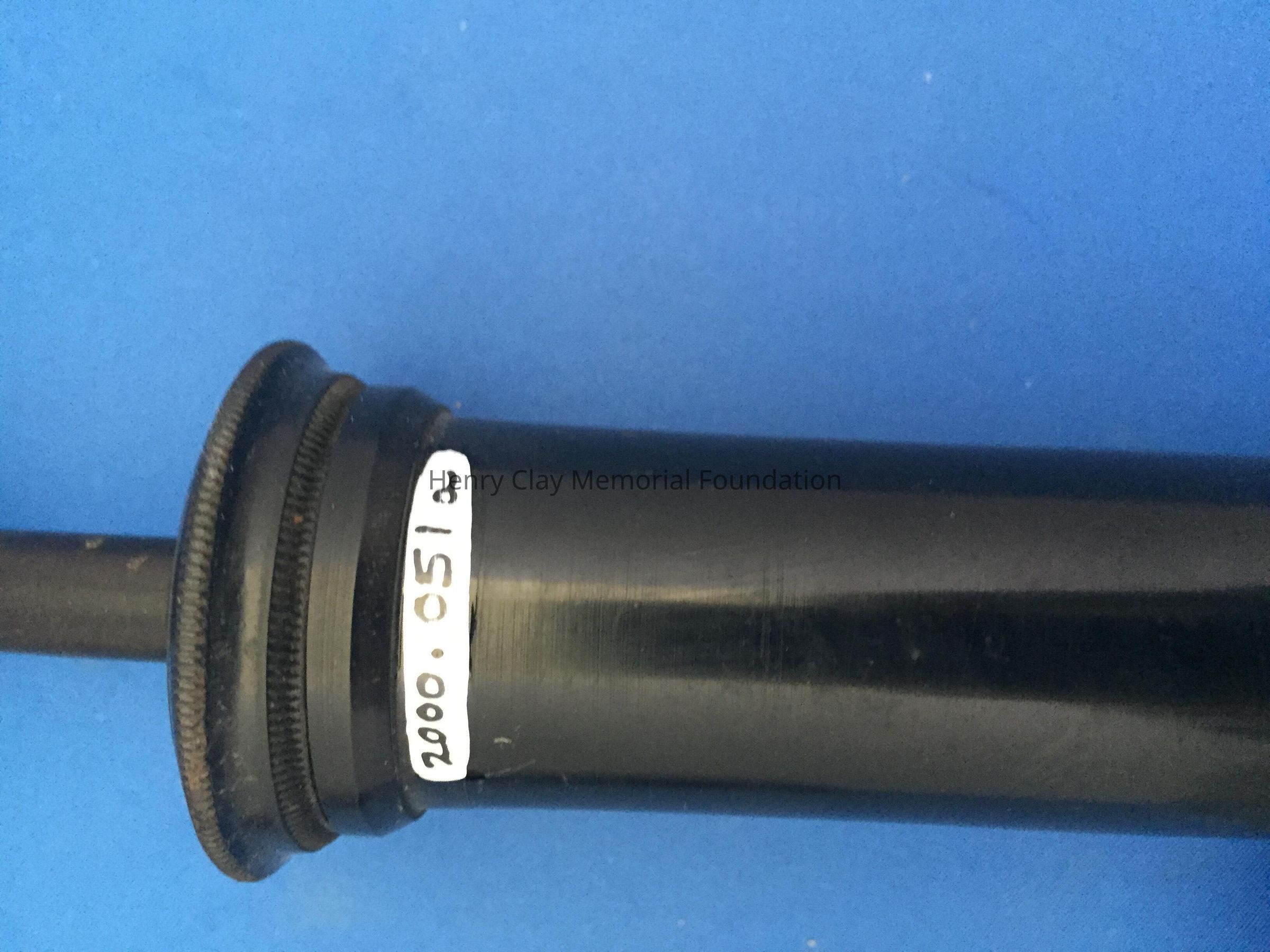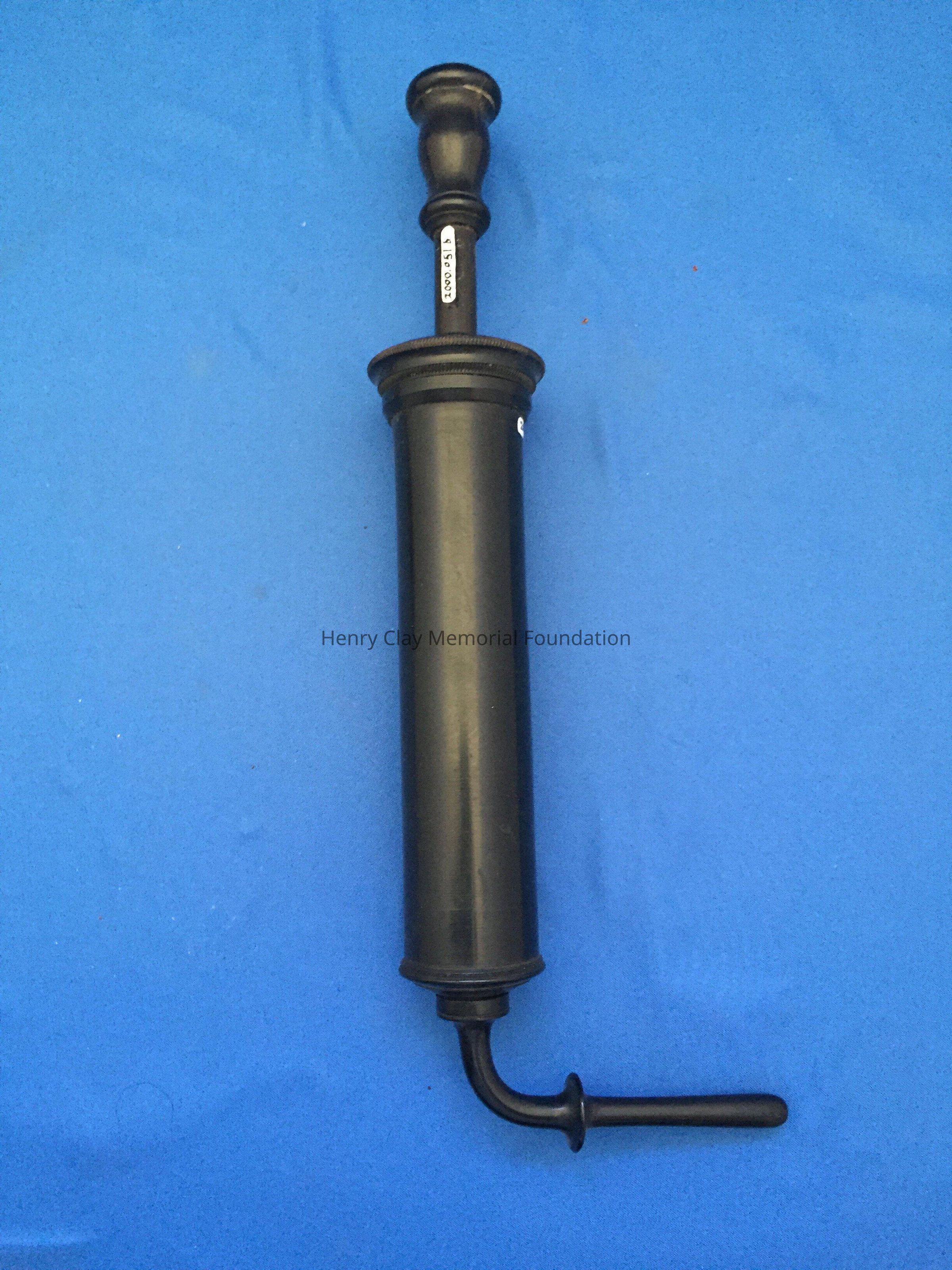 Black plastic cylinder. Probe-like nozzle at one end, and a pump handle at the other end. One end of cylinder unscrews. Nozzle is bent 90 degrees from cylinder.There is a stamp mark near top of cylinder reading: "Goodyears Patent May 5 1851."