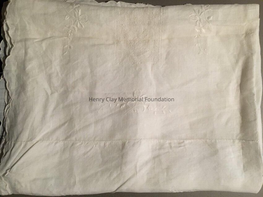 A medium size white cotton tablecloth. Very light with floral raised hand sewn design throughout. Borders are waved.