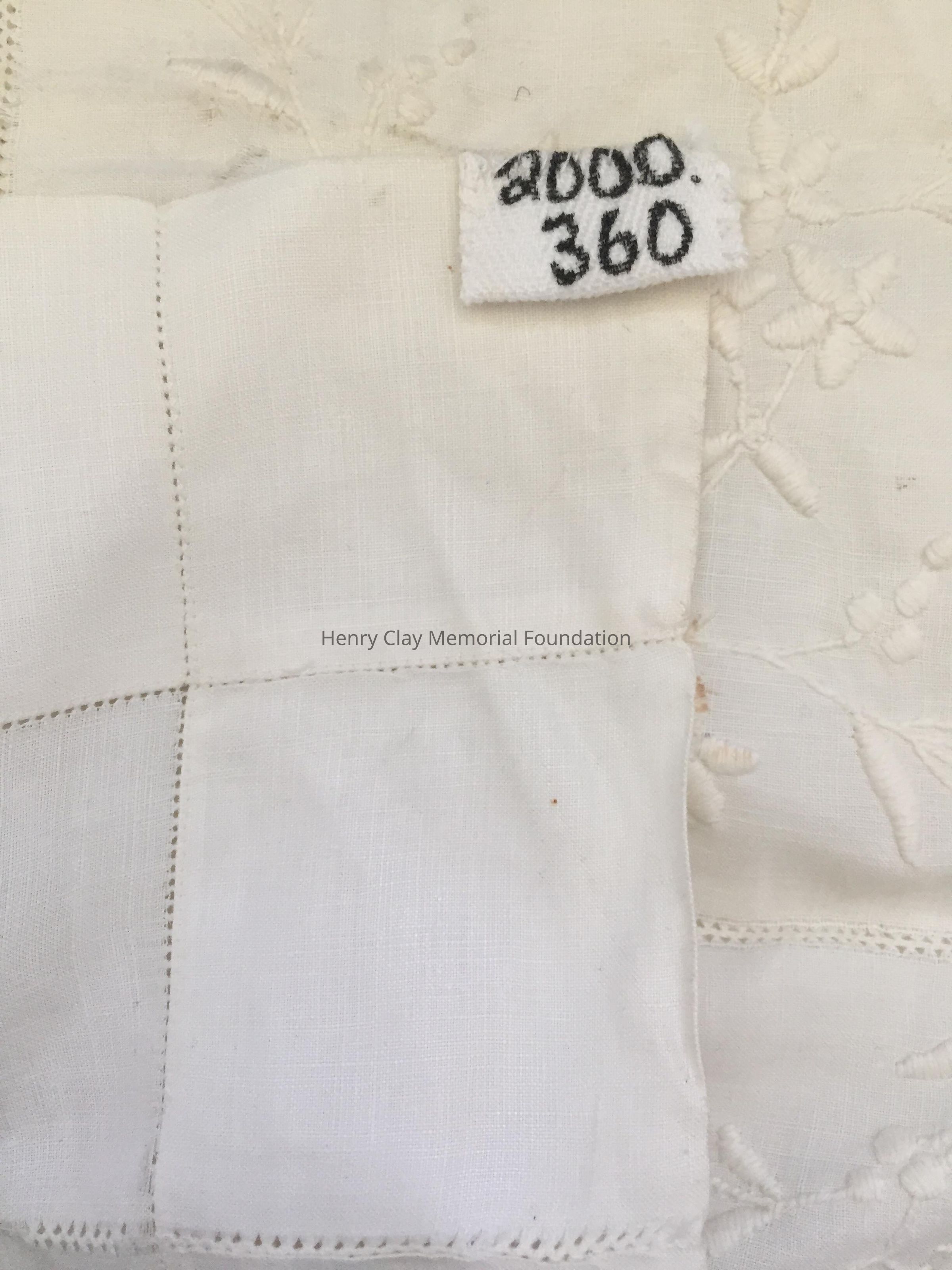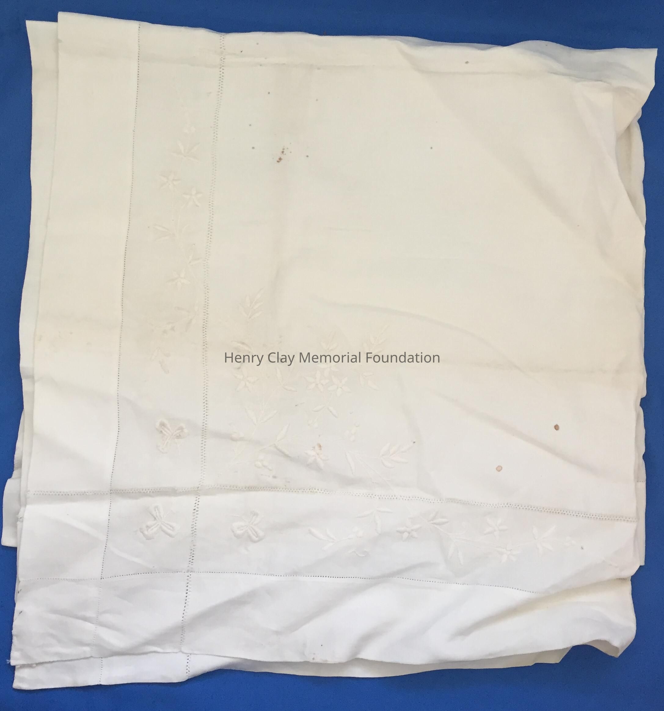 Square, off-white linen tablecloth. It has a thick double edge with faggotting (open work stitch) outling the edge. Same stitching outlining second indented edge. Around ths edge and falling into the center square is embroidered flower design. All of these designs create a frame around a plain center.
