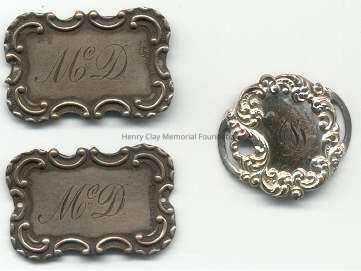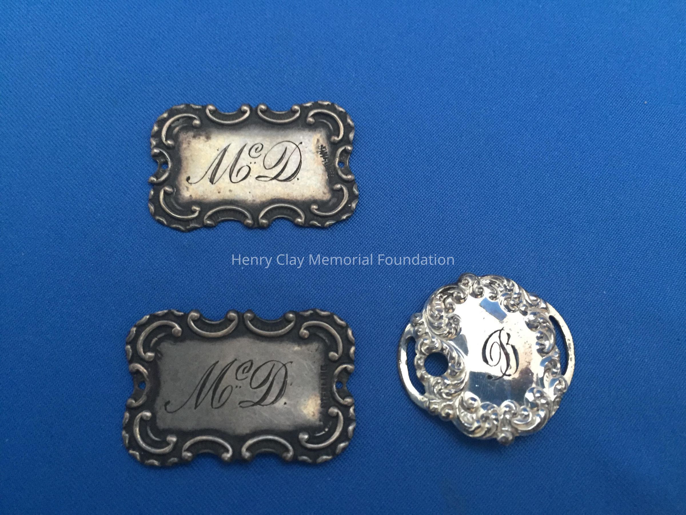 Three silver tags (for luggage, canes?). A & B are identical: rectangular with "McD" and C is round, convex, with initial "B" in center.Dimensions