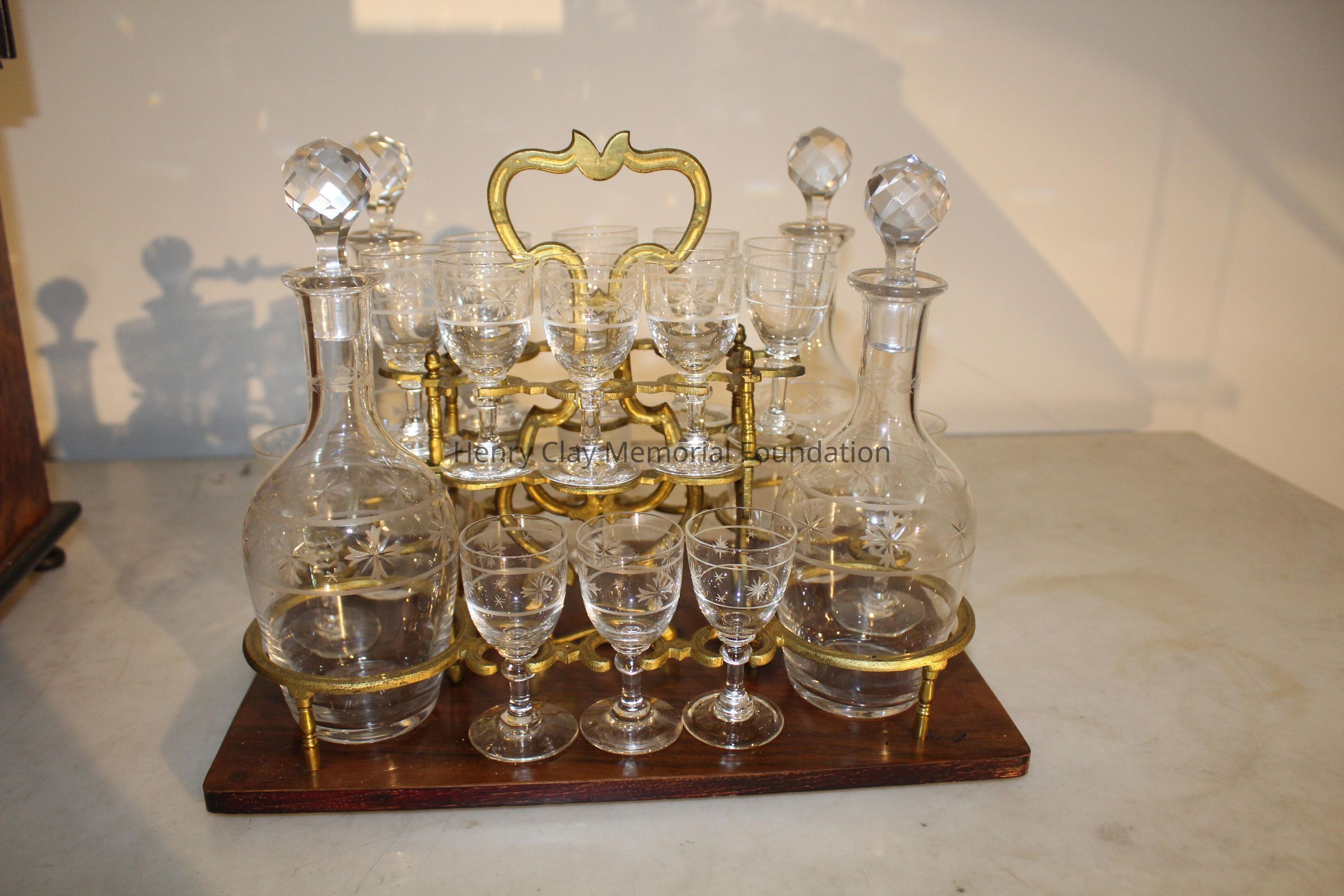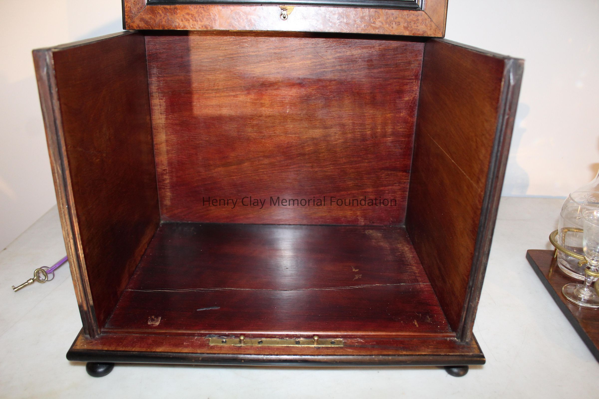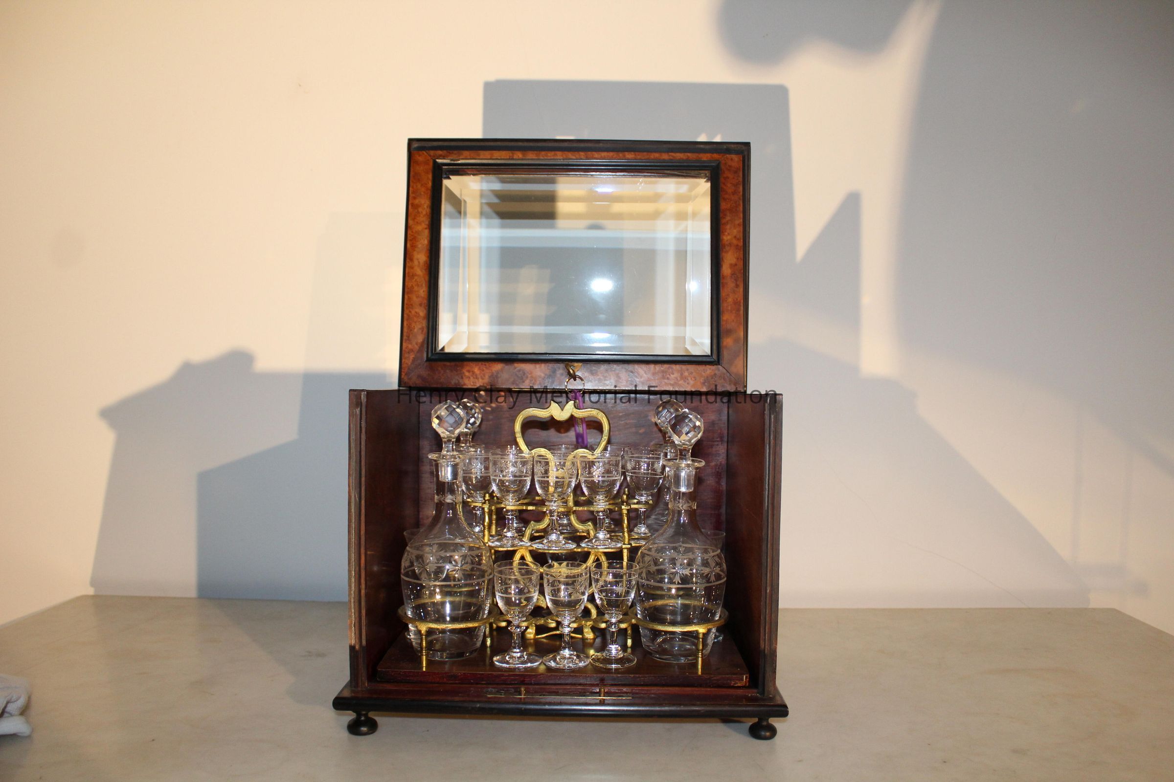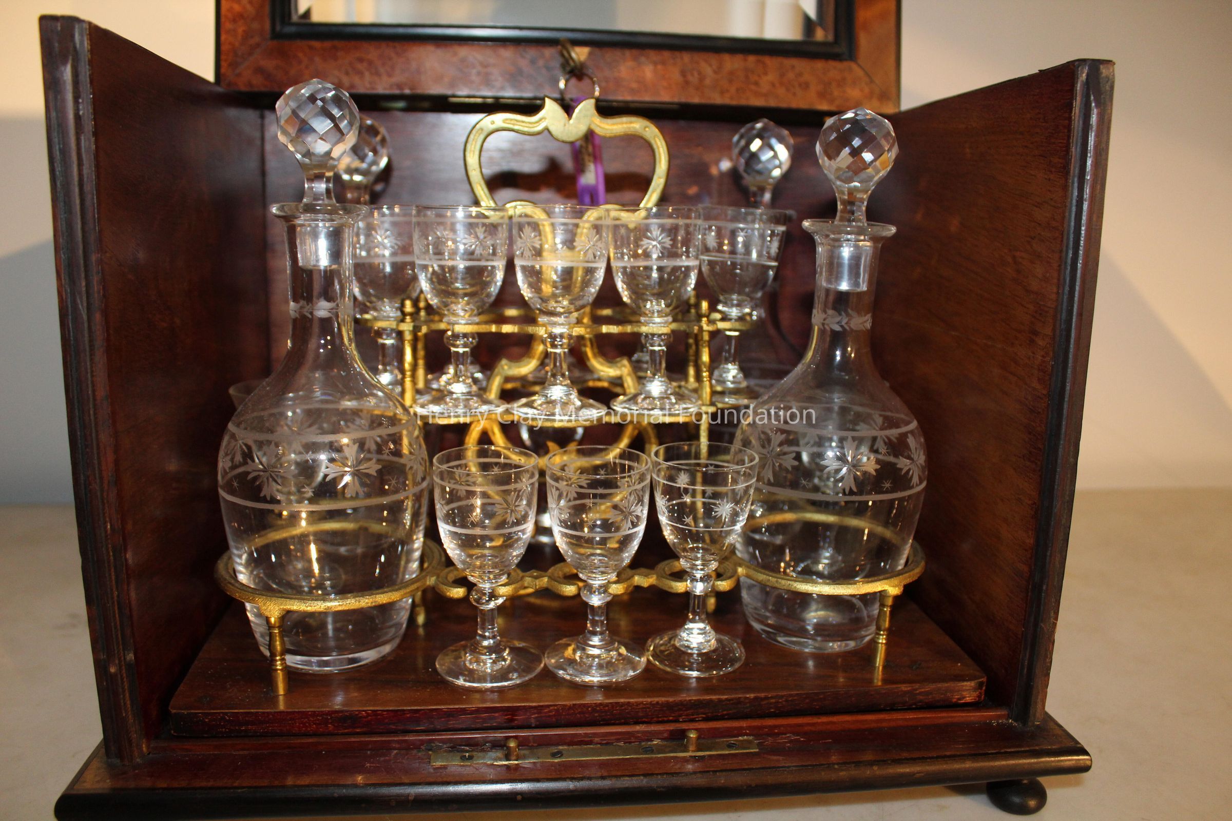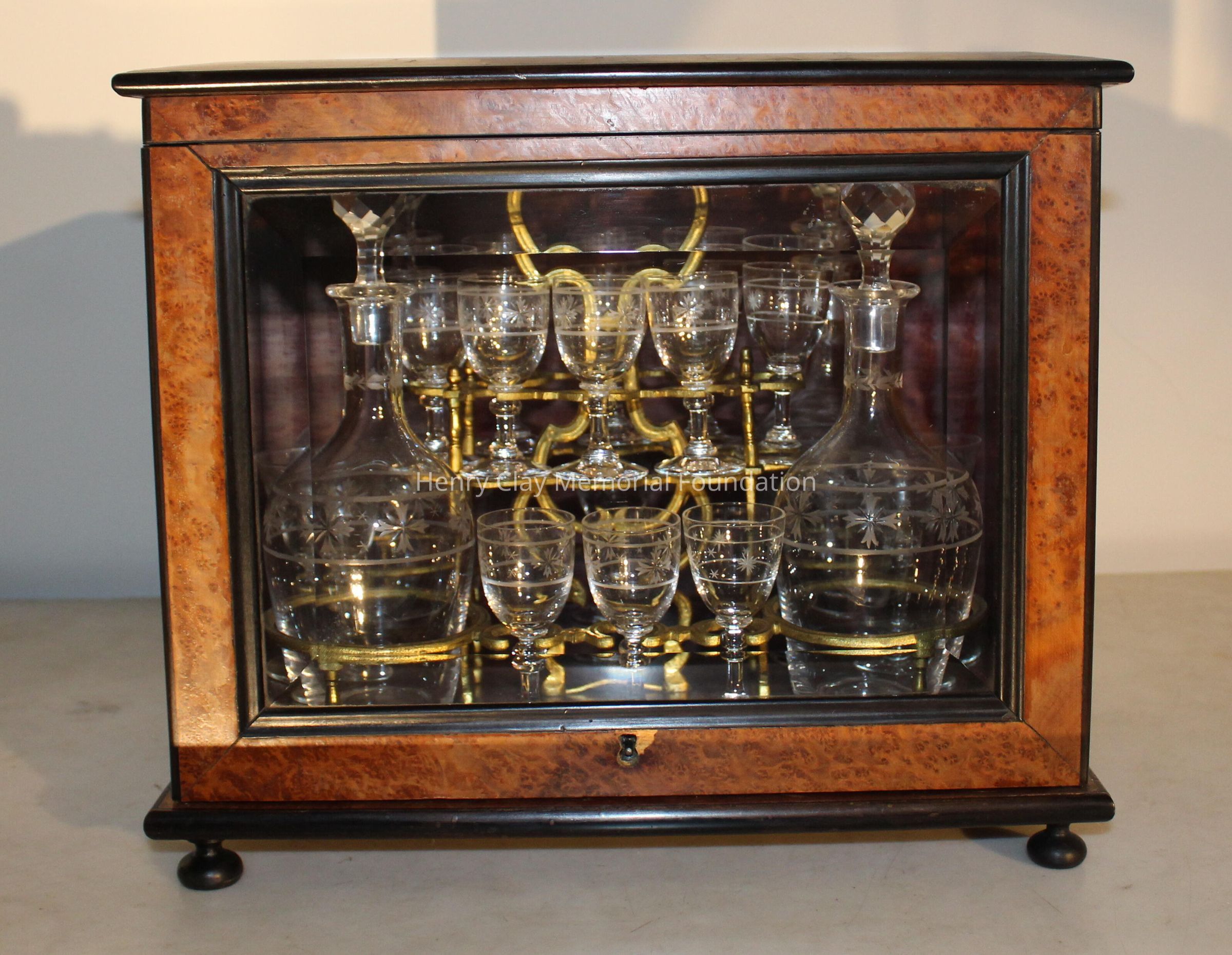 Traveling liqueur set. The set is housed in box with glass panels set into the top and front . The case is veneered in bird's eye maple and has a lock on the front center below the glass window. The box has four small round feet. Inside the case is tray that slides out and has a brass frame to hold the glassware. There are foiur crystal decanters with a cut band design with maltese crosses below the neck. Each decanter has a roud faceted stopper. There are 14 glasses. 12 are gut witht same maltese cross design as the decanters and 2 are slightly larger and have floral design.Dimensions