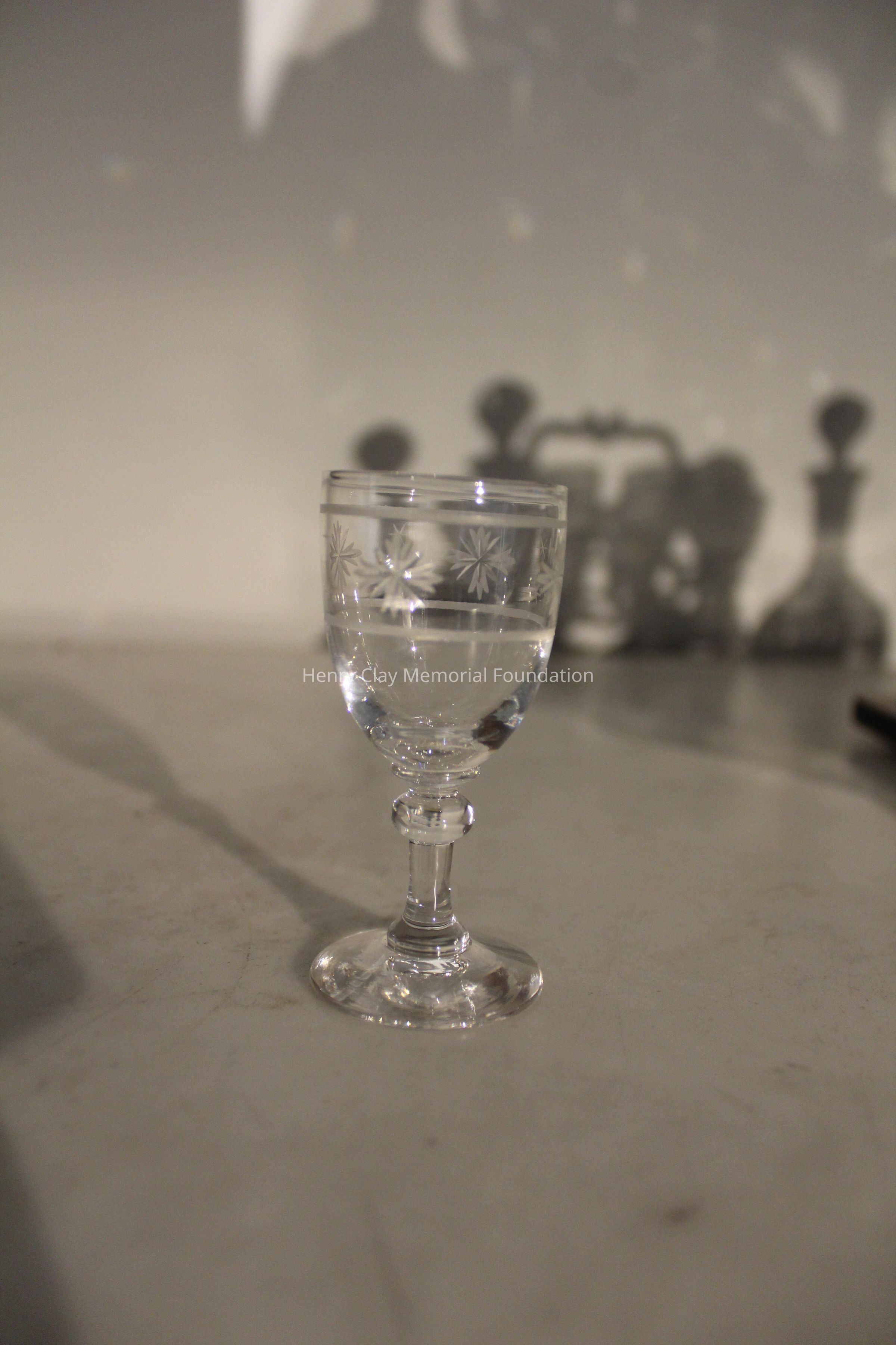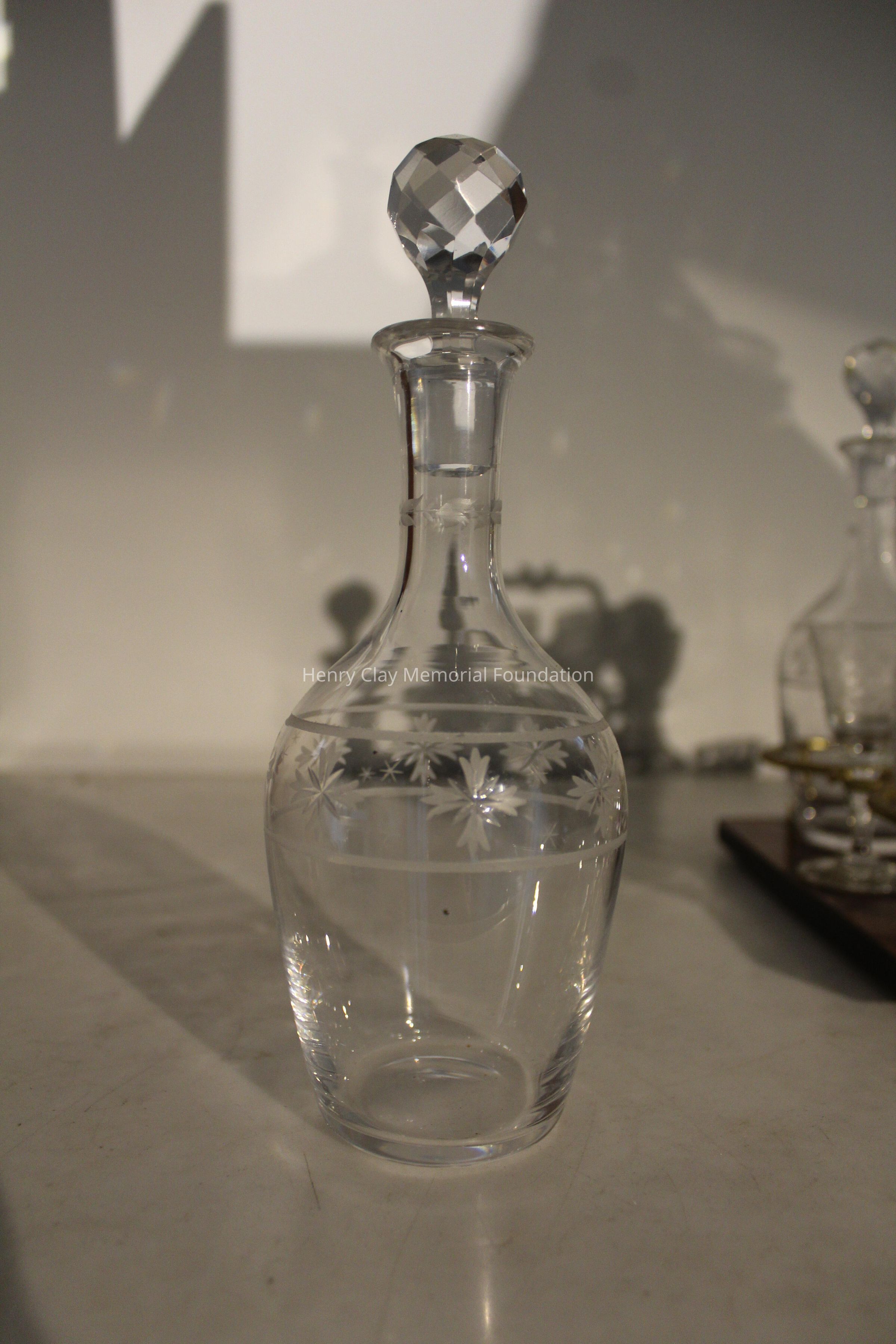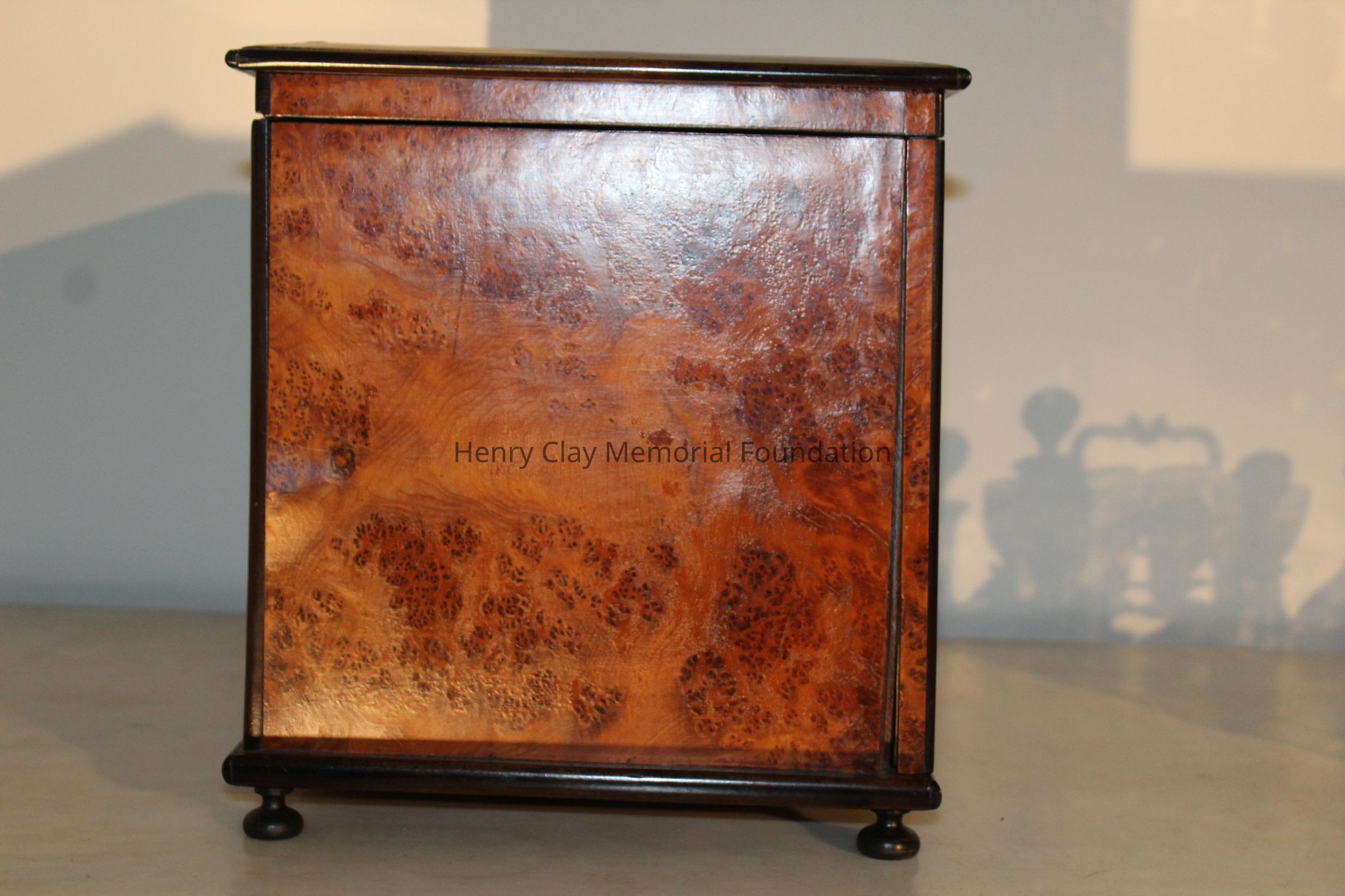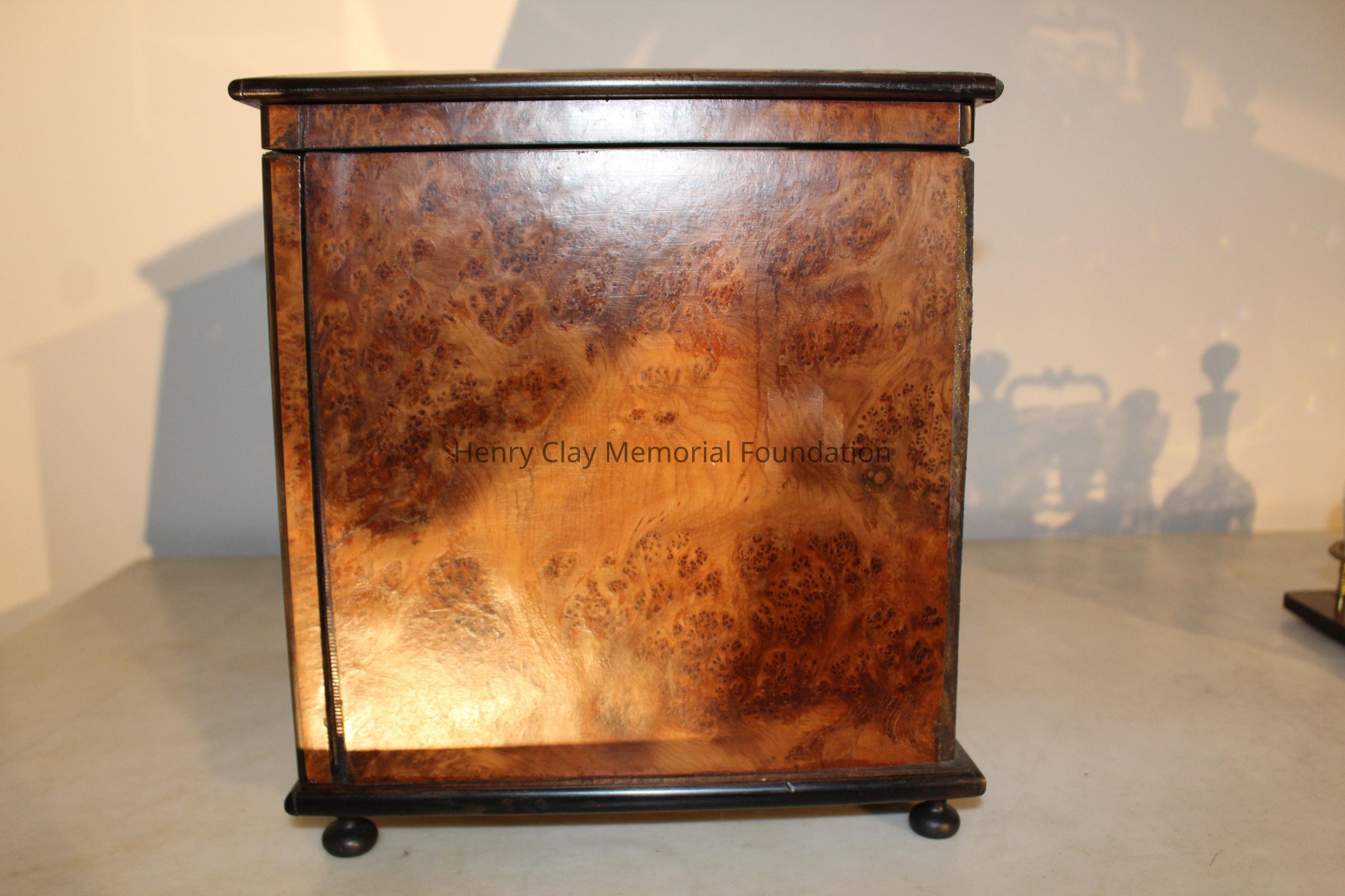 Traveling liqueur set. The set is housed in box with glass panels set into the top and front . The case is veneered in bird's eye maple and has a lock on the front center below the glass window. The box has four small round feet. Inside the case is tray that slides out and has a brass frame to hold the glassware. There are foiur crystal decanters with a cut band design with maltese crosses below the neck. Each decanter has a roud faceted stopper. There are 14 glasses. 12 are gut witht same maltese cross design as the decanters and 2 are slightly larger and have floral design.Dimensions