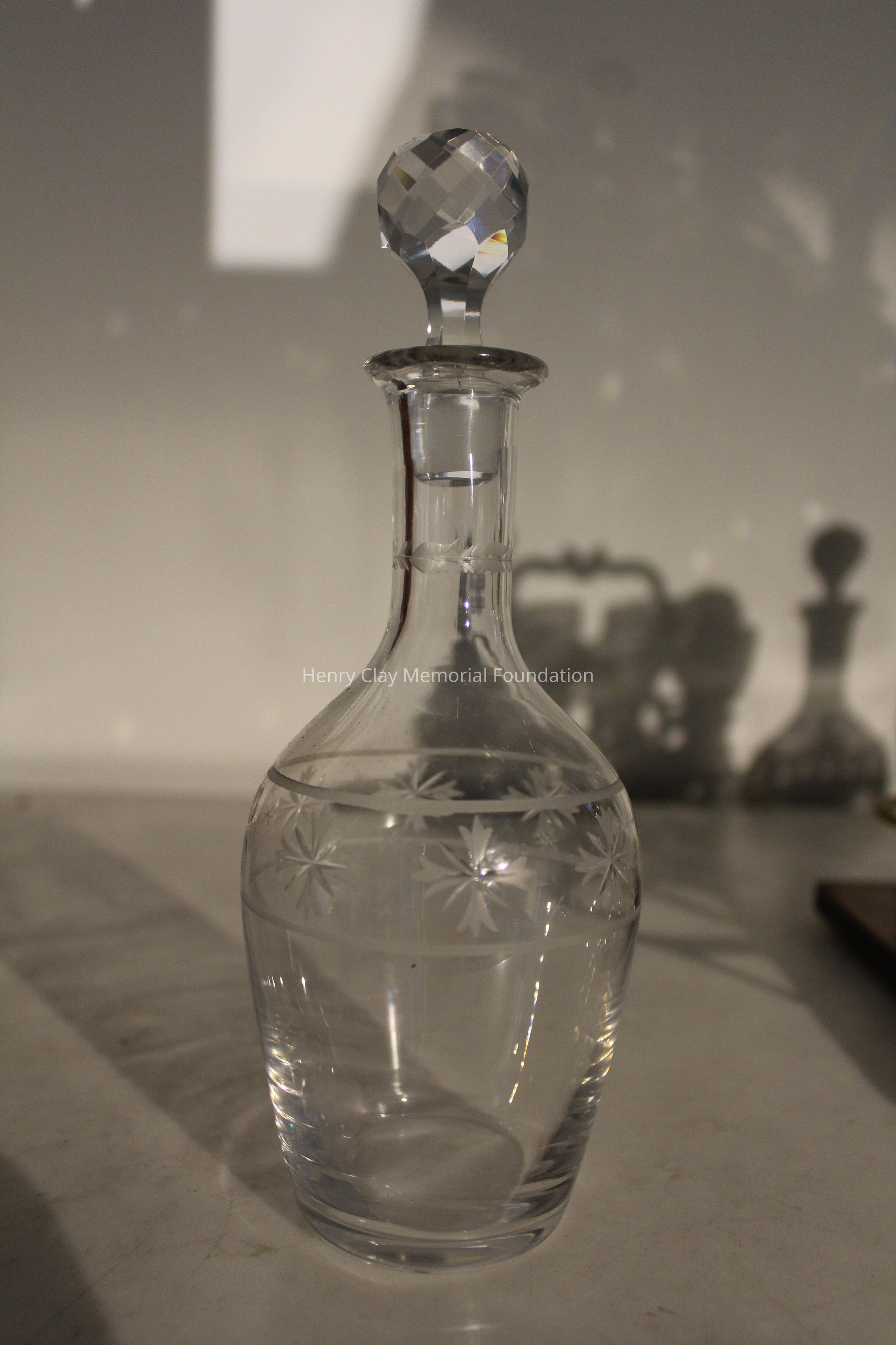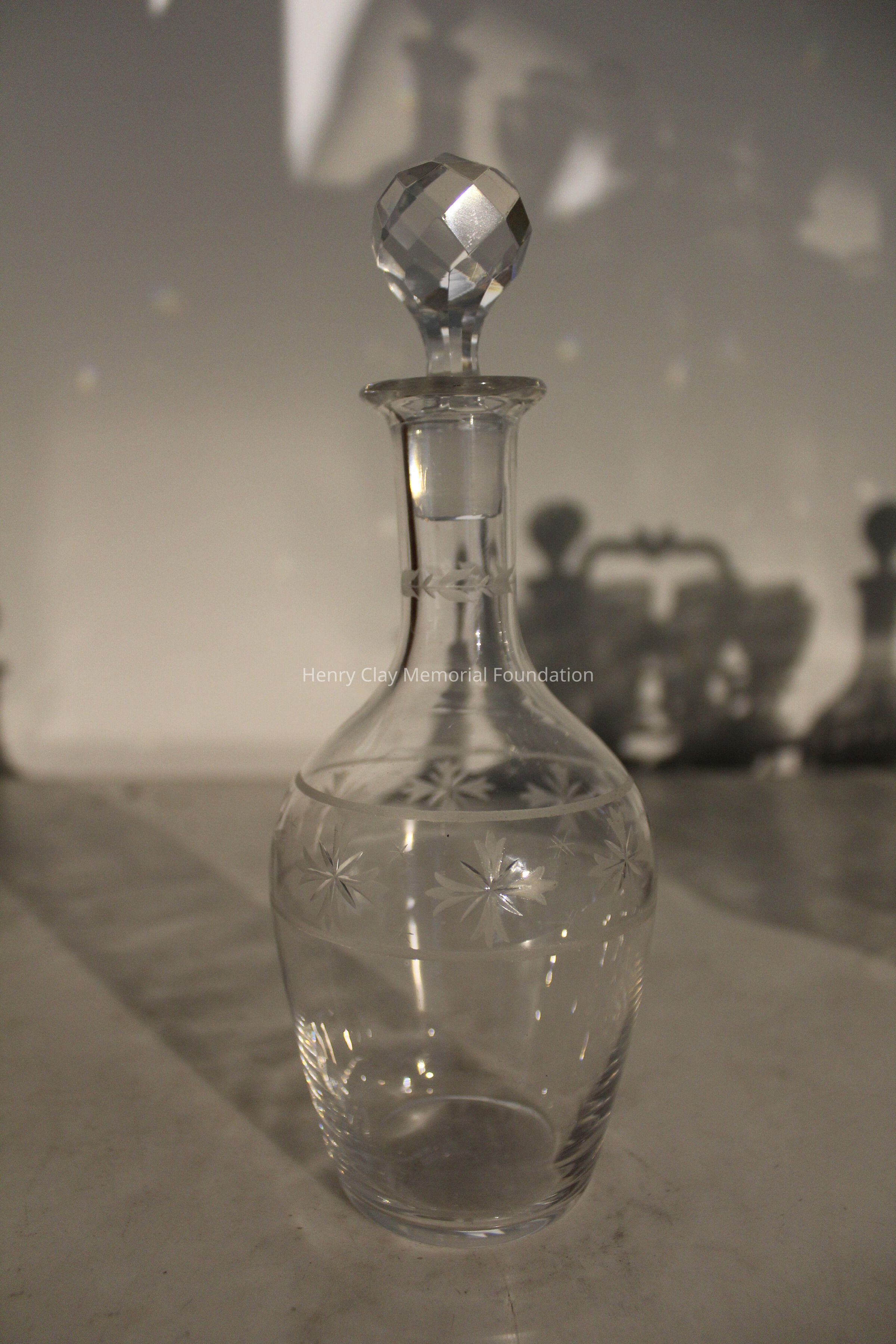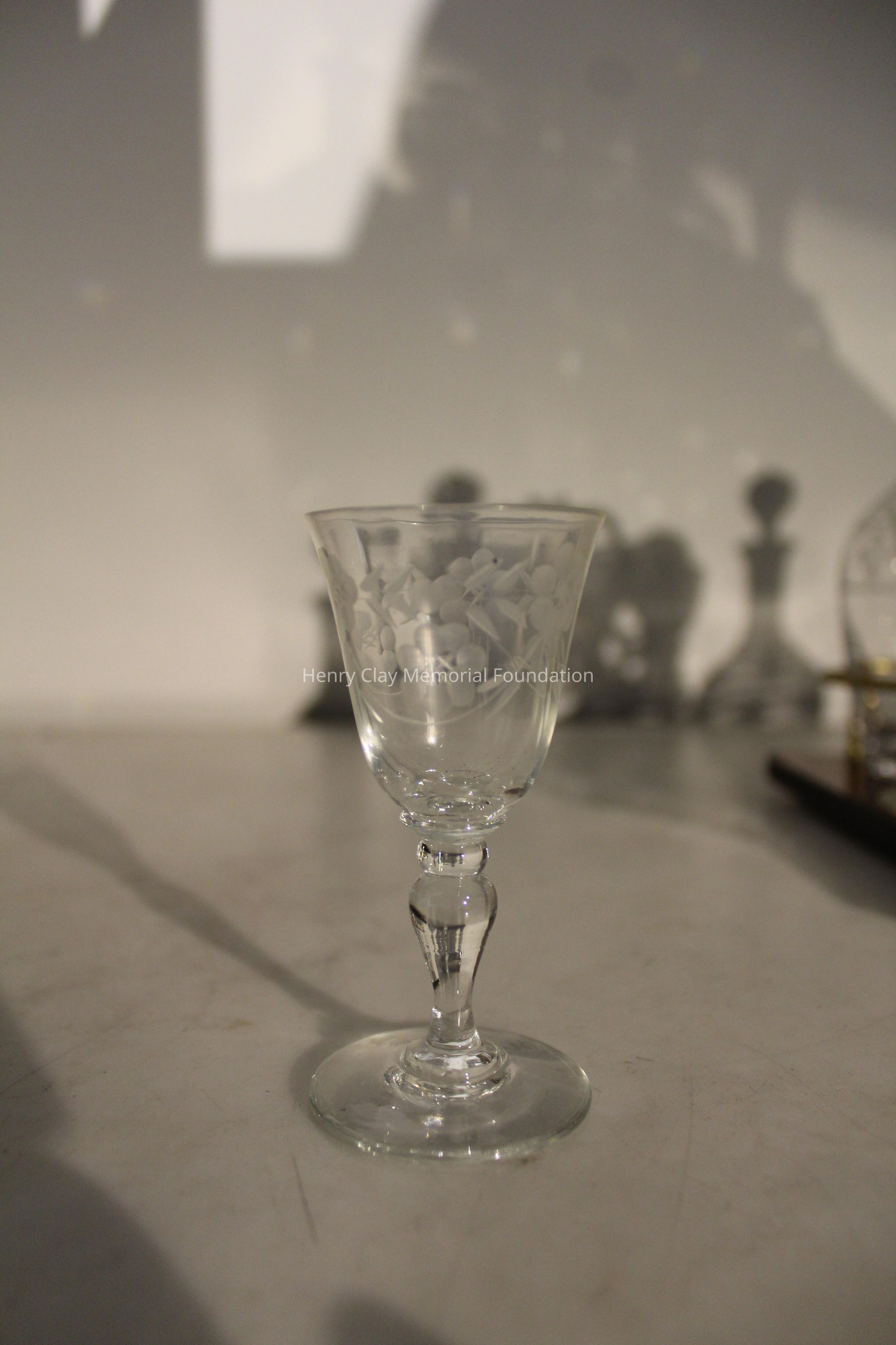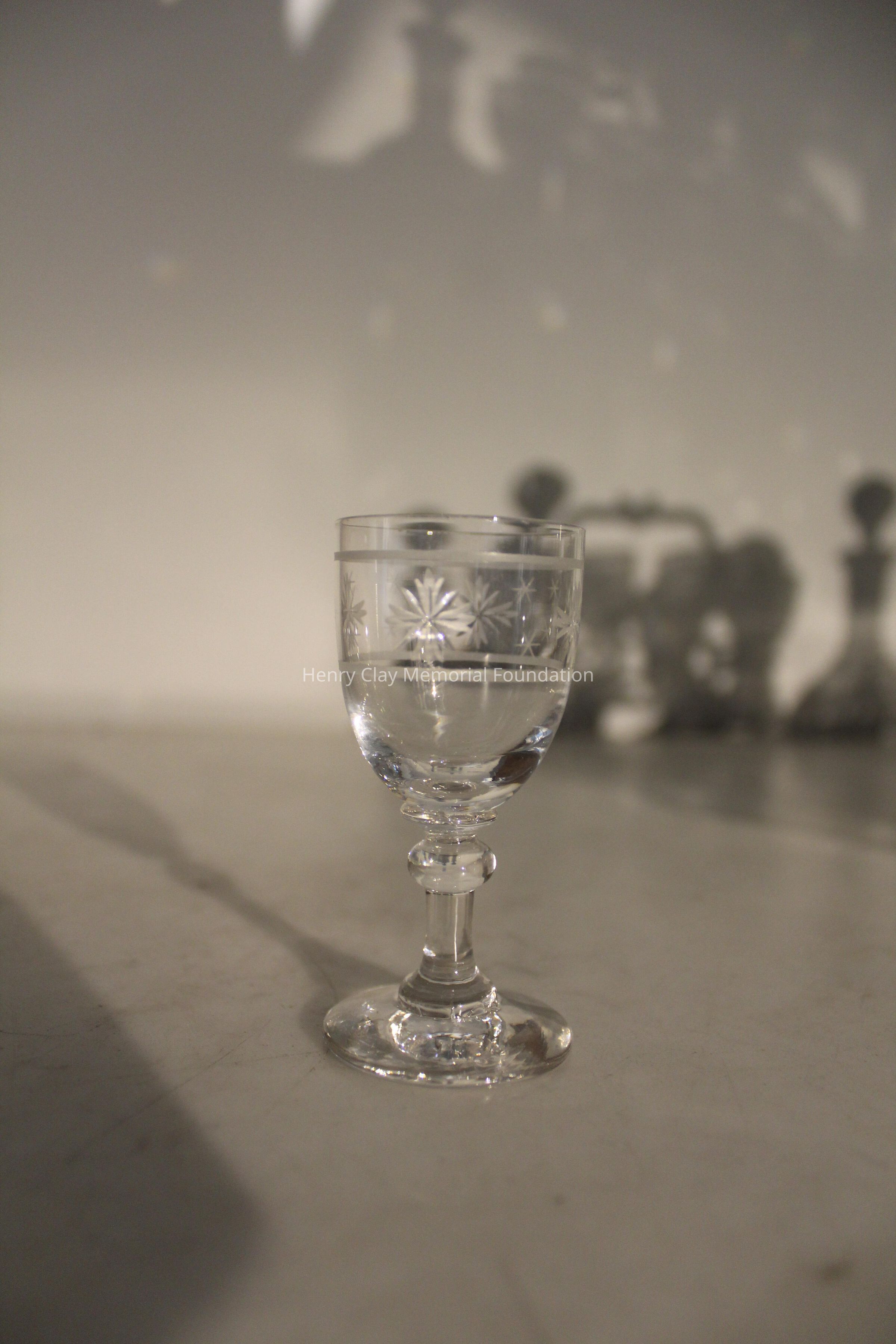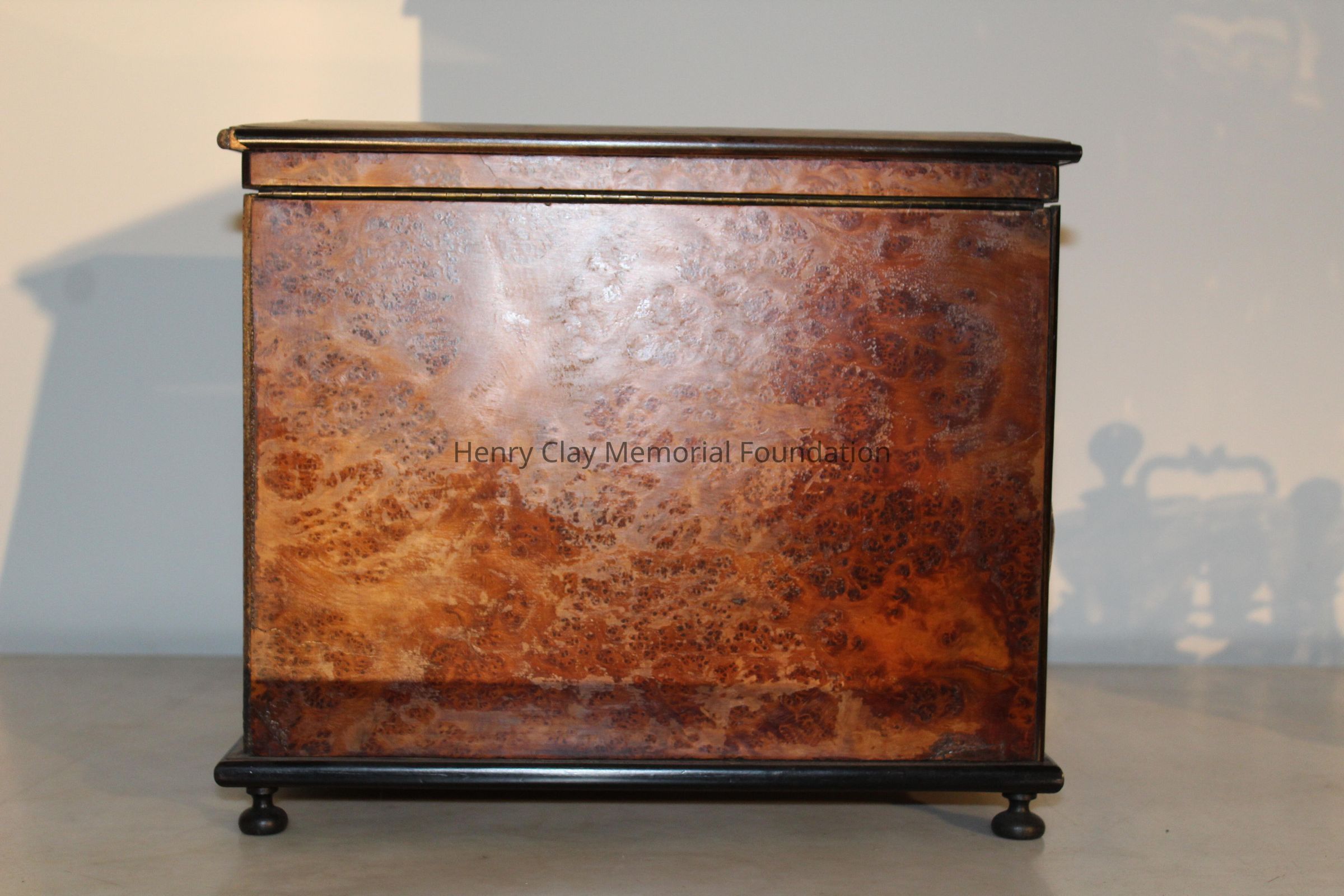 Traveling liqueur set. The set is housed in box with glass panels set into the top and front . The case is veneered in bird's eye maple and has a lock on the front center below the glass window. The box has four small round feet. Inside the case is tray that slides out and has a brass frame to hold the glassware. There are foiur crystal decanters with a cut band design with maltese crosses below the neck. Each decanter has a roud faceted stopper. There are 14 glasses. 12 are gut witht same maltese cross design as the decanters and 2 are slightly larger and have floral design.Dimensions