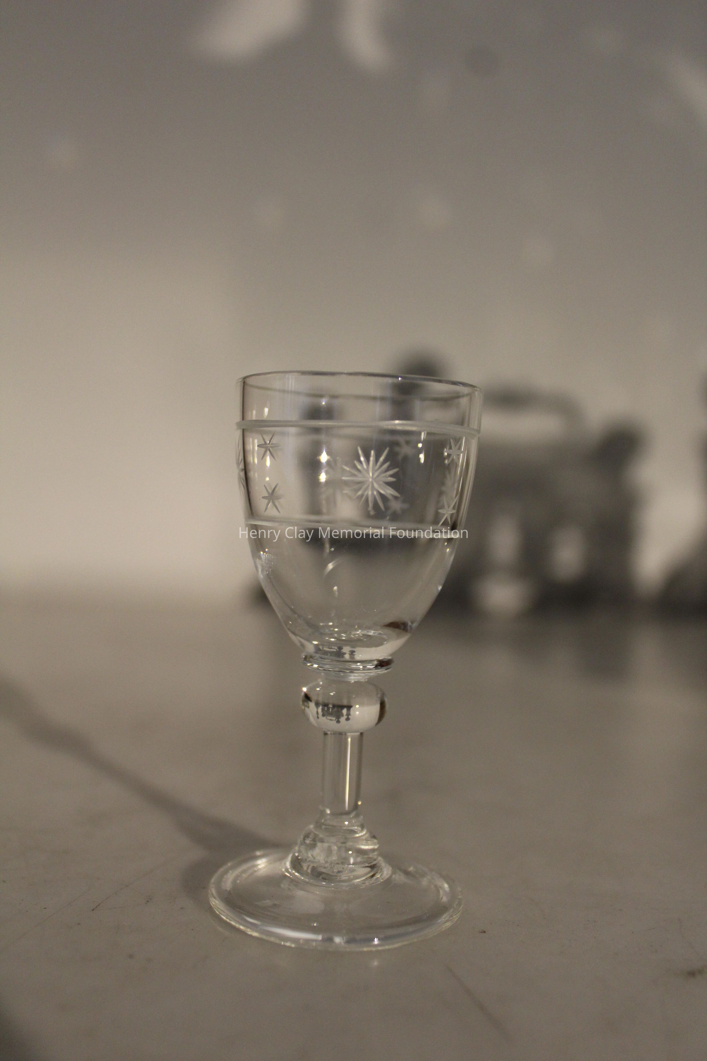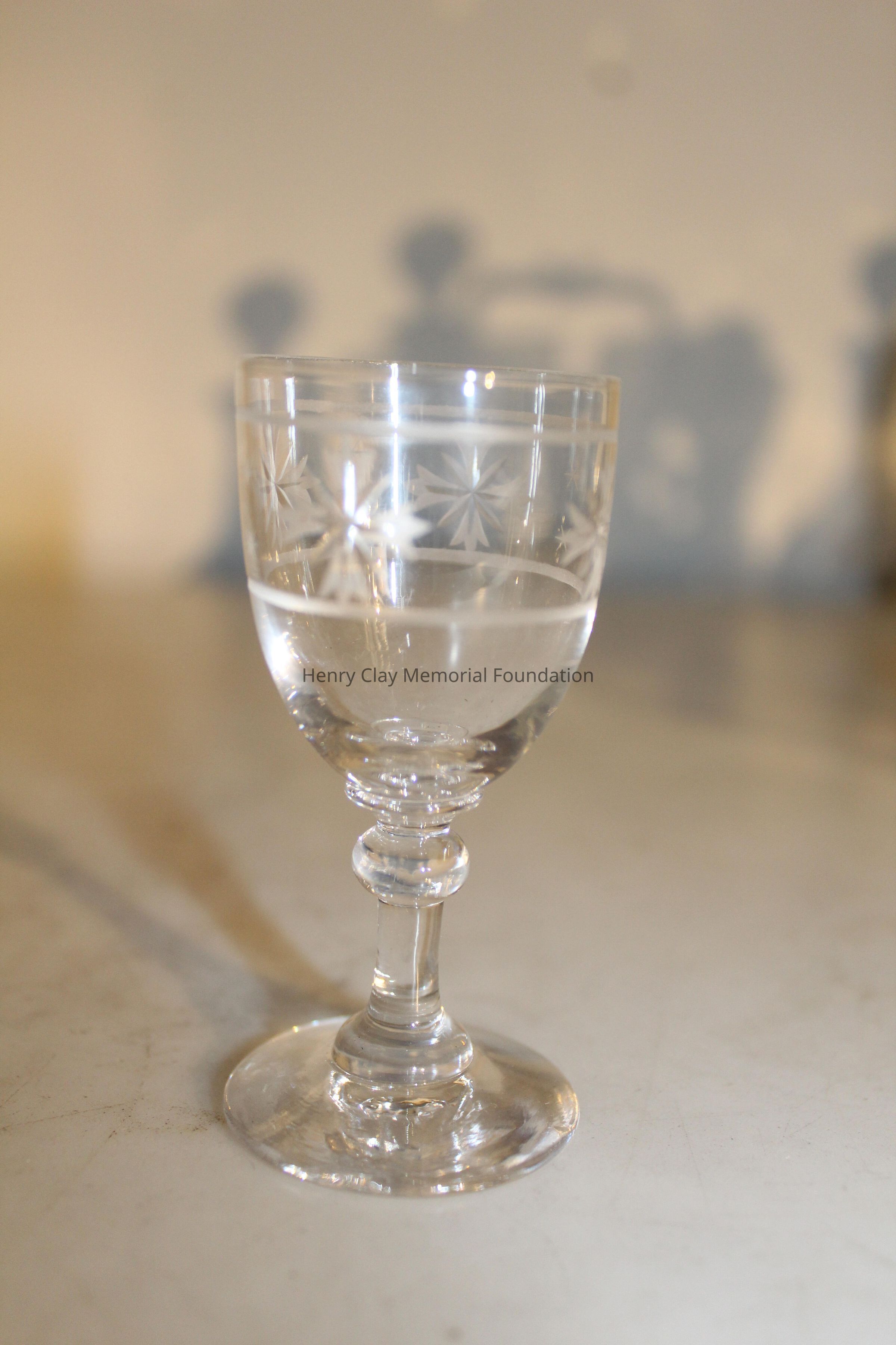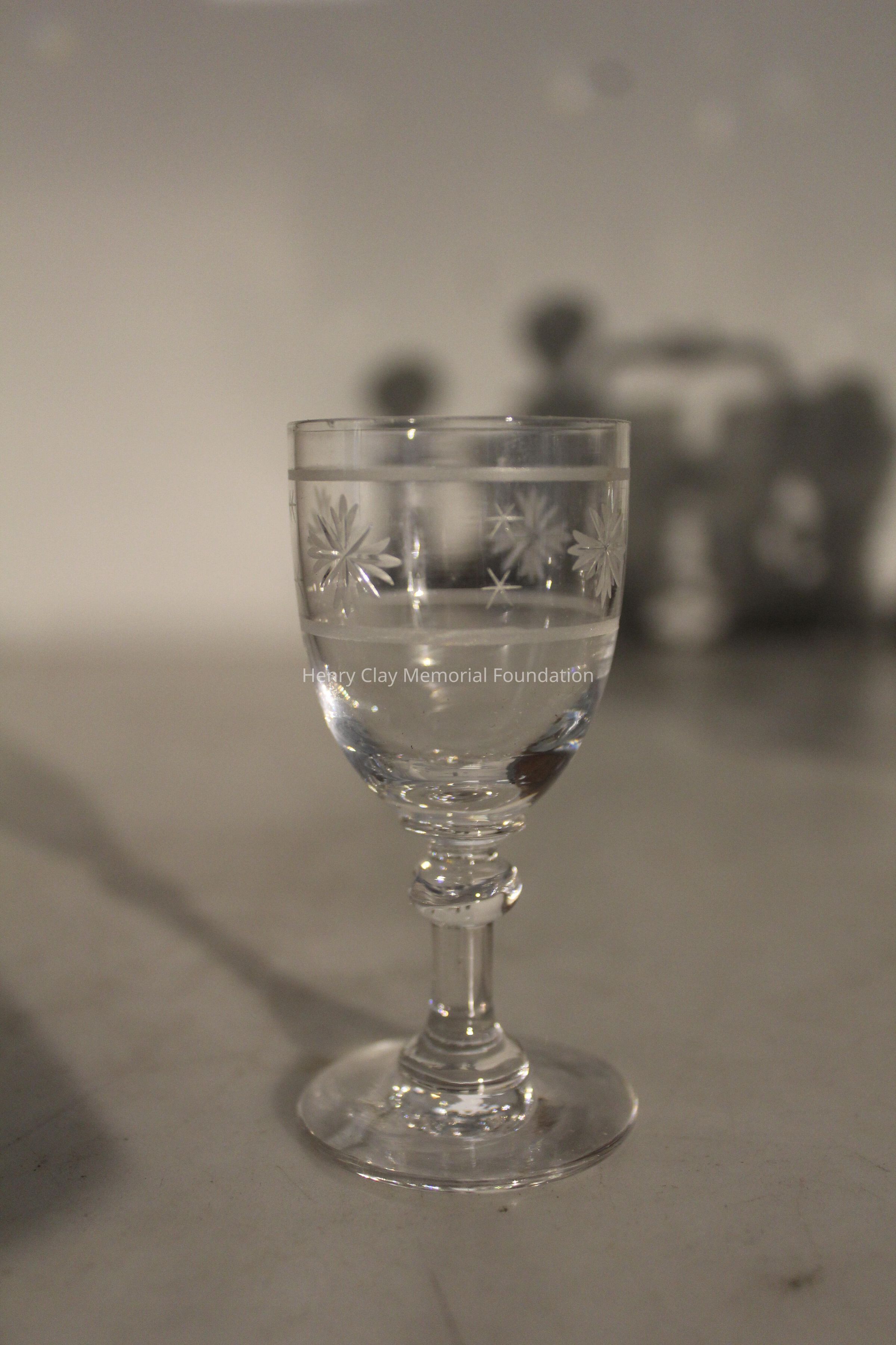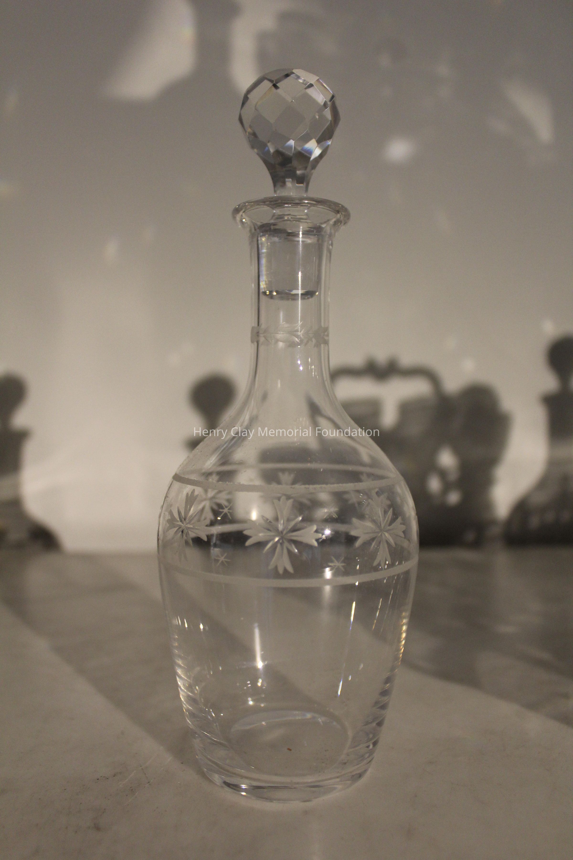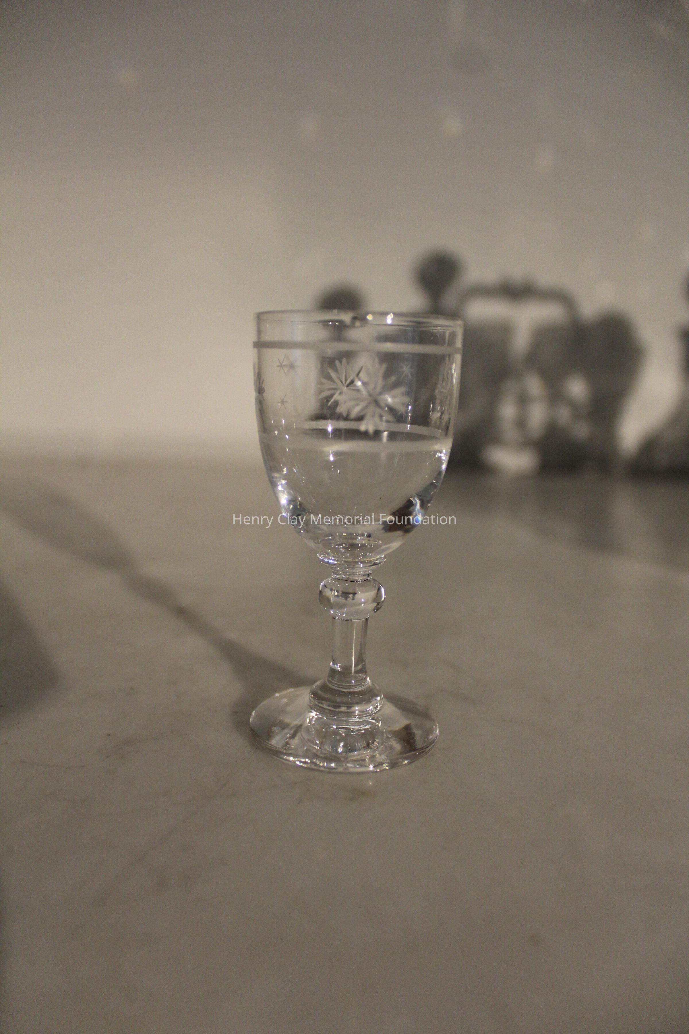 Traveling liqueur set. The set is housed in box with glass panels set into the top and front . The case is veneered in bird's eye maple and has a lock on the front center below the glass window. The box has four small round feet. Inside the case is tray that slides out and has a brass frame to hold the glassware. There are foiur crystal decanters with a cut band design with maltese crosses below the neck. Each decanter has a roud faceted stopper. There are 14 glasses. 12 are gut witht same maltese cross design as the decanters and 2 are slightly larger and have floral design.Dimensions
