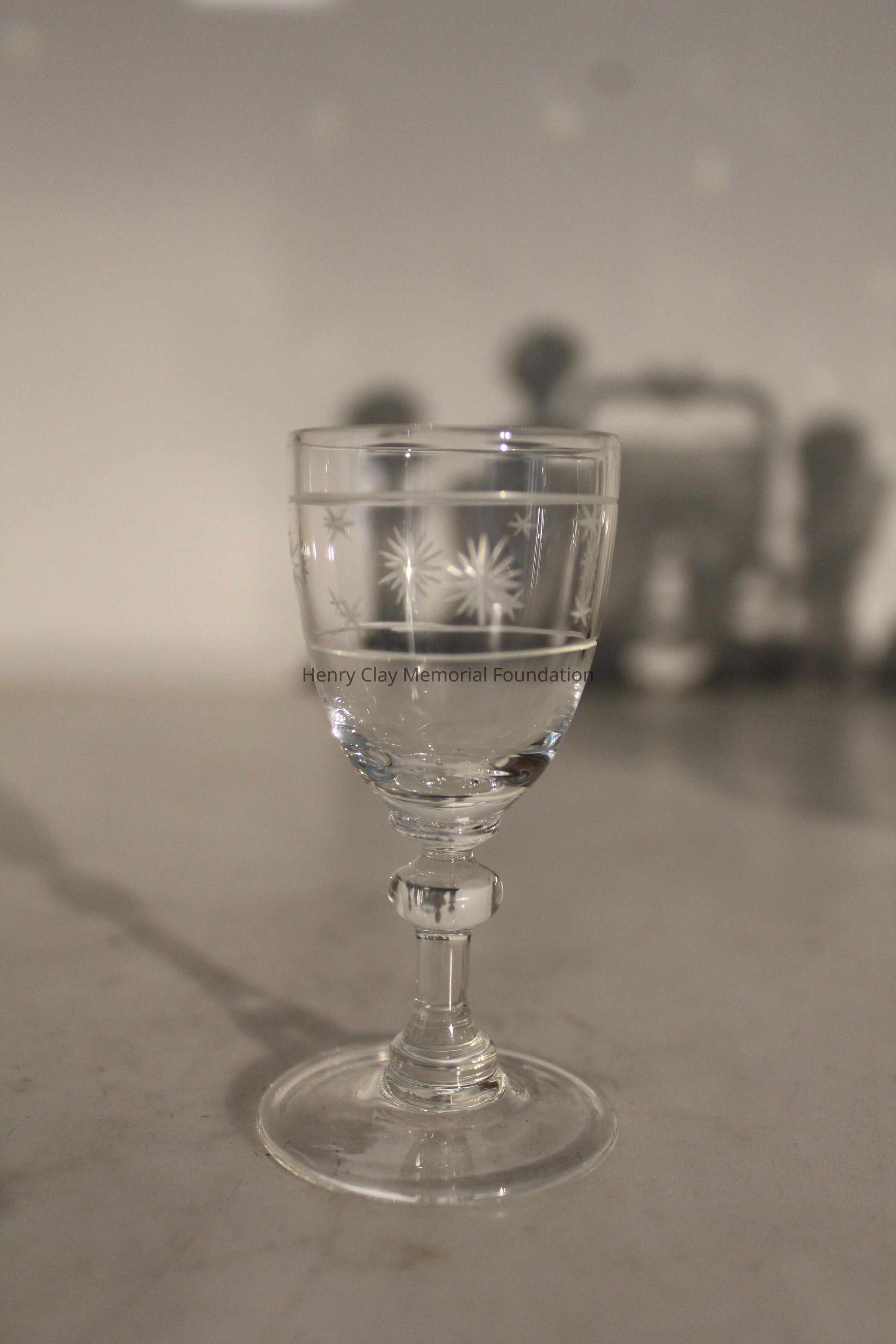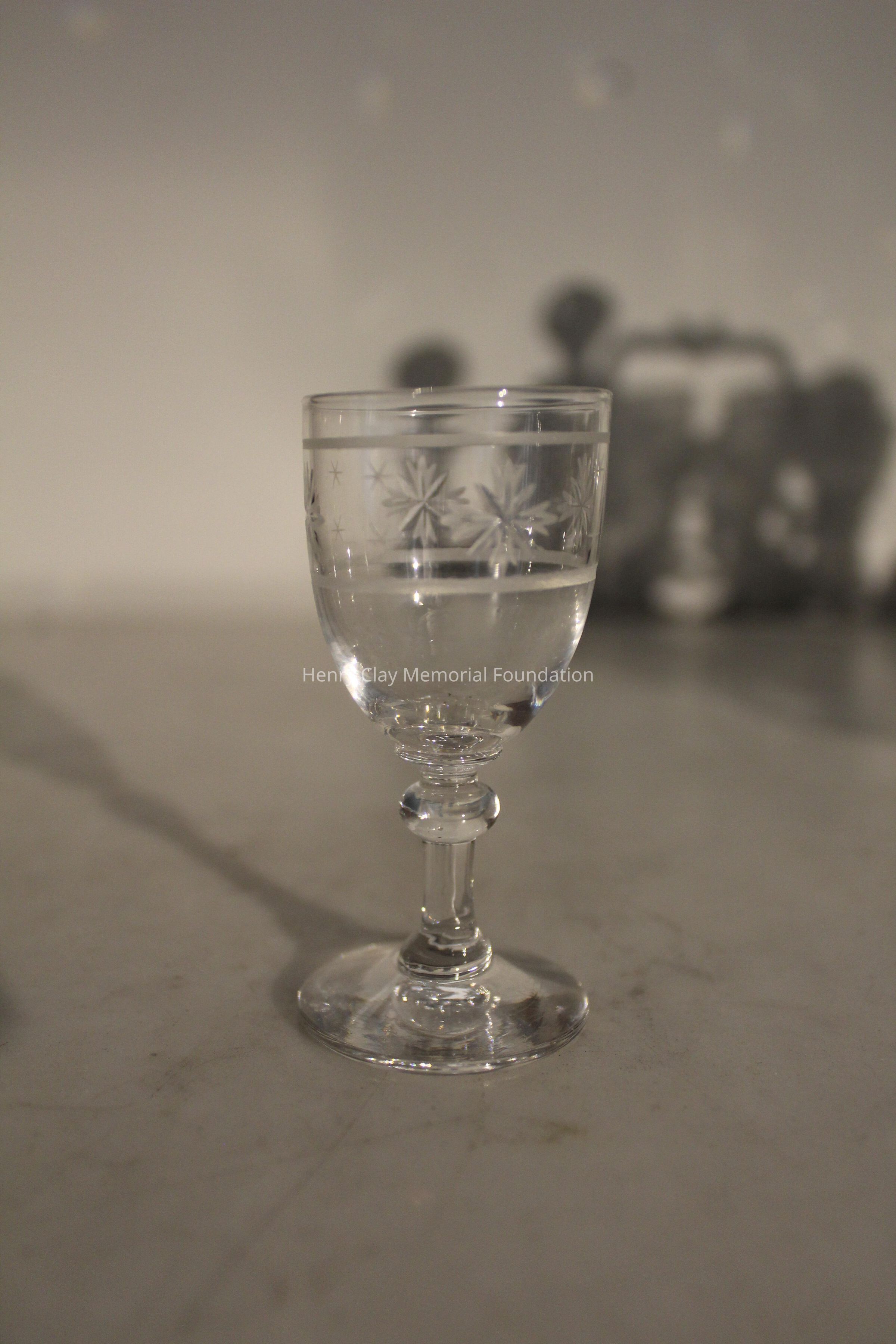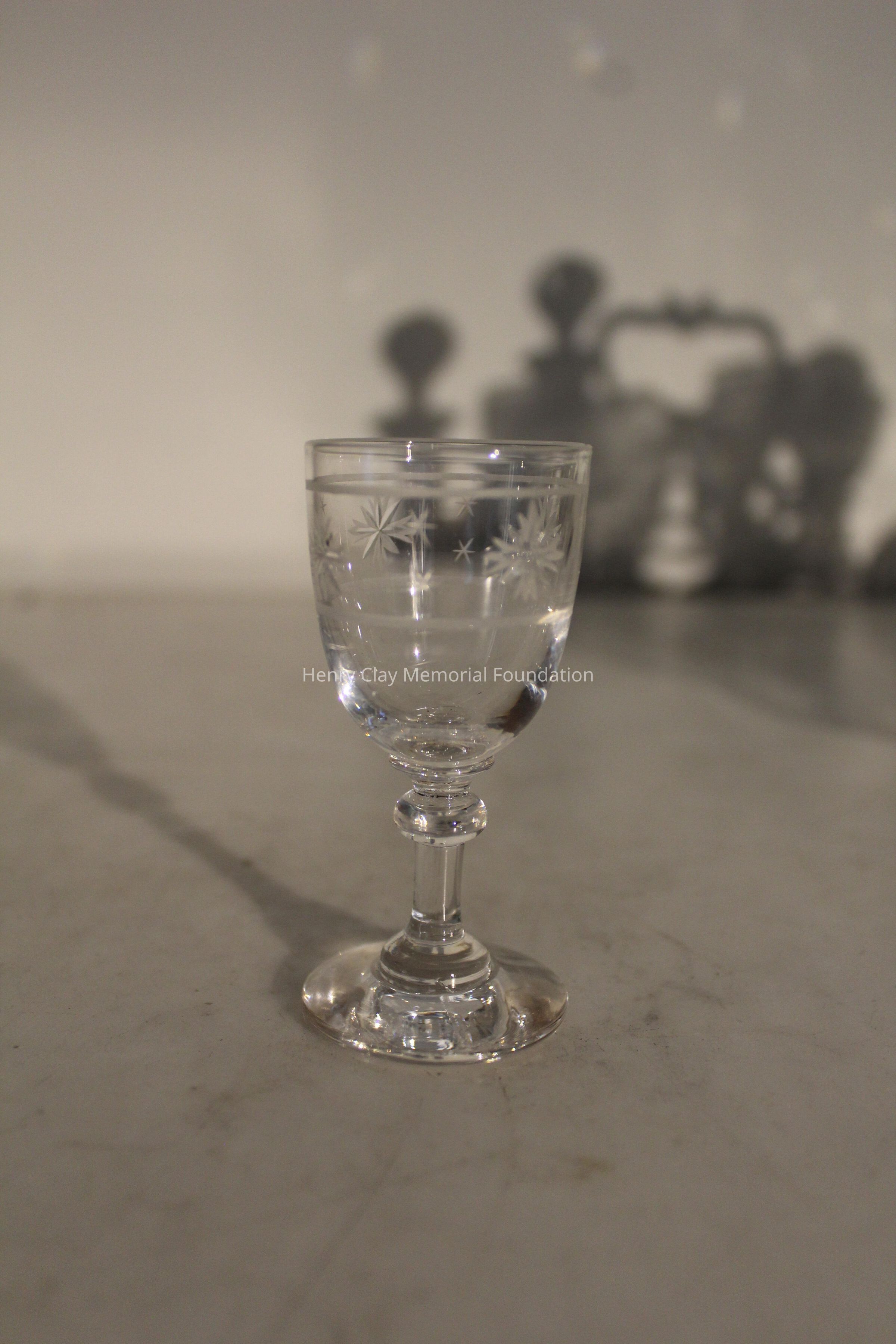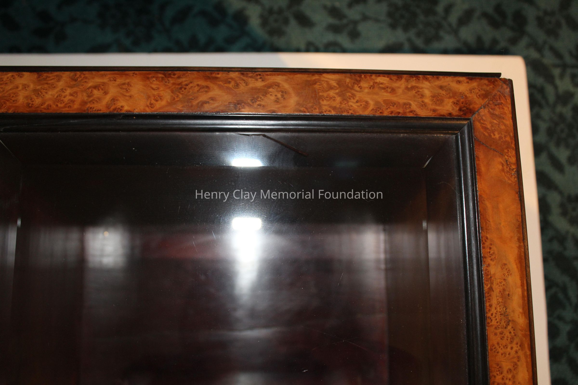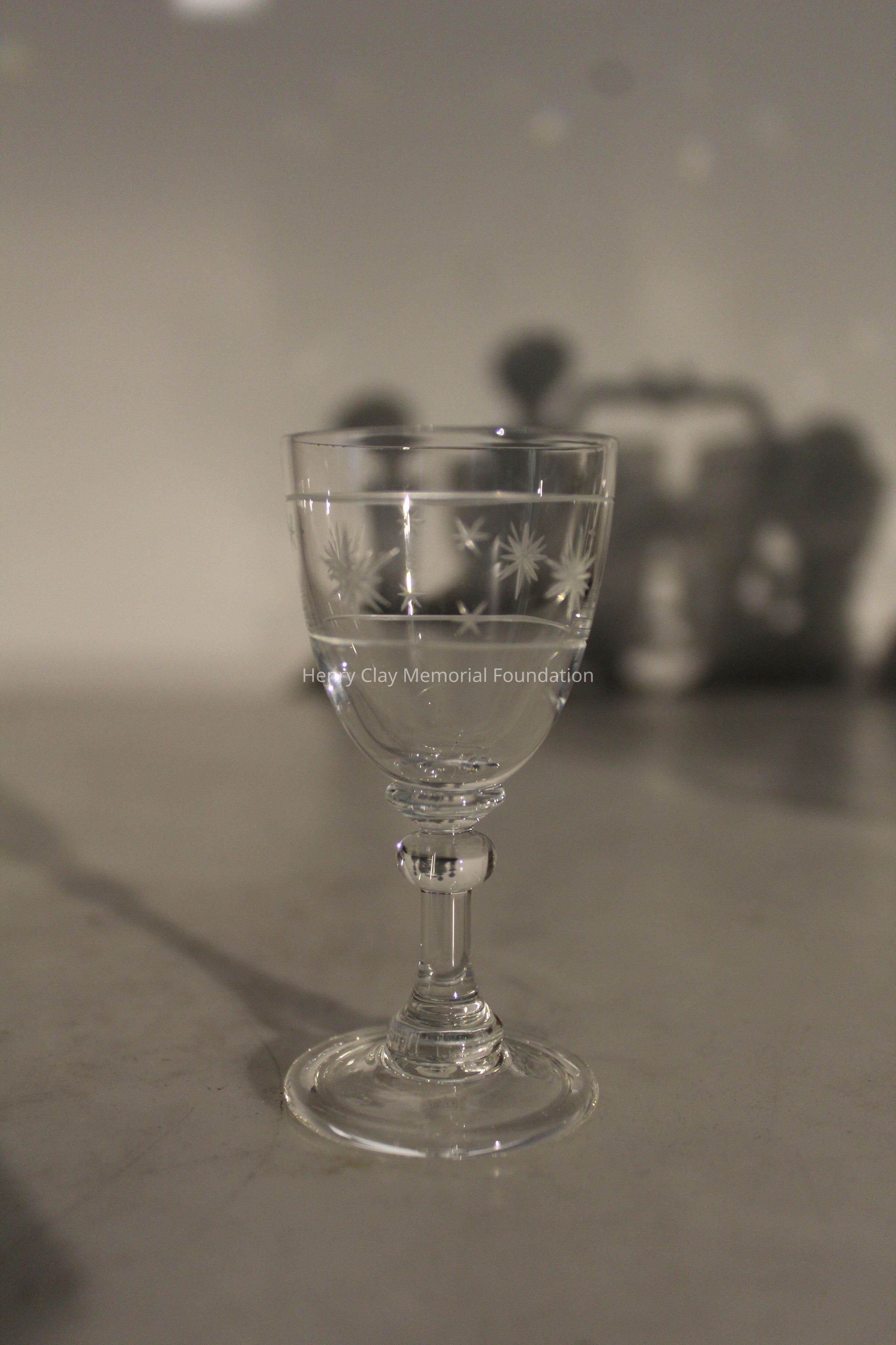 Traveling liqueur set. The set is housed in box with glass panels set into the top and front . The case is veneered in bird's eye maple and has a lock on the front center below the glass window. The box has four small round feet. Inside the case is tray that slides out and has a brass frame to hold the glassware. There are foiur crystal decanters with a cut band design with maltese crosses below the neck. Each decanter has a roud faceted stopper. There are 14 glasses. 12 are gut witht same maltese cross design as the decanters and 2 are slightly larger and have floral design.Dimensions