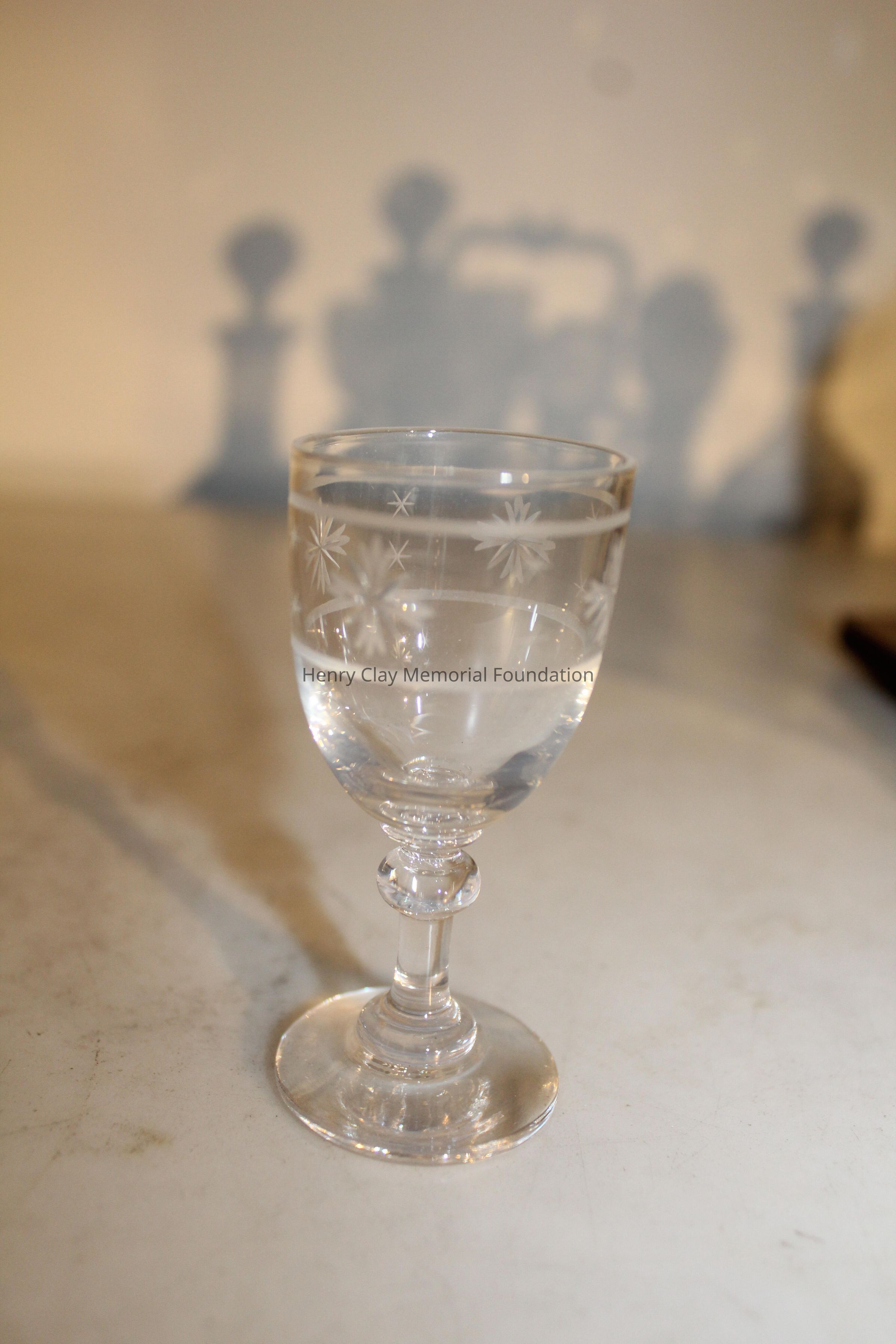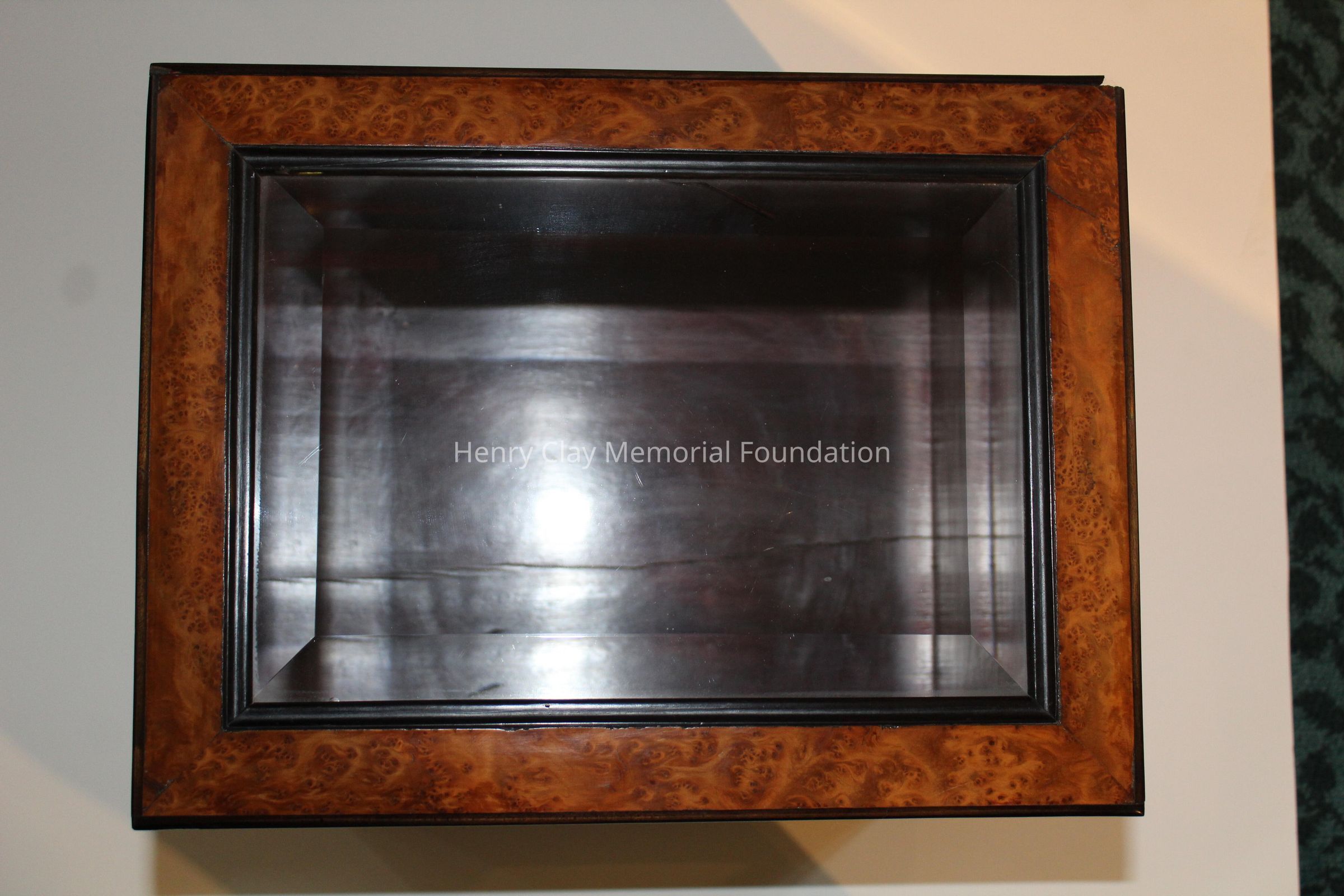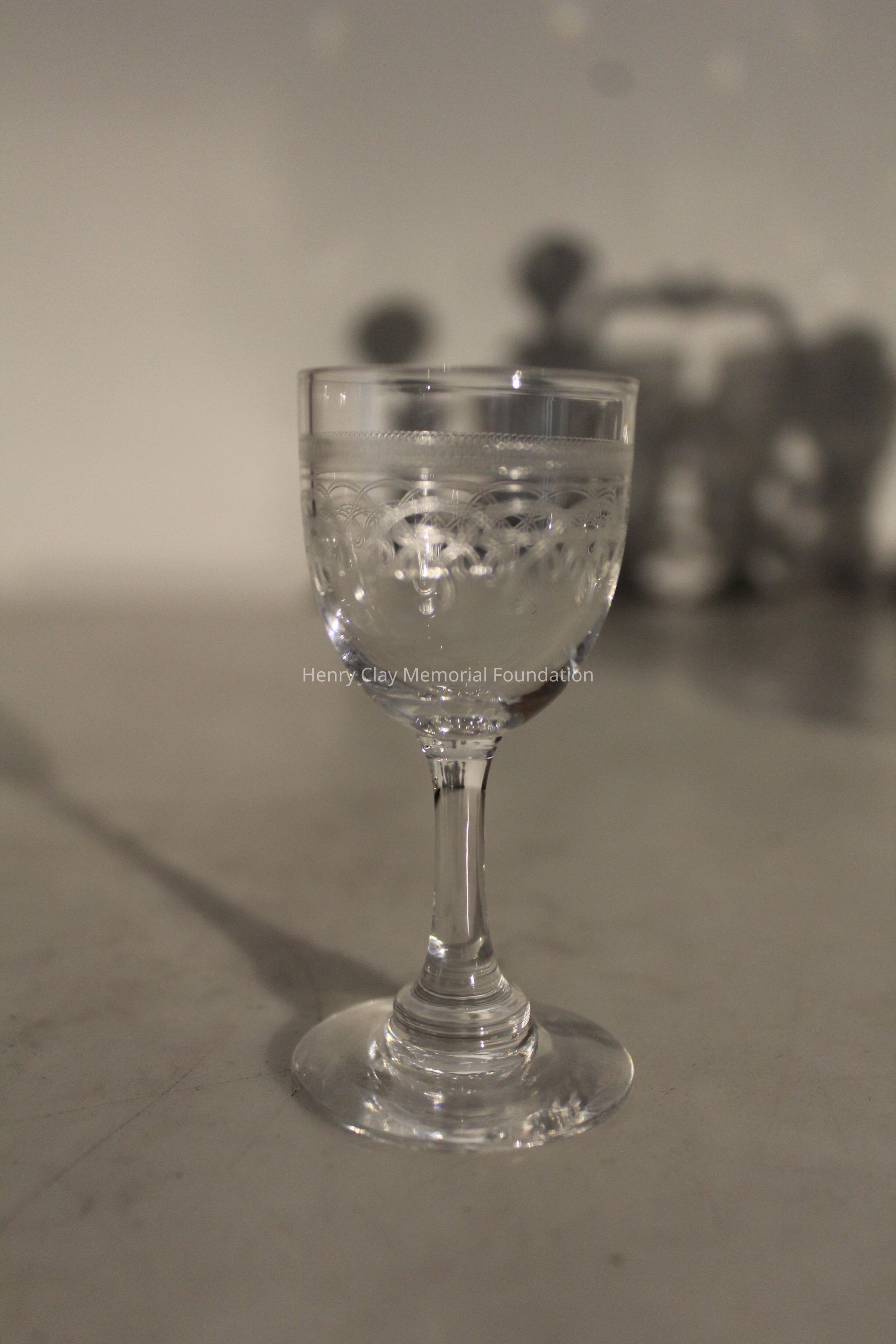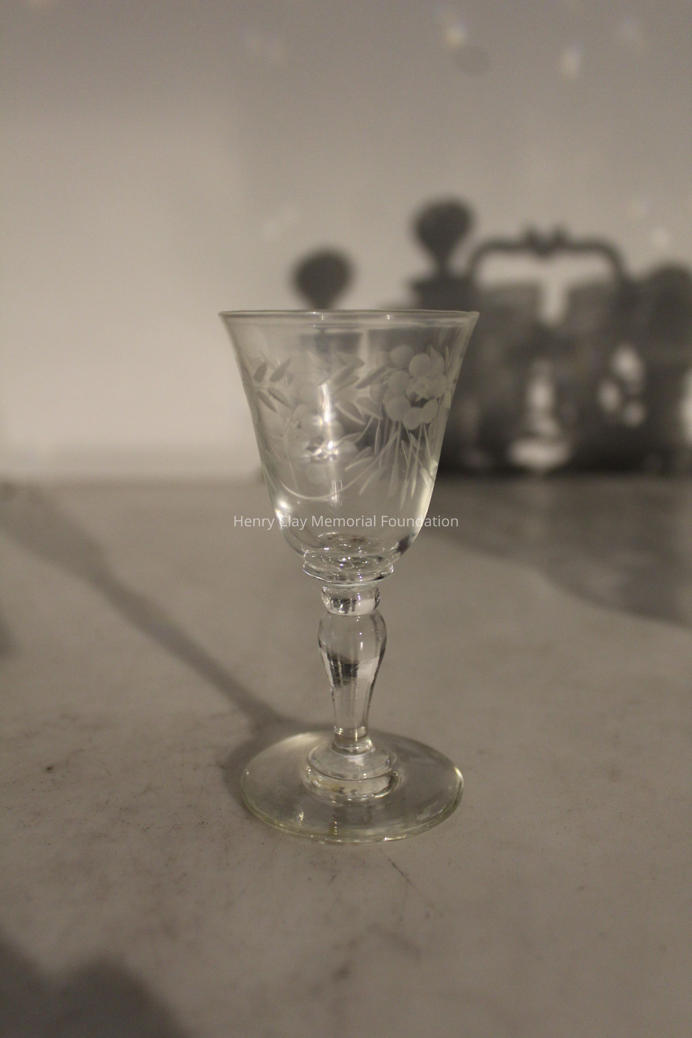 Traveling liqueur set. The set is housed in box with glass panels set into the top and front . The case is veneered in bird's eye maple and has a lock on the front center below the glass window. The box has four small round feet. Inside the case is tray that slides out and has a brass frame to hold the glassware. There are foiur crystal decanters with a cut band design with maltese crosses below the neck. Each decanter has a roud faceted stopper. There are 14 glasses. 12 are gut witht same maltese cross design as the decanters and 2 are slightly larger and have floral design.Dimensions