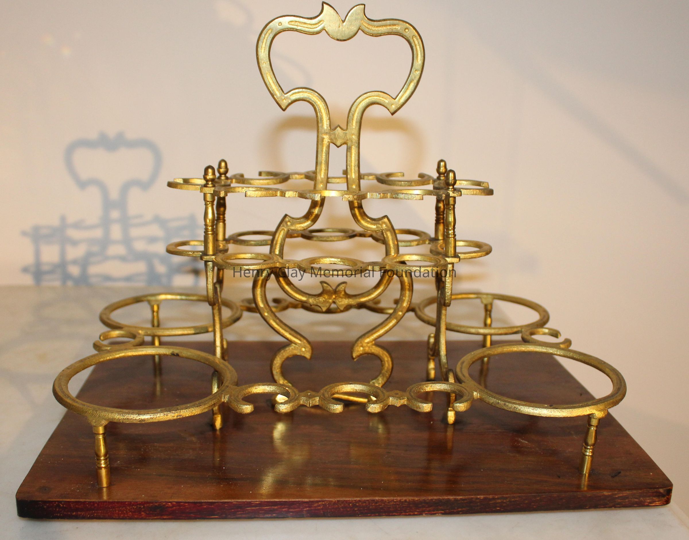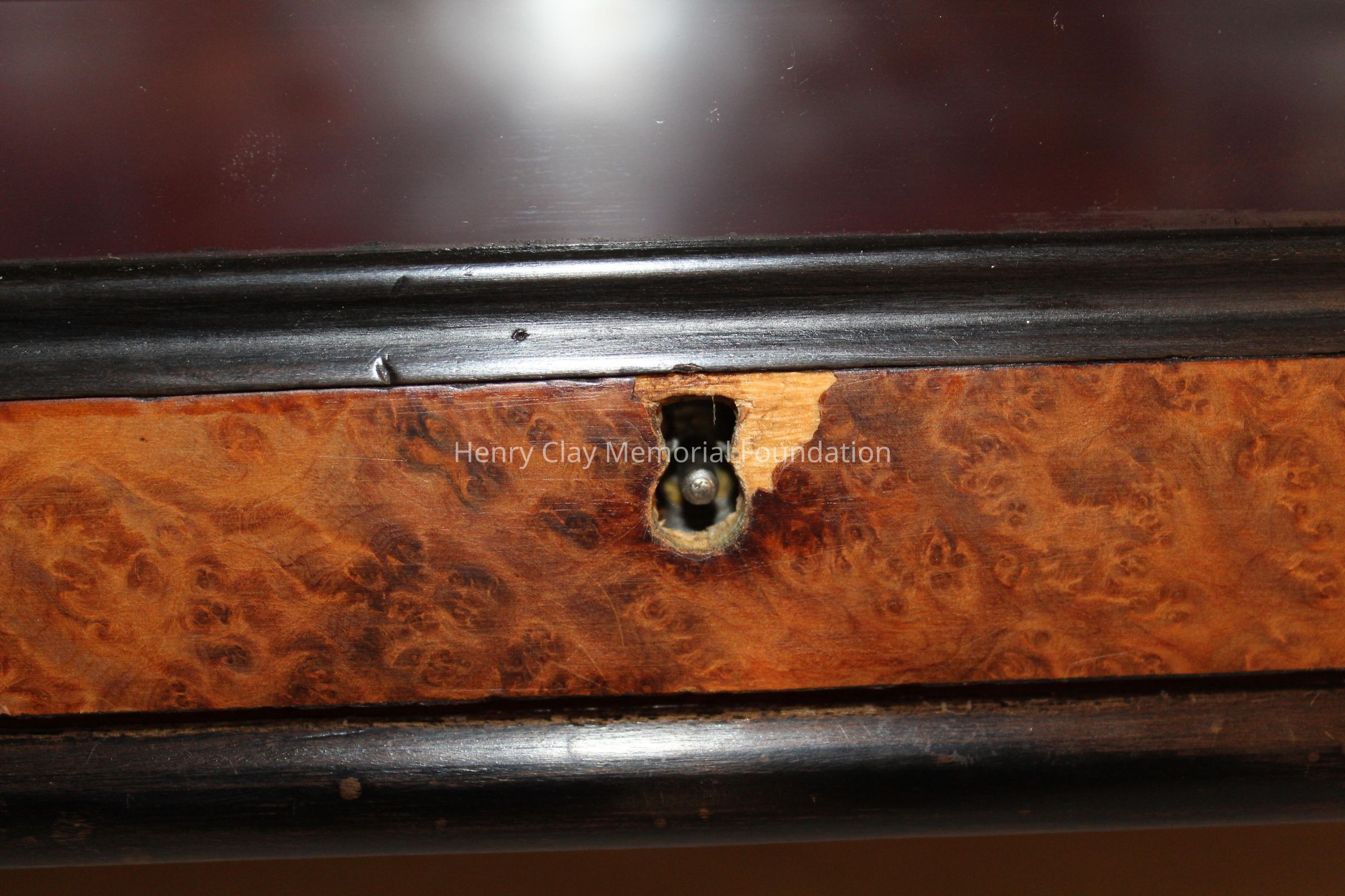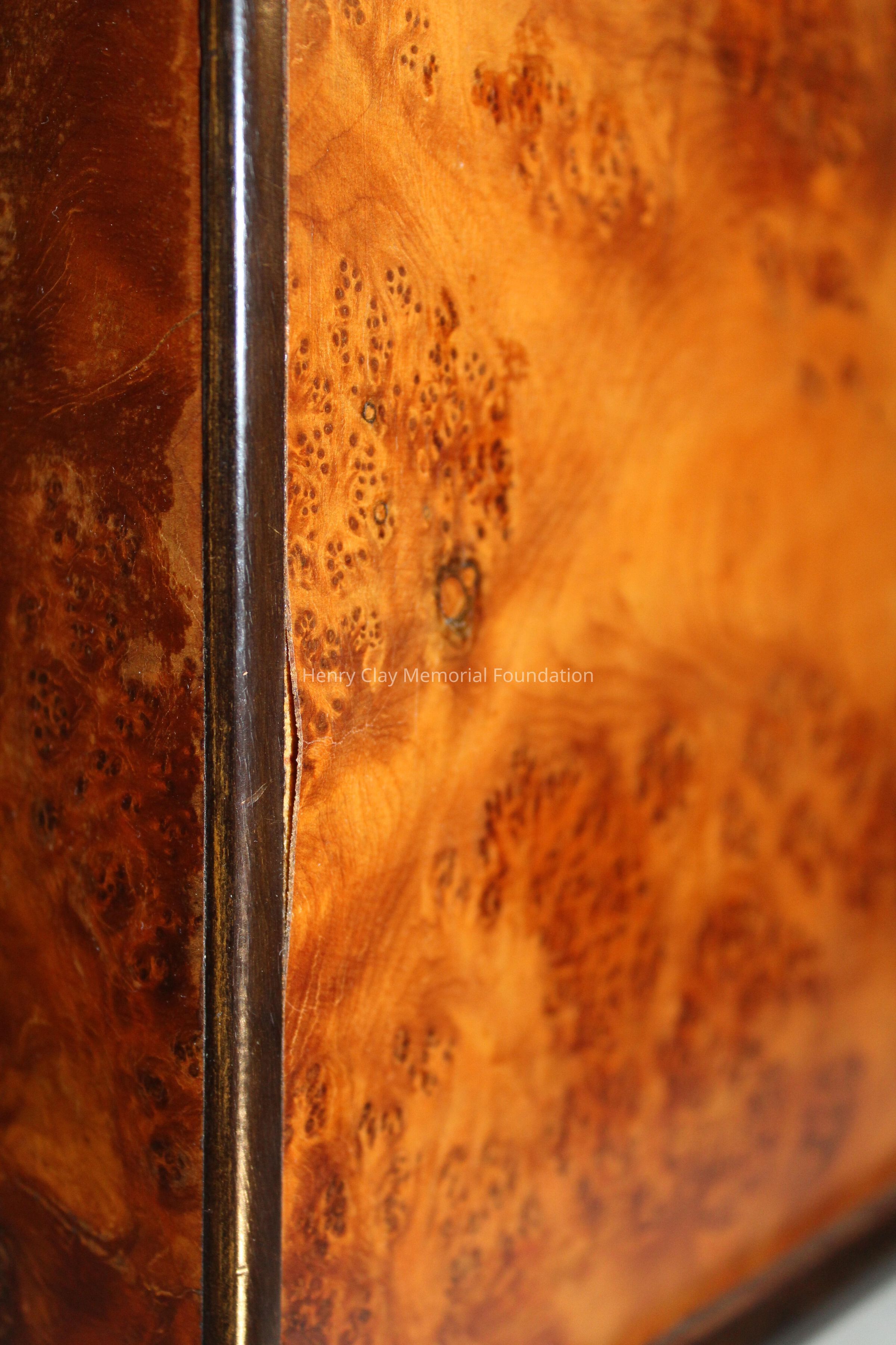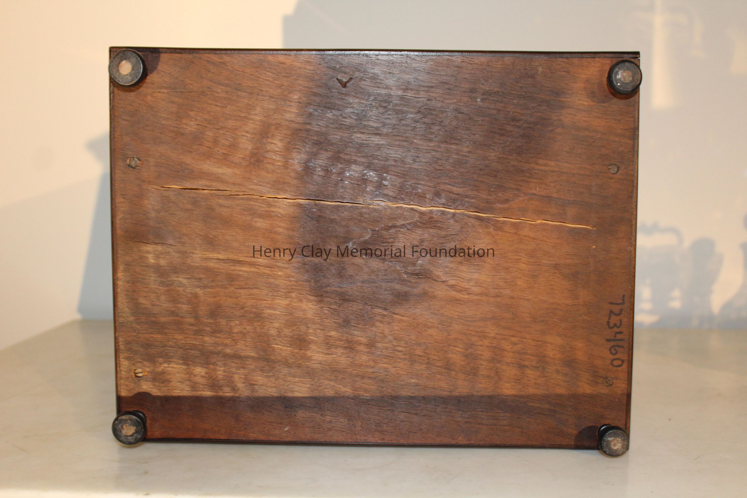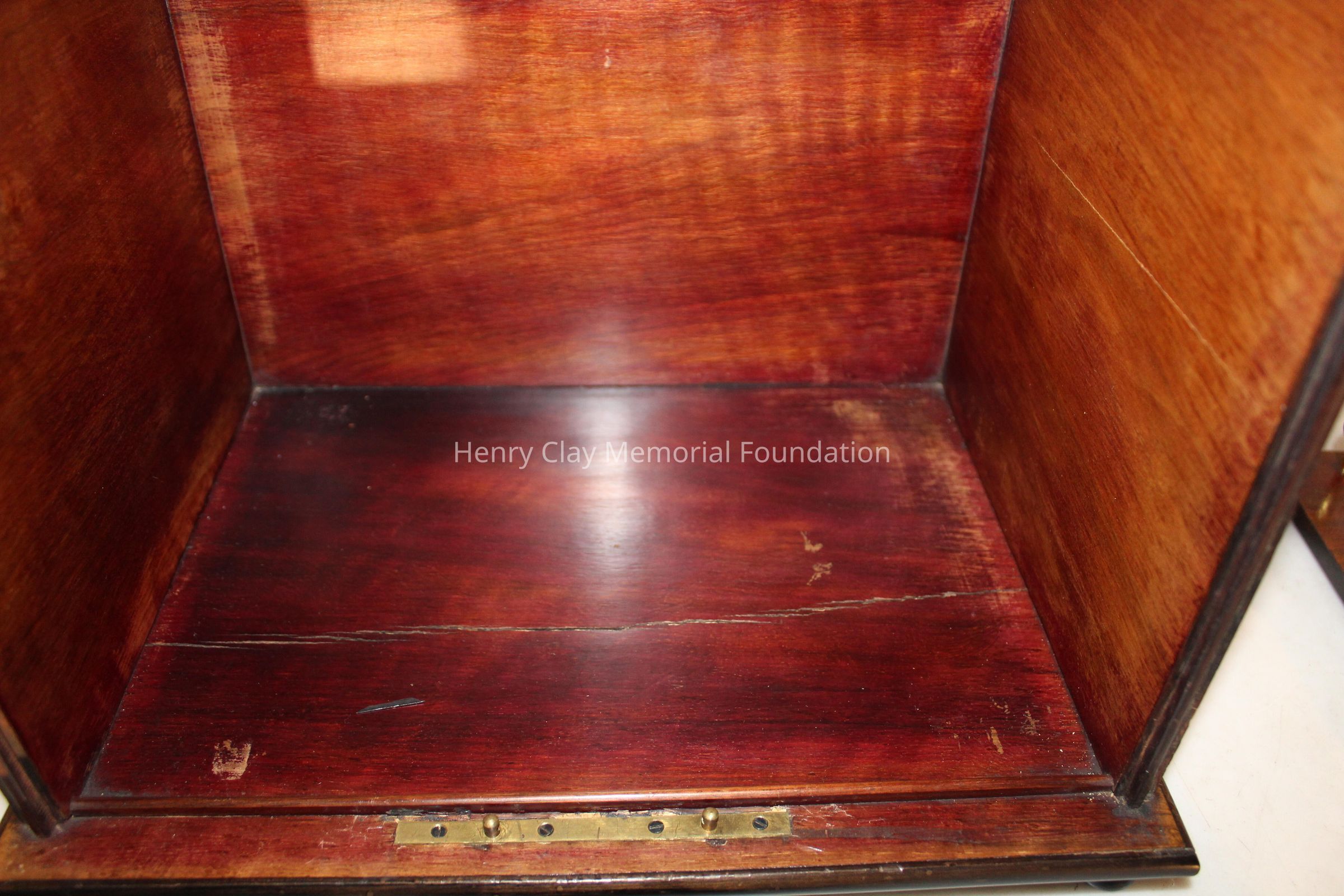 Traveling liqueur set. The set is housed in box with glass panels set into the top and front . The case is veneered in bird's eye maple and has a lock on the front center below the glass window. The box has four small round feet. Inside the case is tray that slides out and has a brass frame to hold the glassware. There are foiur crystal decanters with a cut band design with maltese crosses below the neck. Each decanter has a roud faceted stopper. There are 14 glasses. 12 are gut witht same maltese cross design as the decanters and 2 are slightly larger and have floral design.Dimensions