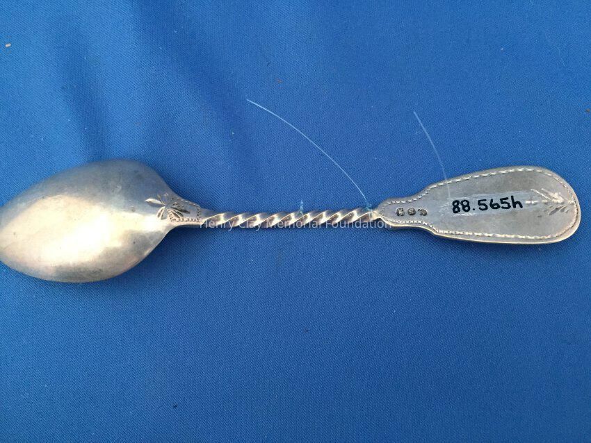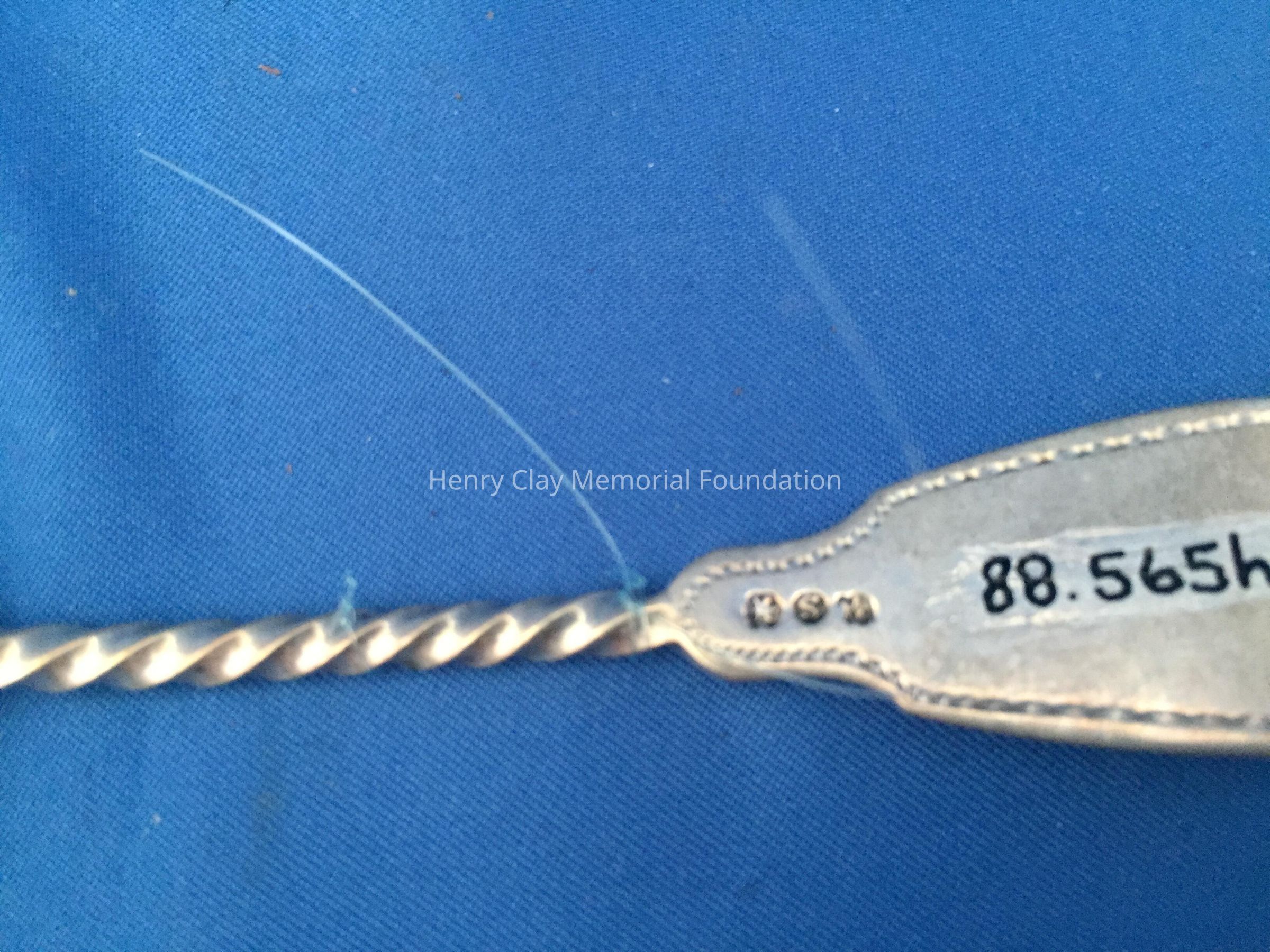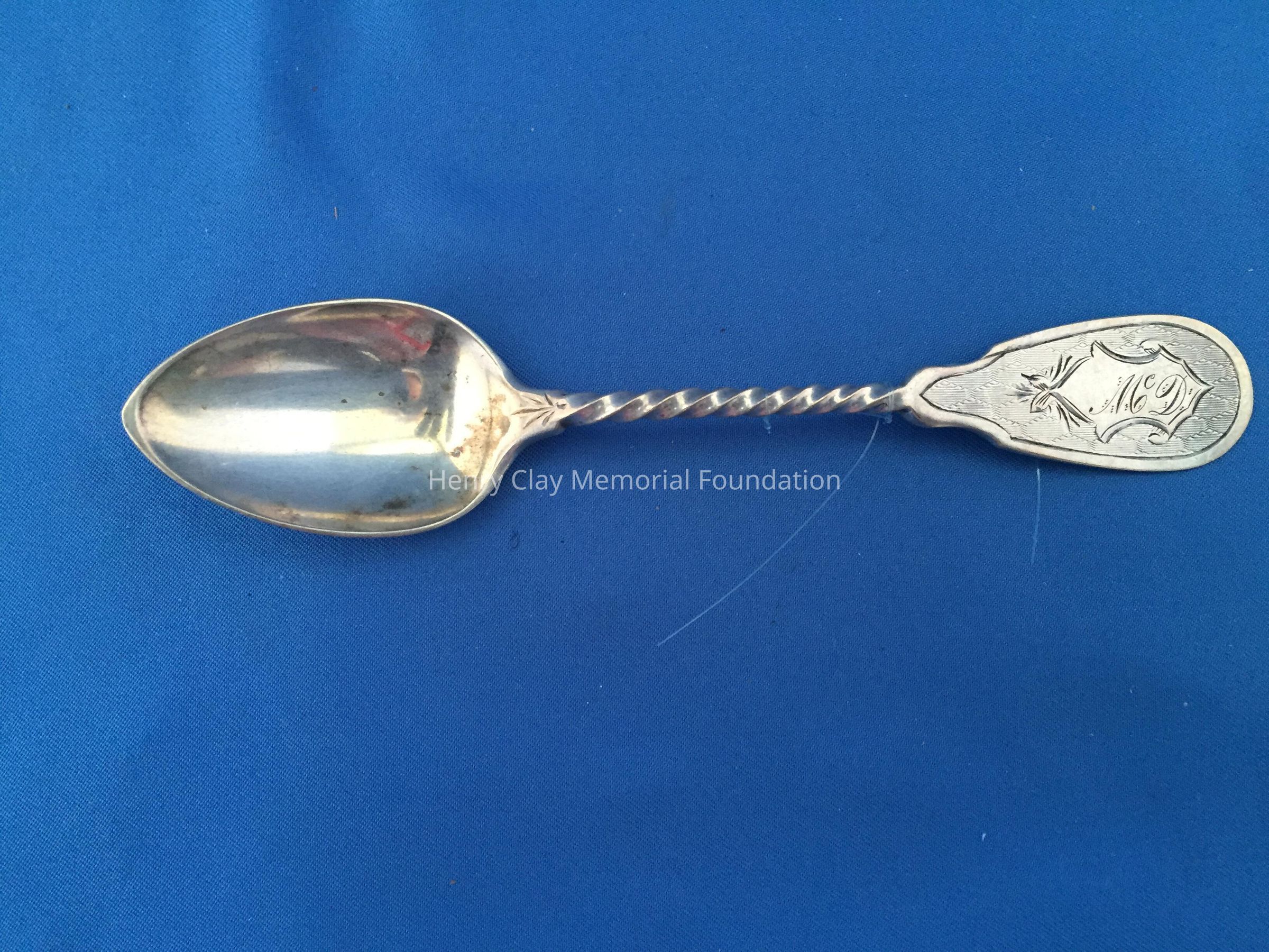 11 silver with twisted handles, engraved "McD" at front top with engraved design and back of handle and at top back of bowl. 3 individuals marks on back - an Asterisk, "S", and "[illegible]". Bowls have faint gold tone.
