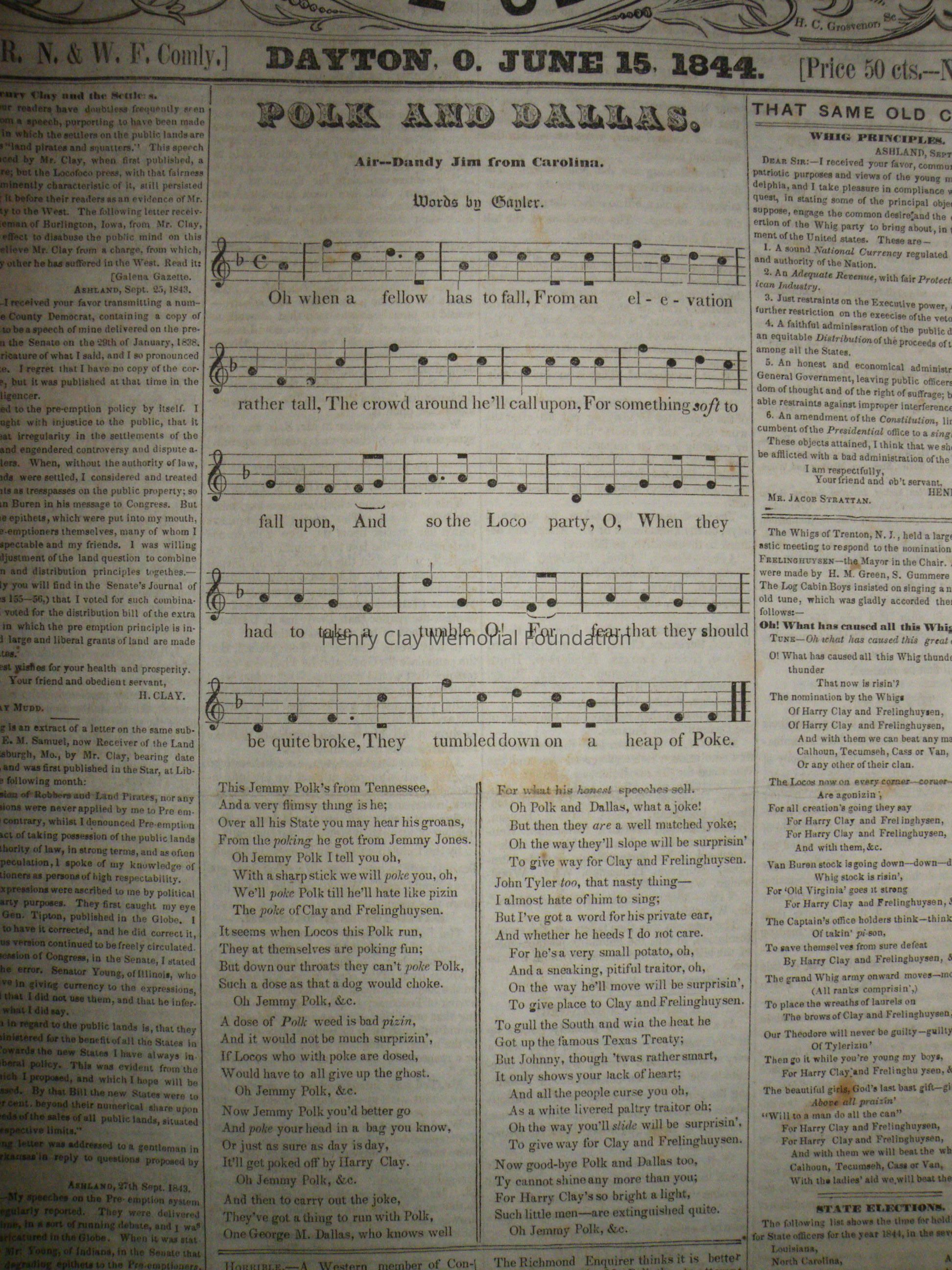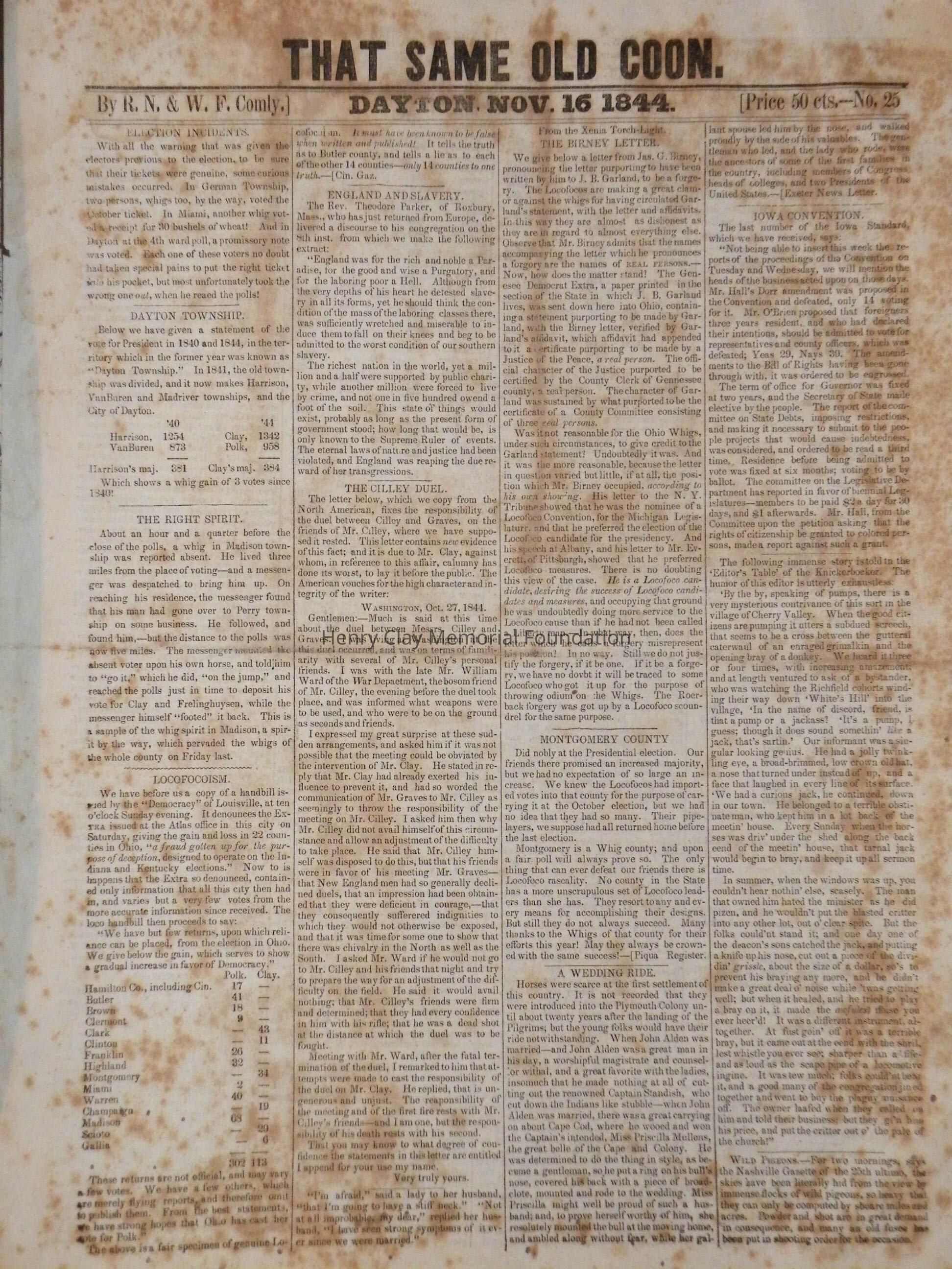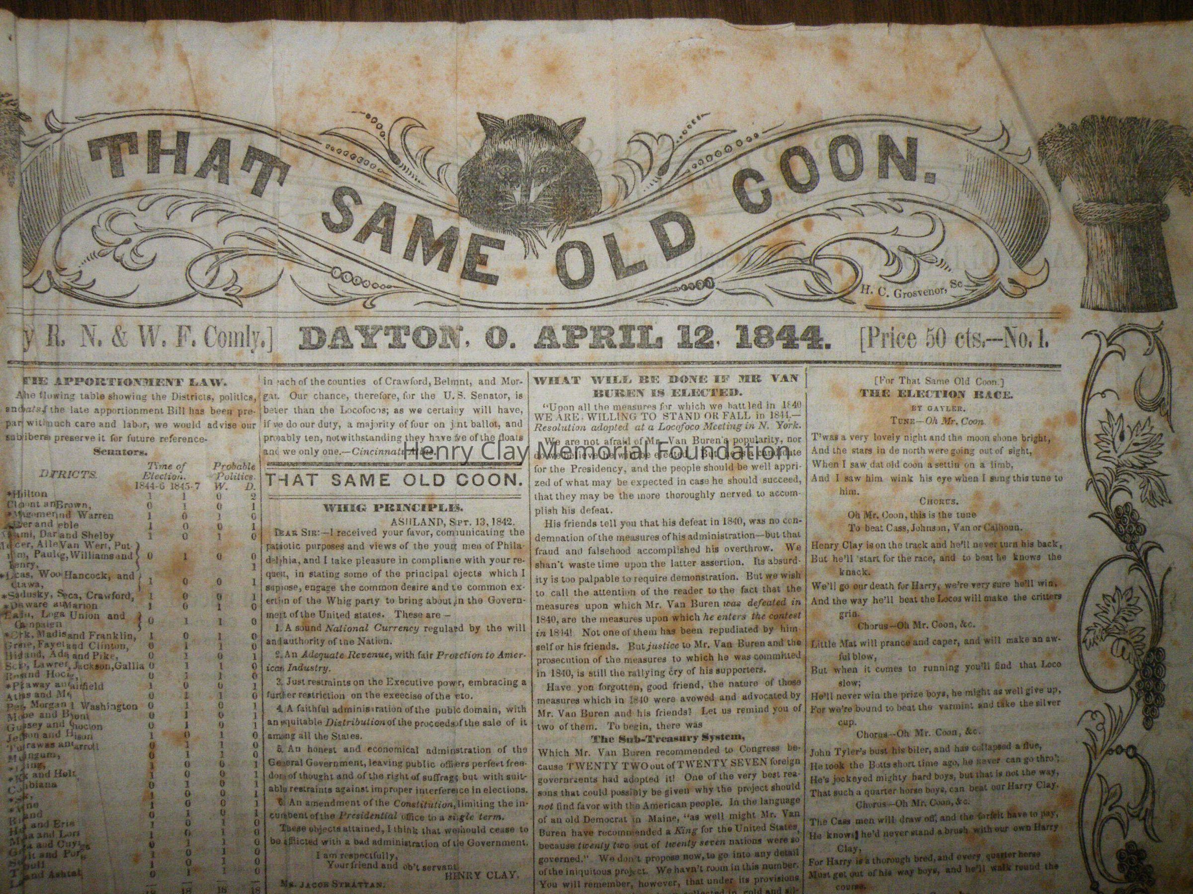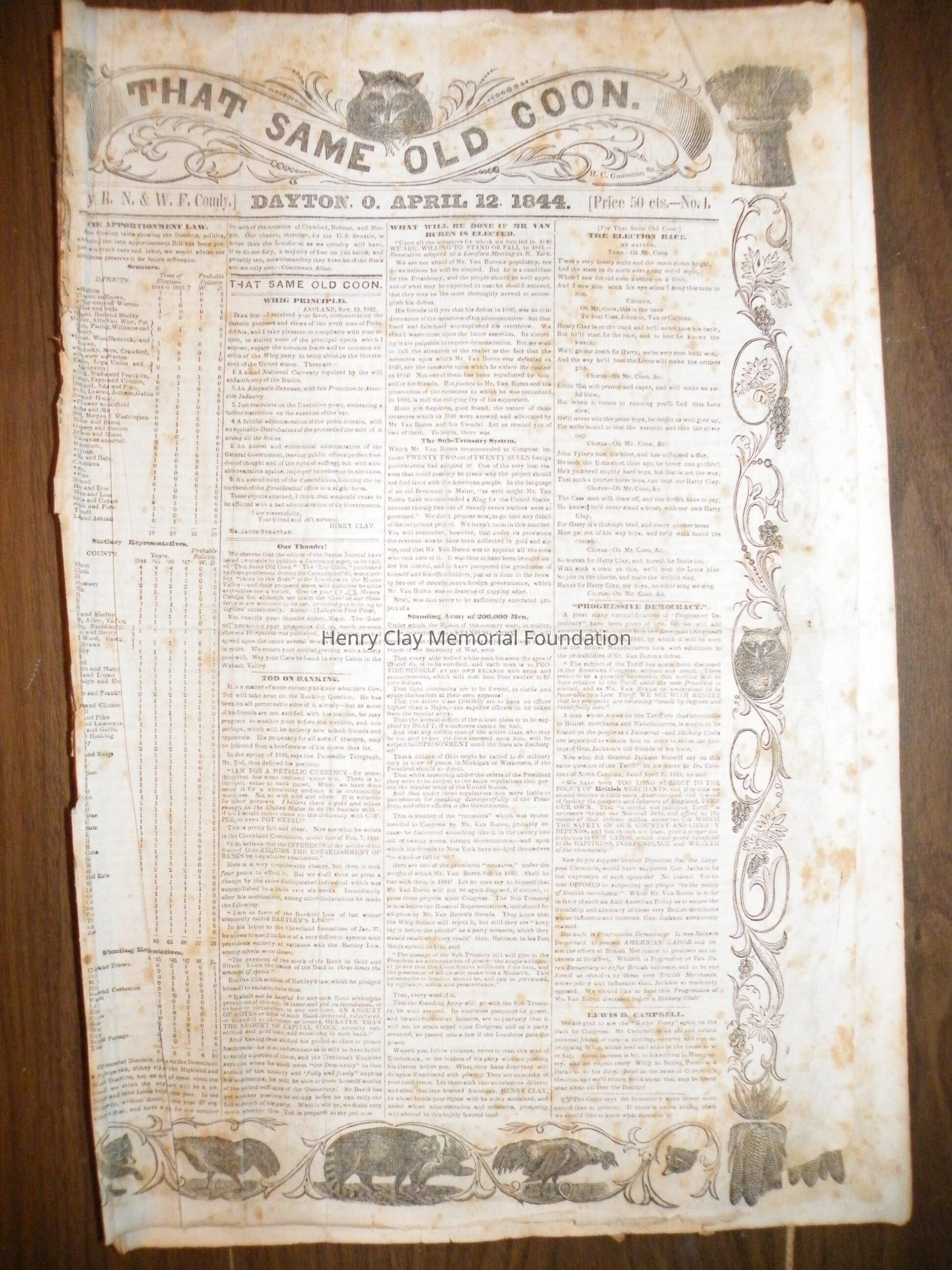 A run of newspapers published in Dayton, Ohio in support of Henry Clay's presidential bid in 1844. This bound collection contains all but one issue of the paper. The first issue was printed April 12, 1844 and the last on November 16, 1852. The paper contains news of campaign events, election issues, and other matter of interest to supporters of Henry Clay. This paper was created and produced by the editors of the "Dayton Journal."