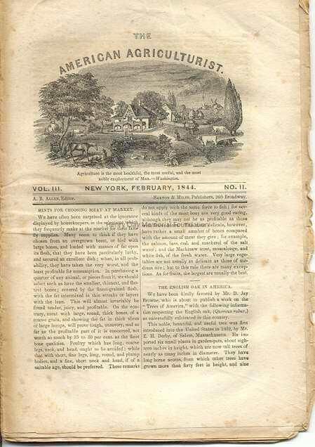 "The American Agriculturist", Volume 3, No. 2, February 1844, edited by A.B. Allen, published by Saxton & Miles, 205 Broadway, New York City. Newspaper-style magazine, bound with string at spine, no hard cover. Continuing pages 33-64.